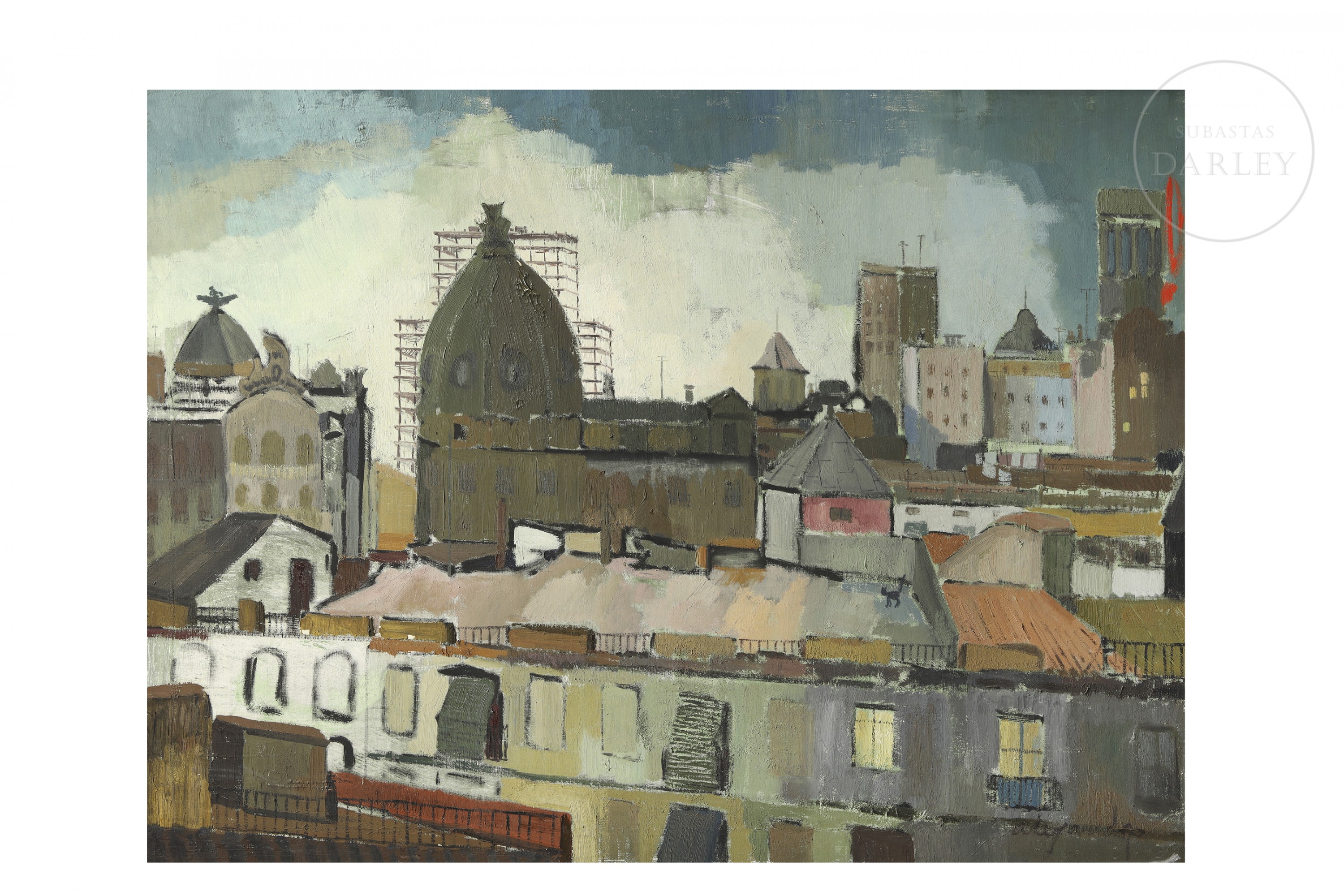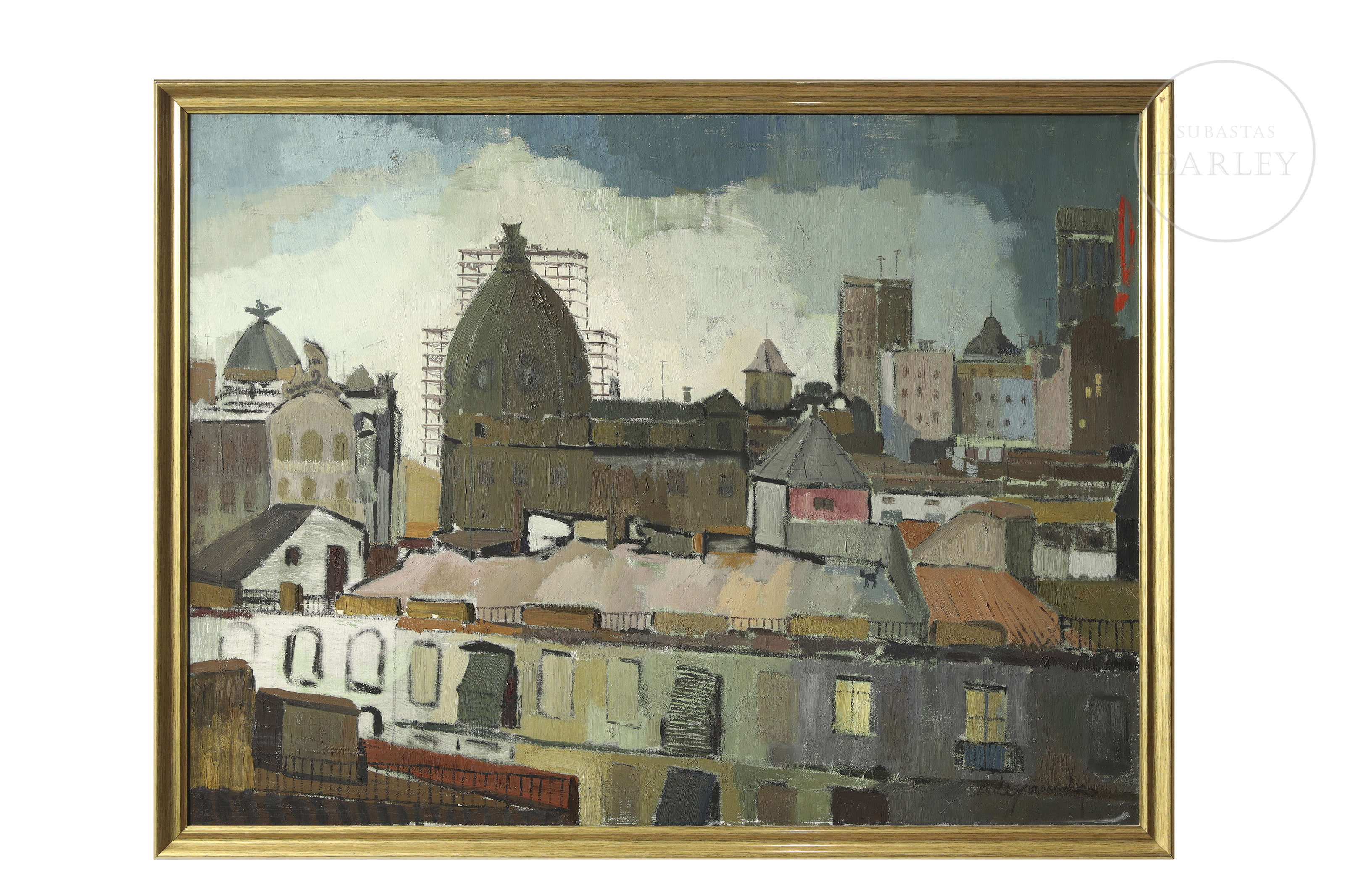 油画布。一幅以笔触表现的都市景观,捕捉马德里建筑群的鸟瞰视角,凸显其形态与建筑的融合之美。