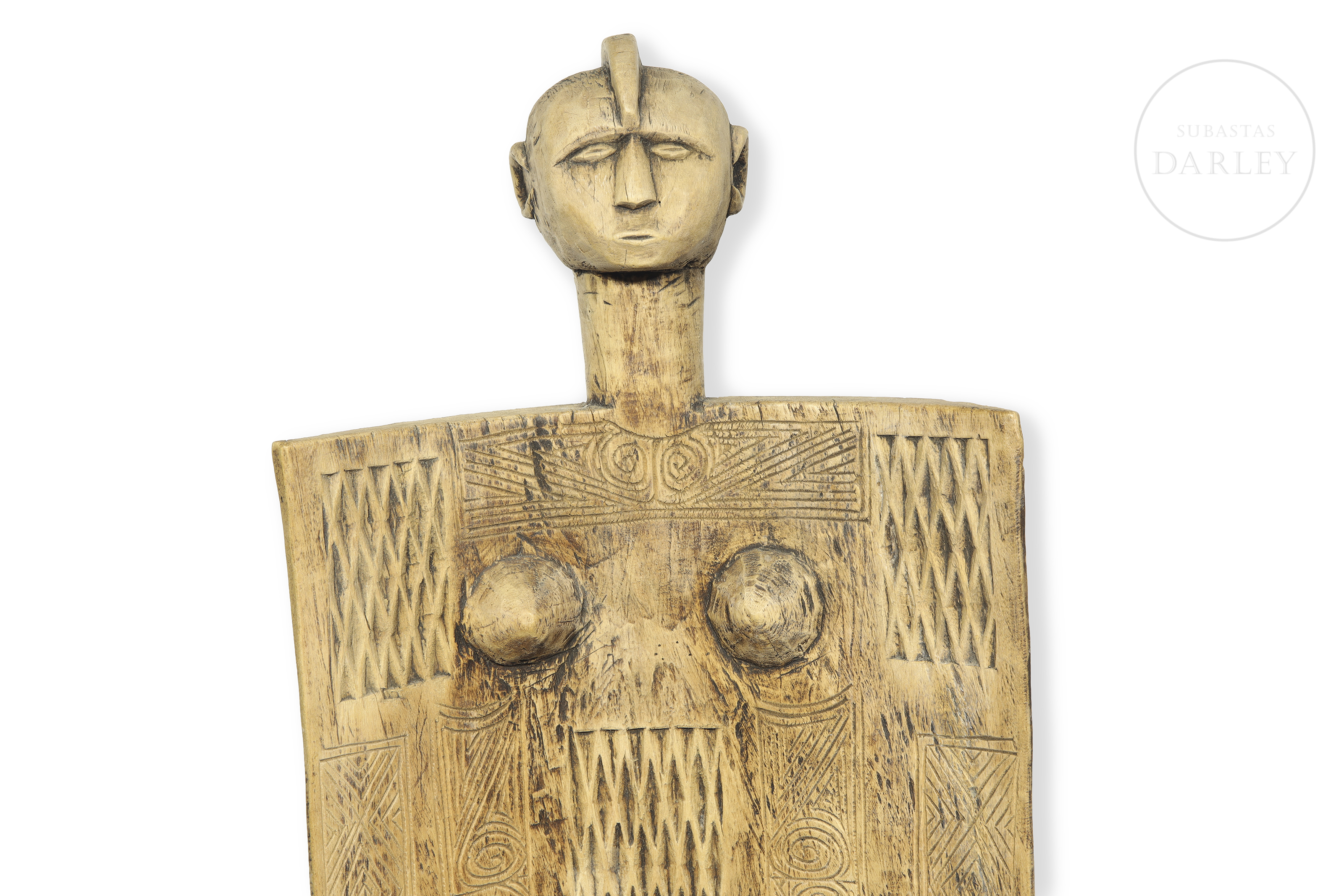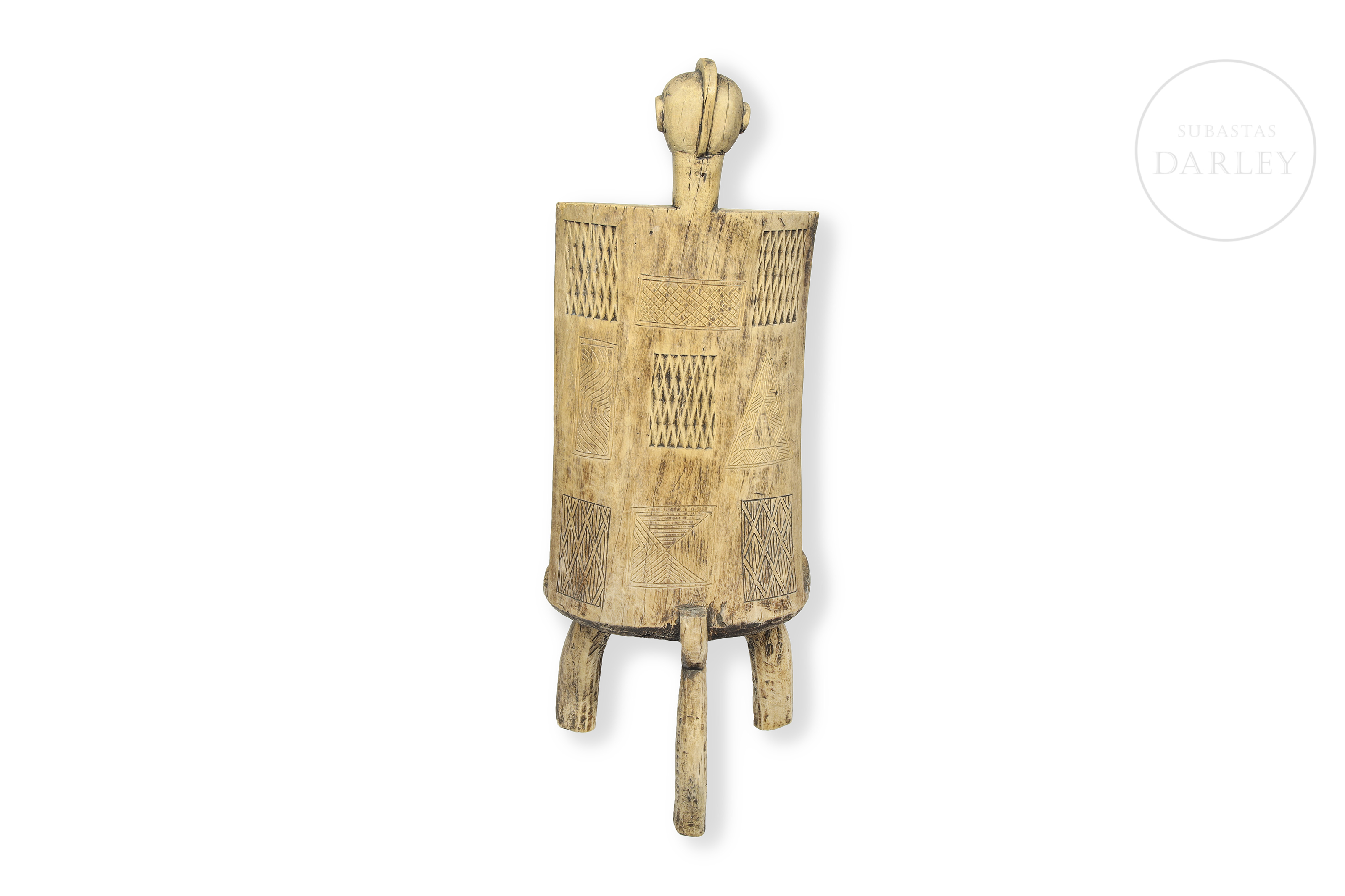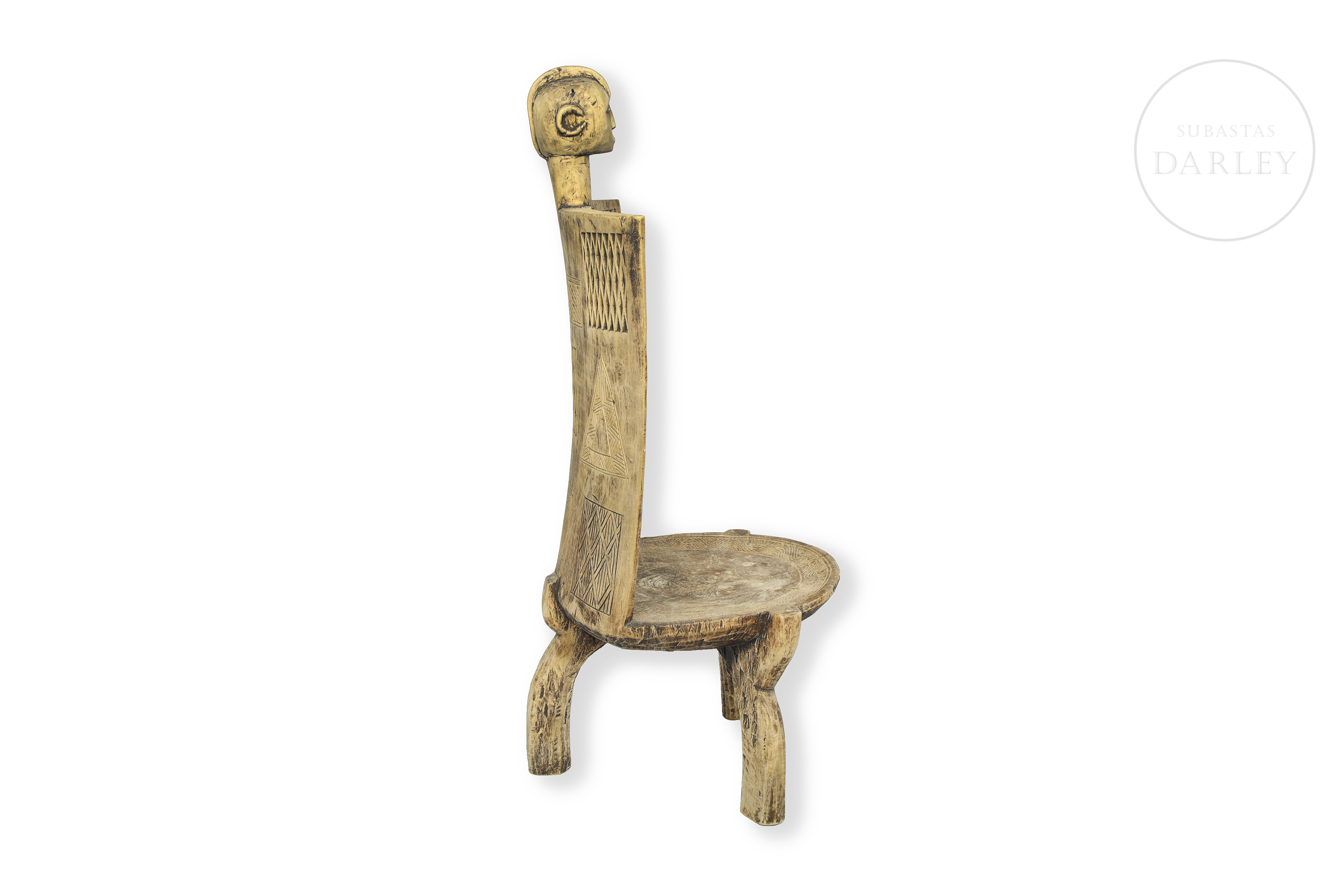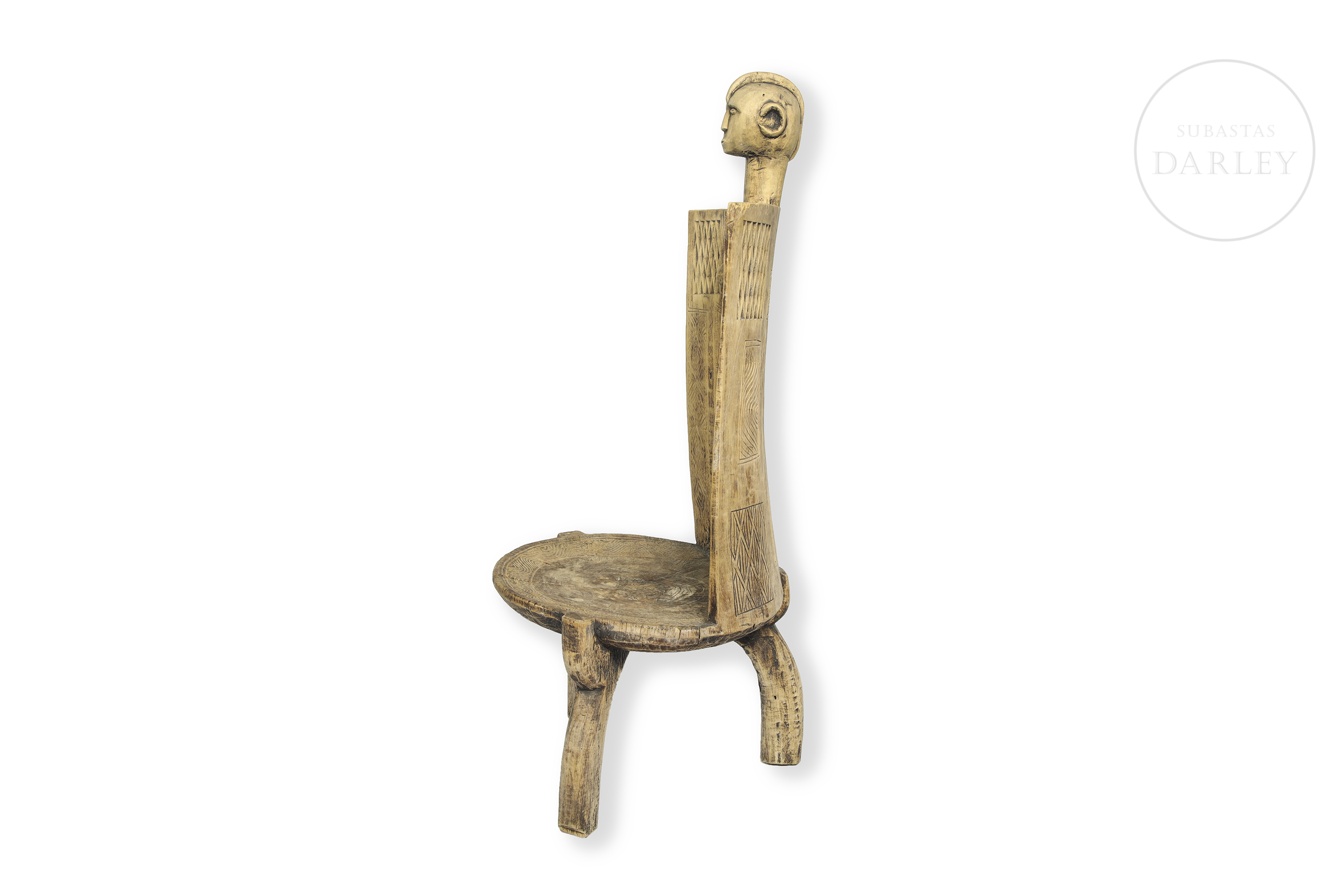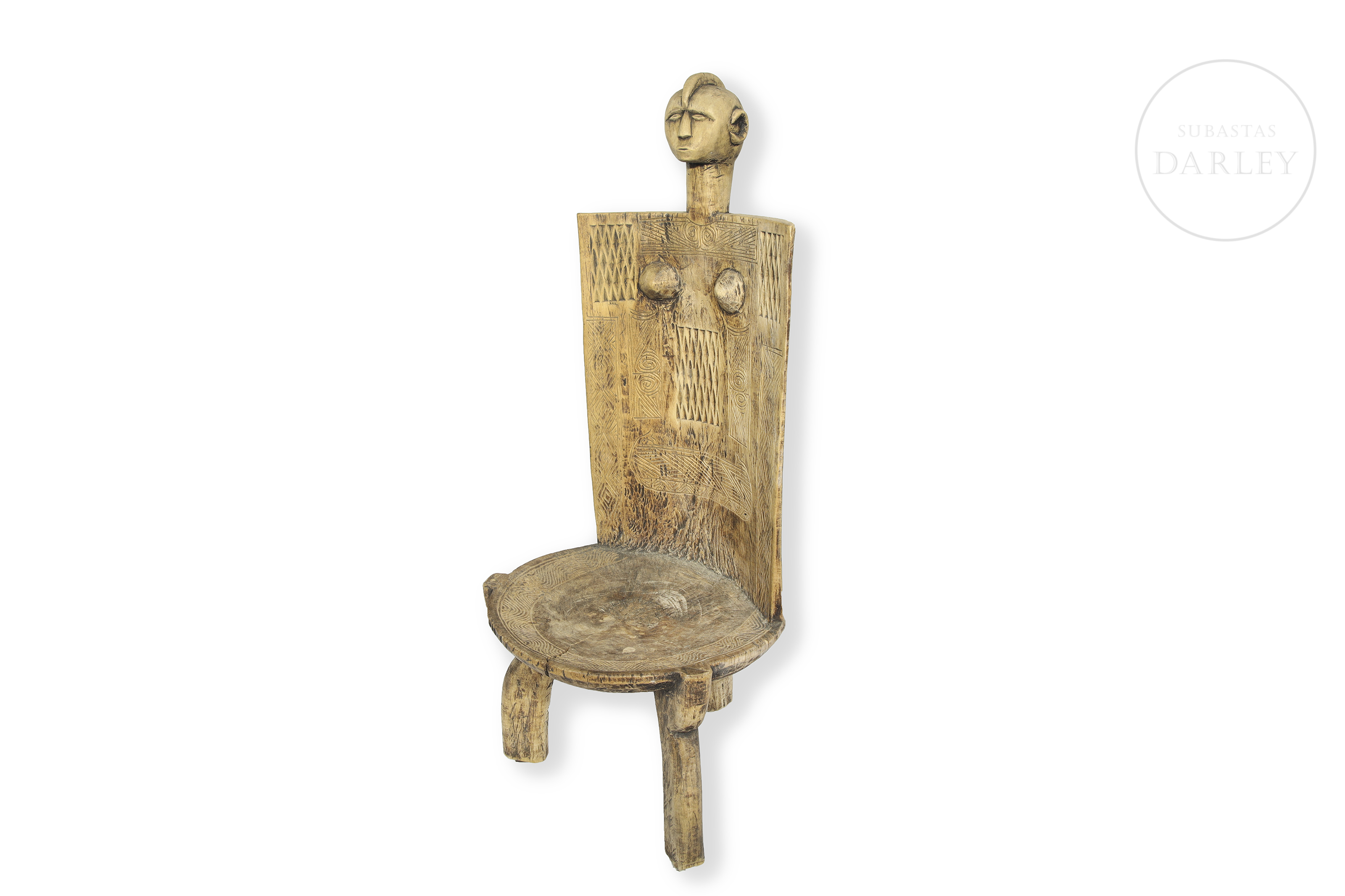 传统非洲风格雕花木椅,饰有人类特征如头部与女性乳房,并点缀部落几何纹样。