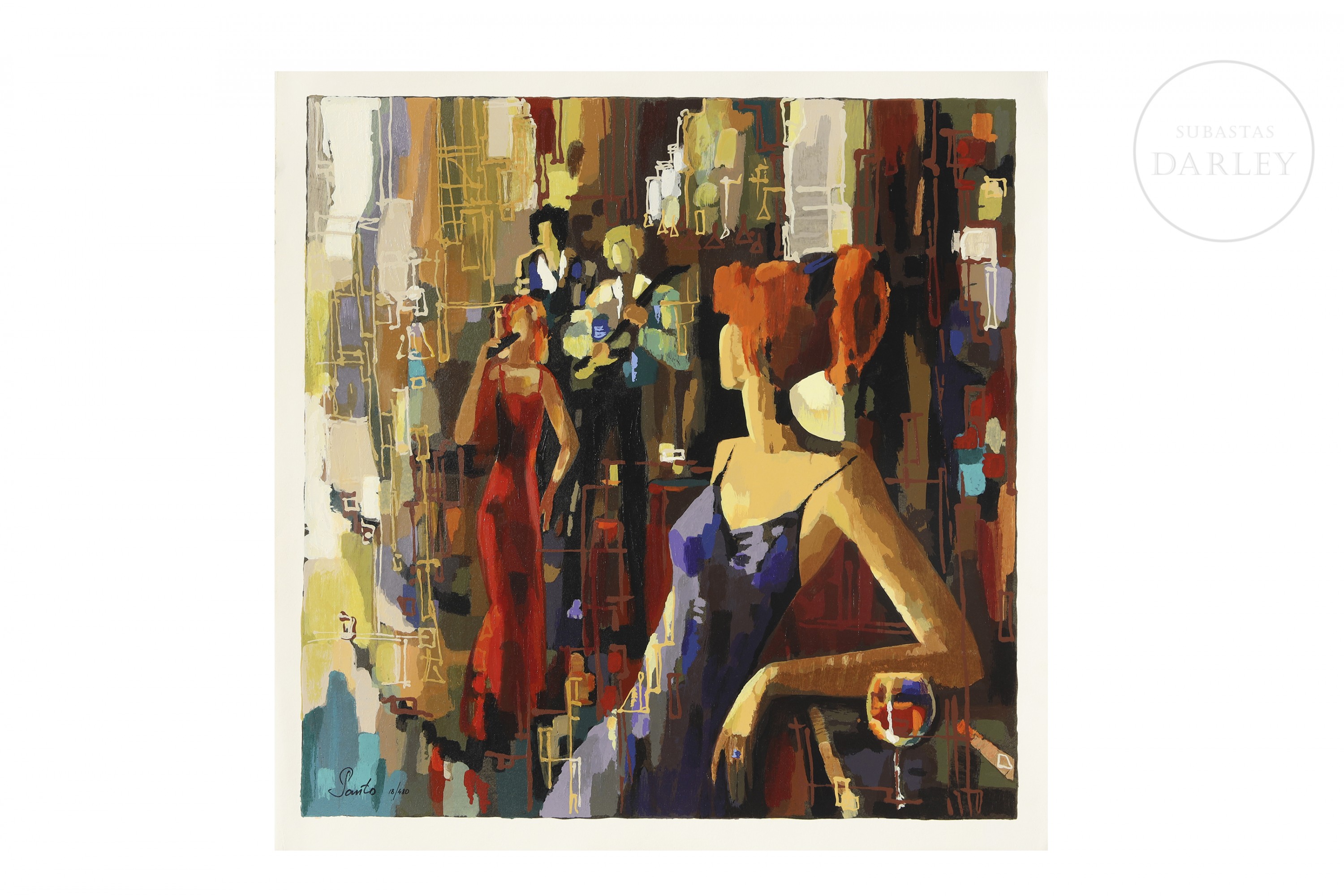 丝网印刷于纸上。画面捕捉娱乐场所的夜间场景,以鲜明色彩见长。左下角签名并编号“Santo 18/480”。