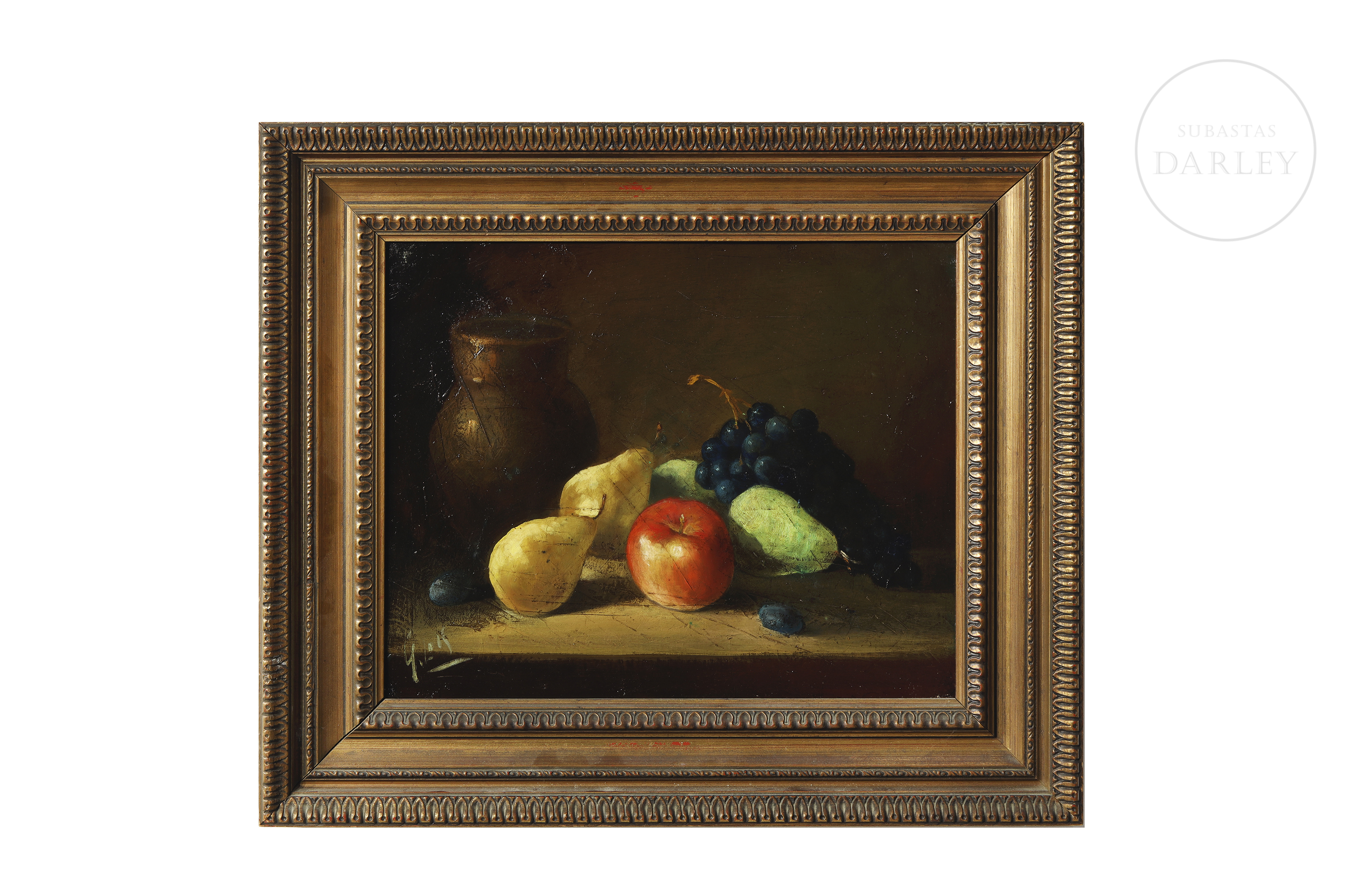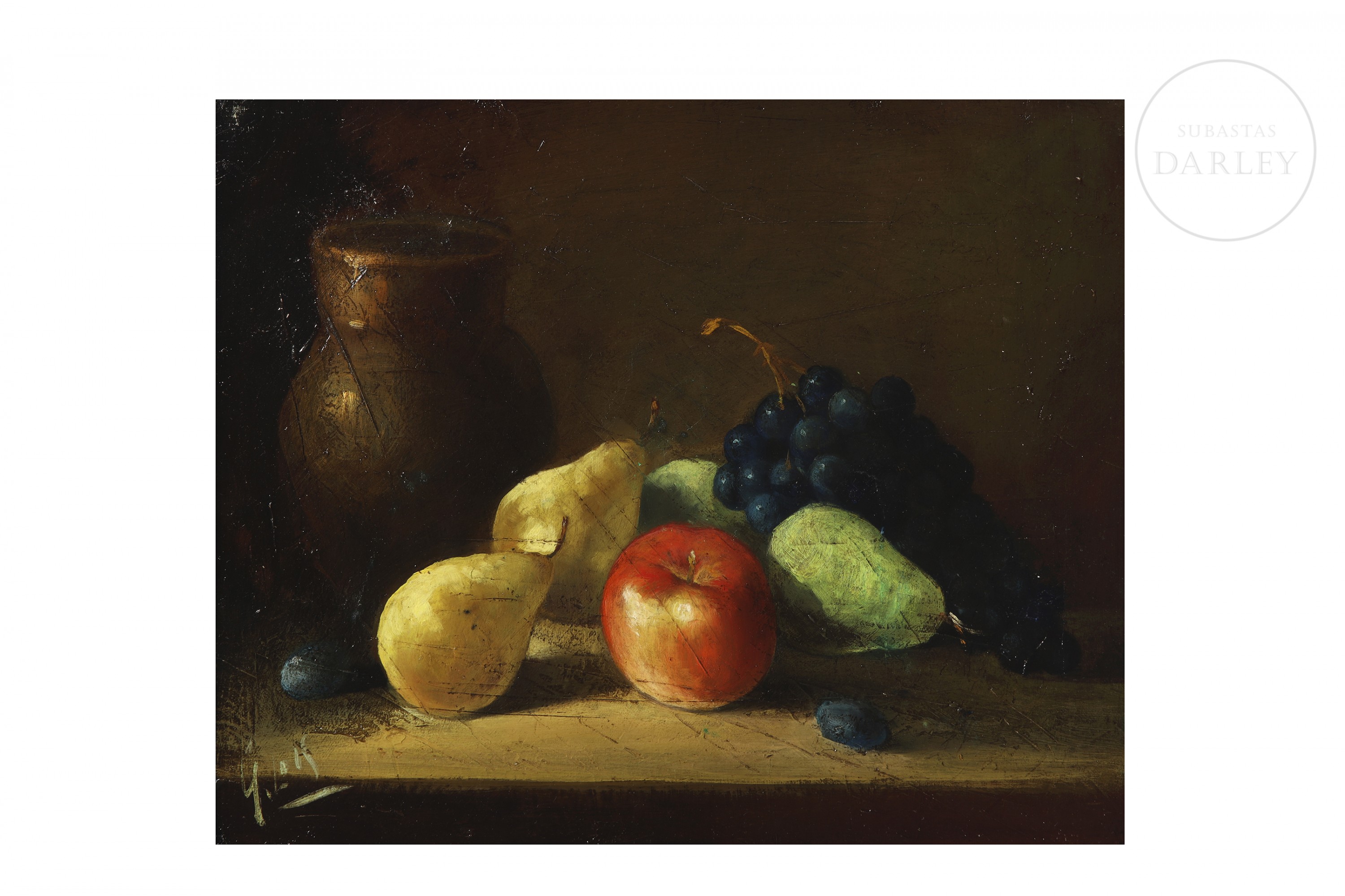 油画布面油画。经典静物画作,描绘釉面陶瓷壶与各类水果并置的场景。其鲜明的明暗对比尤为突出。左下角有签名。