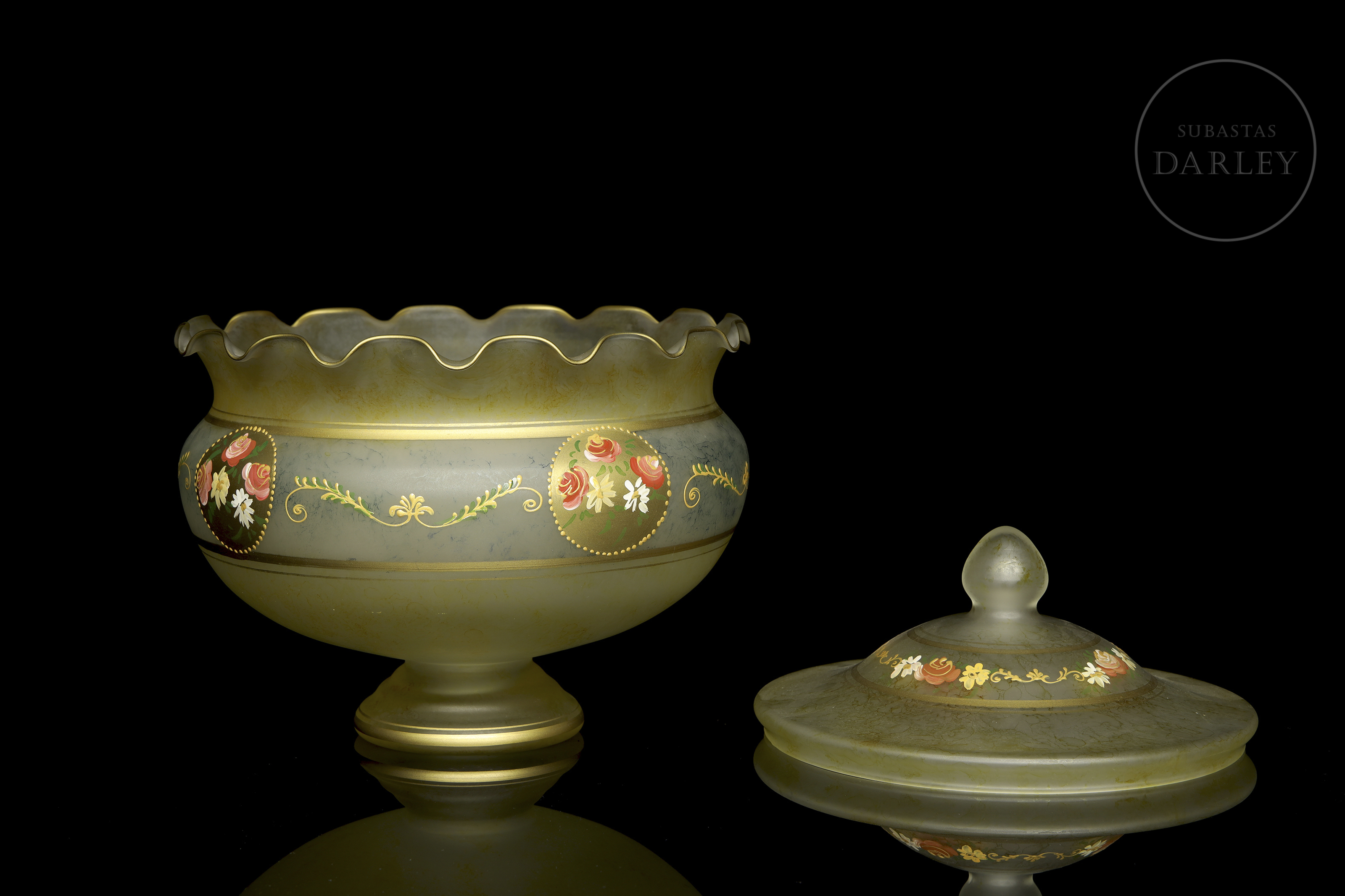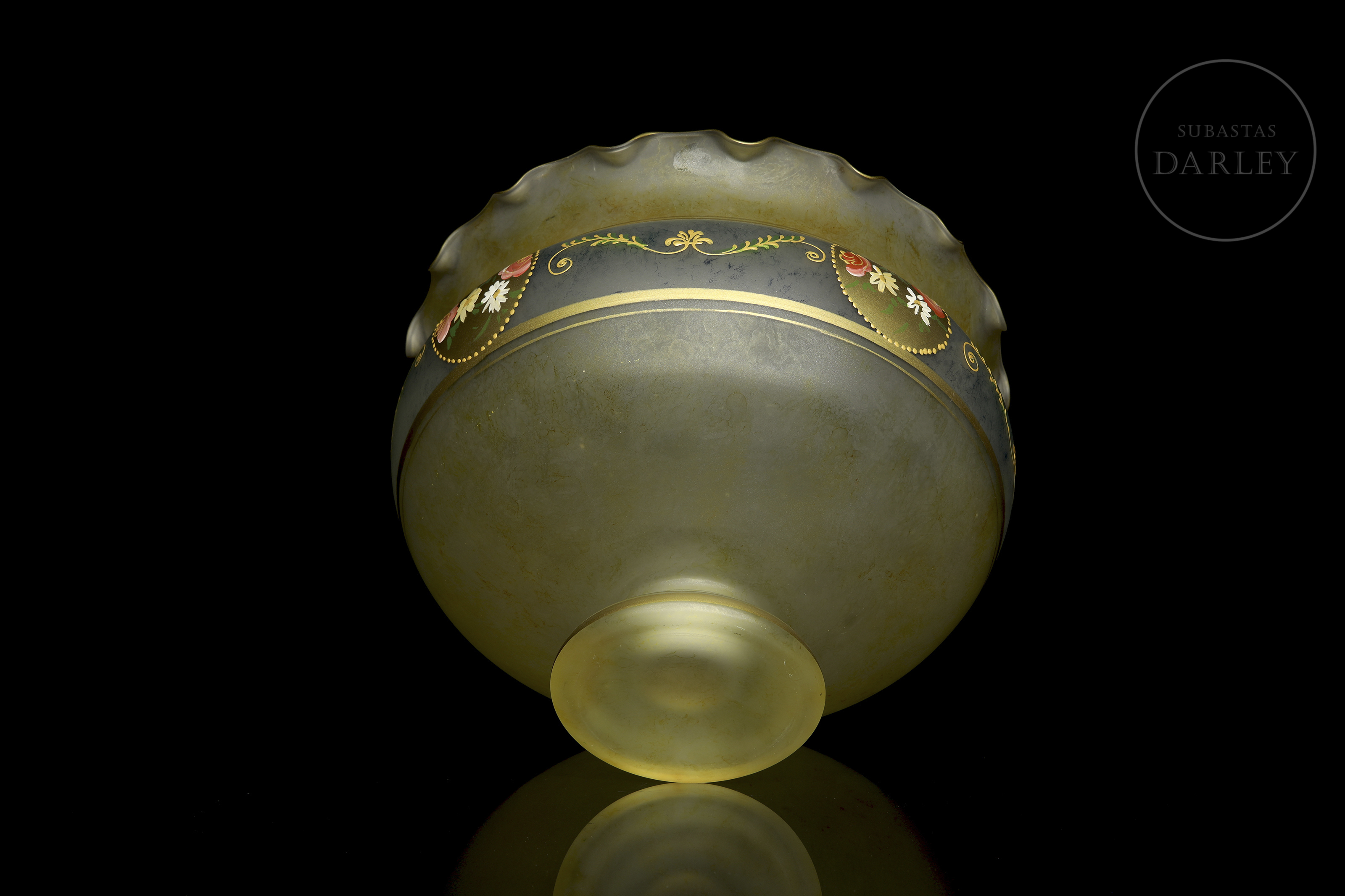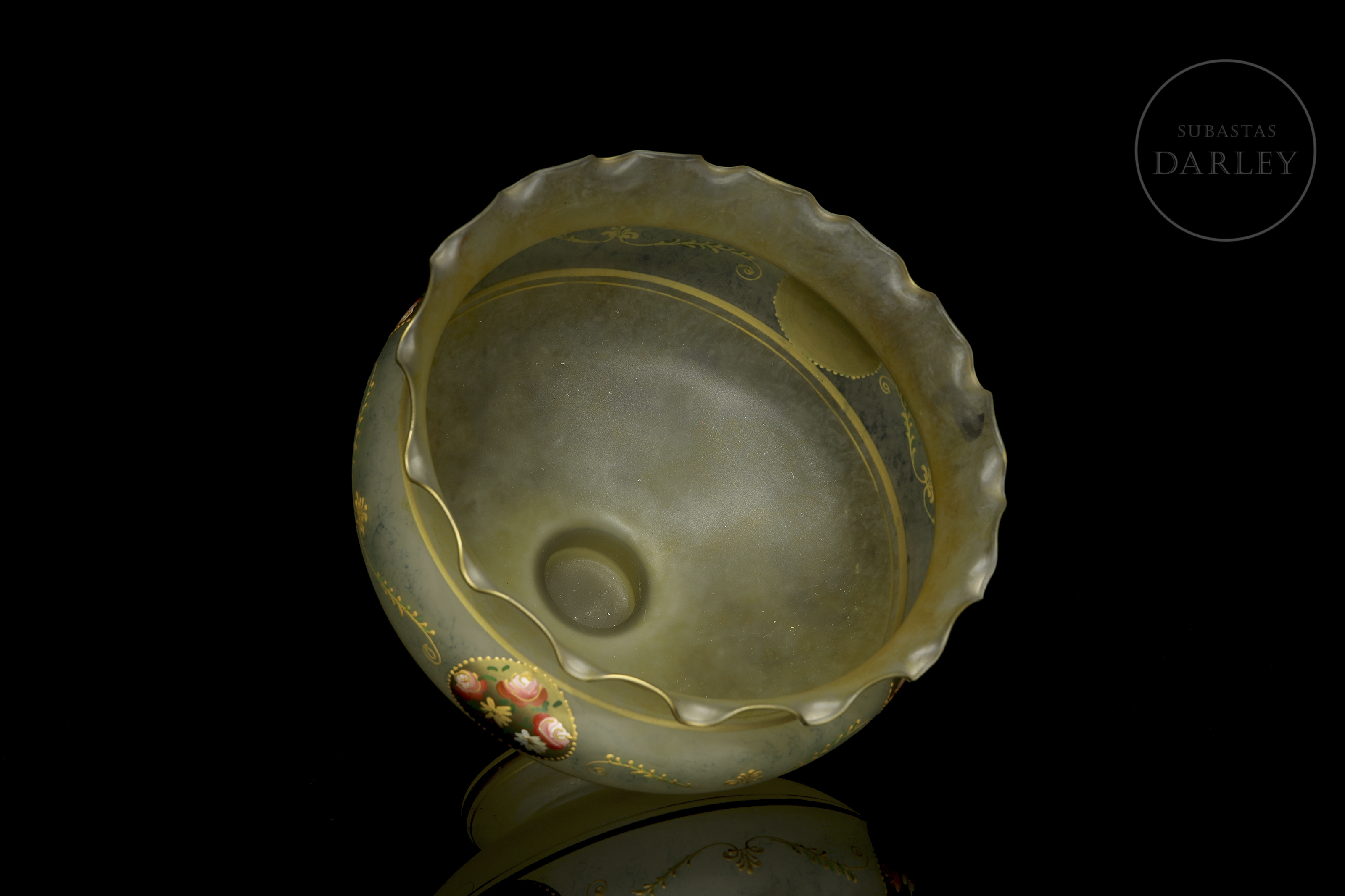 采用绿灰色缎面玻璃制成,边缘呈波浪状。表面饰以繁复纹饰,包括多色珐琅玫瑰纹章及众多金边卷草纹。