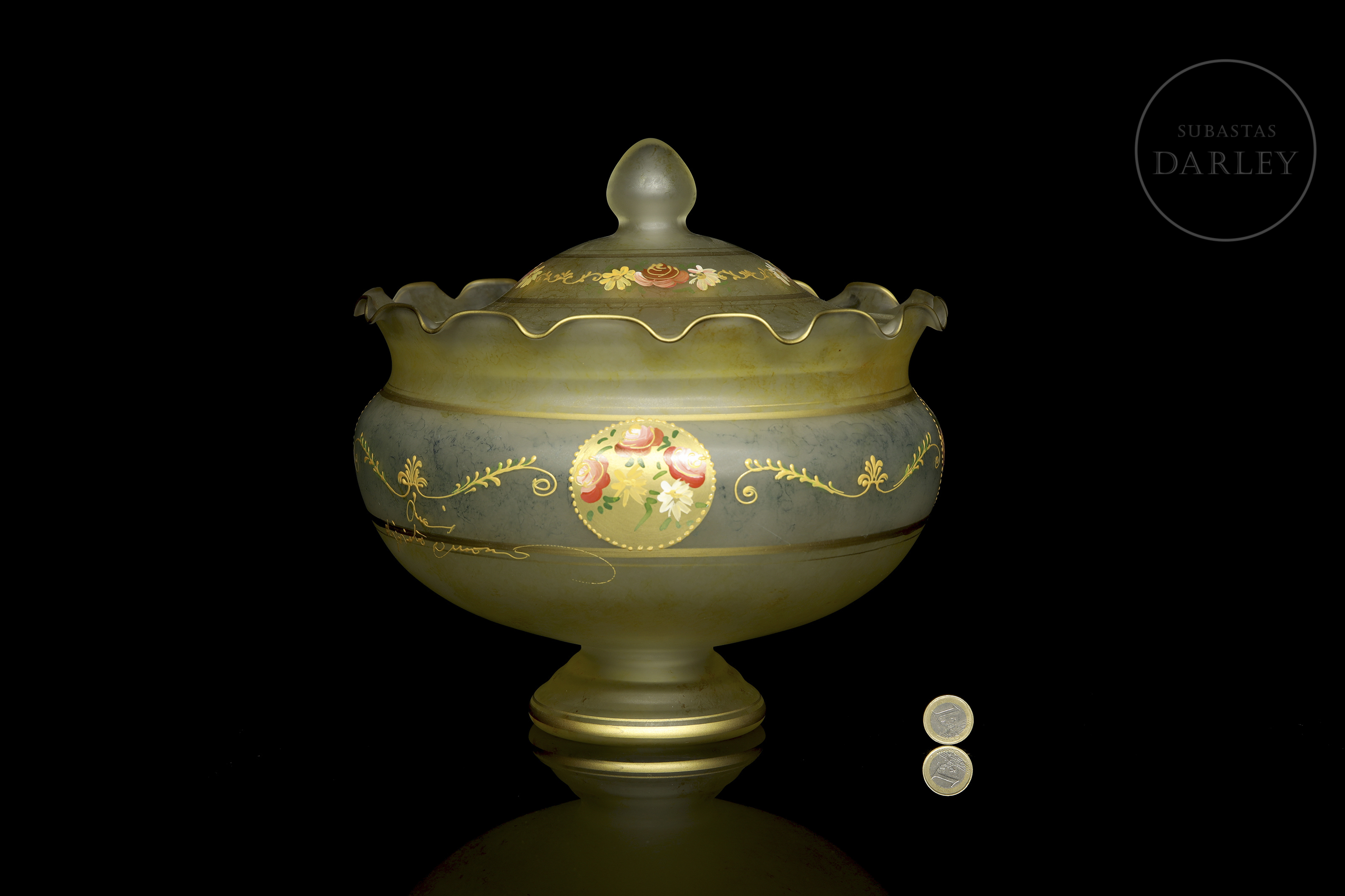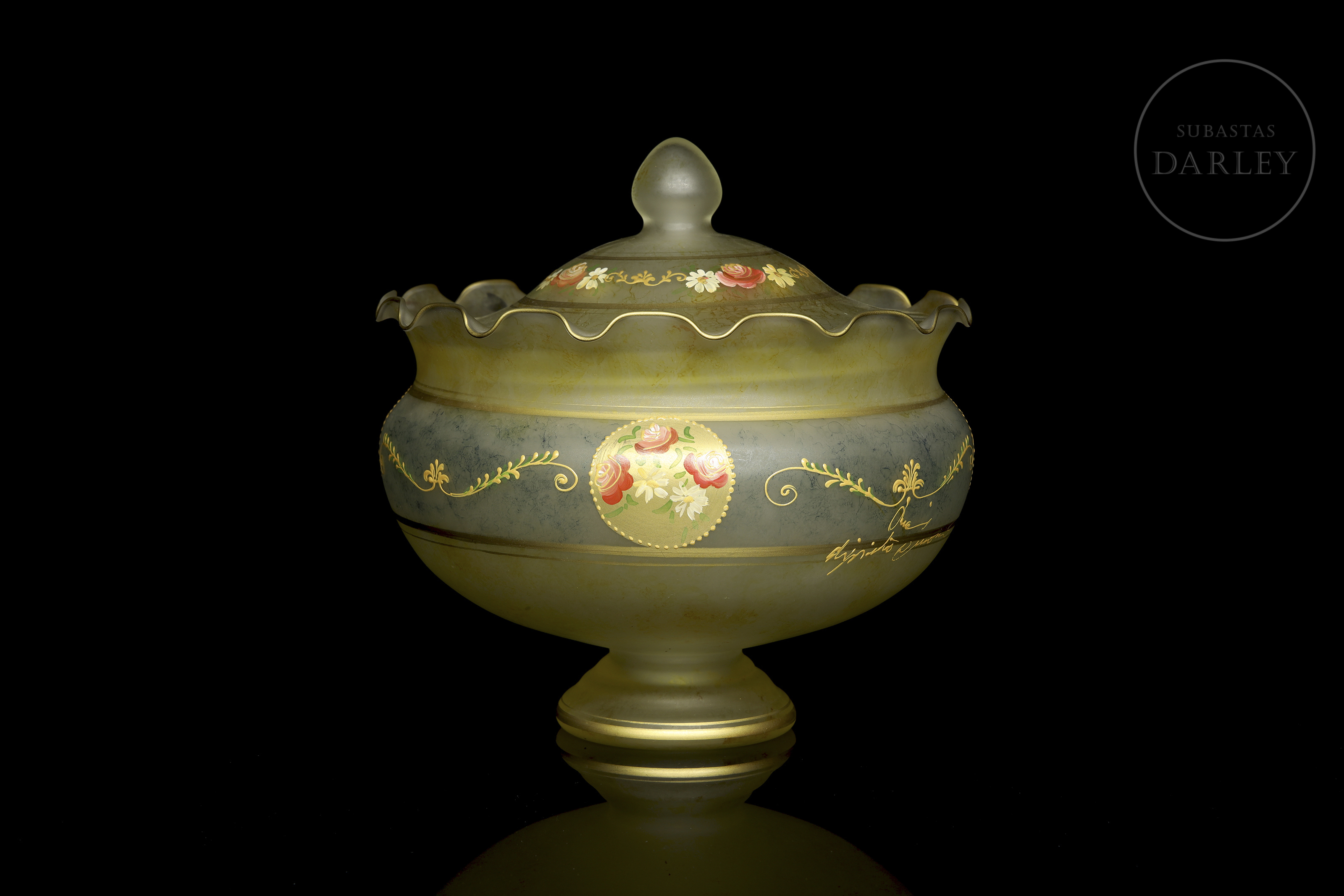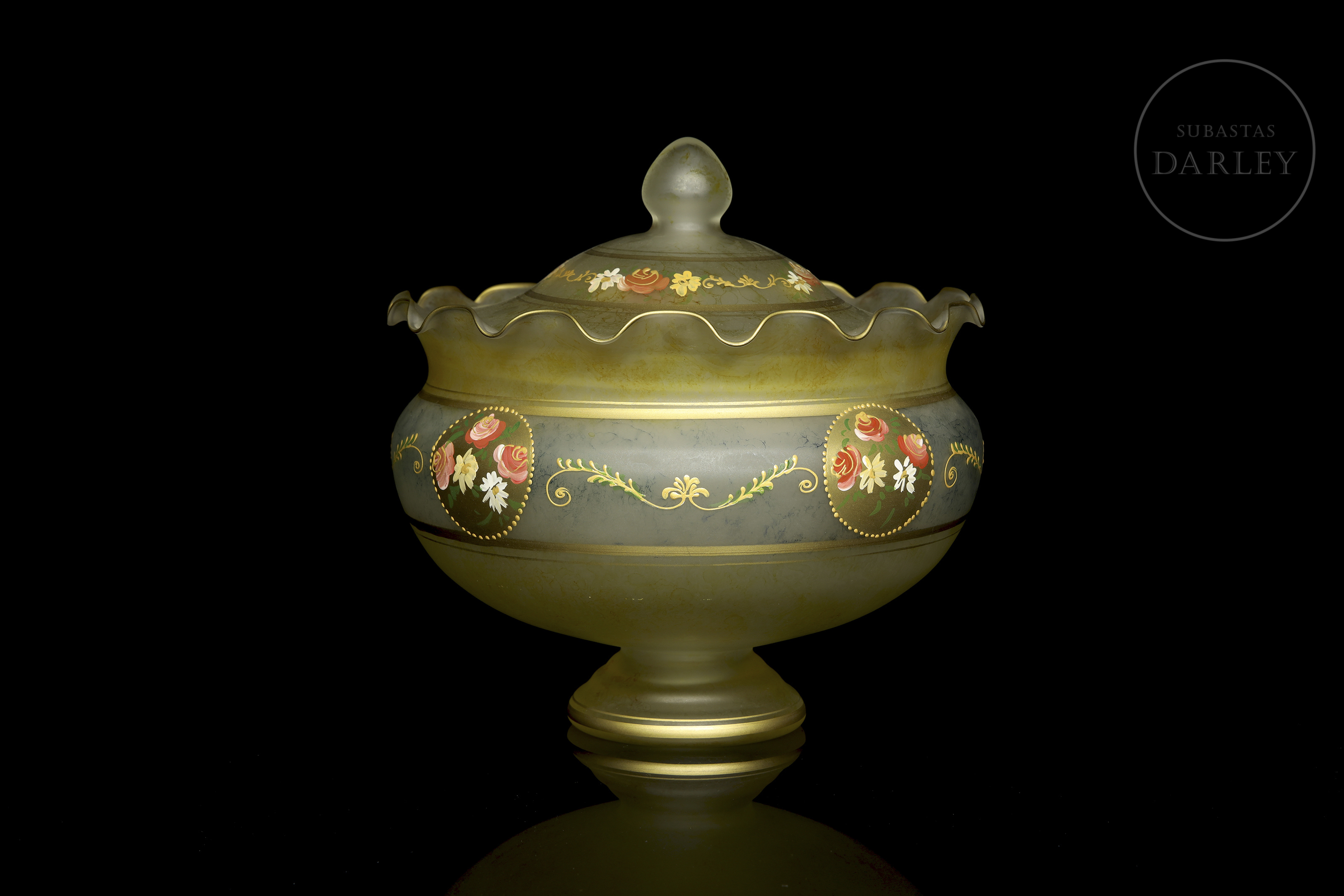采用绿灰色缎面玻璃制成,边缘呈波浪状。表面饰以繁复纹饰,包括多色珐琅玫瑰纹章及众多金边卷草纹。