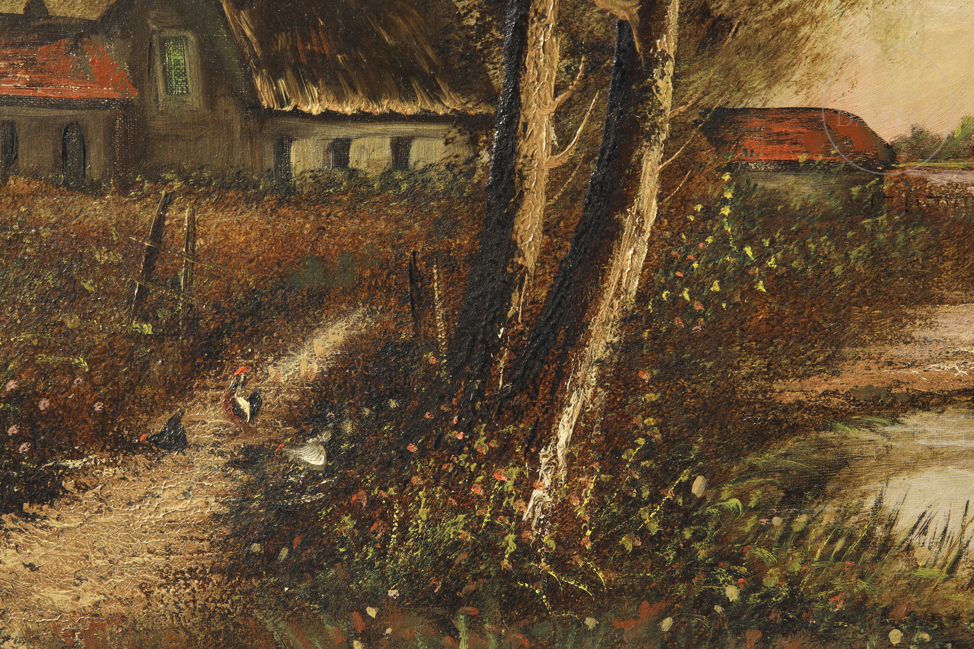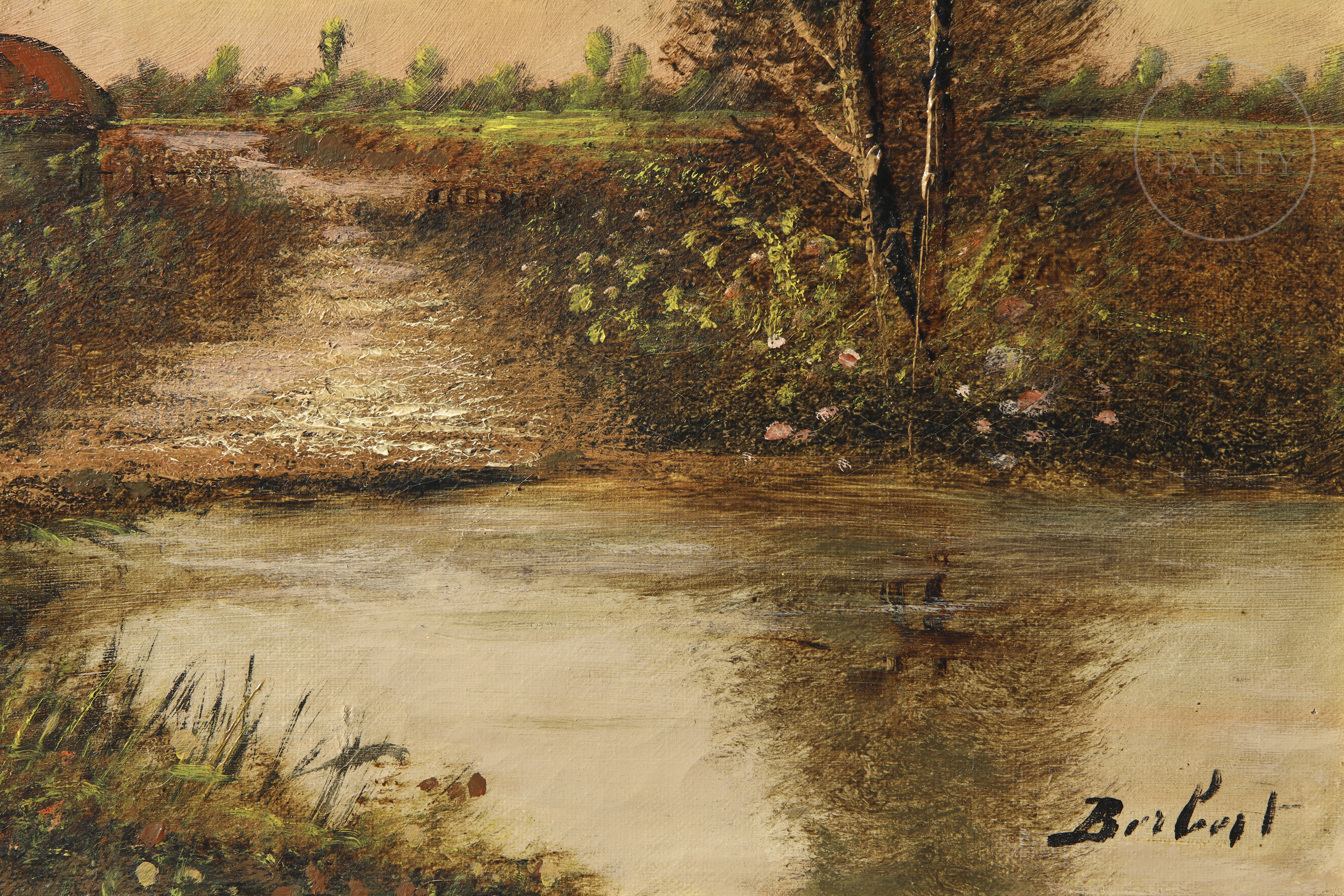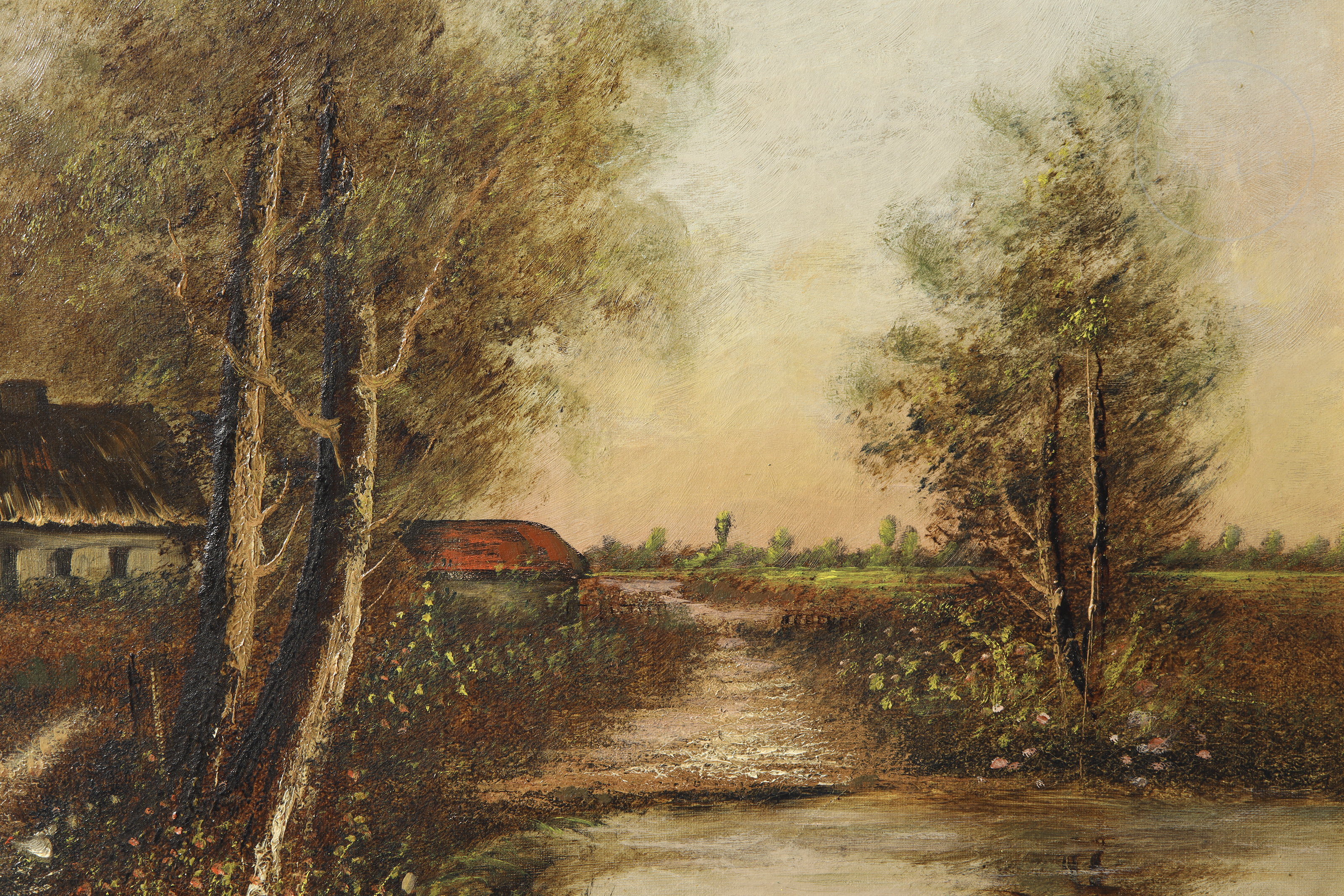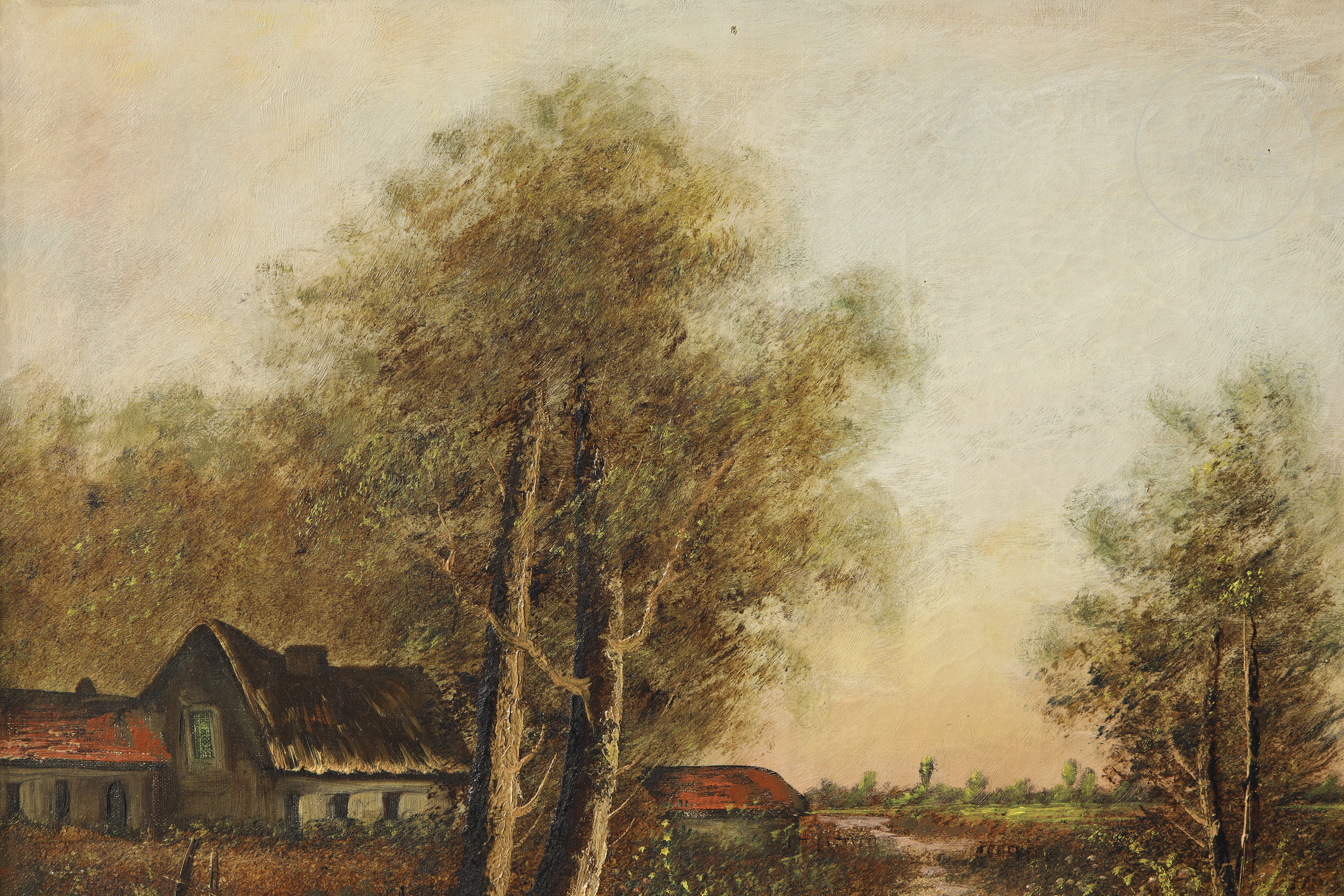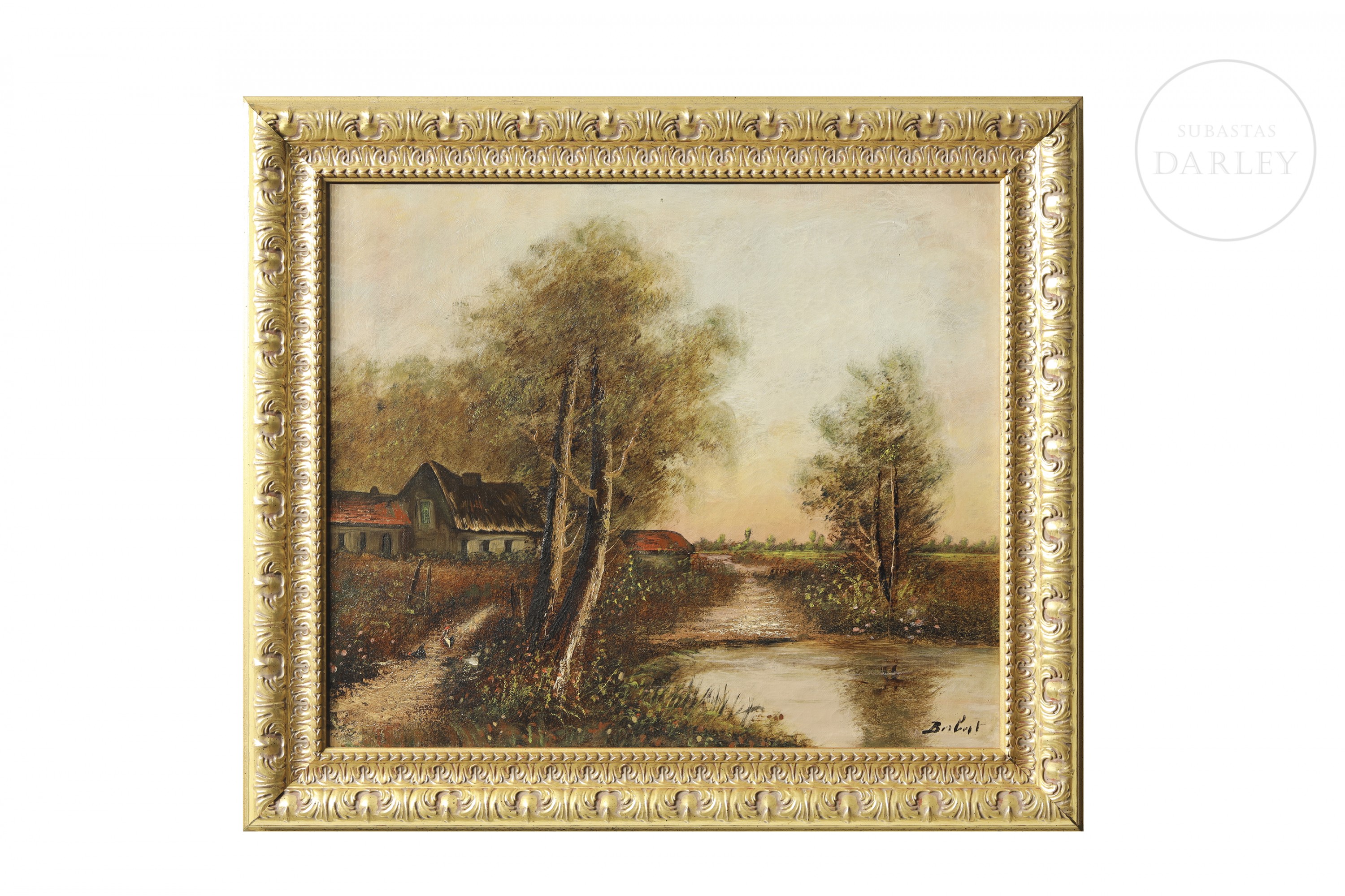 Landscape depicting several houses with gabled roofs on the shore of a lake. The composition focuses on the reflection of the buildings on the calm water. Signed in the lower right corner.