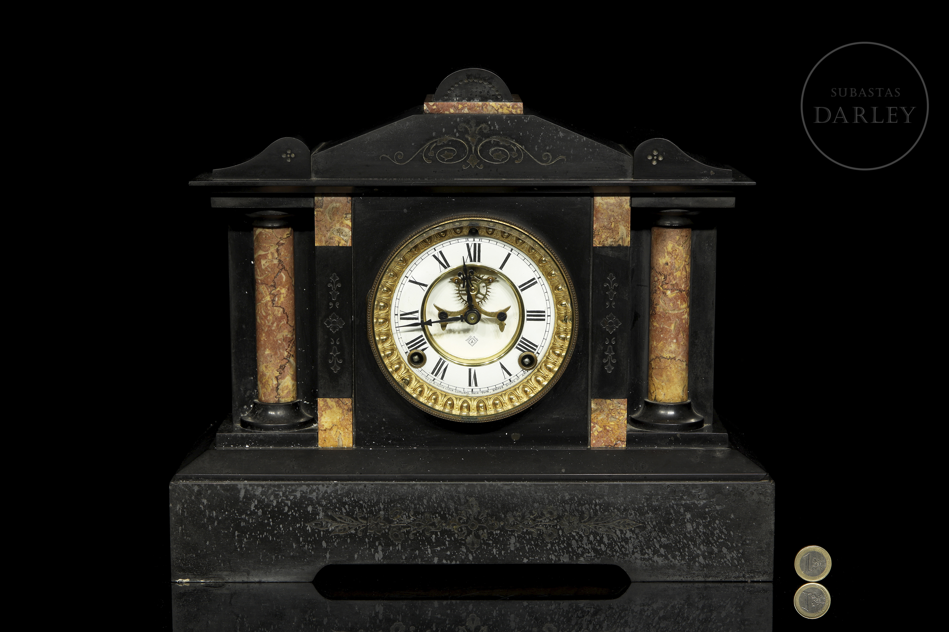 美国建筑风格壁炉钟。采用板岩与大理石材质,内部机芯刻有制造商标记“安索尼亚钟表公司”,表盘上标注生产信息:“美国纽约安索尼亚钟表公司制造”。