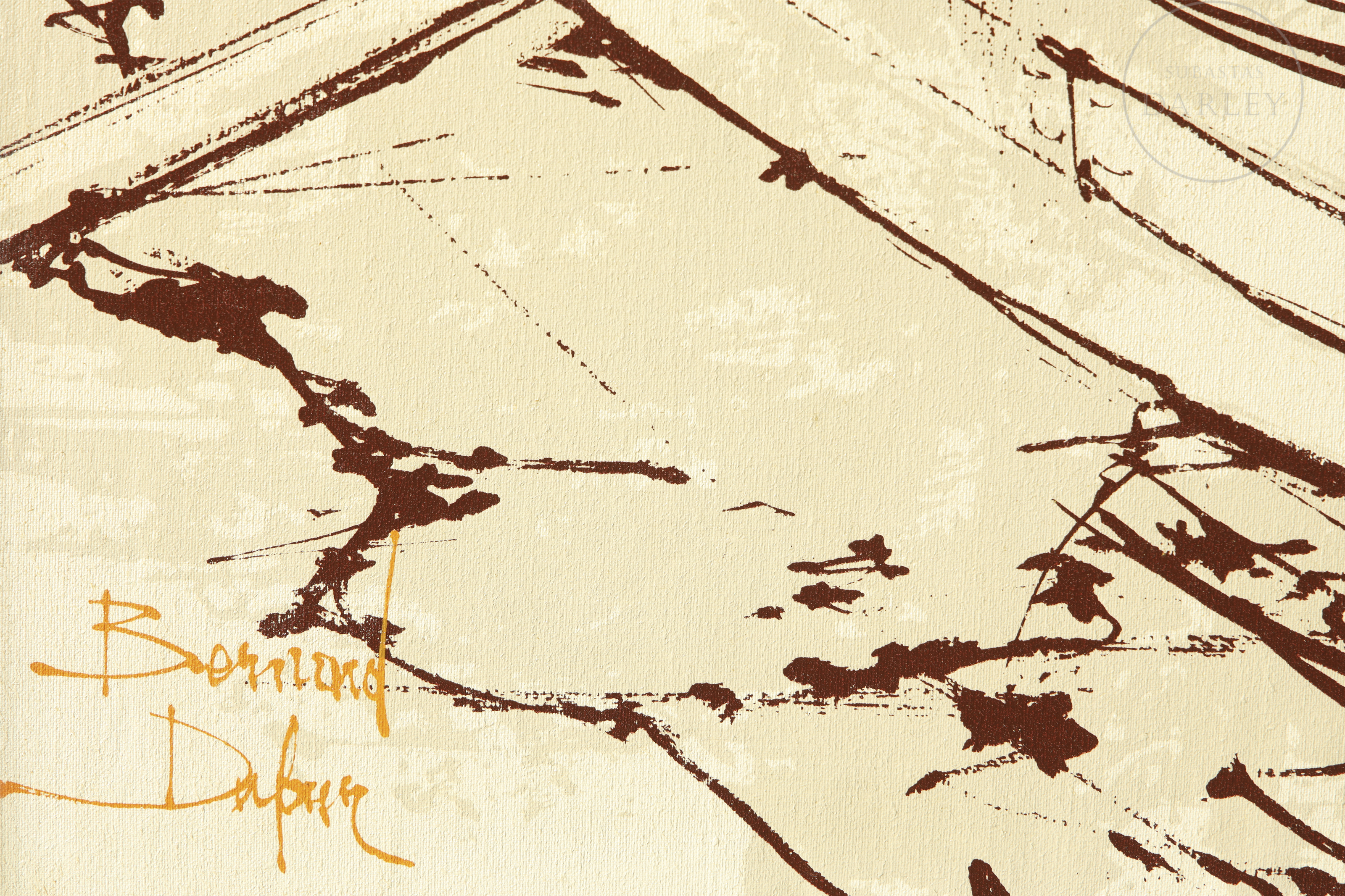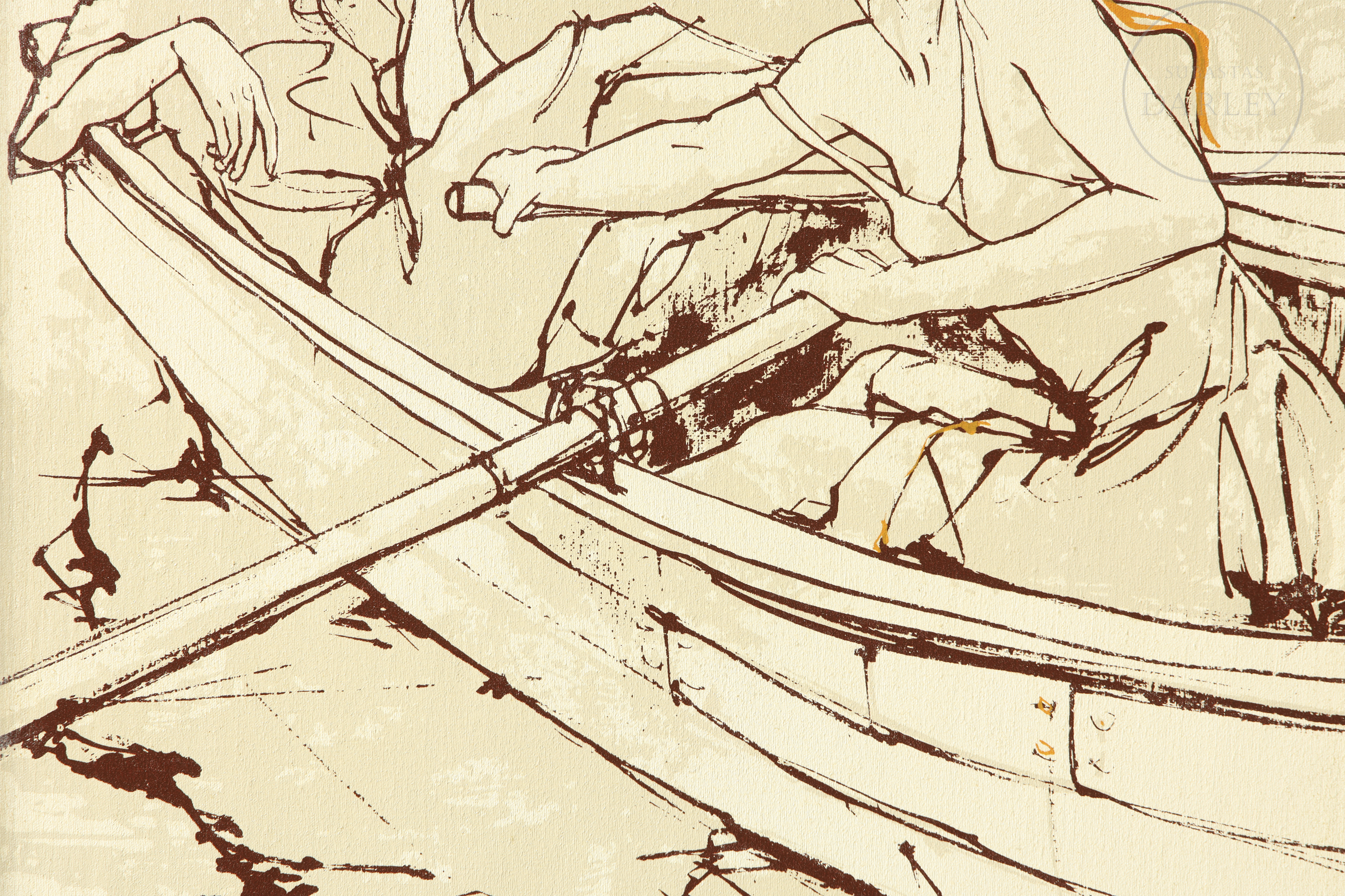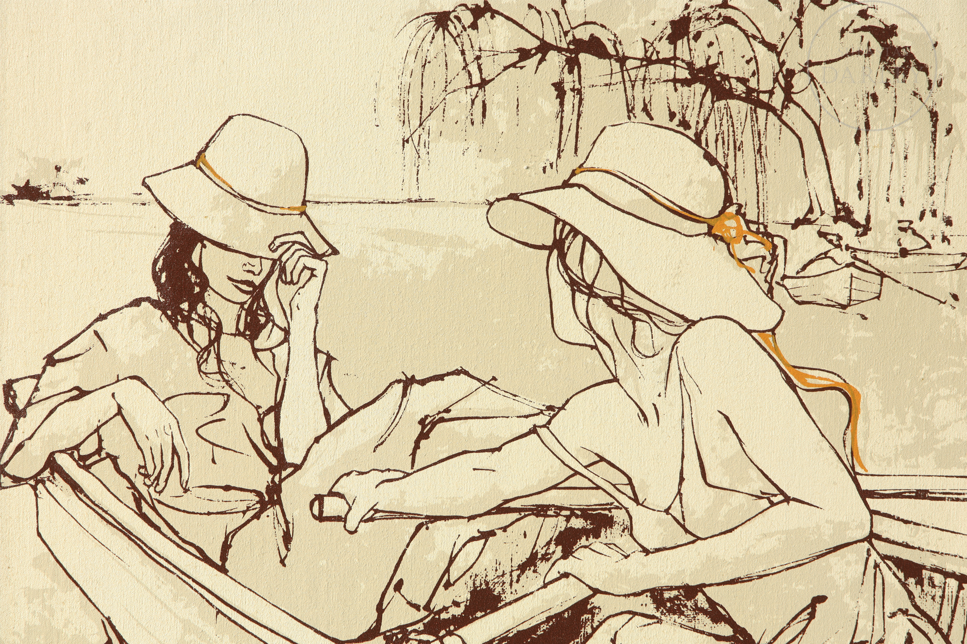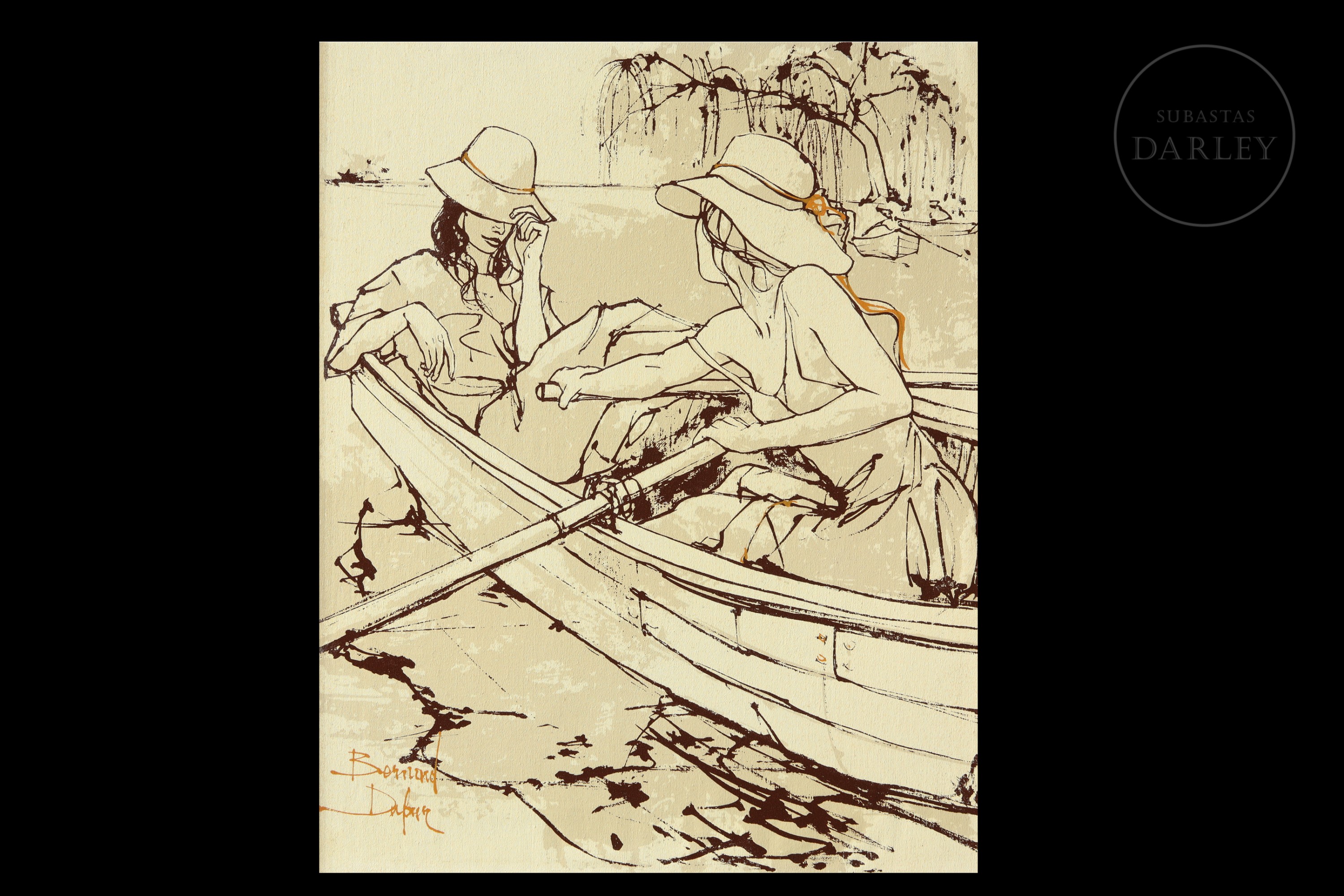 Oleograph on canvas mounted on board. Depicts two women wearing hats conversing inside a boat, in a river setting with warm, sepia tones. Signed ‘Bernard Dufour’ in the lower left corner.