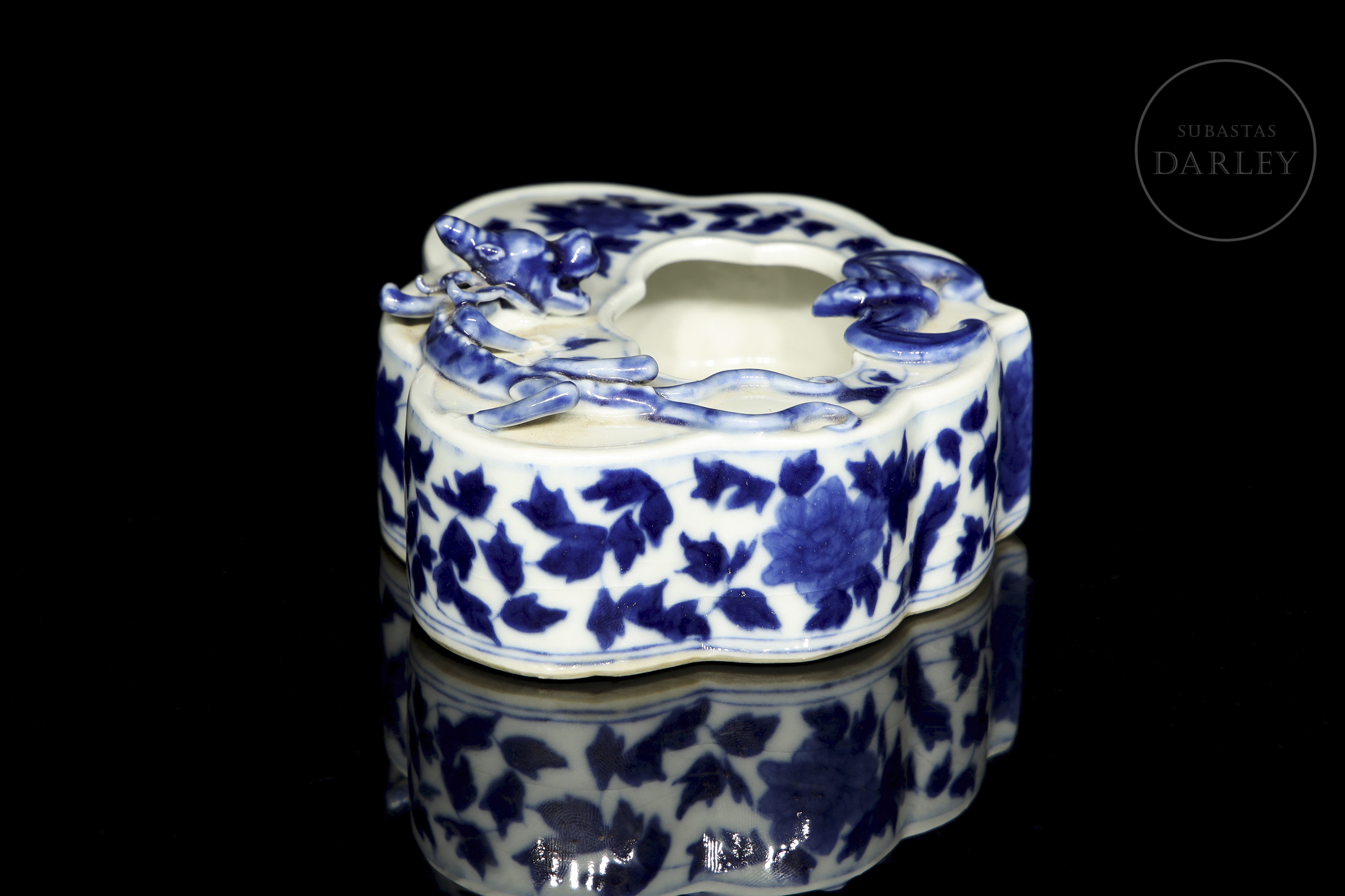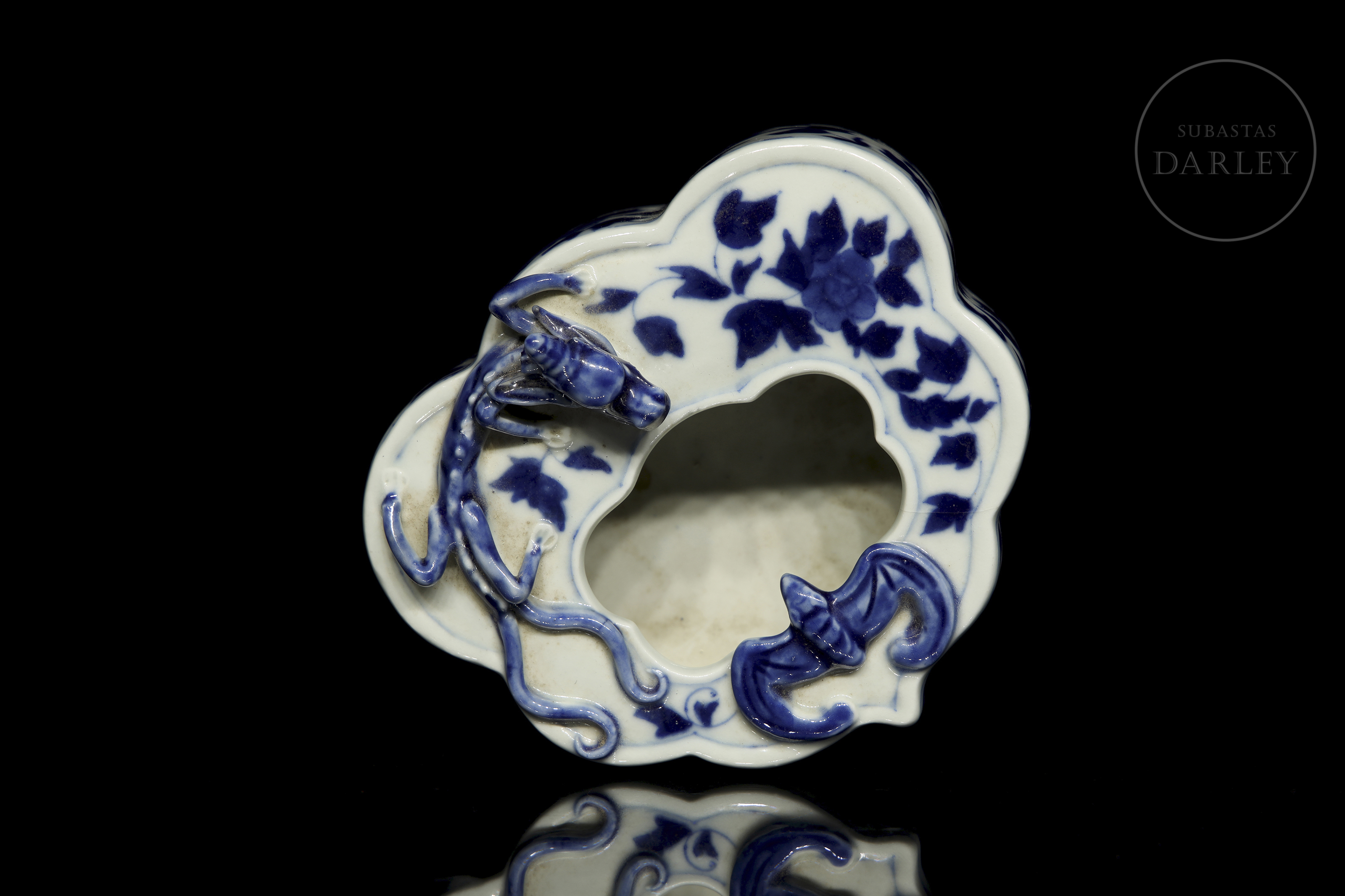 Porcelain inkwell with a lobed shape, decorated in underglaze cobalt blue with floral motifs. At the top, there is a dragon and a bat moulded in relief, flanking the previous hollow.