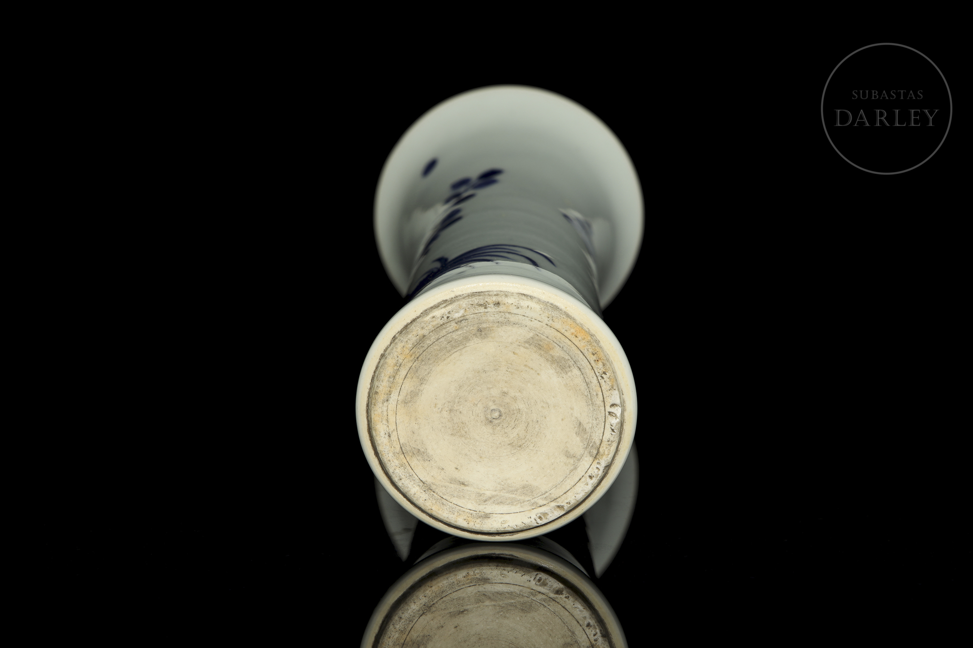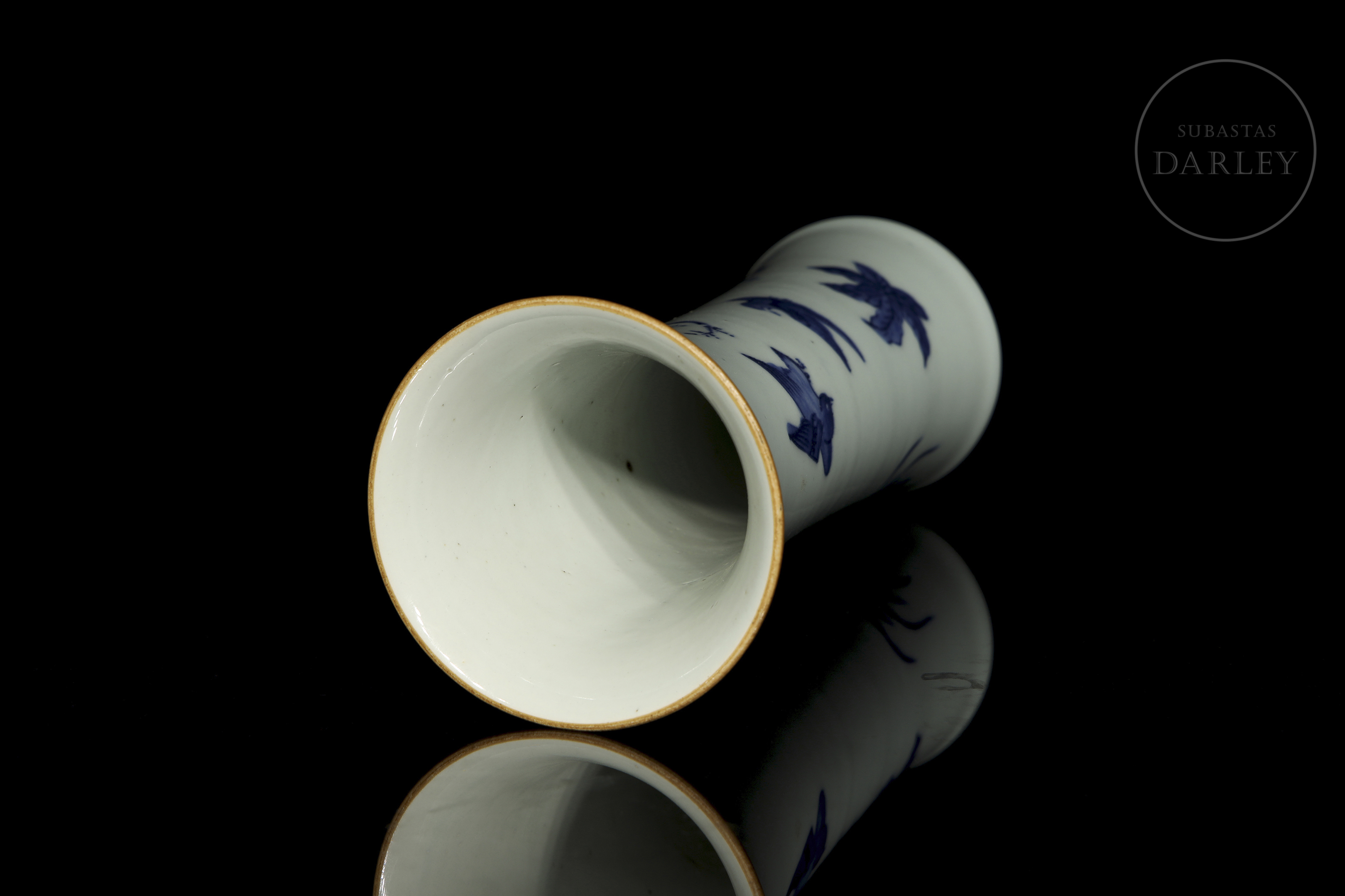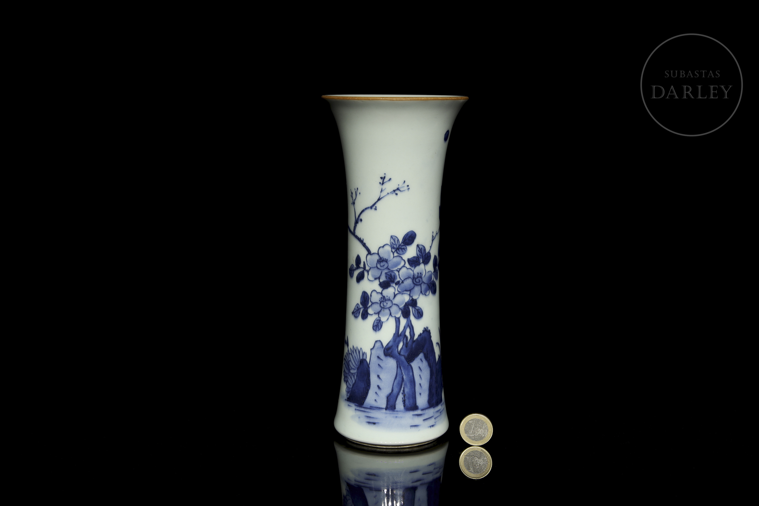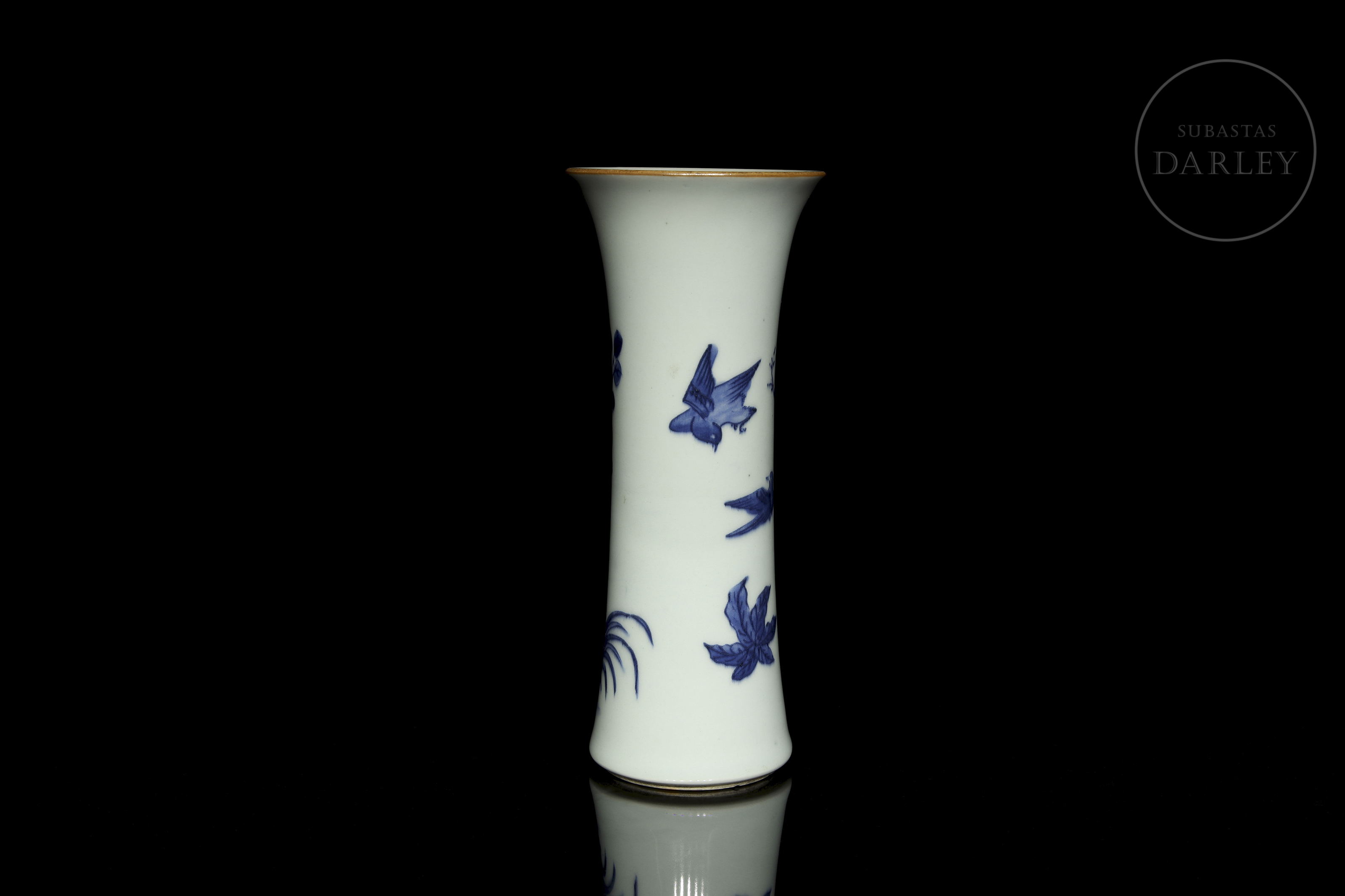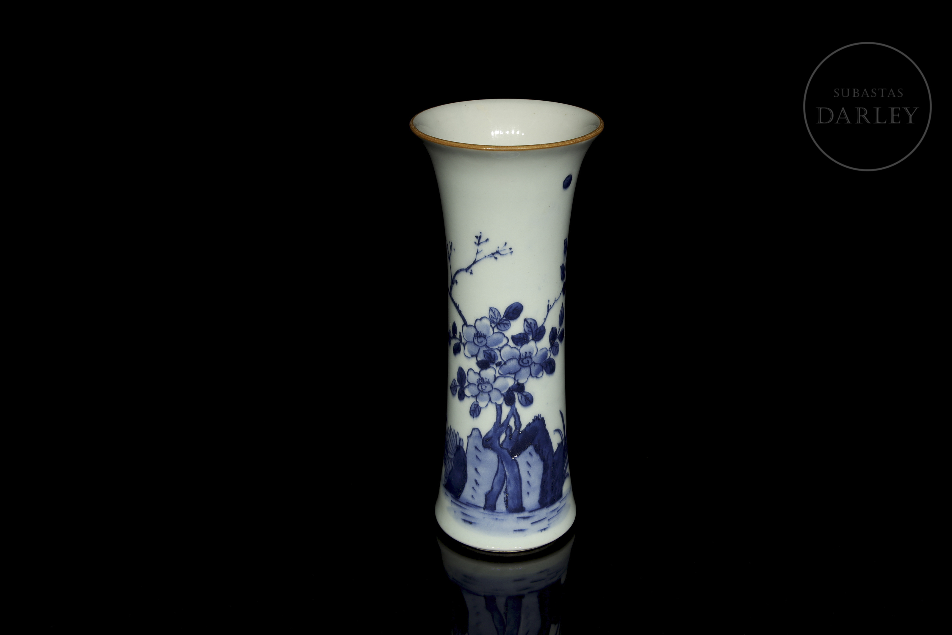 Porcelain modelled in the shape of a cylindrical vase, with a slender body and flared rim. Decorated with a continuous scene in underglaze blue depicting a landscape filled with flowers, rocks and birds in flight. No mark on the base. Qing dynasty (1644–1912)