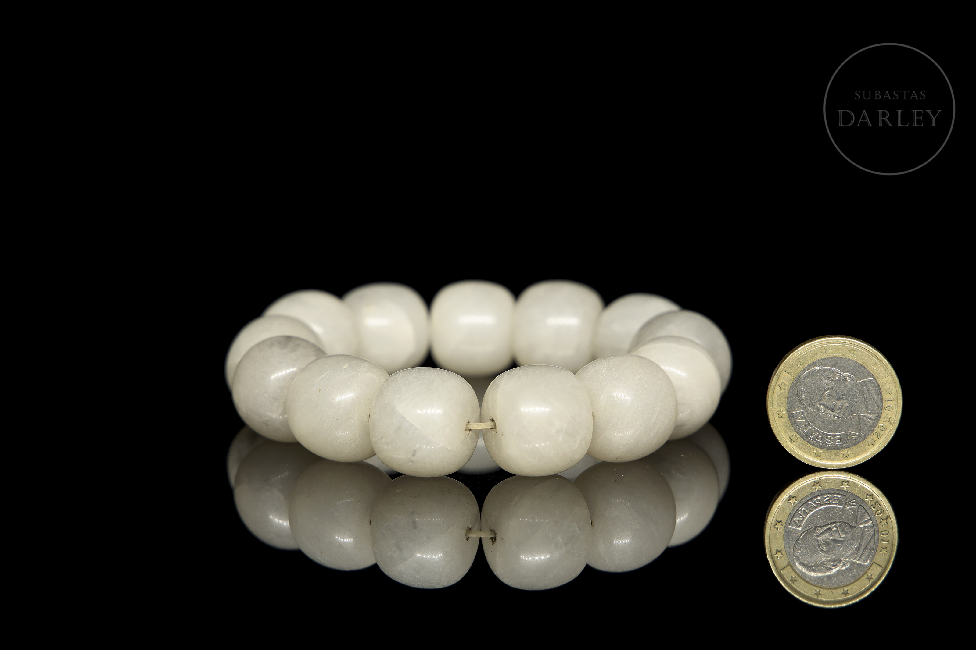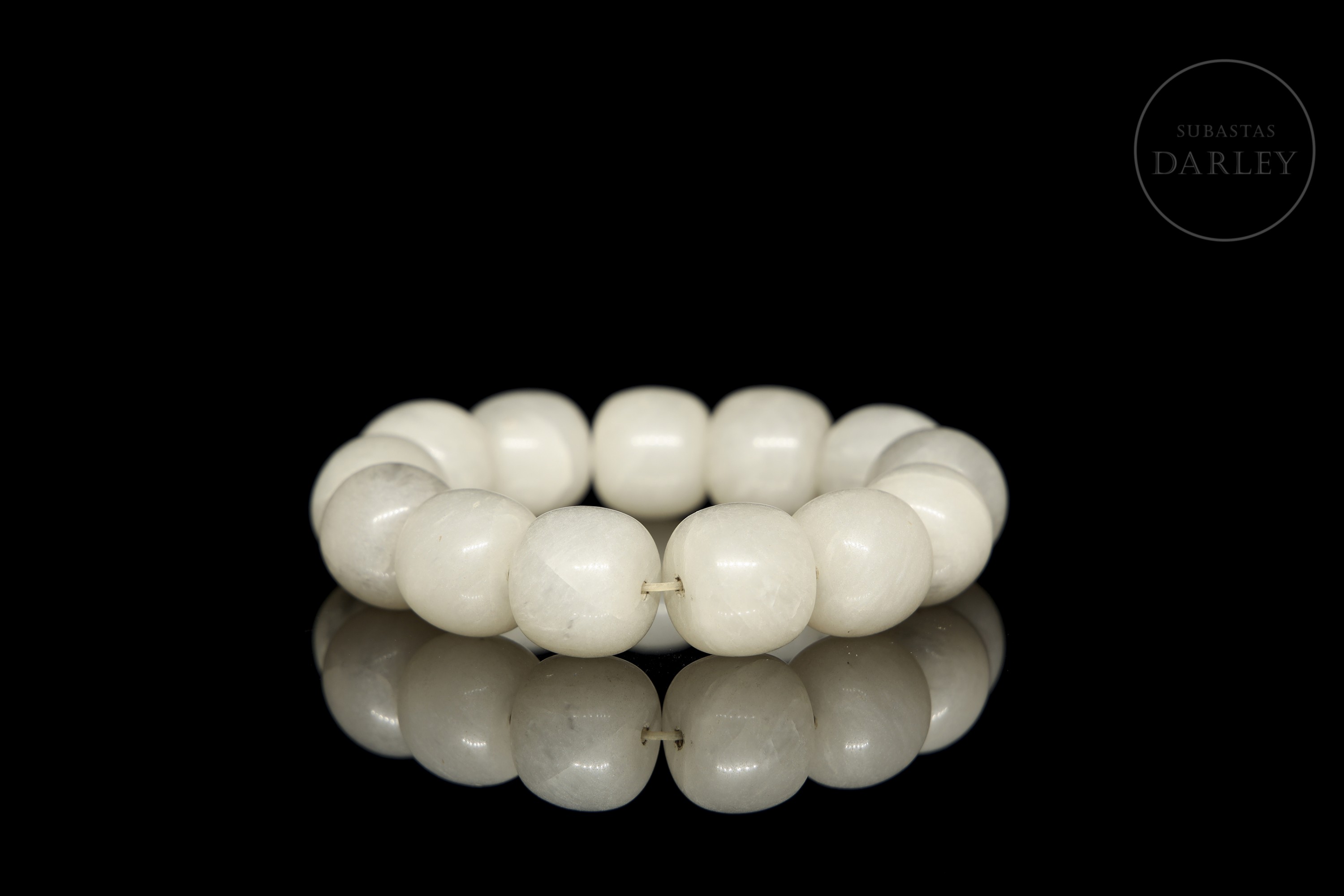 Bracelet made of 13 carved stone beads in translucent white tones, with slight irregularities characteristic of hand carving. The material, with a milky appearance and soft internal veins, has a satin sheen. Strung on modern elastic thread.