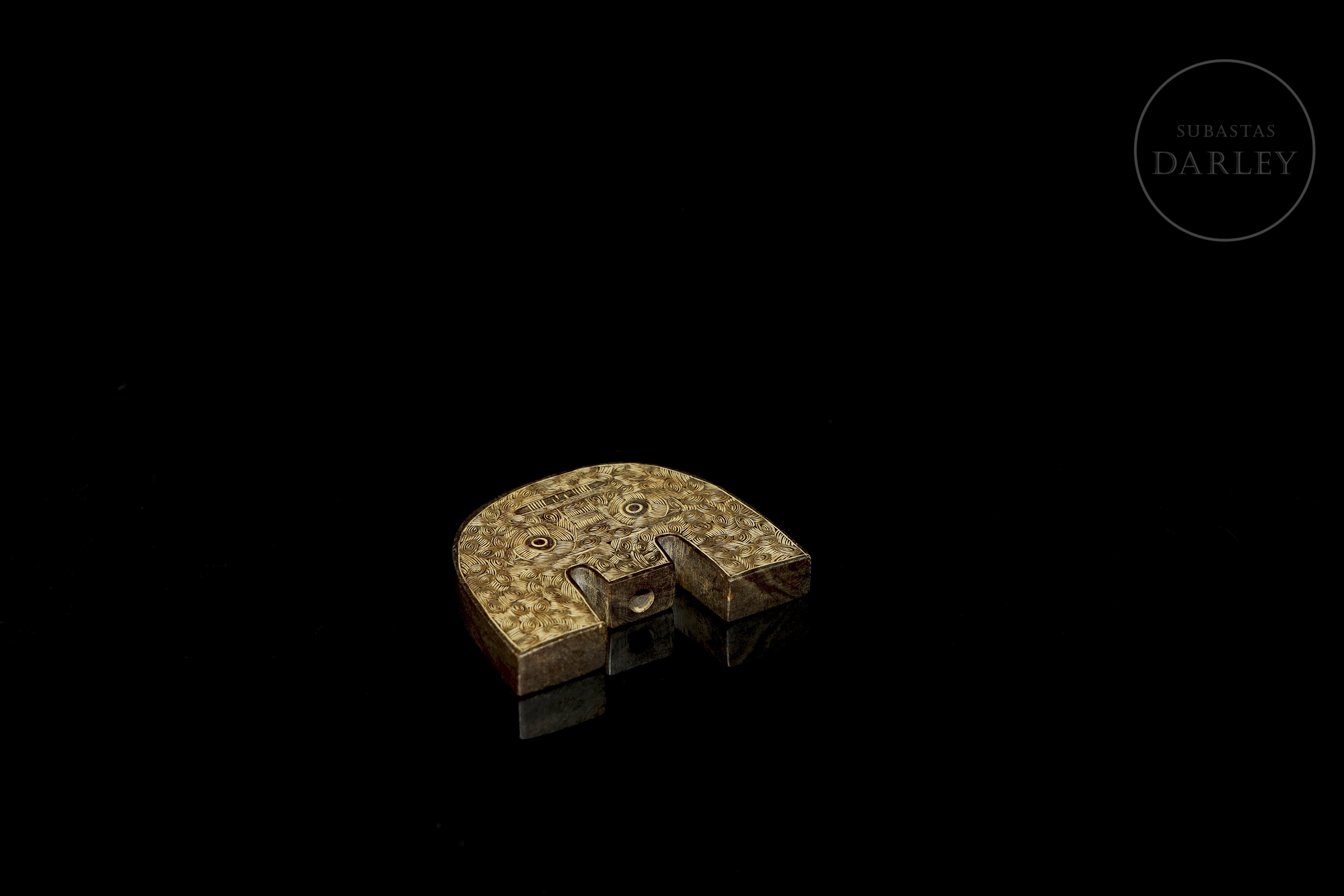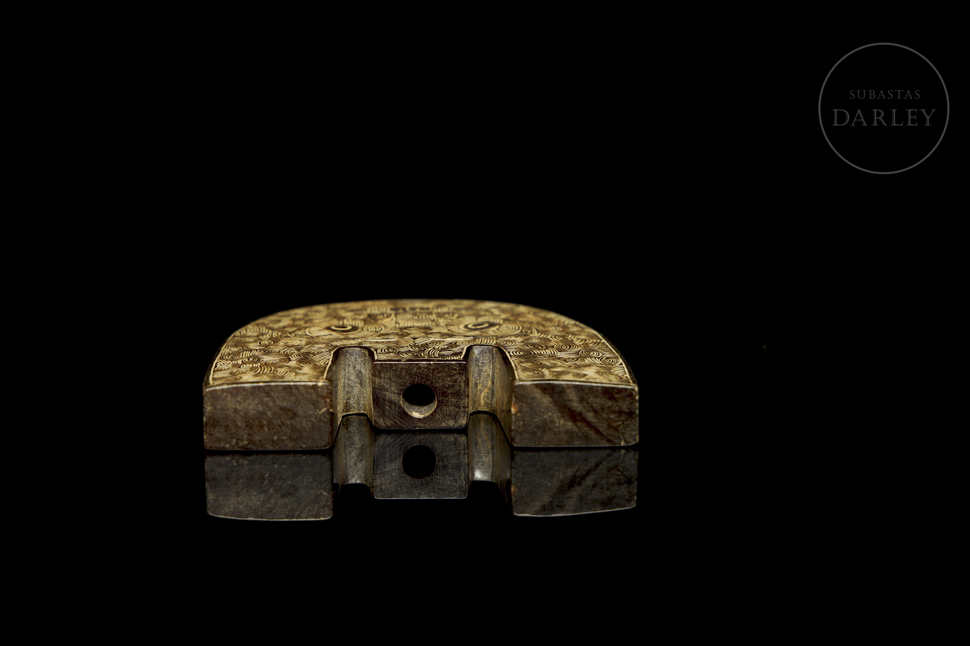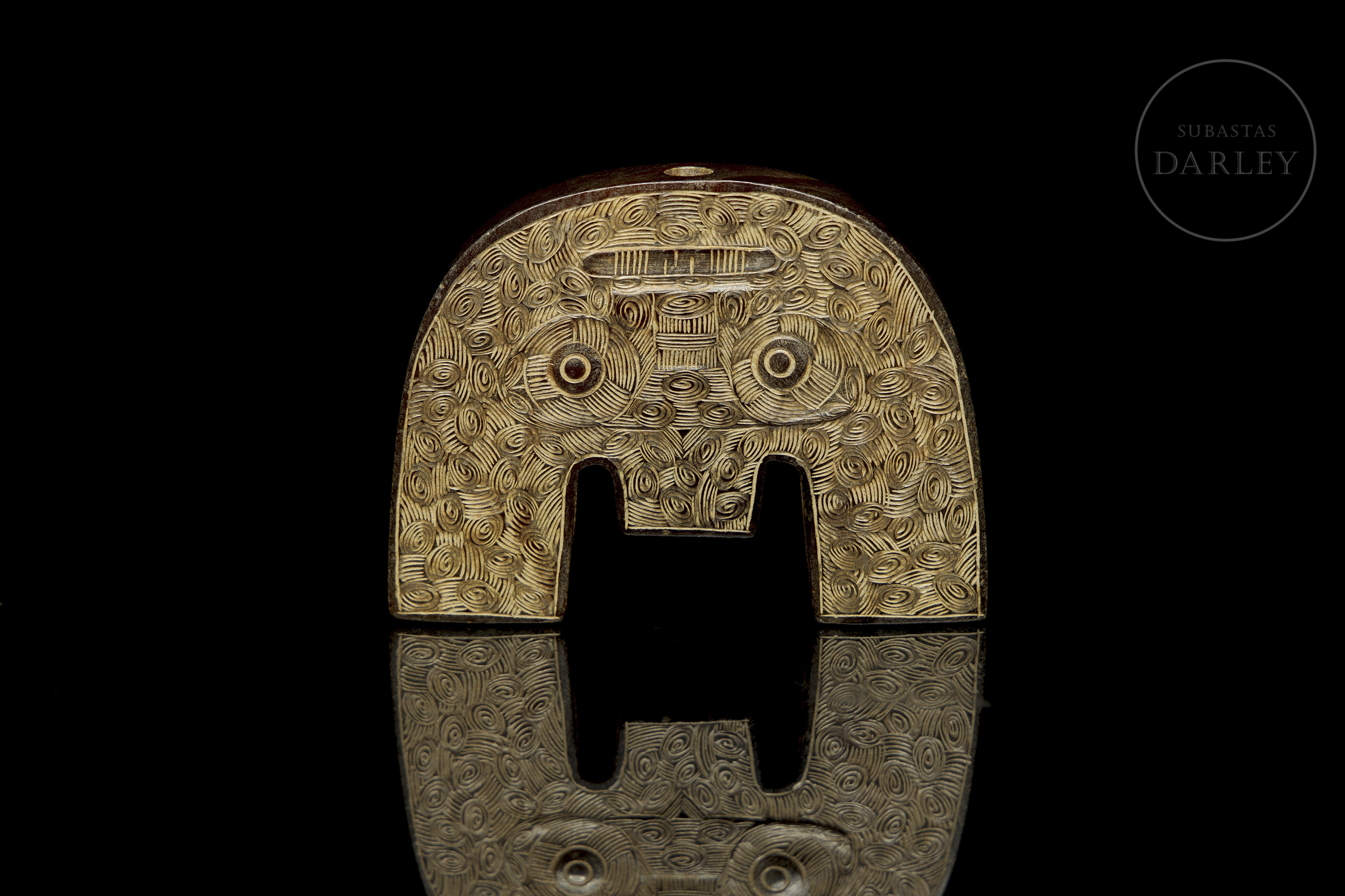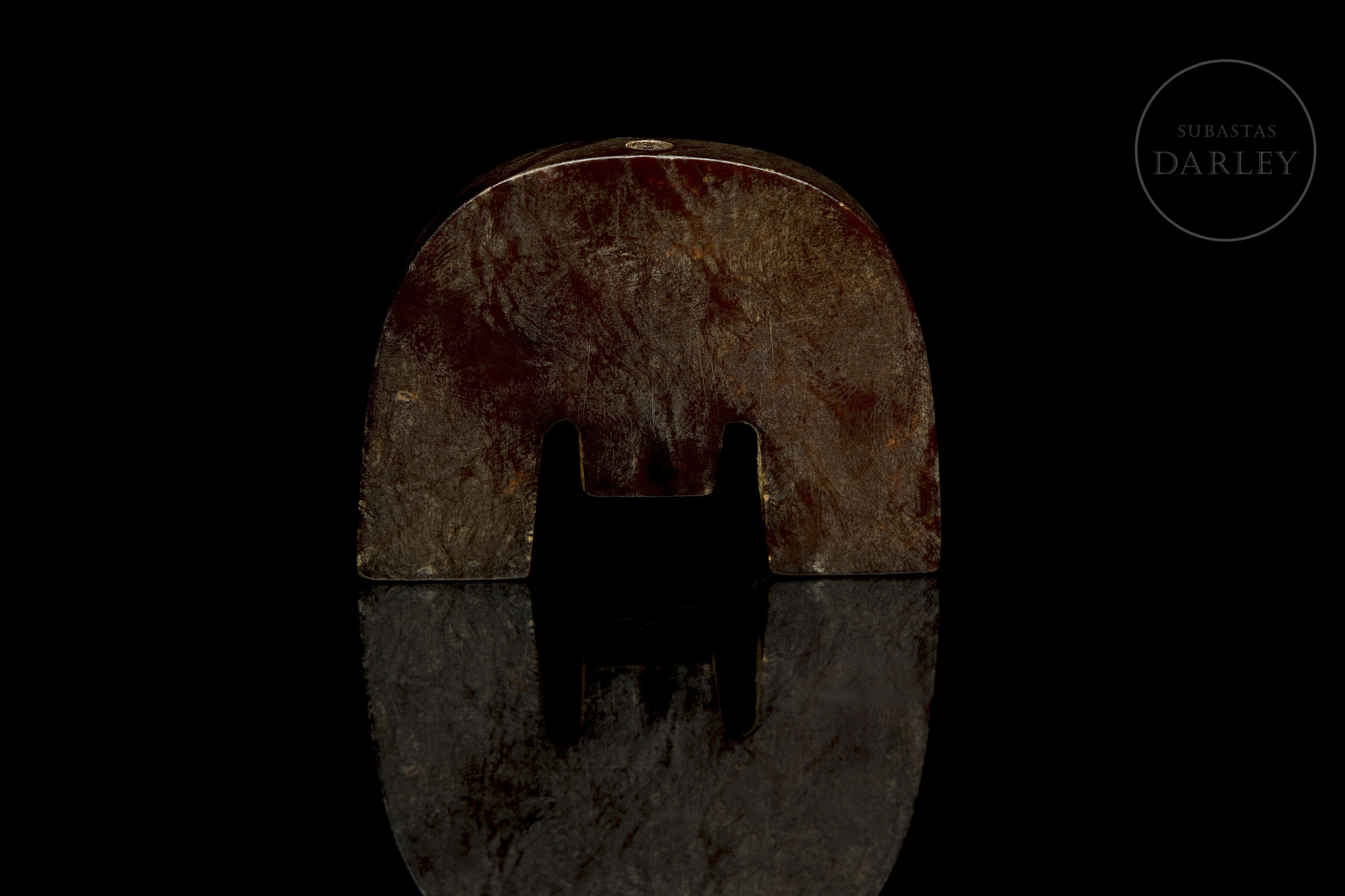 Archaic jade plaque in the shape of an inverted U or ‘mountain’. The piece, which is an intense reddish colour, is finely engraved on its main face with a stylised mask of a deity, with large circular eyes and a mouth, on a background of delicate scrolls and multiple lines.