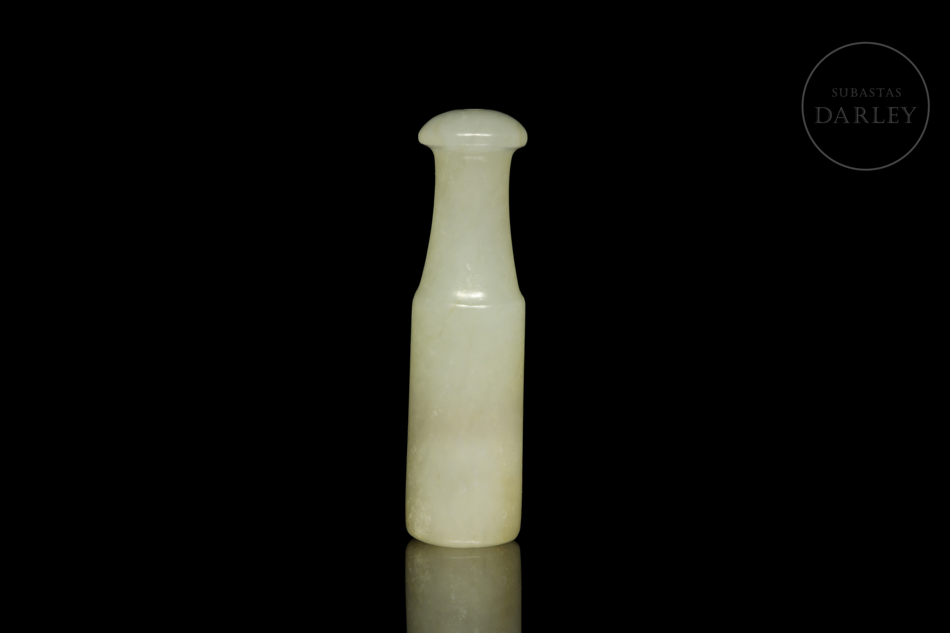 Carved jade with a uniform white tone and light natural ochre veins. It has a cylindrical shape, with a gently flared end, which narrows to finally open up into a wider body. Qing Dynasty (1644–1912).