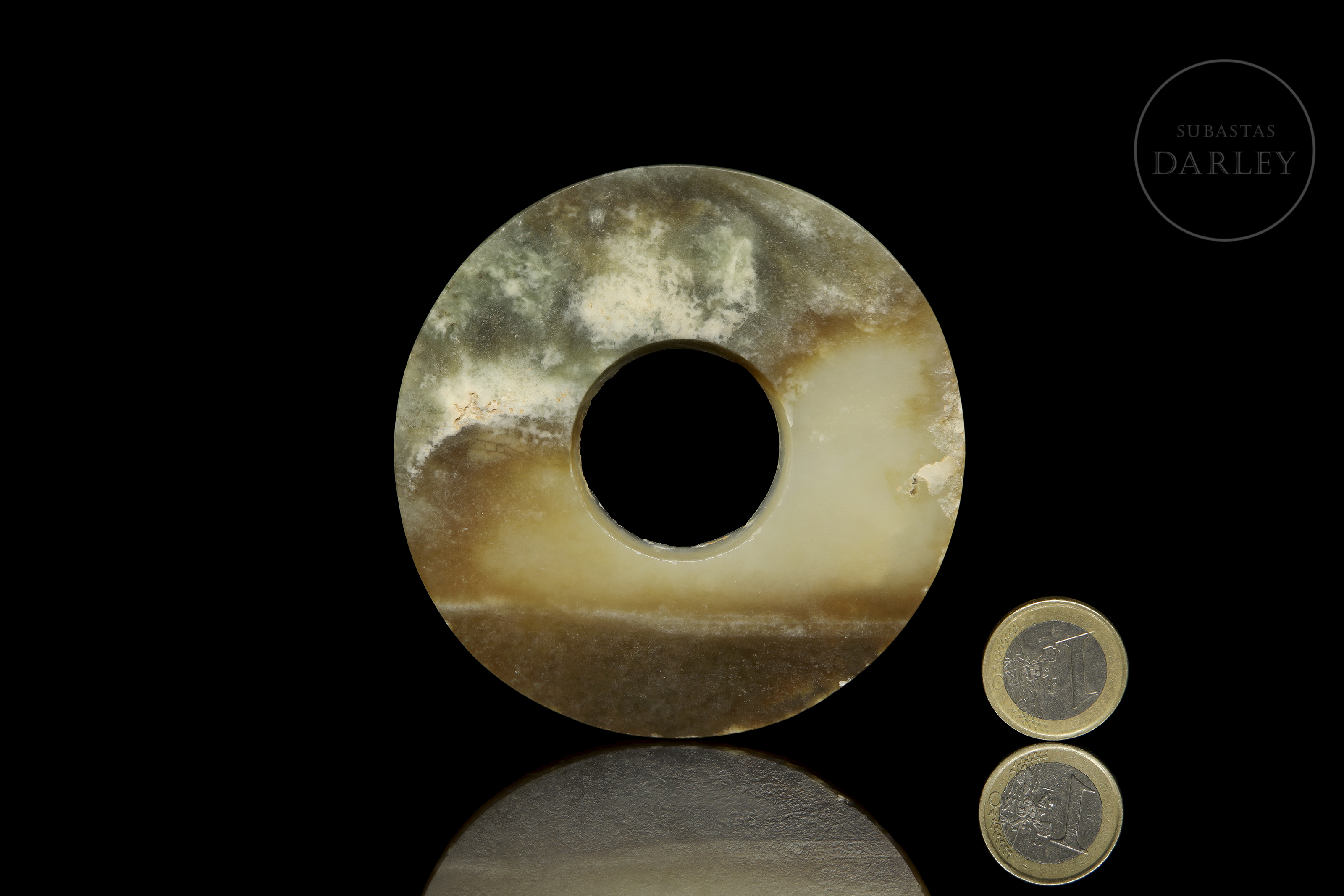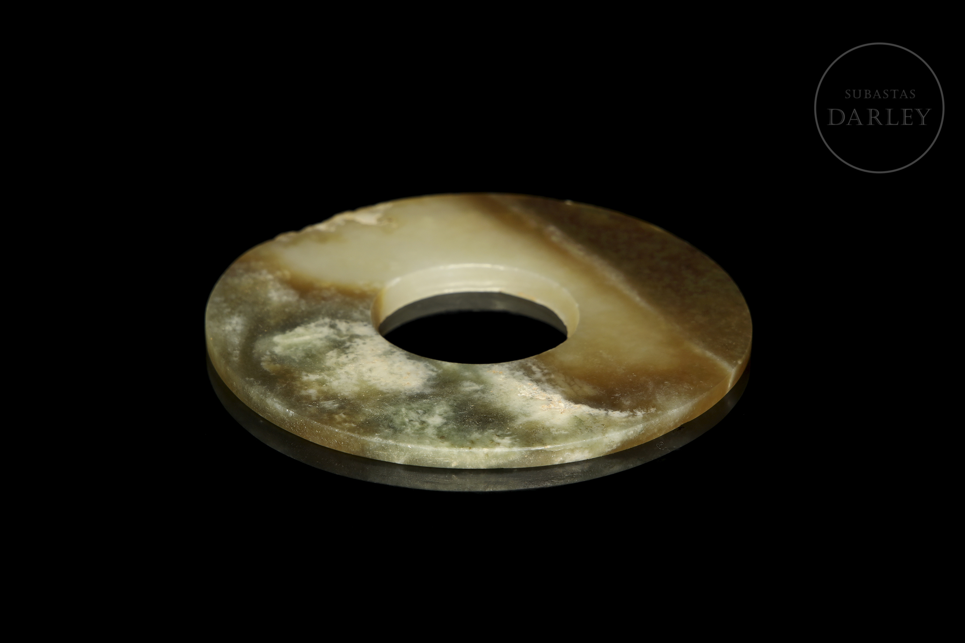 Circular jade disc of varying shades, with green, brown and ivory tones, polished on both sides. It has a circular hole in the centre, defining the traditional shape of the bi. The surface is smooth, with no additional decoration, highlighting the natural veins of the stone.