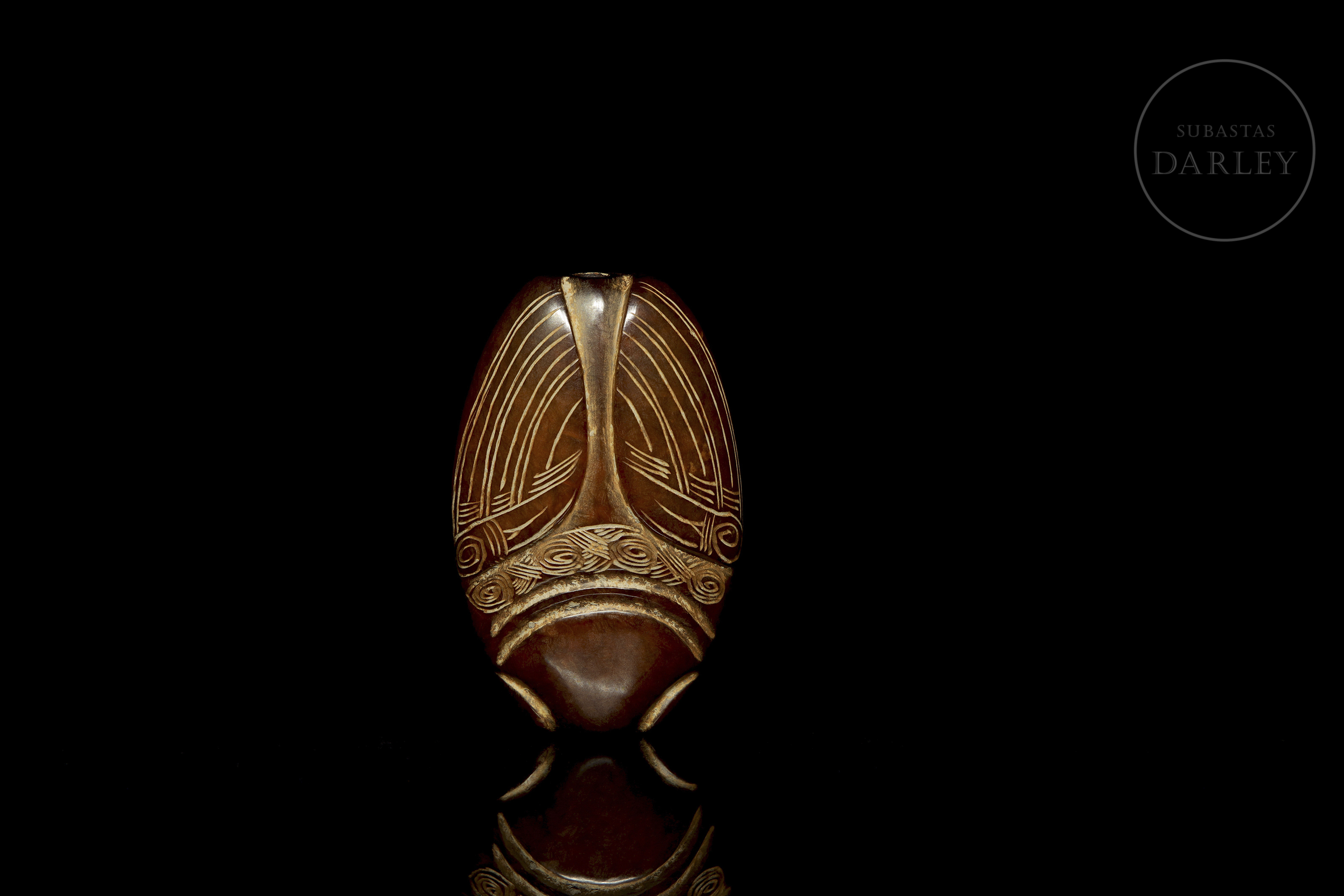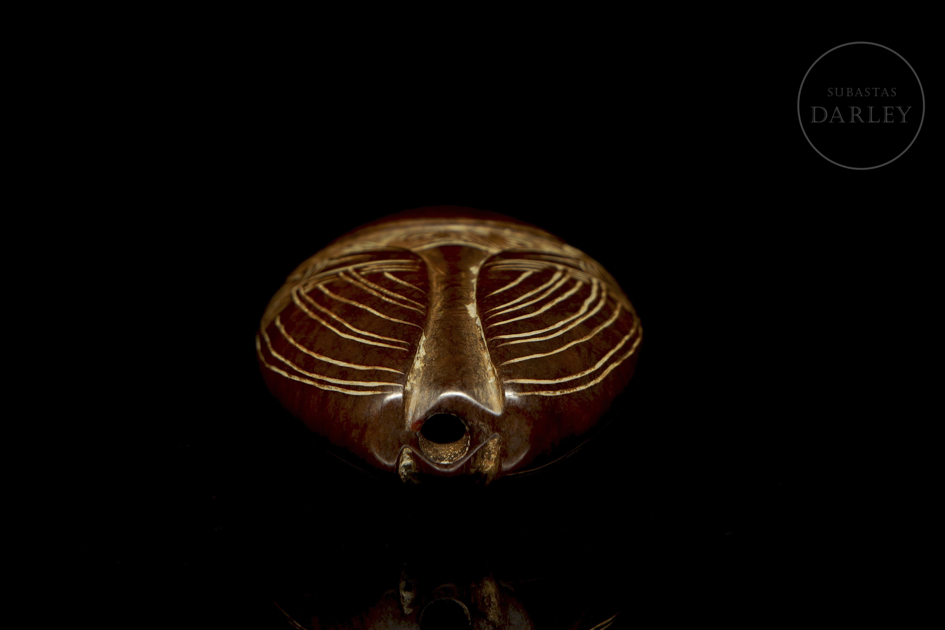 Archaic jade amulet carved in the shape of a cicada. The piece, which is a deep reddish colour, displays the geometric stylization characteristic of Neolithic art. The insect's features are defined by fine incised lines. It has a hole for hanging.