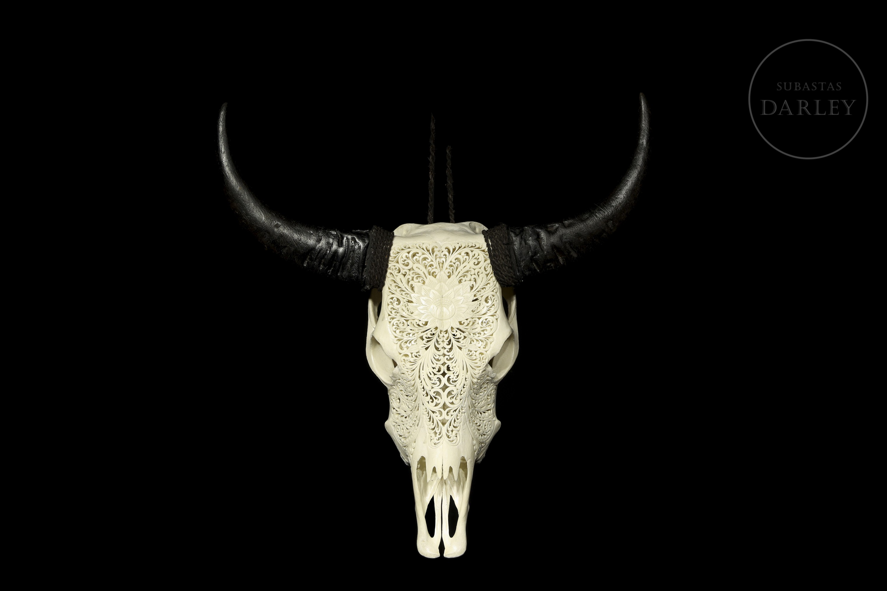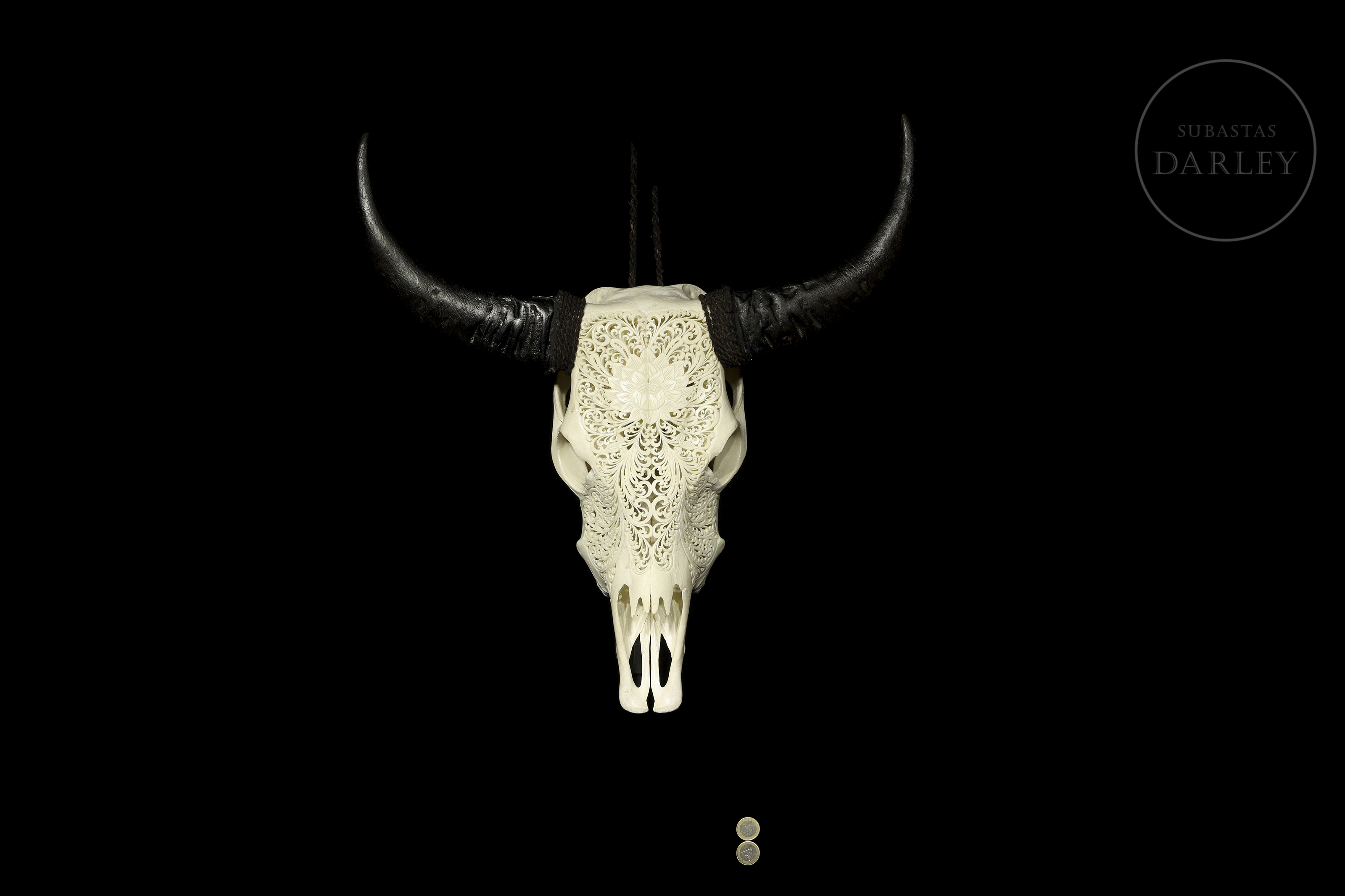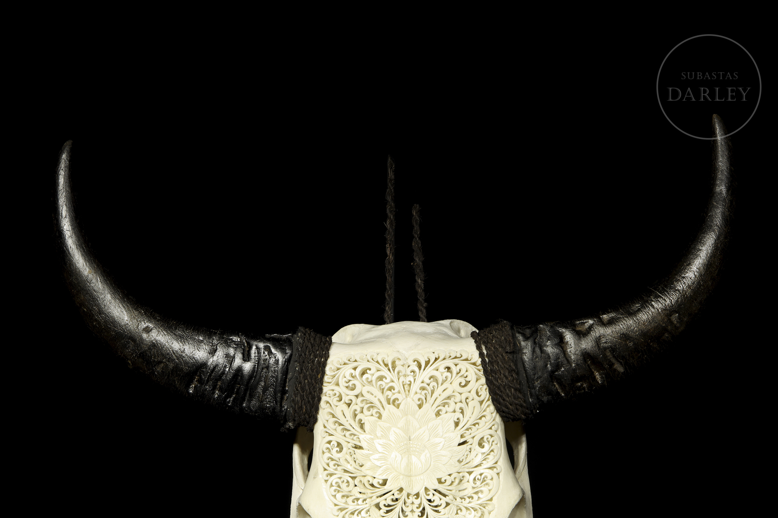 Natural water buffalo skull with original horns, handcrafted using openwork carving with symmetrical plant and floral motifs. This type of decoration, common in Southeast Asia, combines traditional craftsmanship with a contemporary ornamental sensibility.