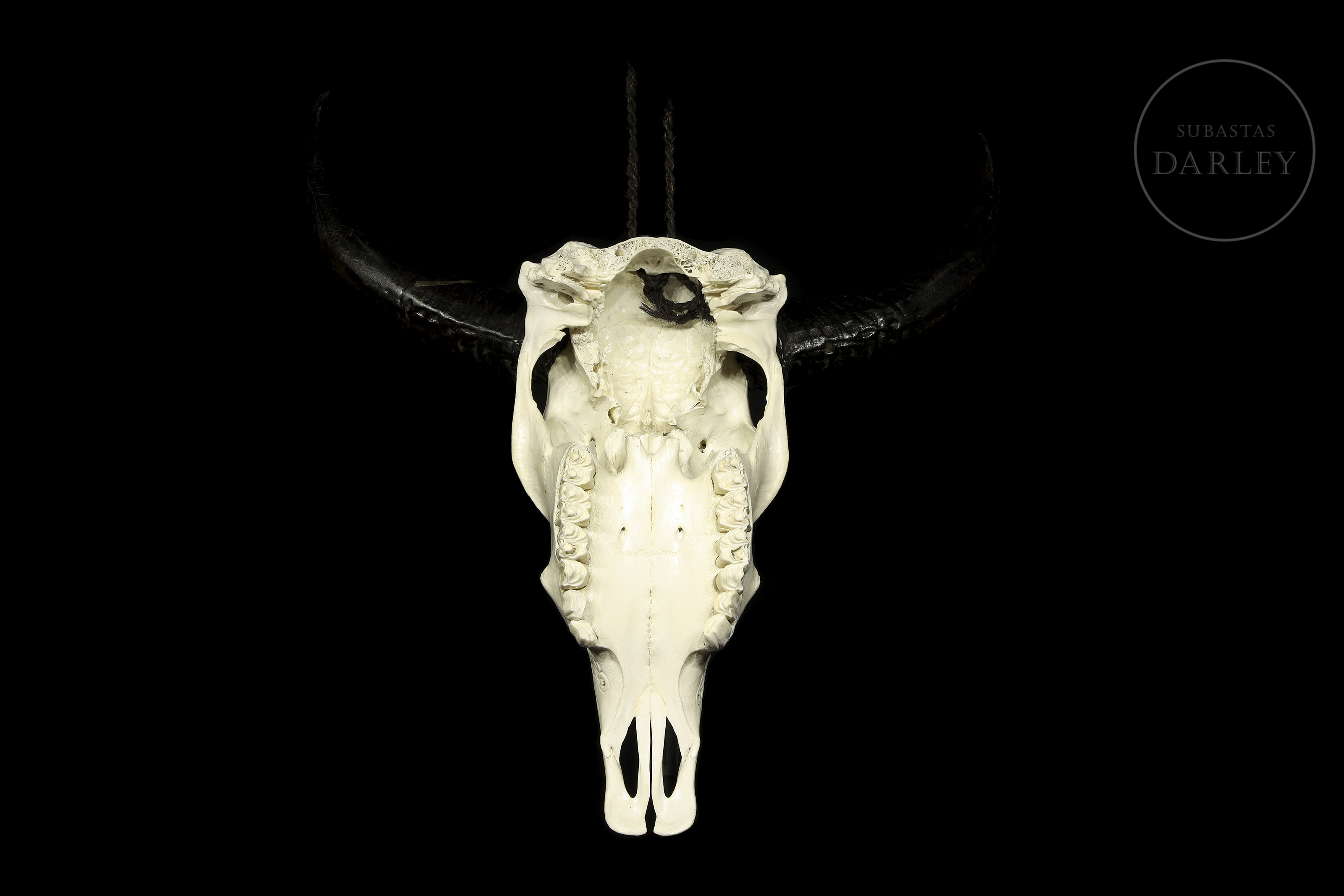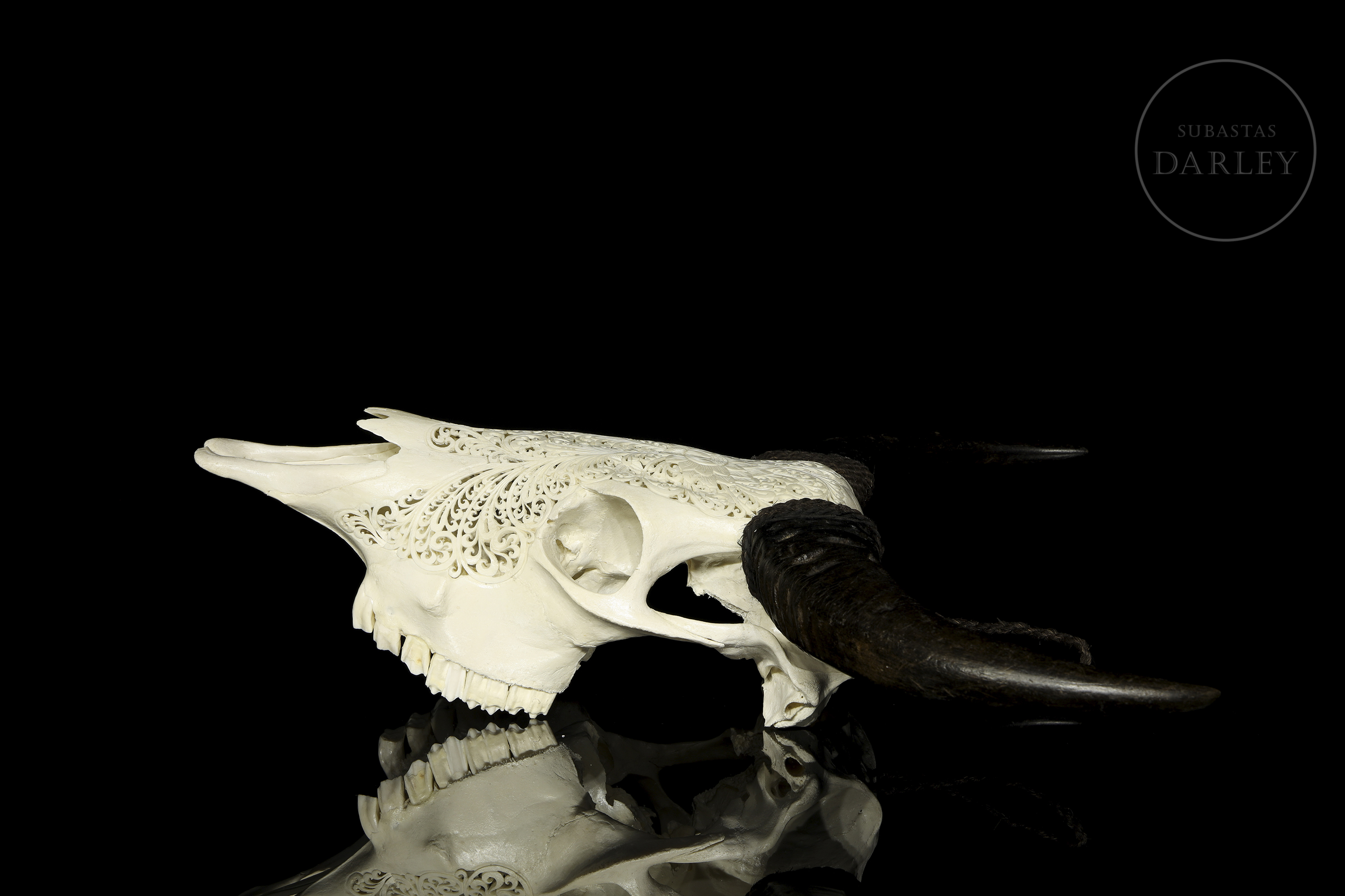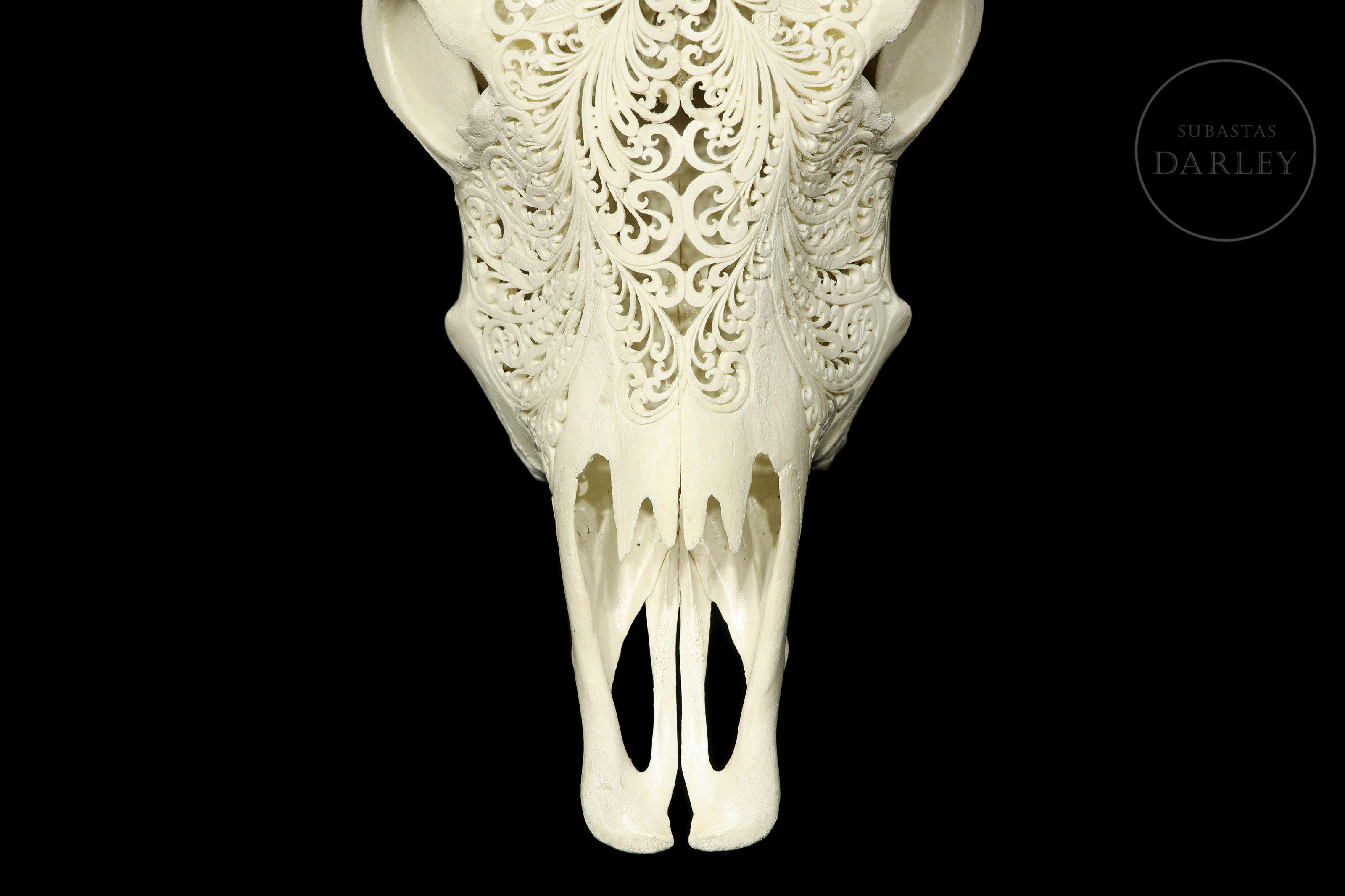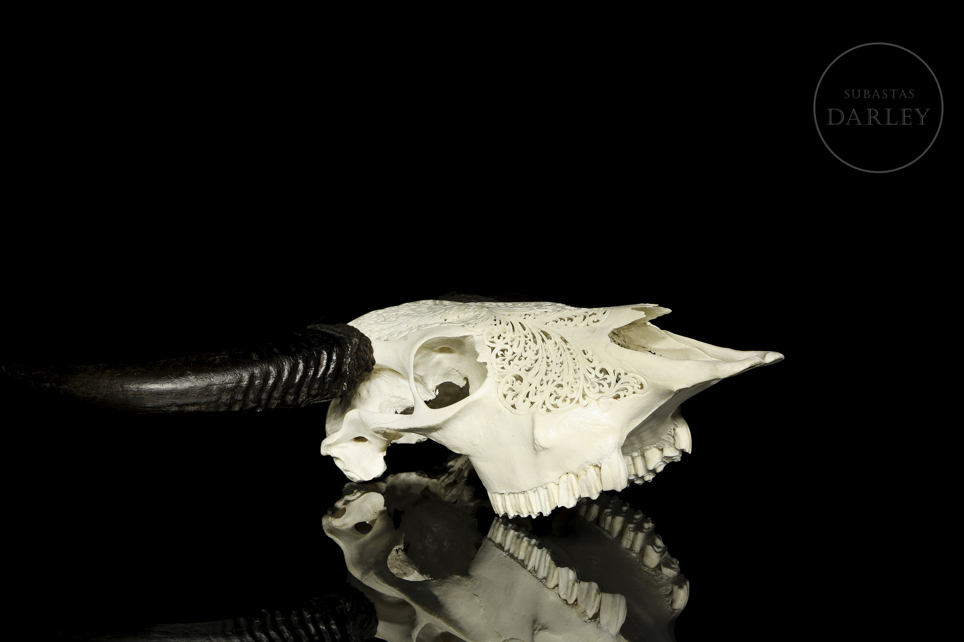 Natural water buffalo skull with original horns, handcrafted using openwork carving with symmetrical plant and floral motifs. This type of decoration, common in Southeast Asia, combines traditional craftsmanship with a contemporary ornamental sensibility.