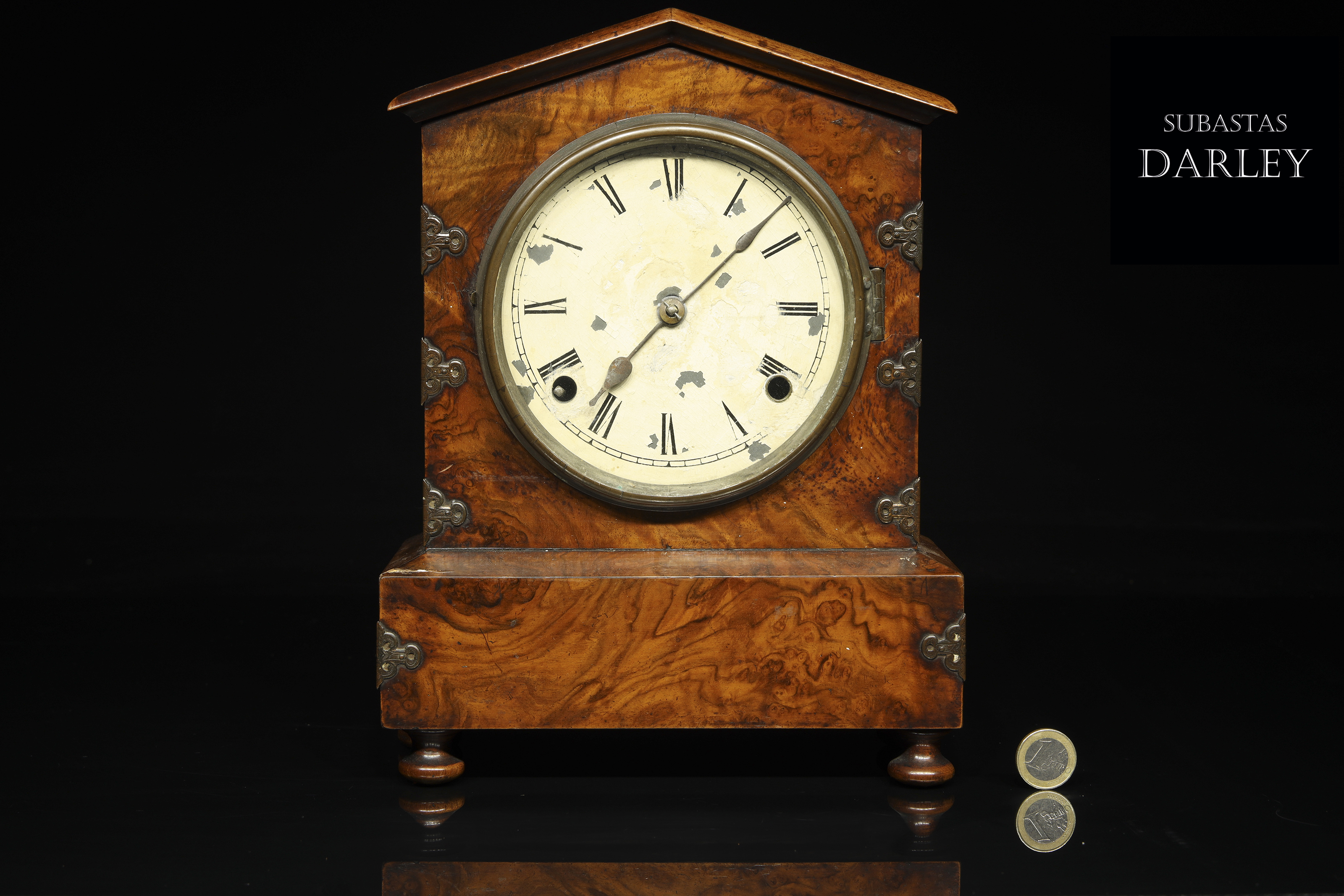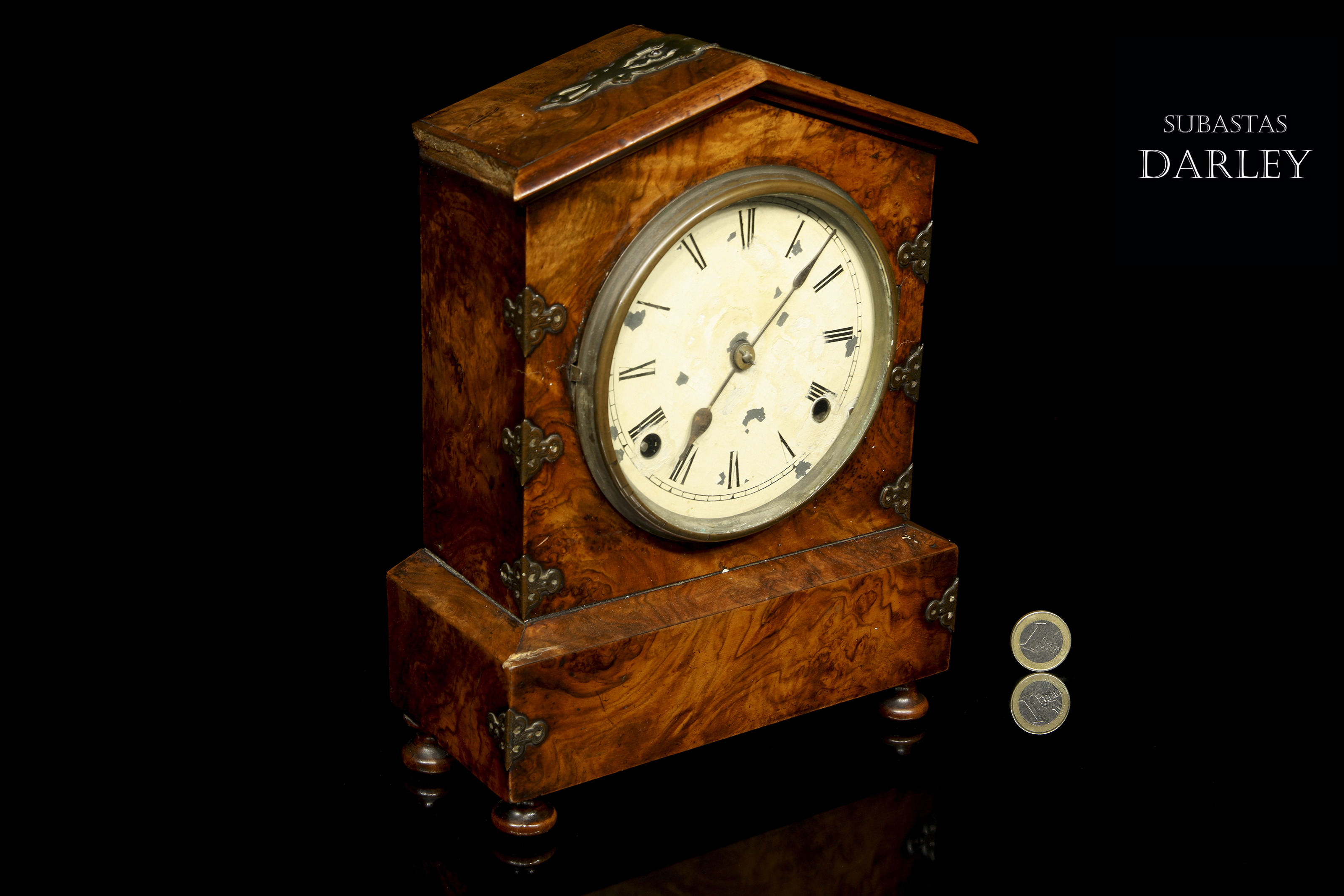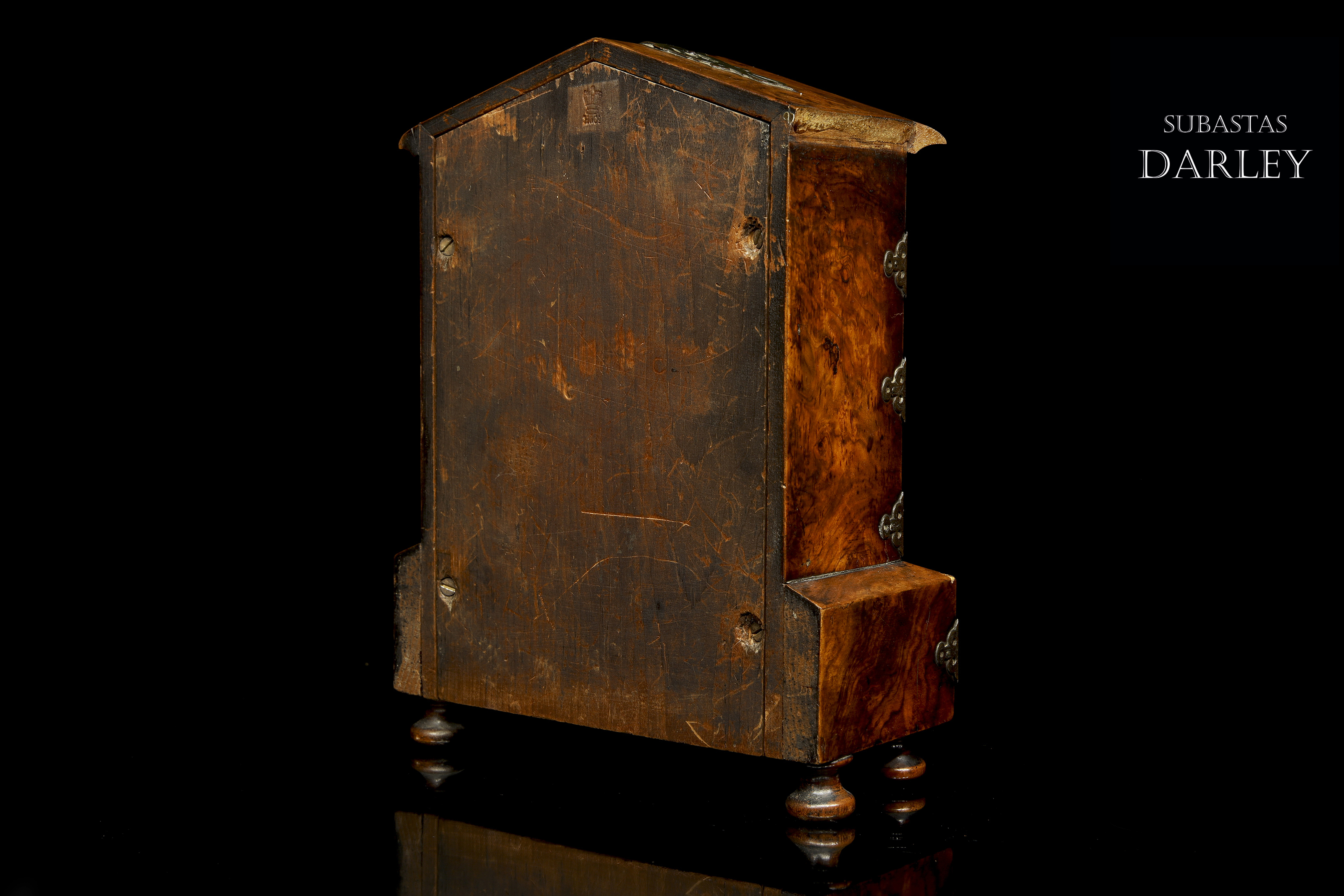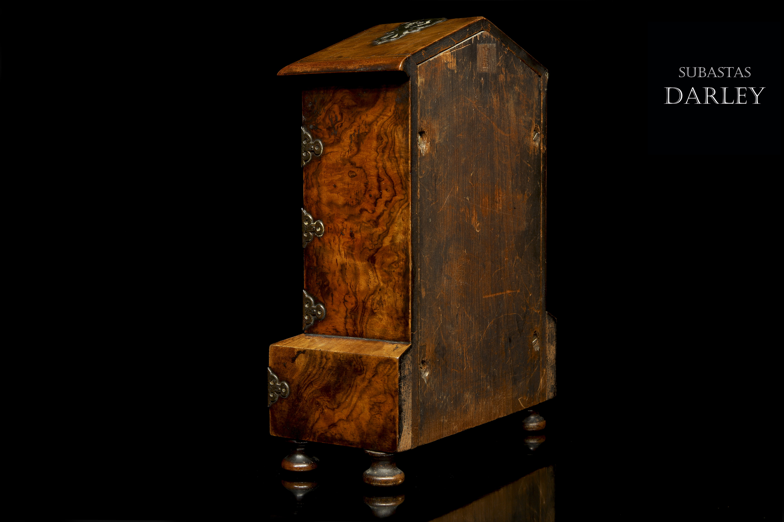 Walnut-veneered wooden box. On the reverse, just at the top, it shows a stamped mark. Shows wear and tear.