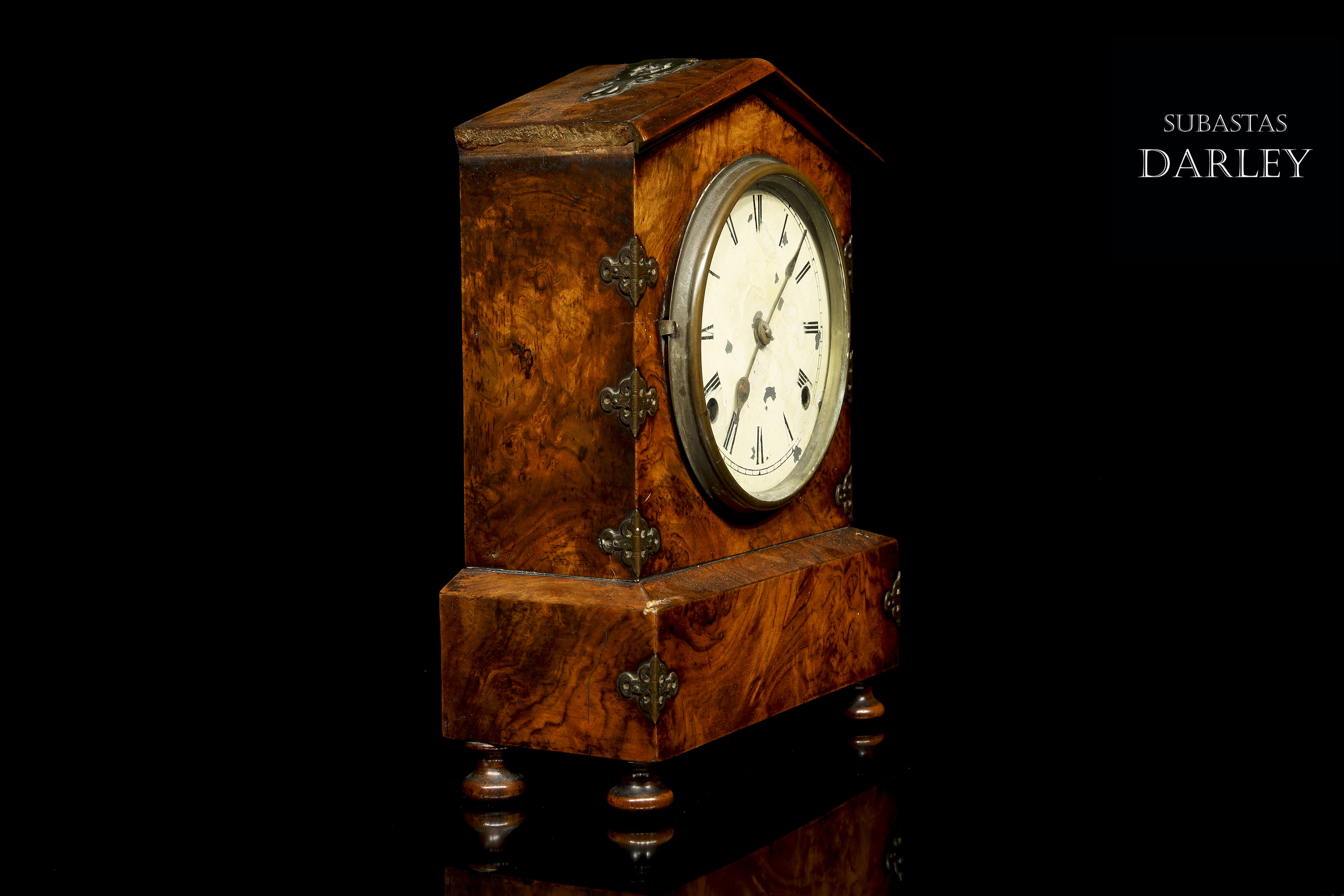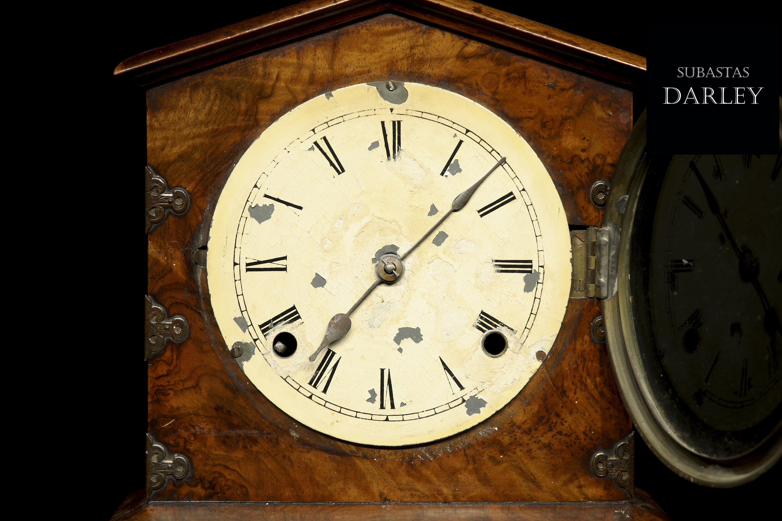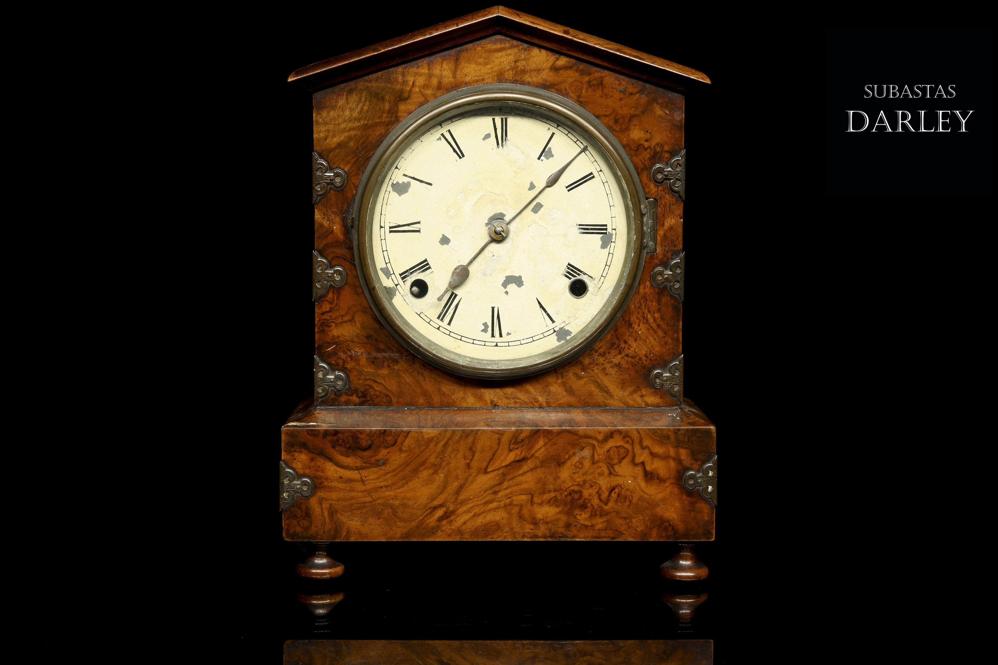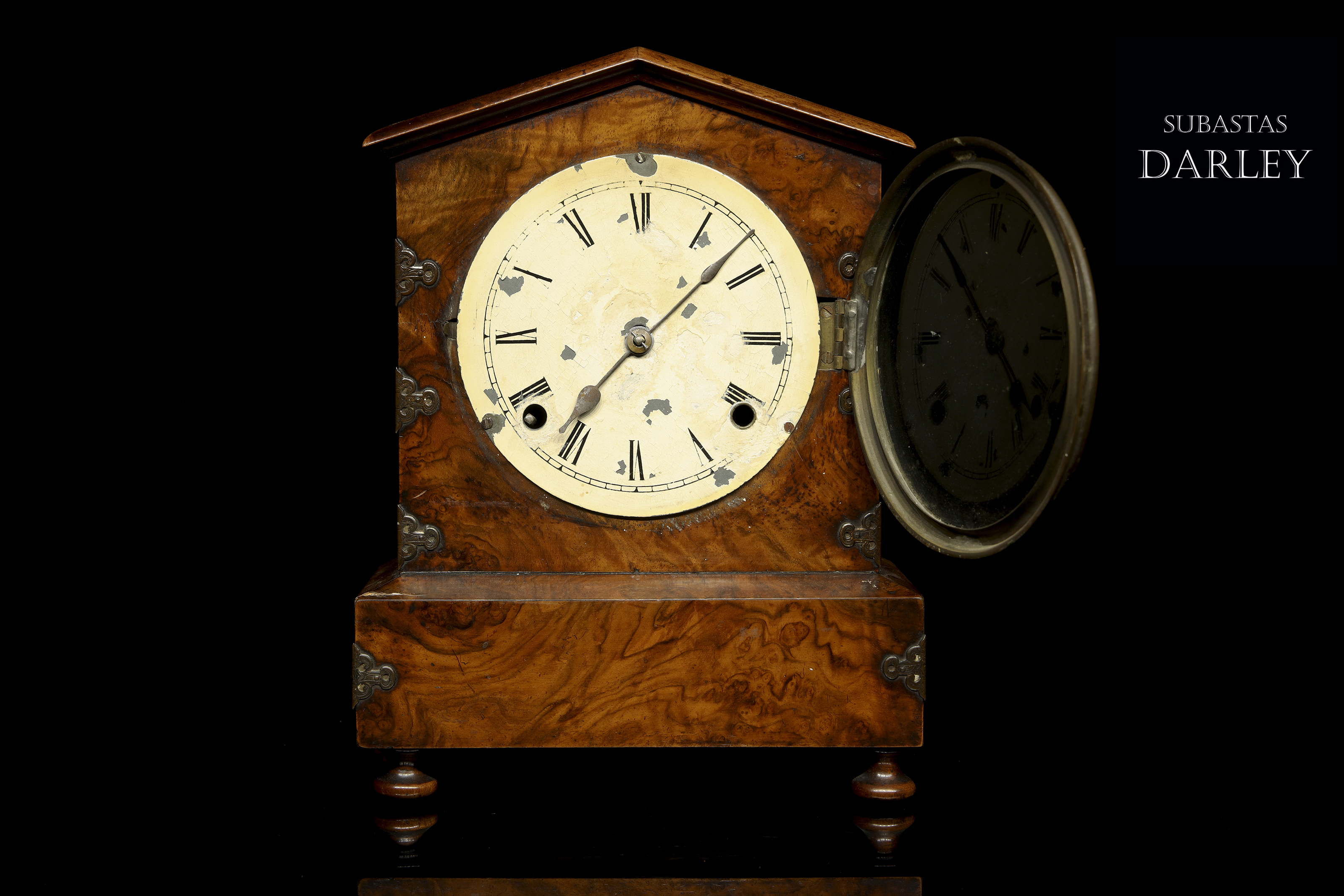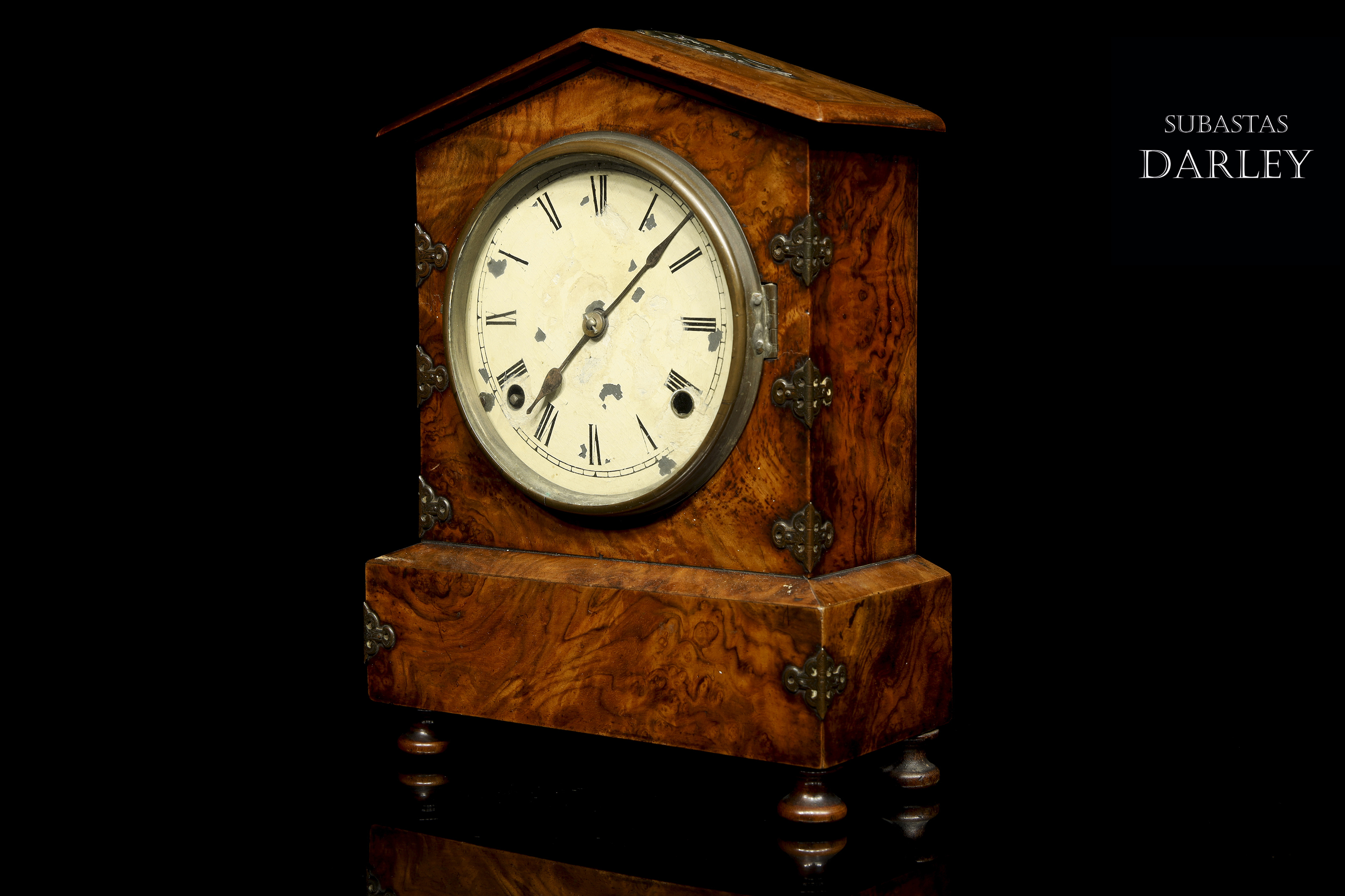 Walnut-veneered wooden box. On the reverse, just at the top, it shows a stamped mark. Shows wear and tear.
