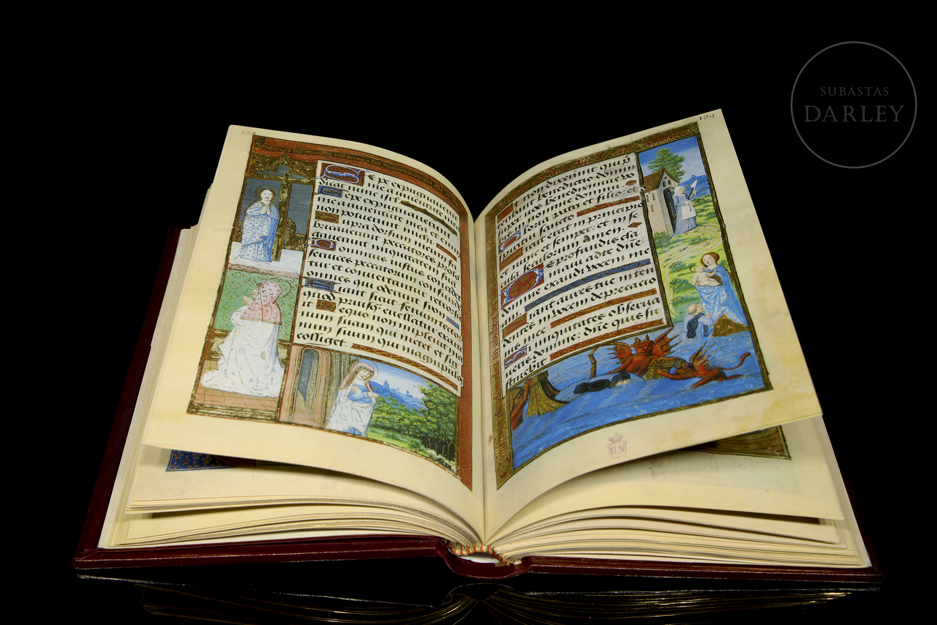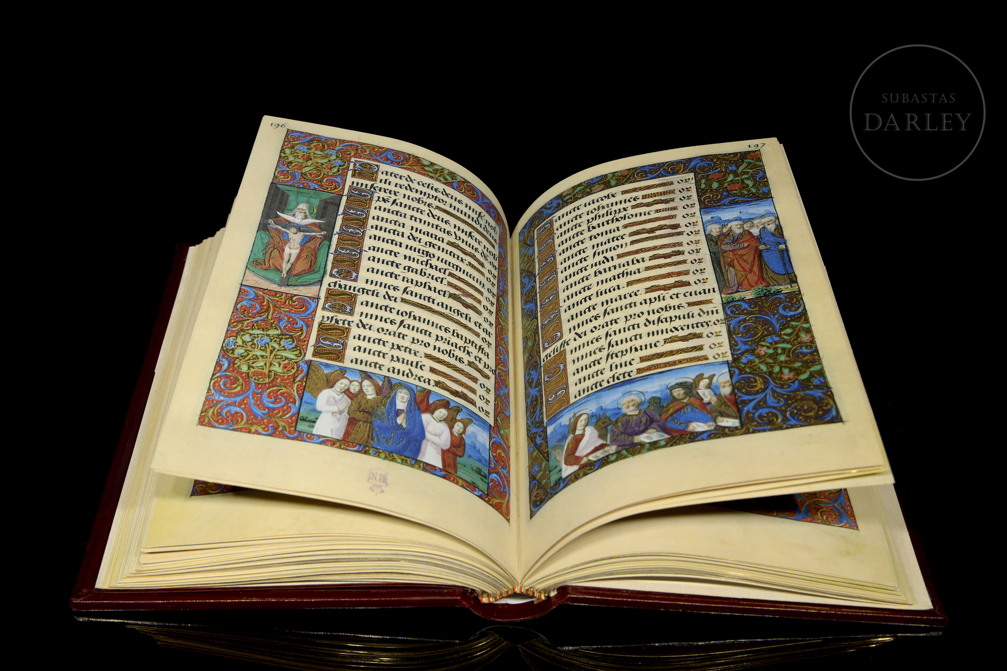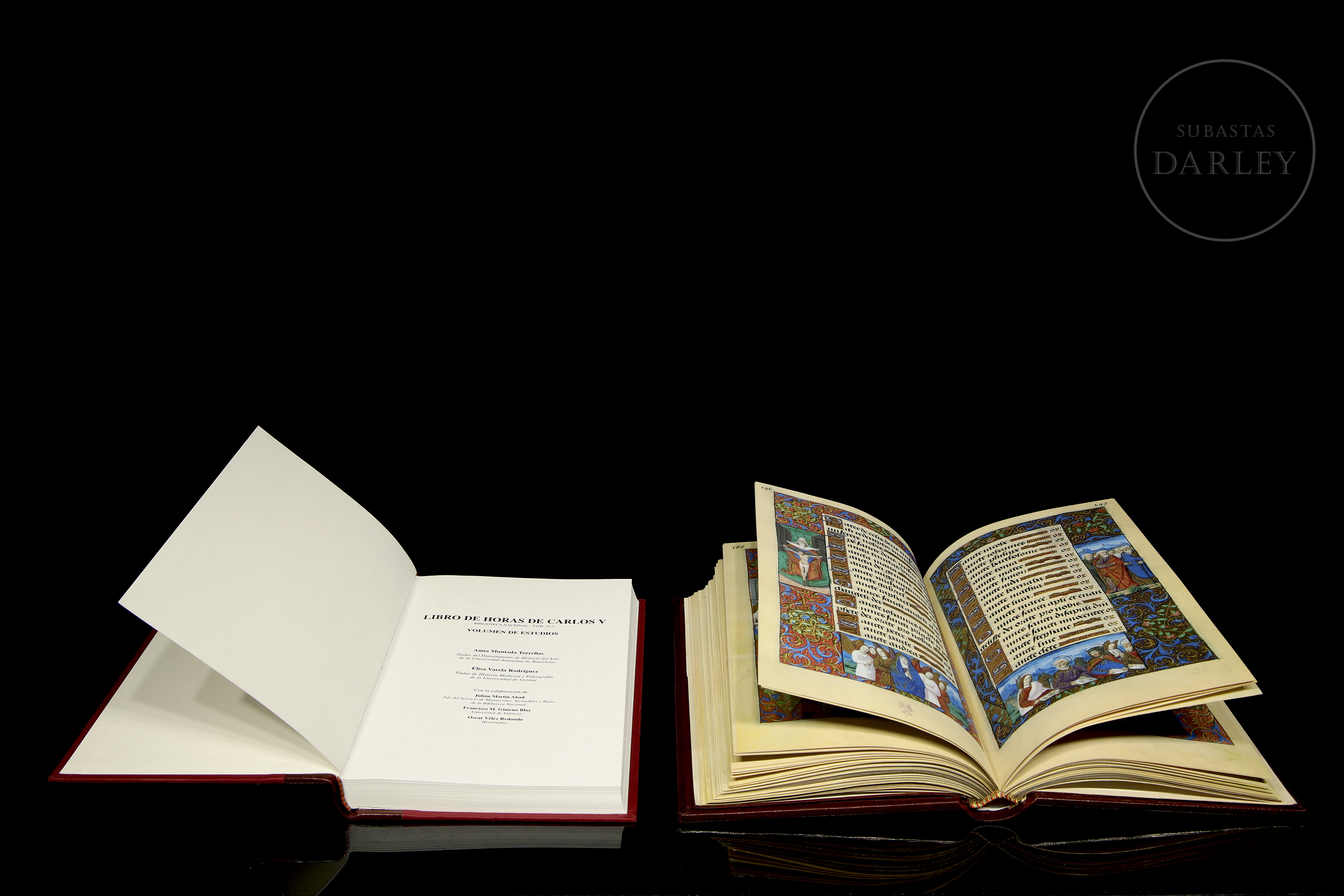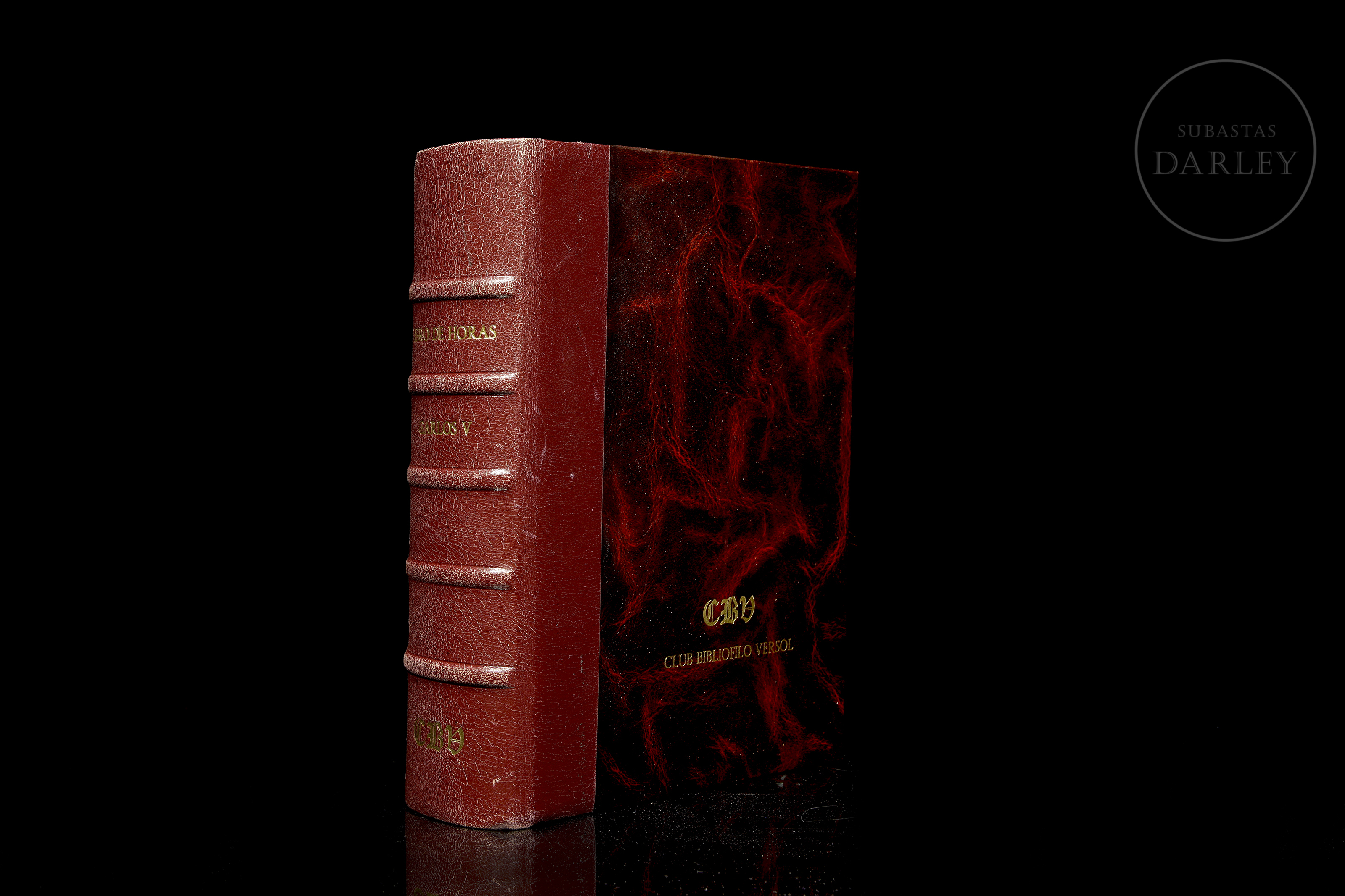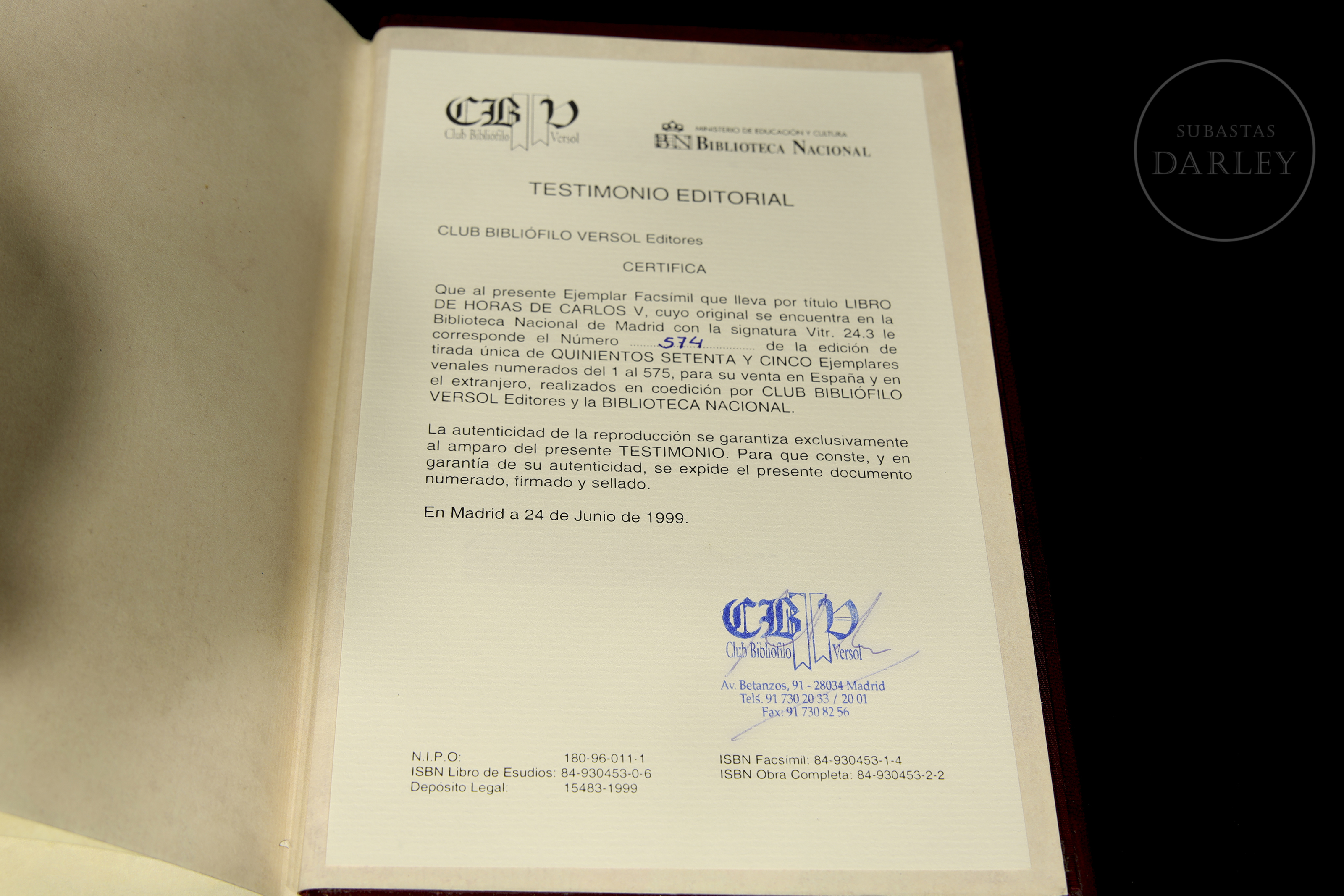 Hours of Charles V. Spanish-language facsimile of the Bibloteca Nacional. Published by Club Biblófilo Versol Editores. Unique edition of 1 to 575 copies, this one is numbered 574. This facsimile reproduces the 1498 manuscript entitled LIBRO DE HORAS DE CARLOS V, the original of which is in the Biblioteca Nacional de Madrid with the call number Vitr. 2