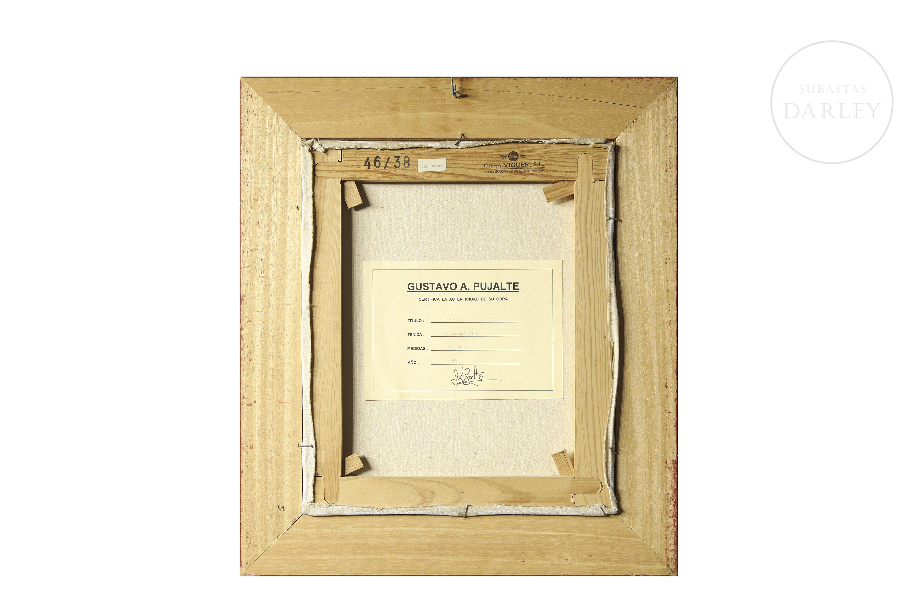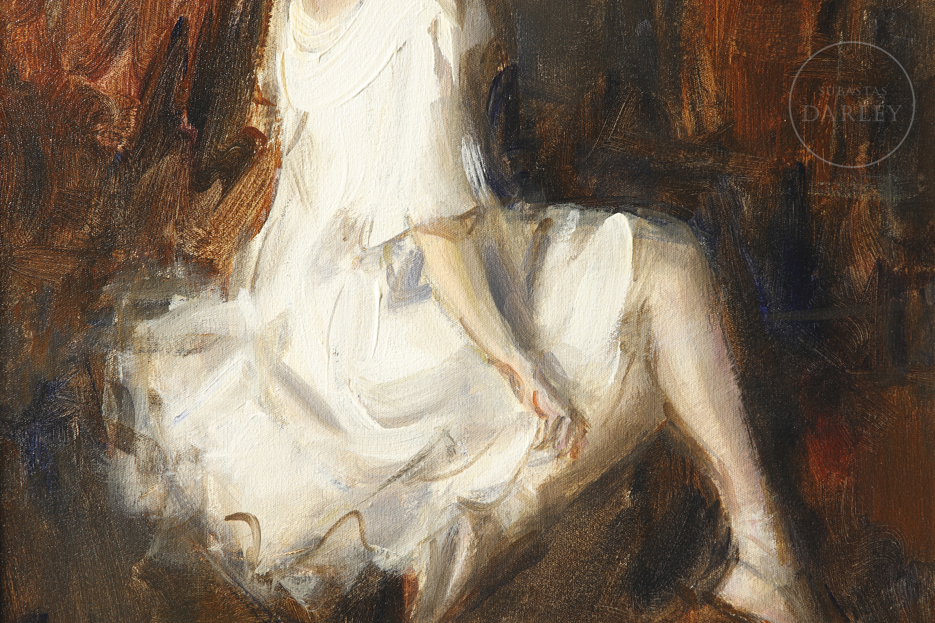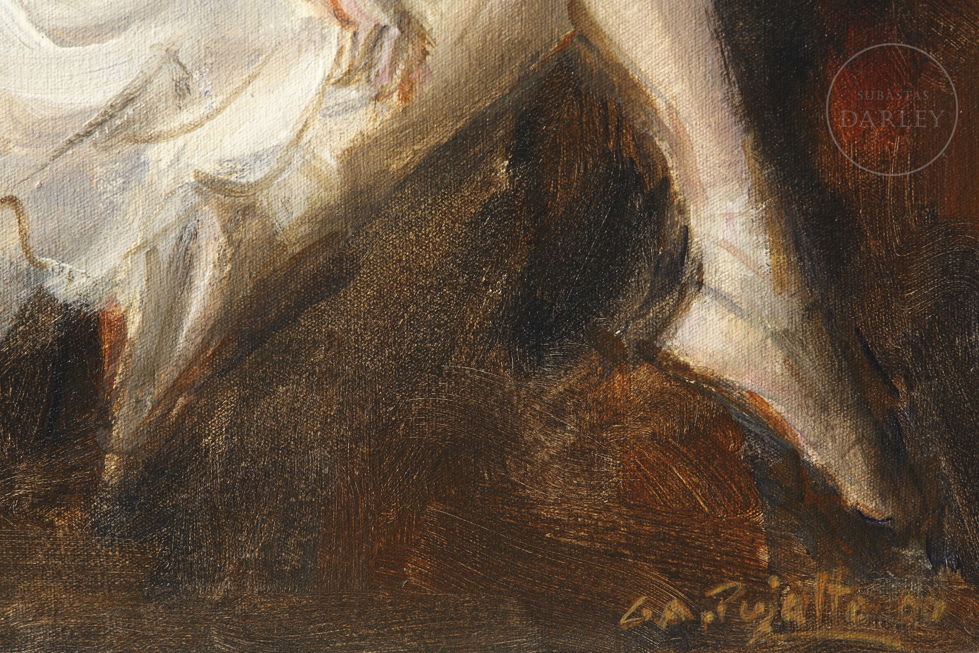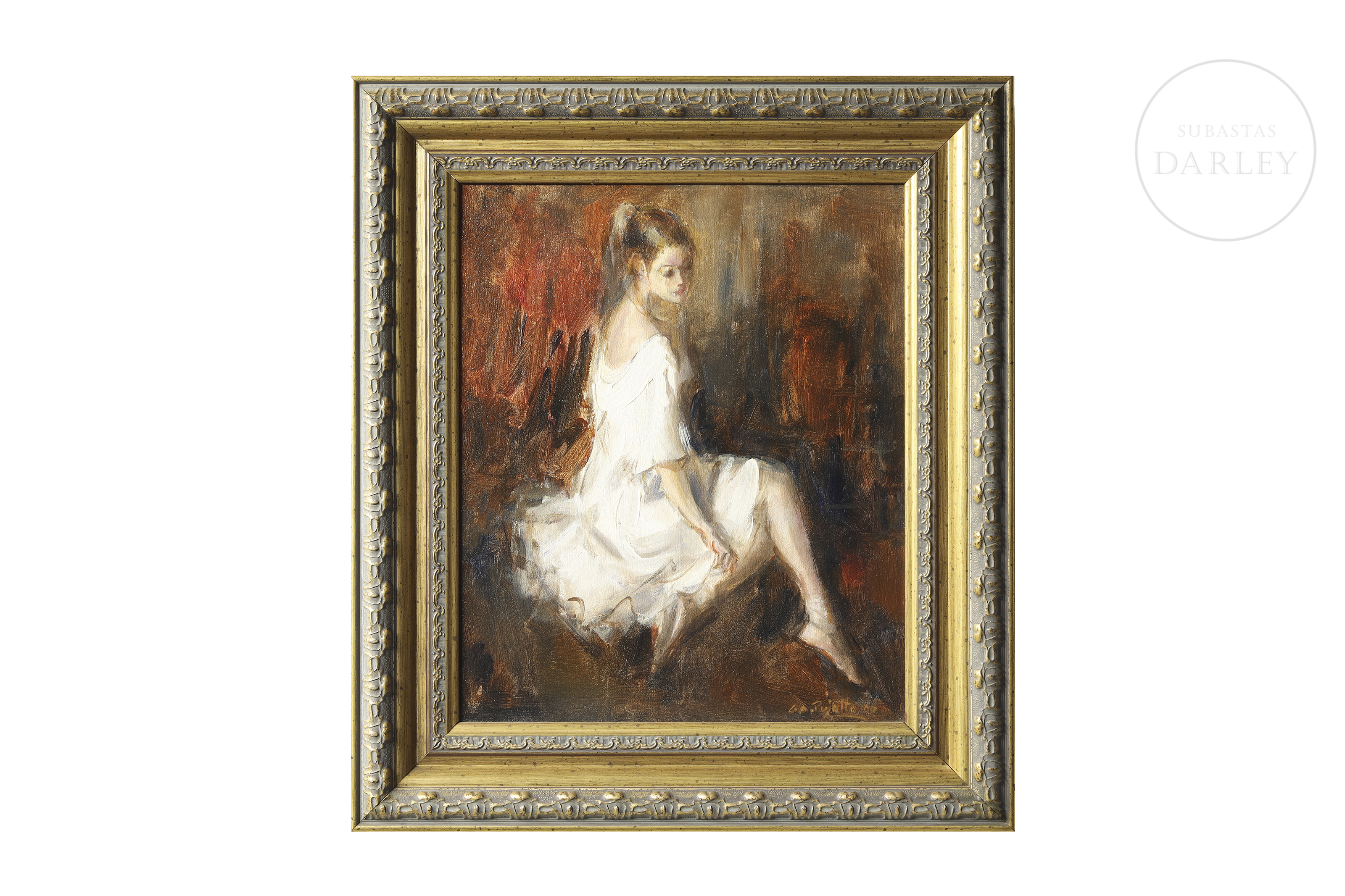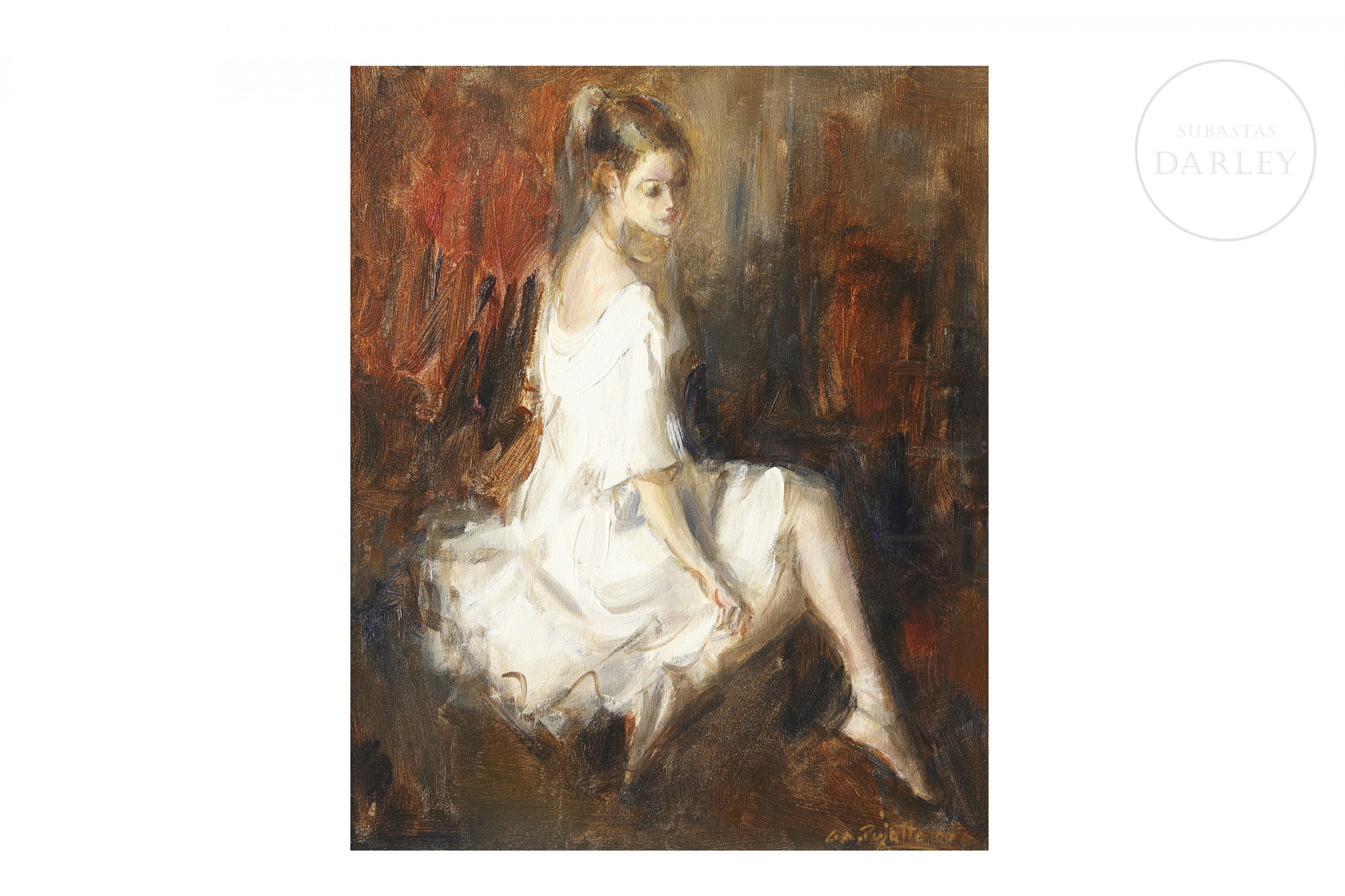 Oil on canvas. Portrait of a young dancer seated in a relaxed pose. Signed and dated “G.A. Pujalte 00” in the lower right corner. With certificate from the artist on the reverse.