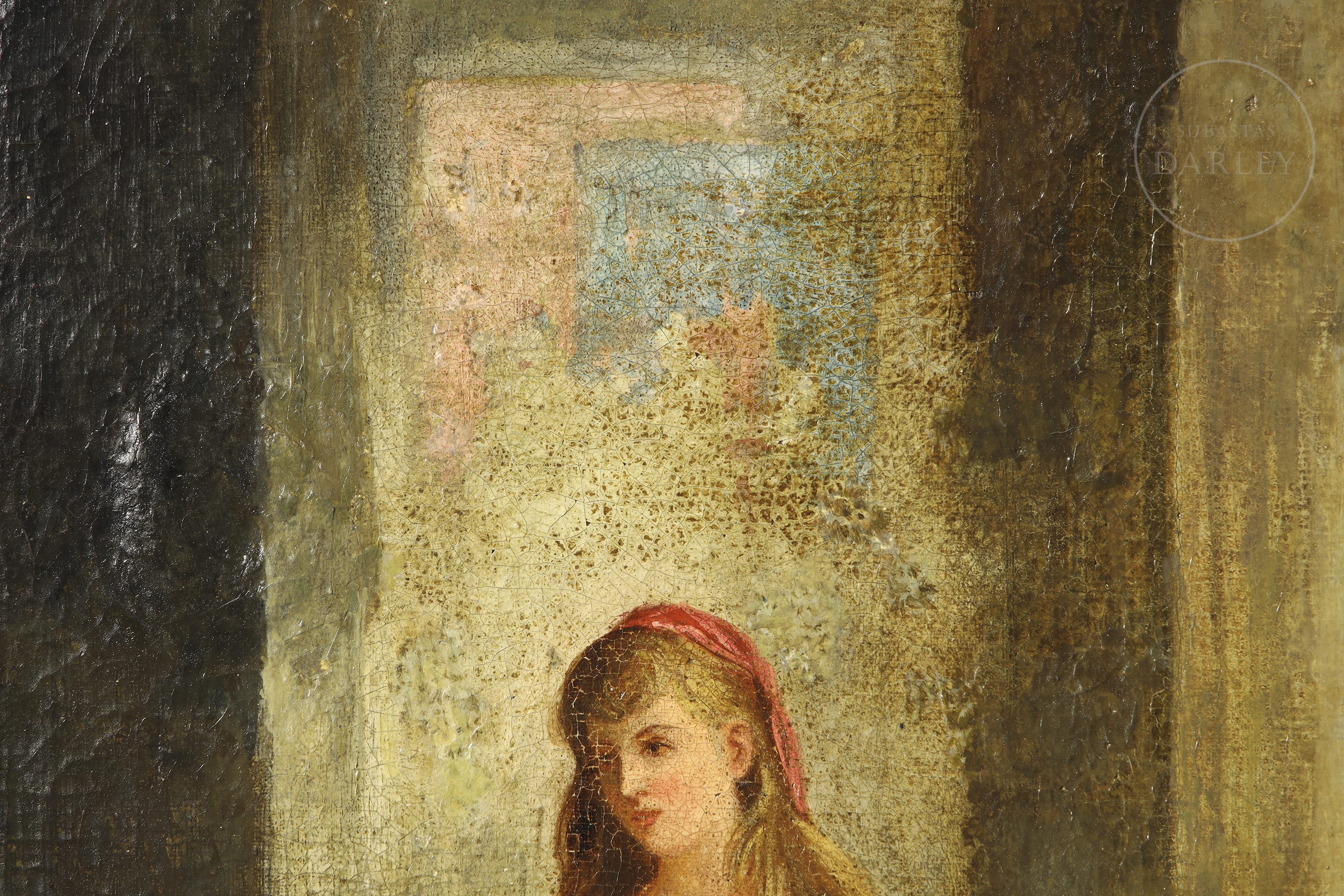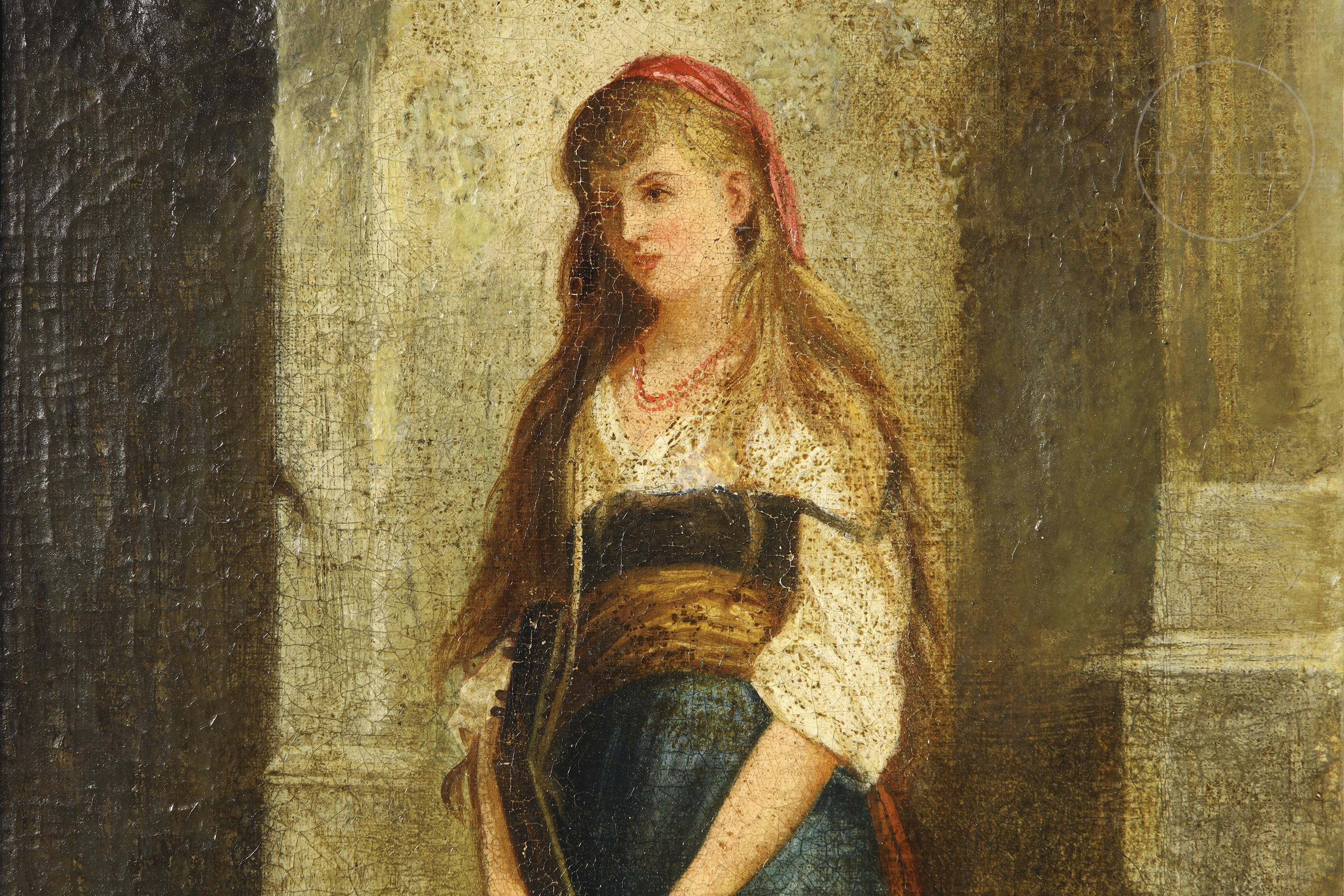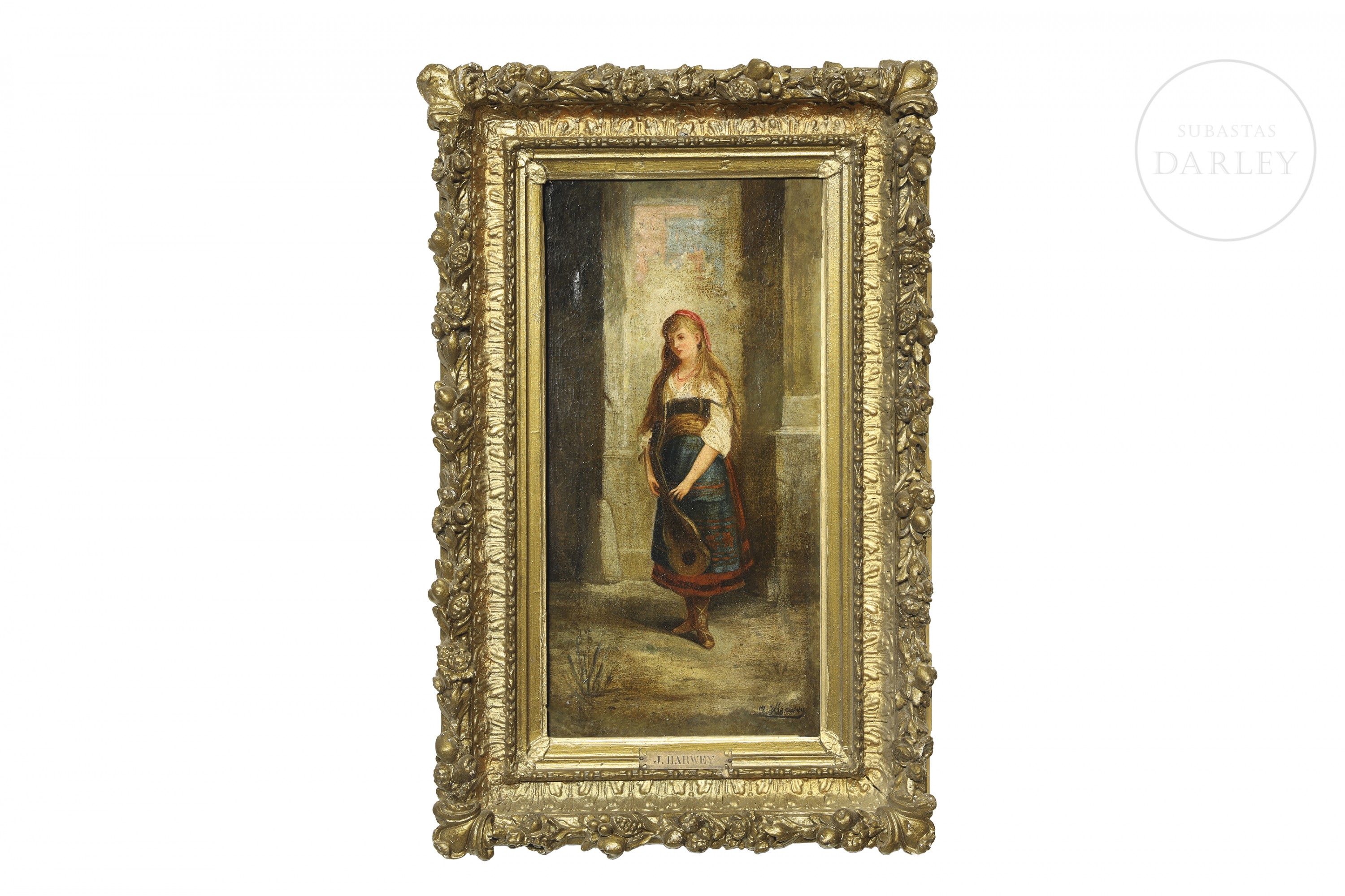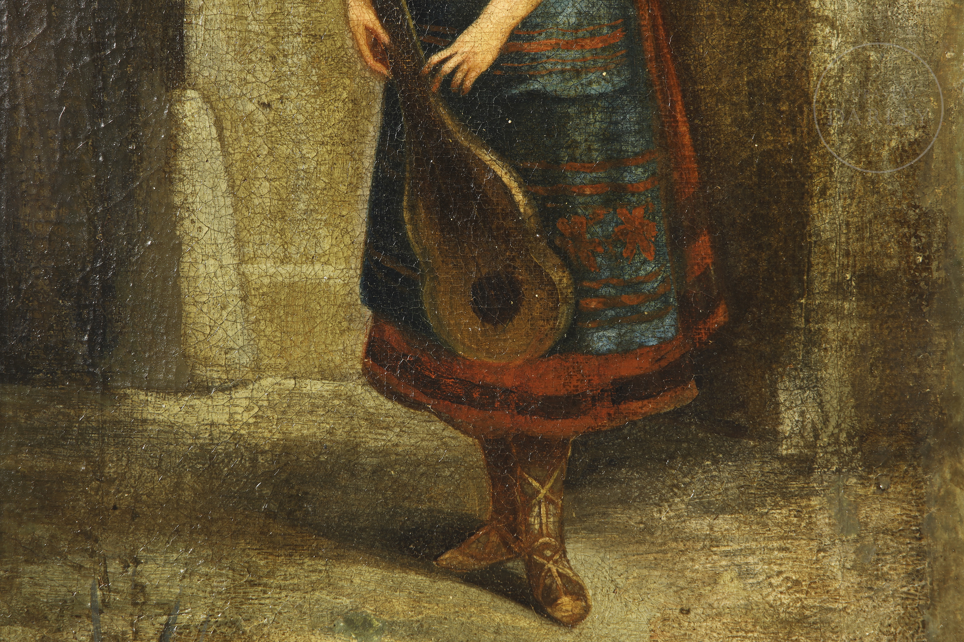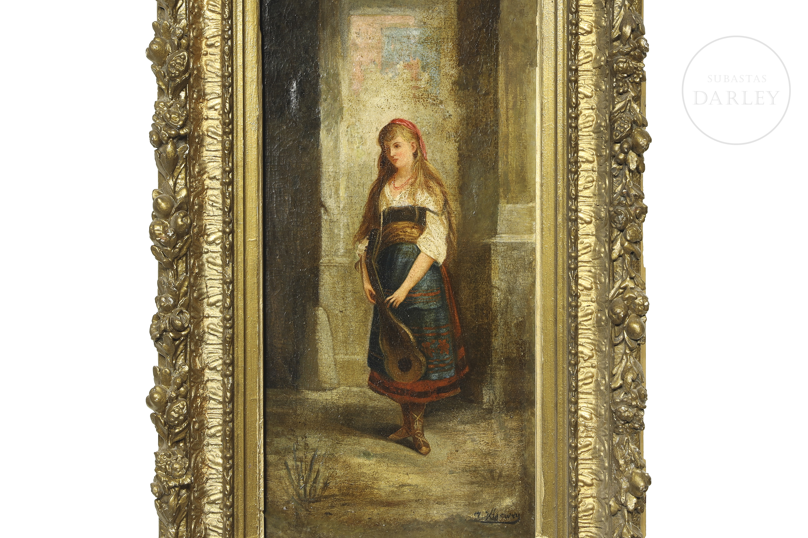 Portrait of a young woman standing holding a mandolin, set in an architectural interior with a dimly lit background. The figure, delicately rendered in warm colours, reflects the English Romantic taste for the representation of genre scenes. Signed “J. Harwey” in the lower right corner.