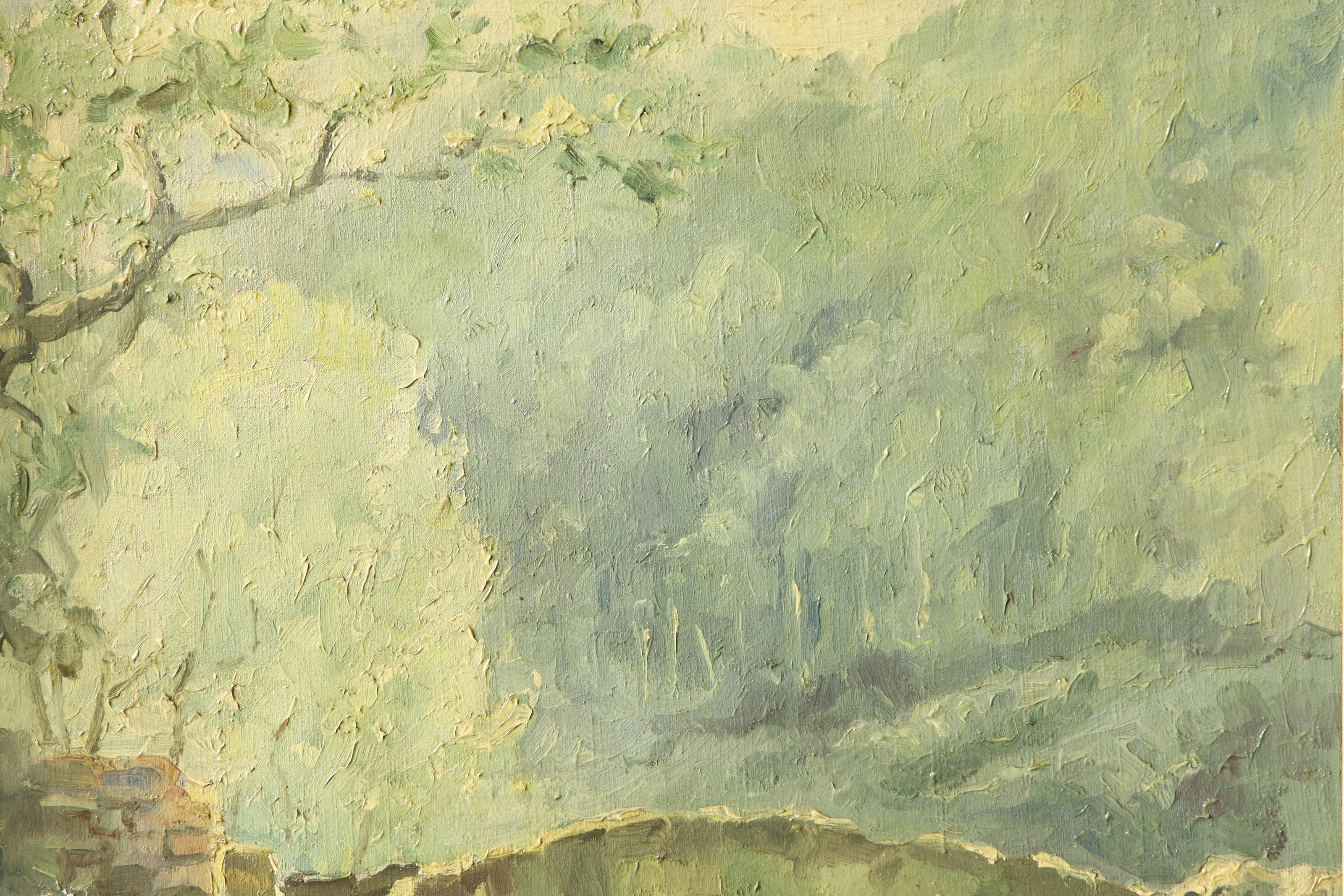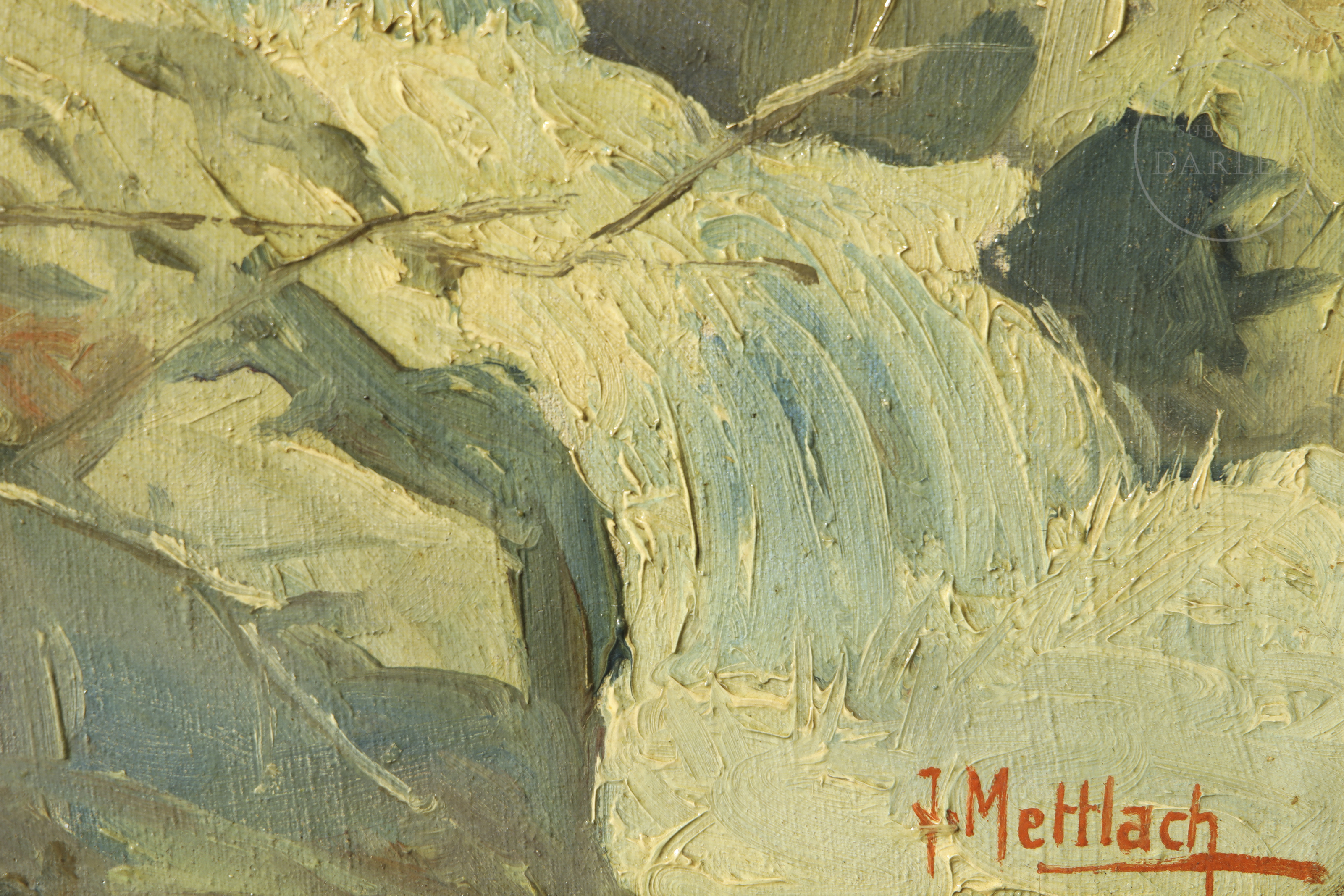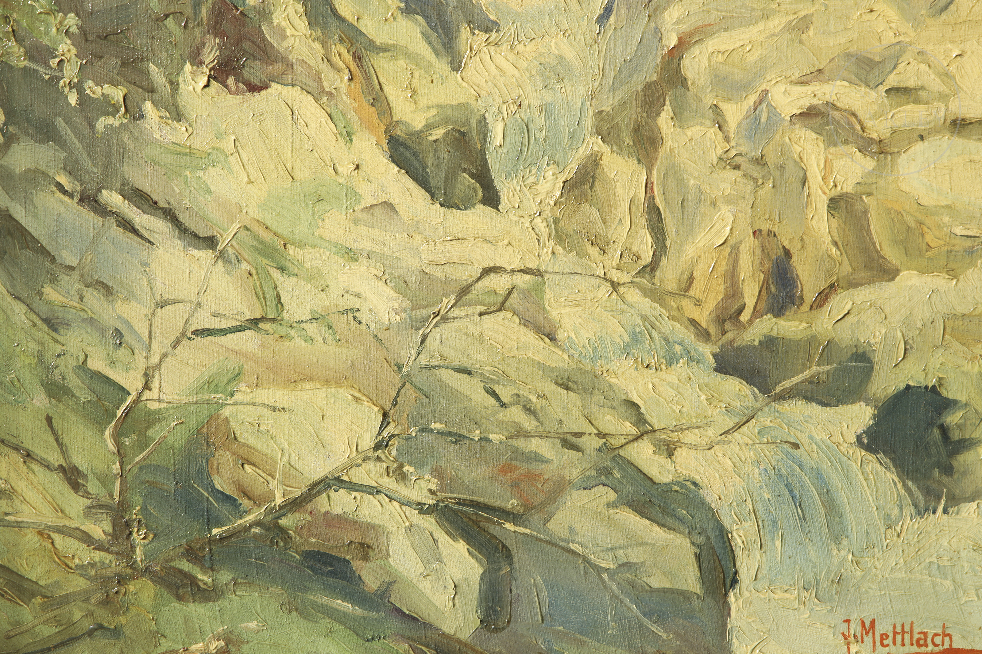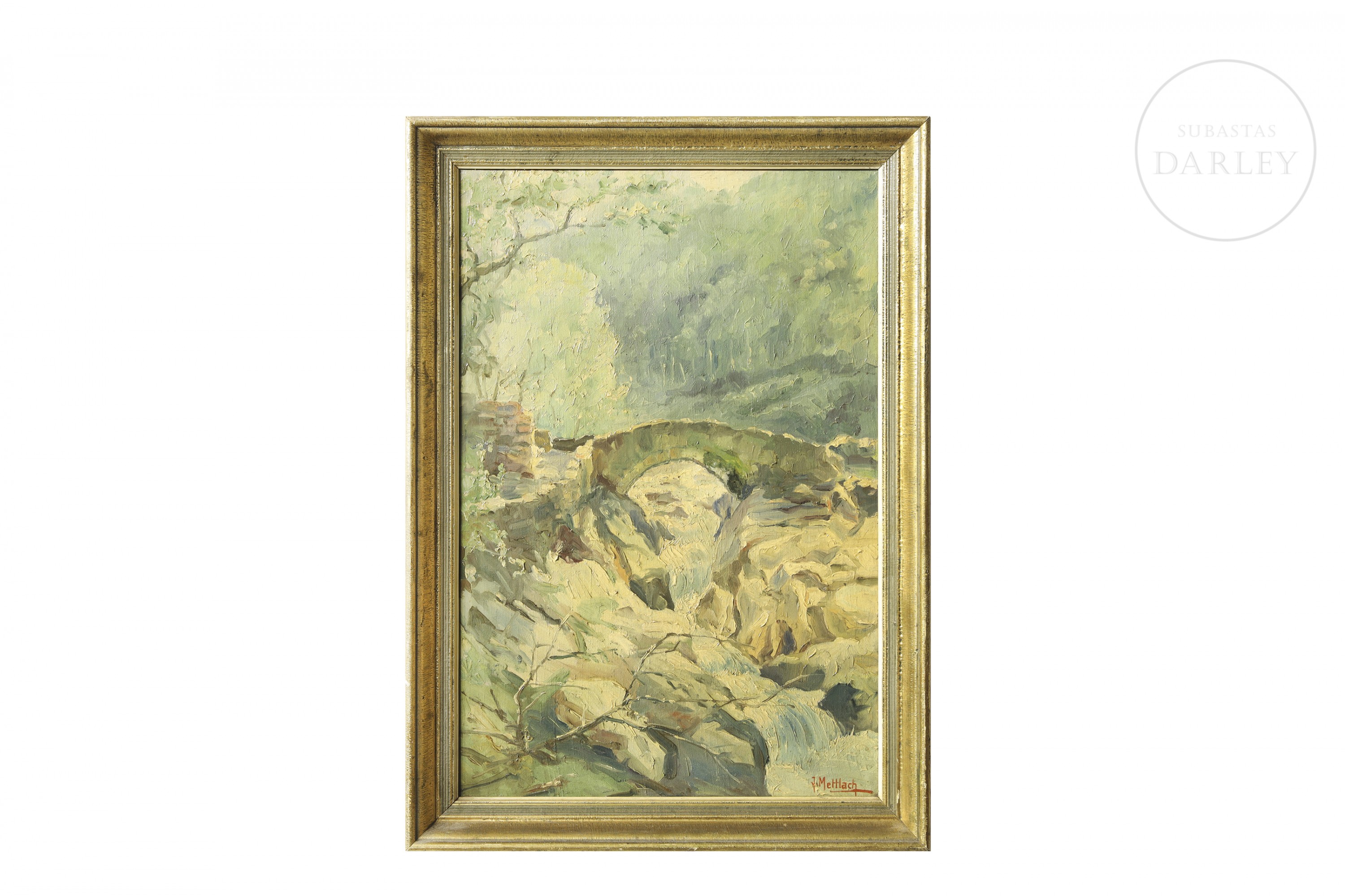Oil on canvas. Natural landscape depicting a fast-flowing river covered with large rocks and crossed by a sturdy semicircular bridge. Signed ‘J. Mettlach’ in the lower right corner.