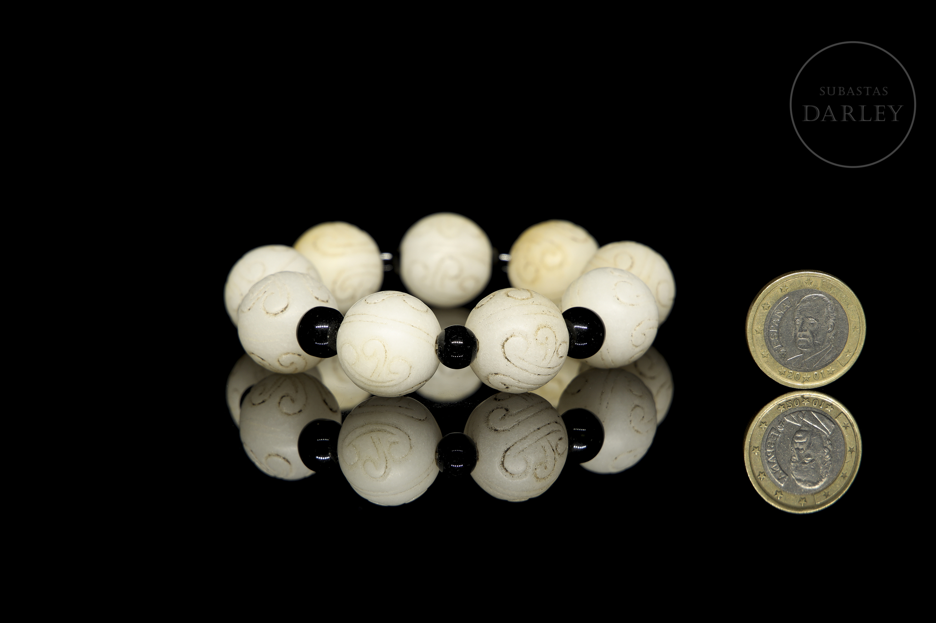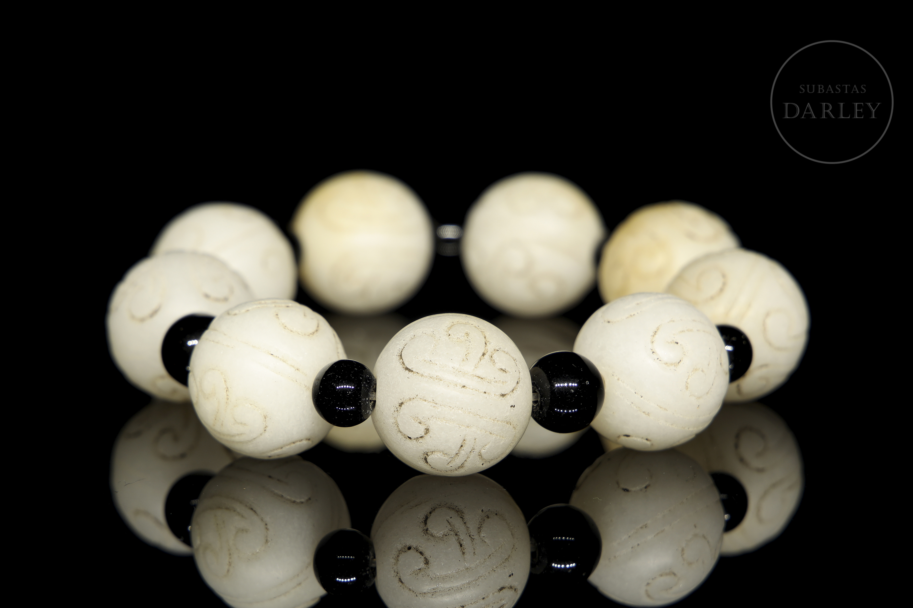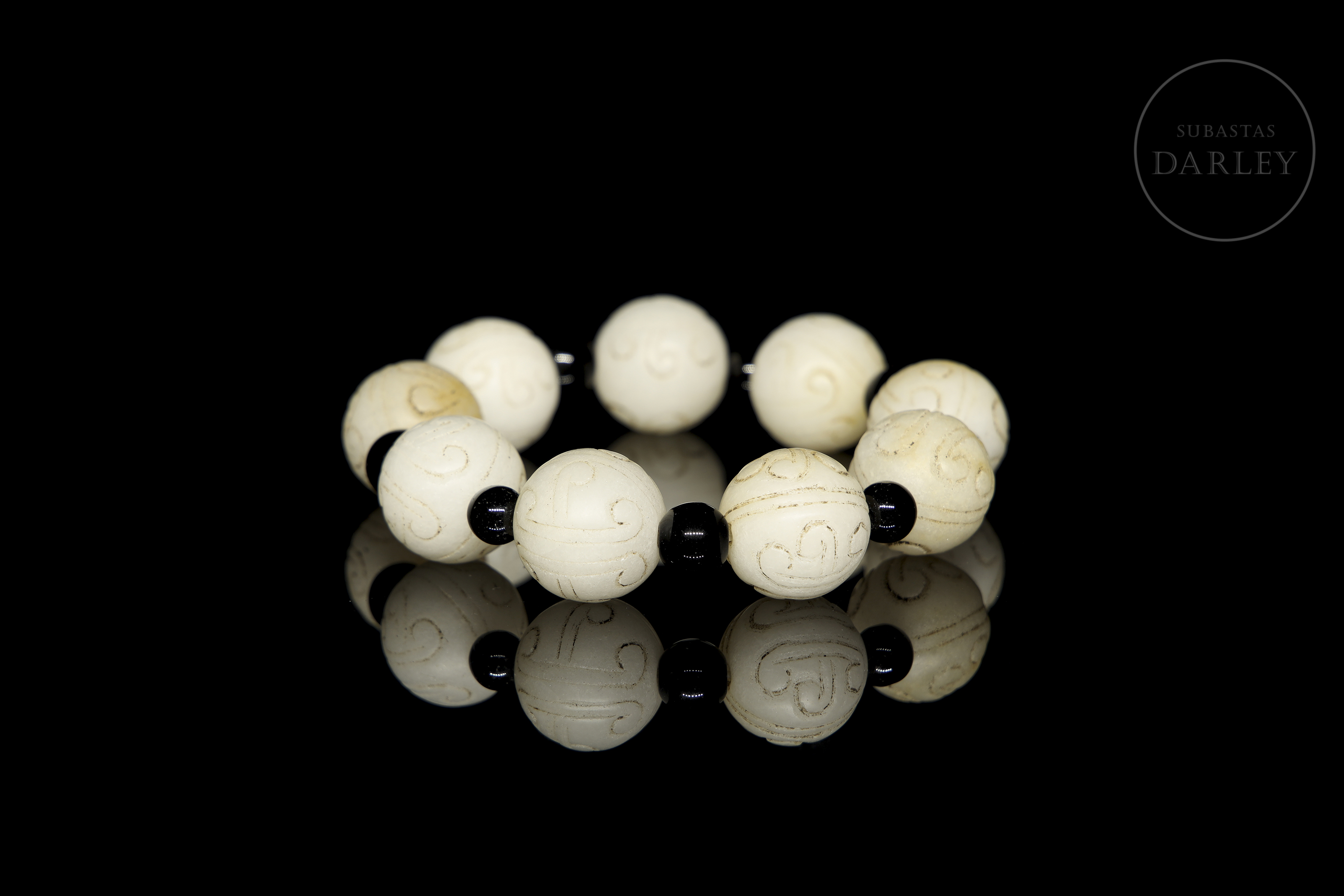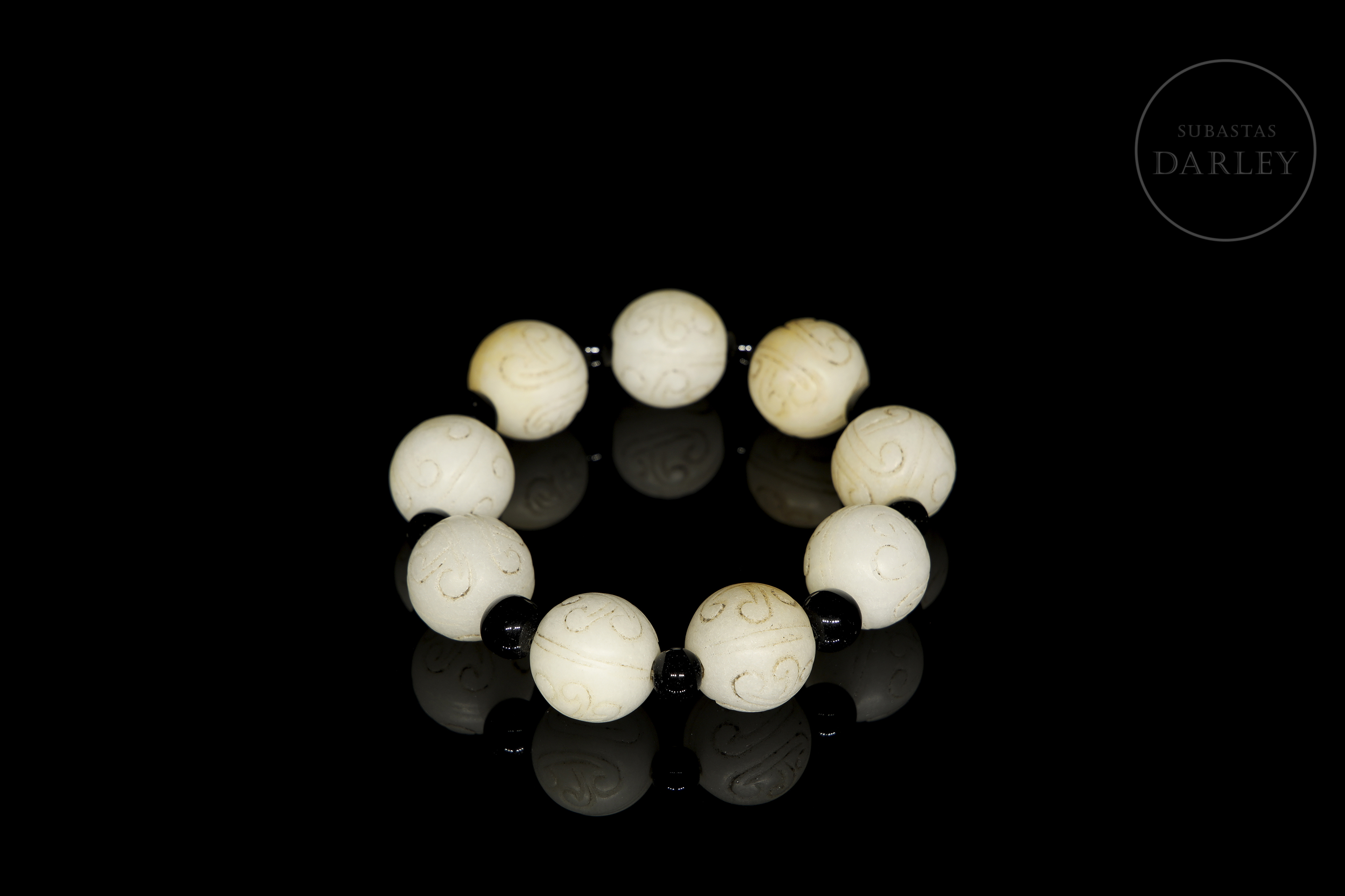 Bracelet composed of nine spherical white jade beads, each engraved with stylised spiral motifs. Small smooth dark-coloured beads are interspersed between the main beads, strung on modern elastic thread.