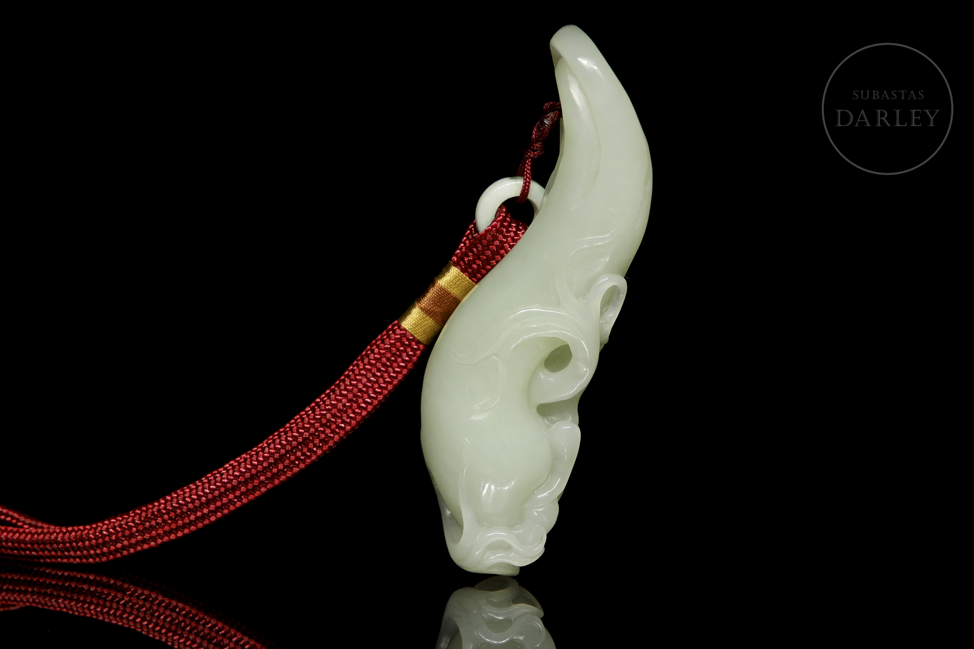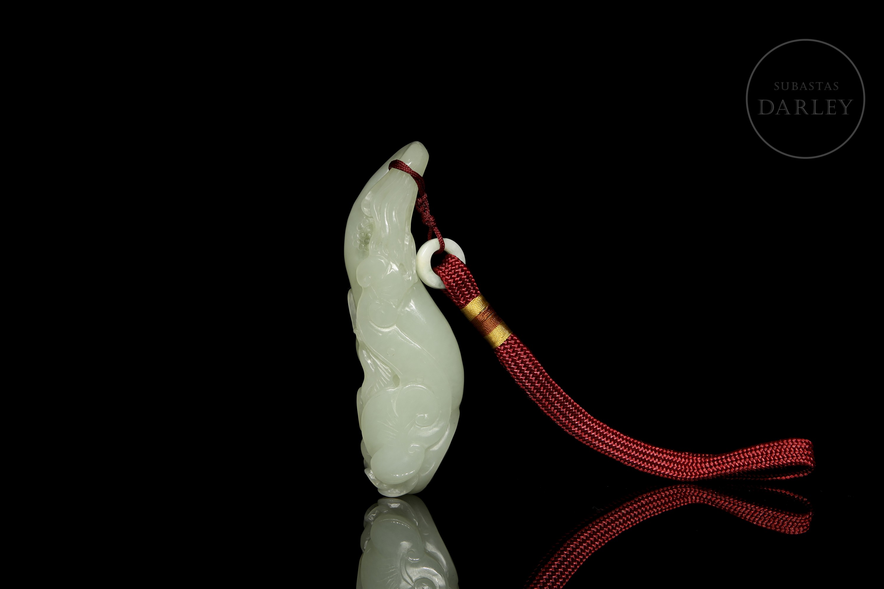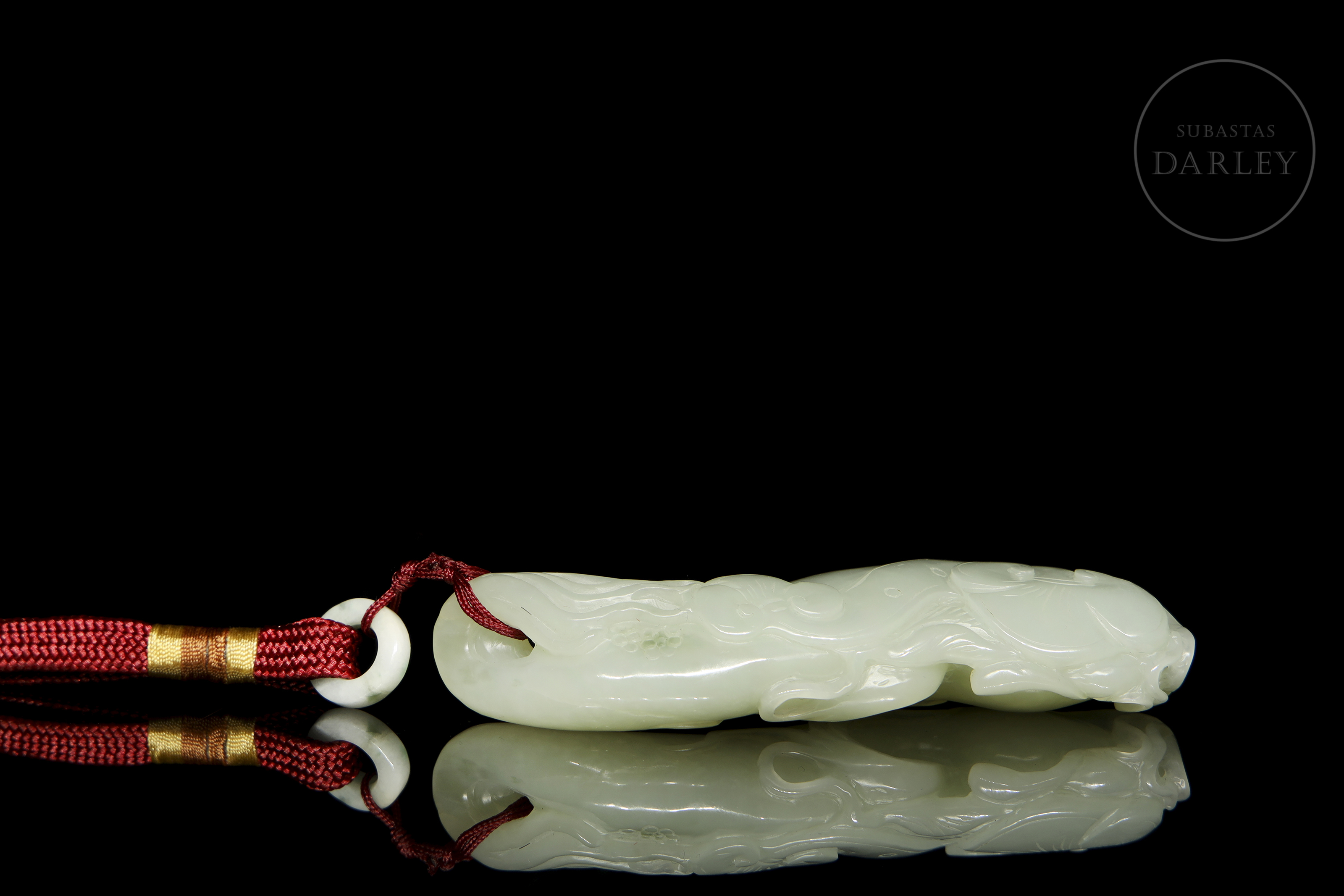 White jade carving with slight greenish hues, depicting an elongated fruit accompanied by branches and lingzhi mushrooms, symbols of longevity and prosperity. Includes red silk hanging cord with jadeite ring. Qing Dynasty (1644–1912).