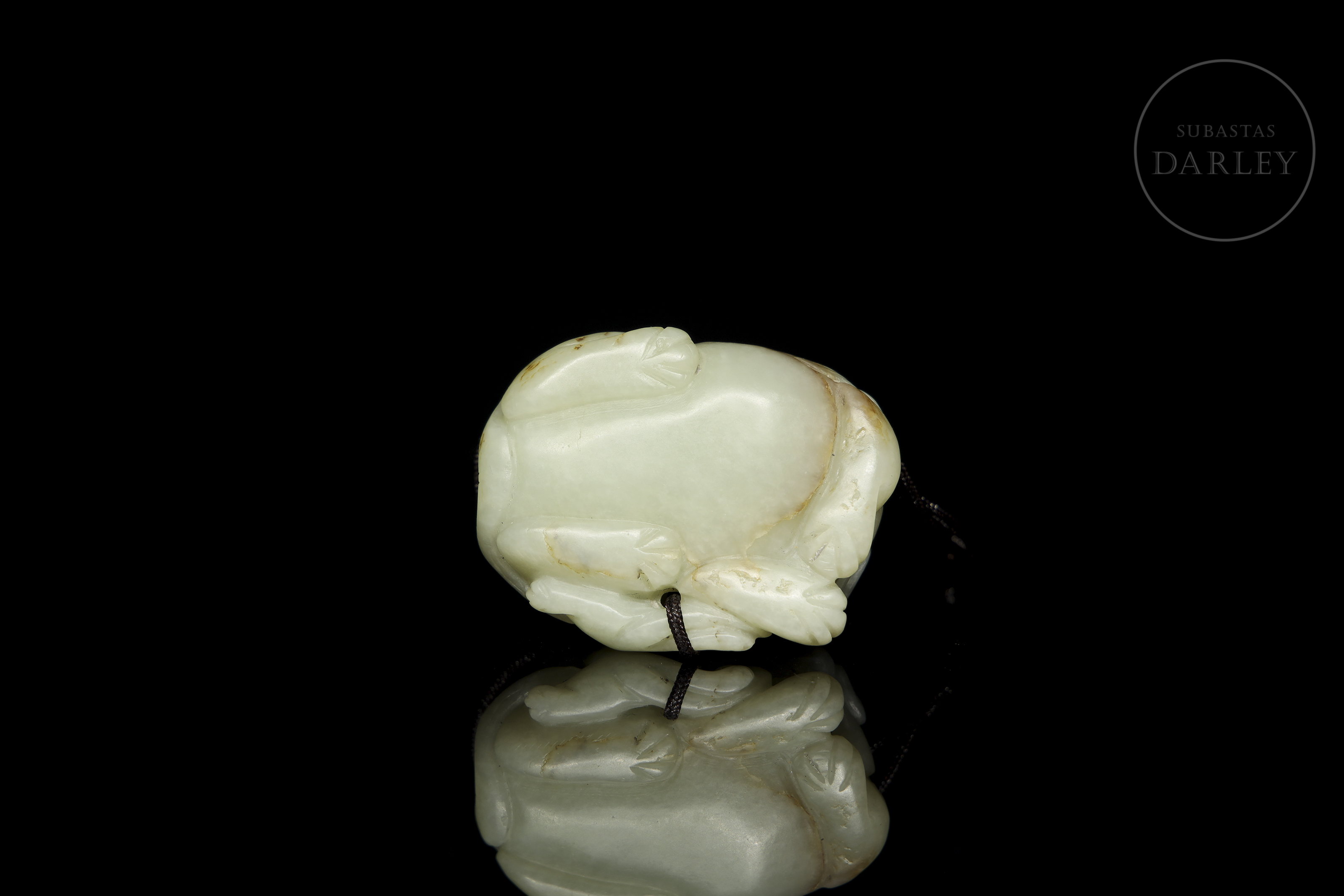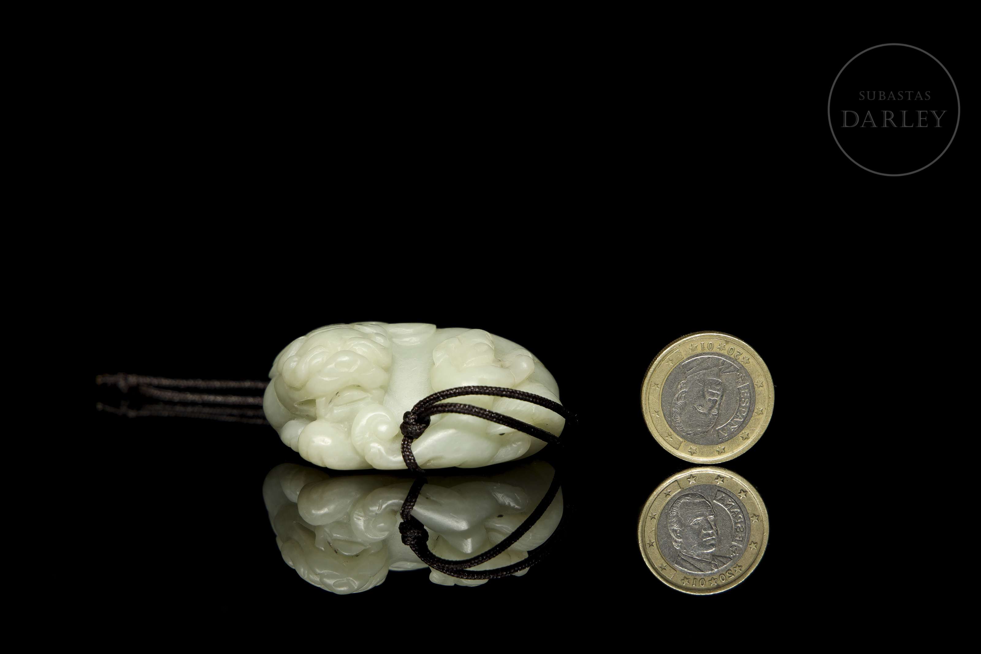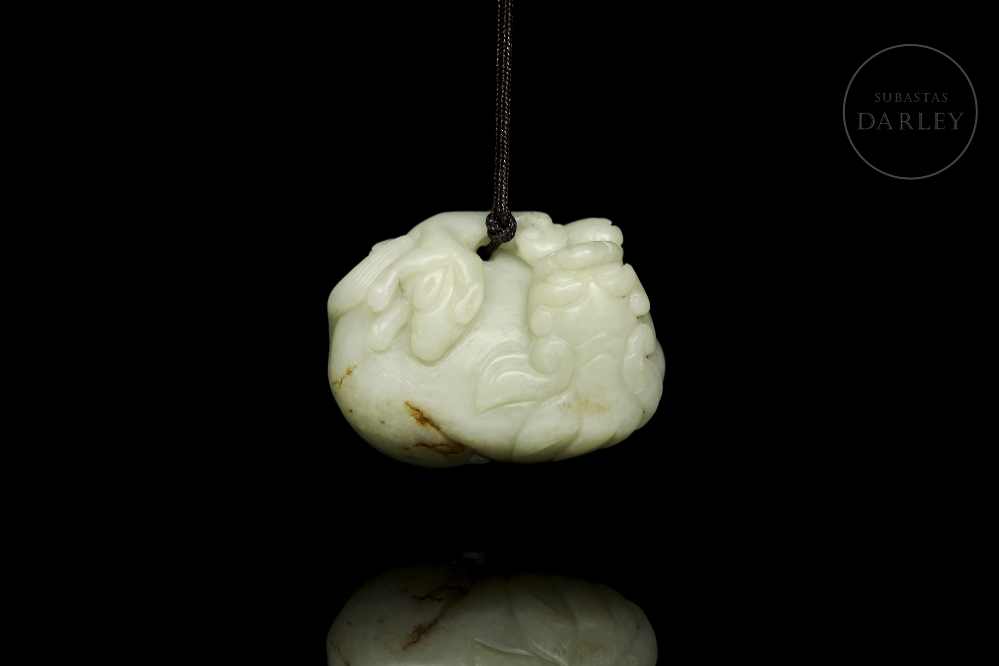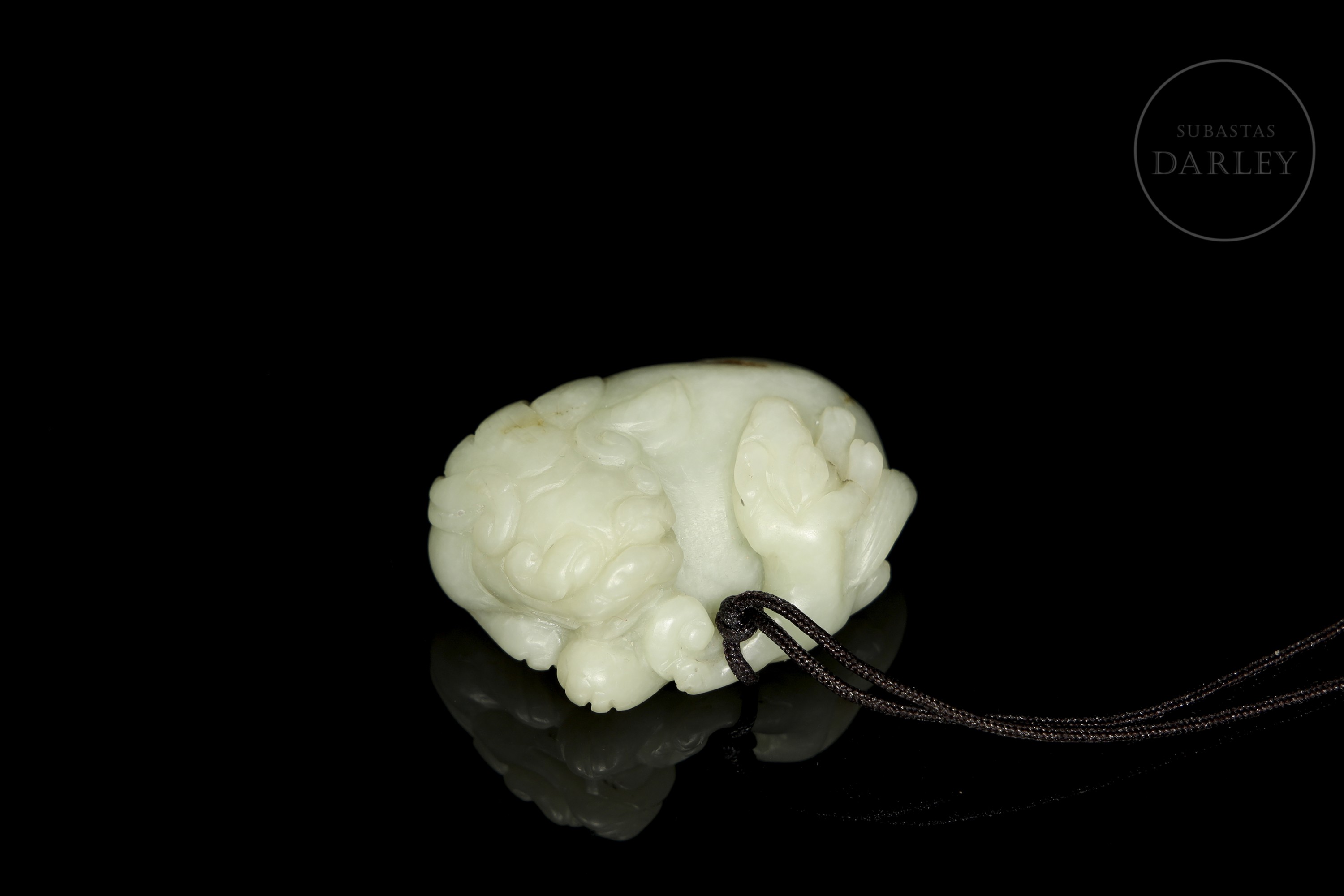 Pendant carved from white jade with a satin finish, depicting a reclining mythical creature with a compact body and wavy mane, holding its young between its front legs. The carving features incised details on the face and limbs, with a side perforation for suspension.