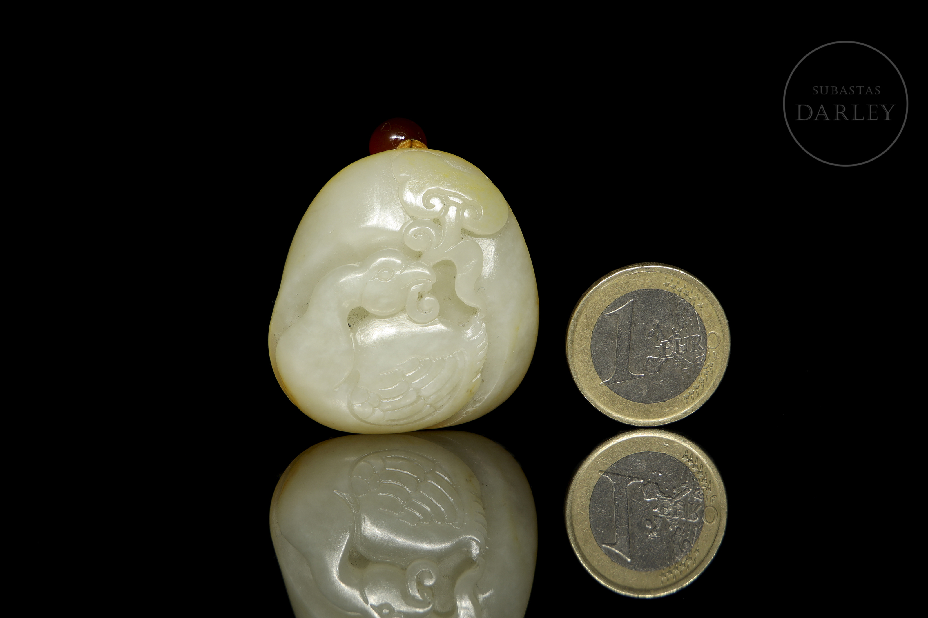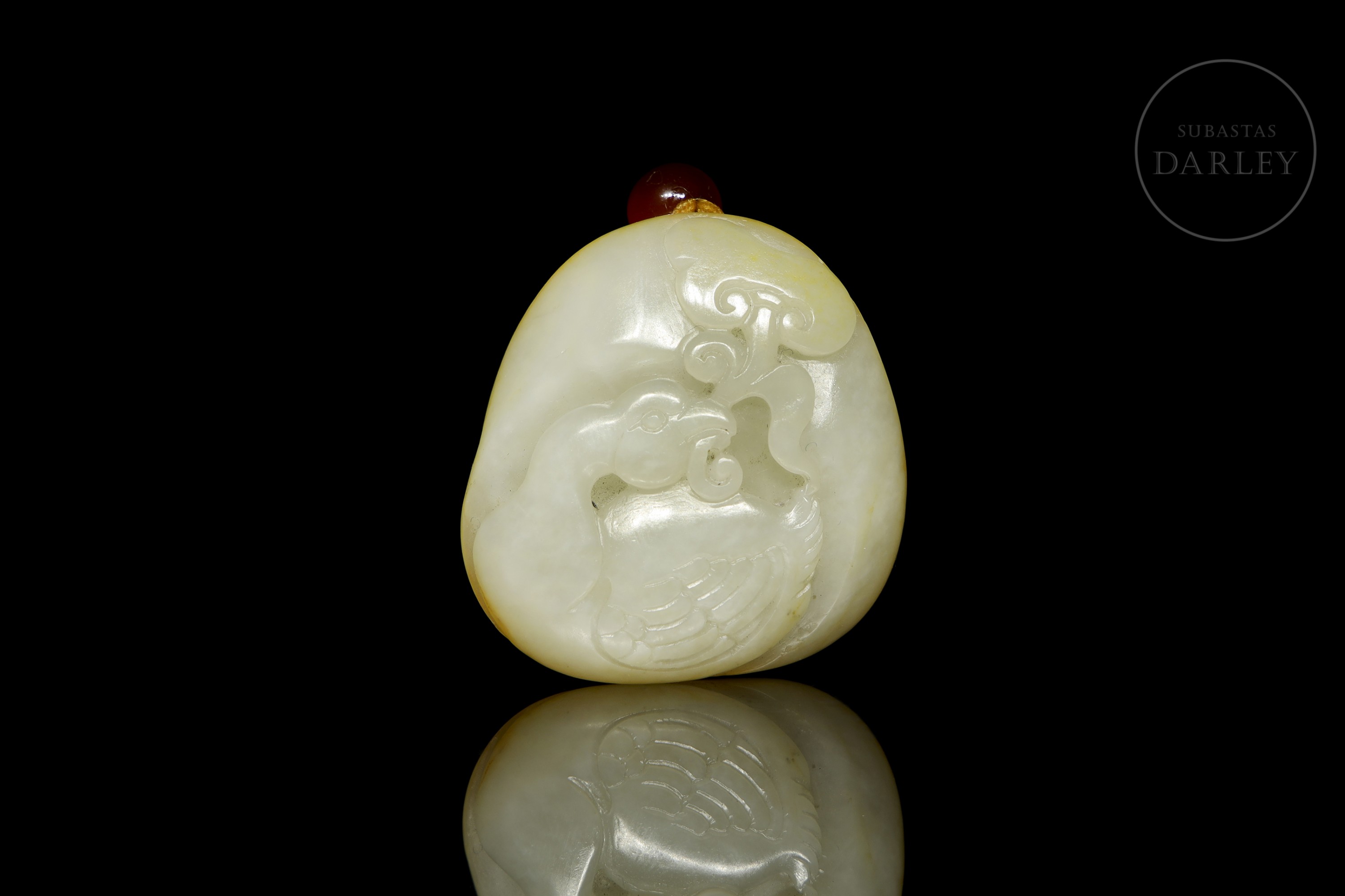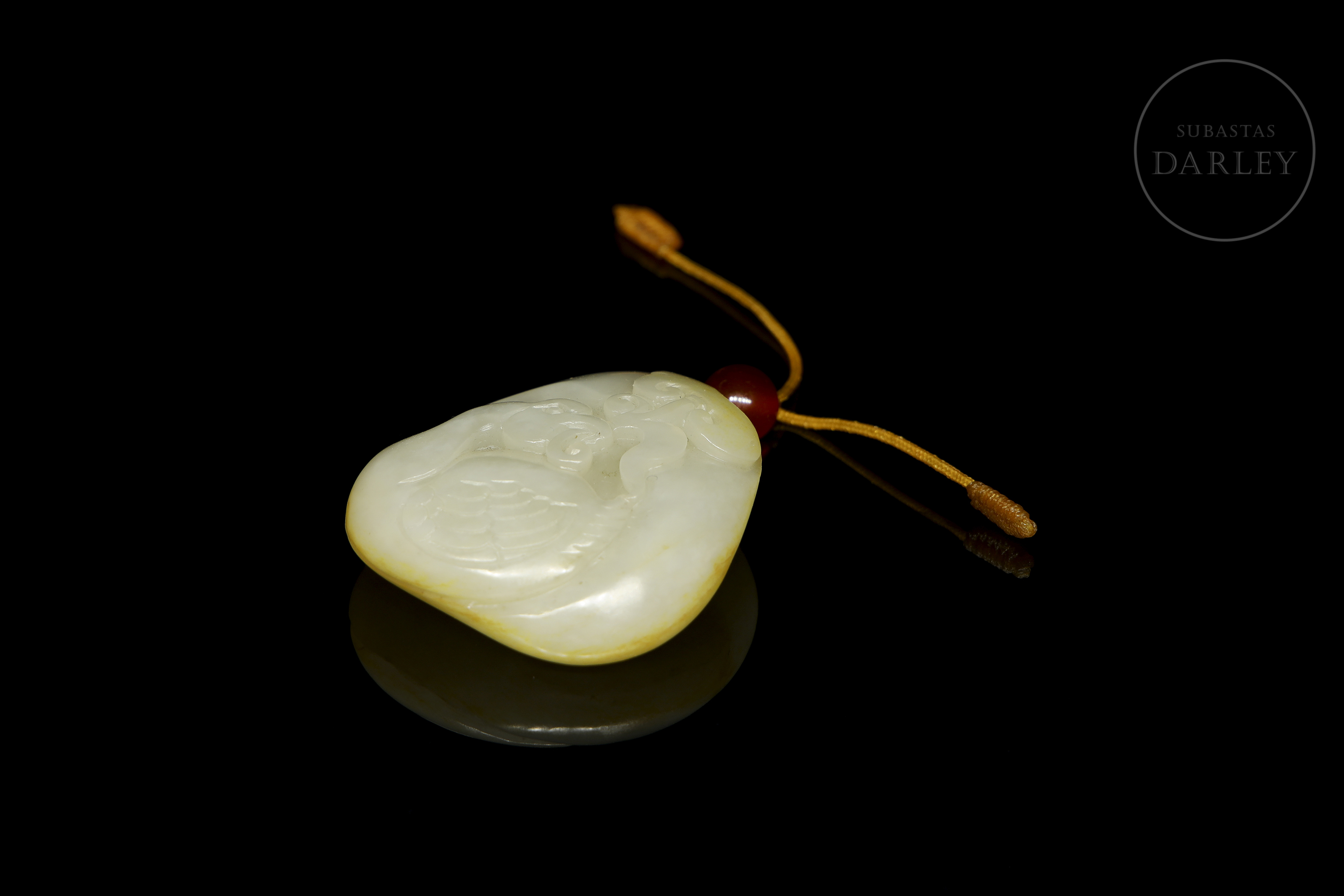 Irregularly shaped ivory-coloured jade pendant with light golden veins. One side features a bas-relief depicting a bird with folded wings, holding a lingzhi branch in its beak. The top is finished with a reddish spherical bead, attached by a cord. Qing Dynasty (1644–1912).