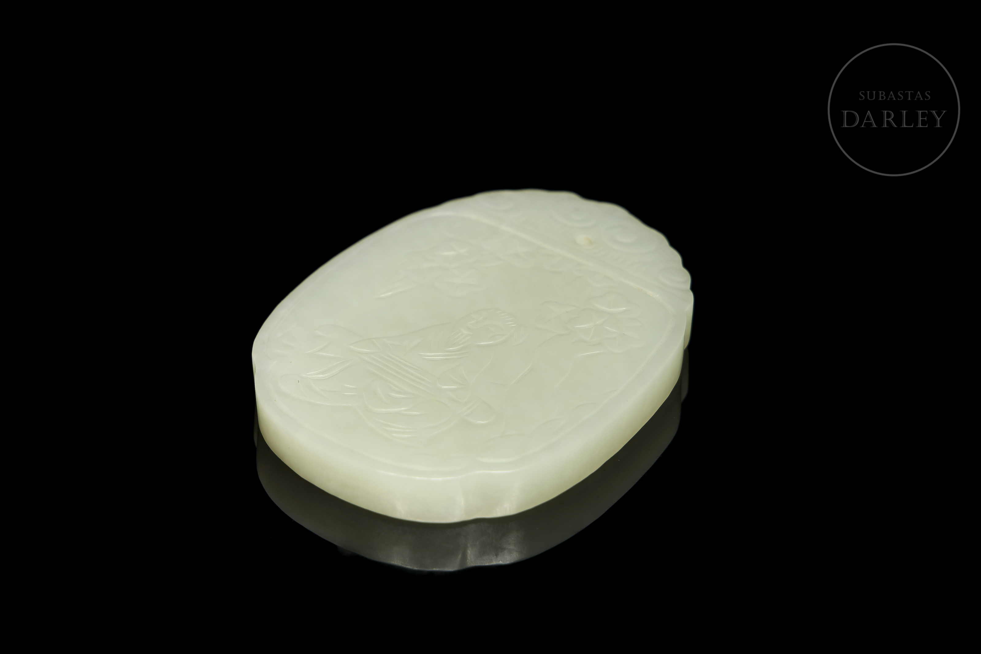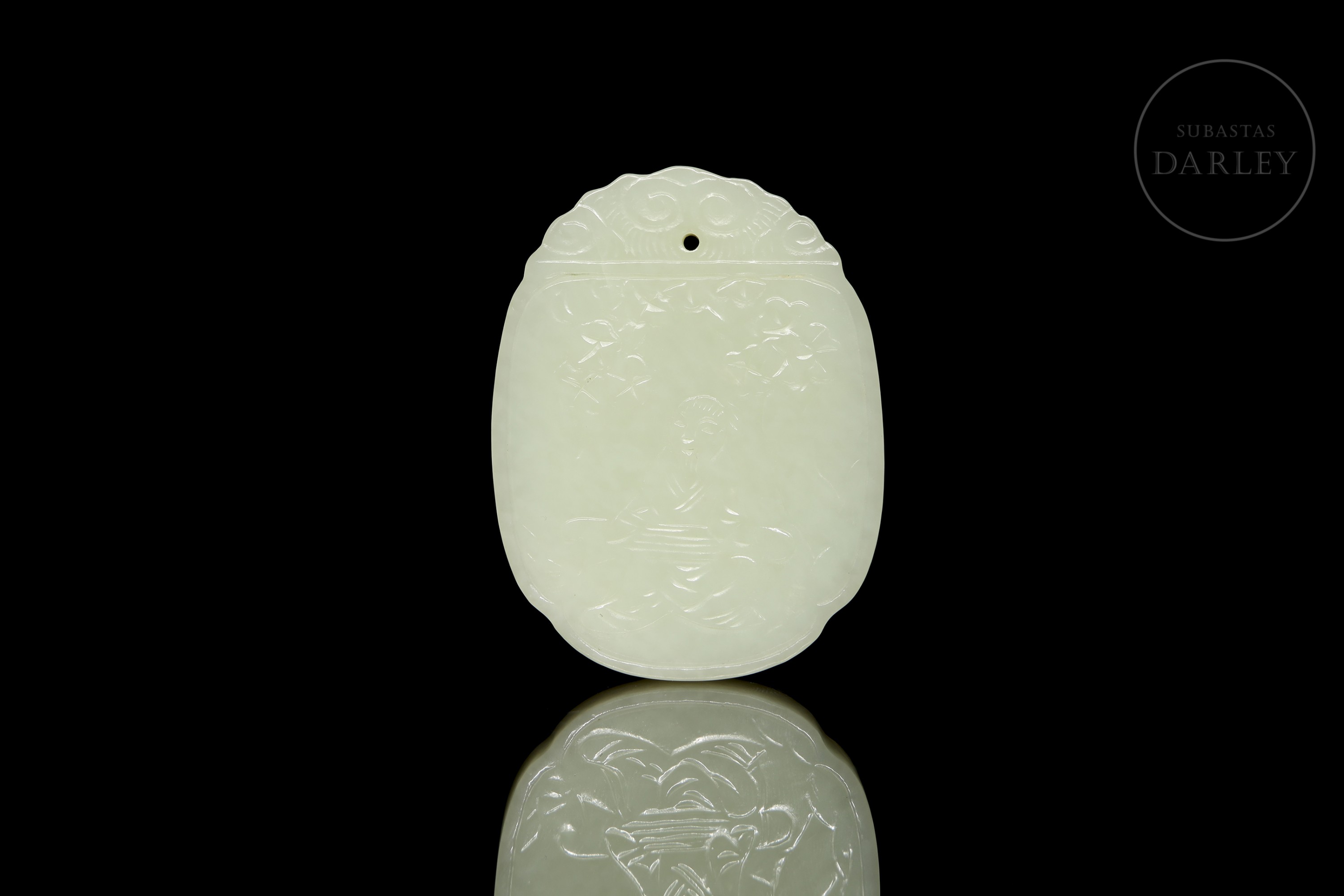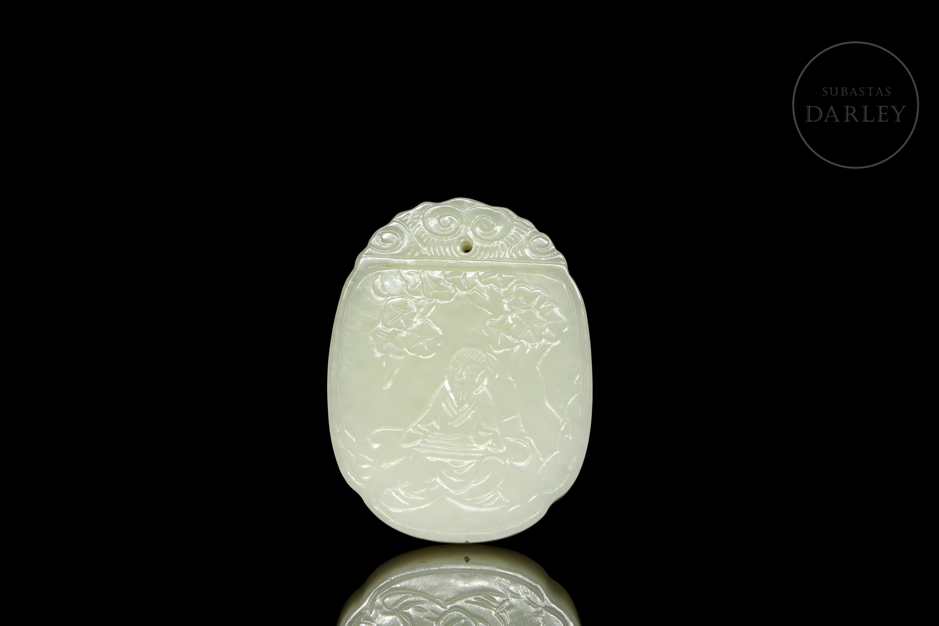 A pale jade pendant, finely carved in relief with the representation of an old man seated under a tree while playing the guqin. The reverse side bears an inscription. The upper part, topped with scrollwork, incorporates a hole for suspension. Qing Dynasty (1644–1912).