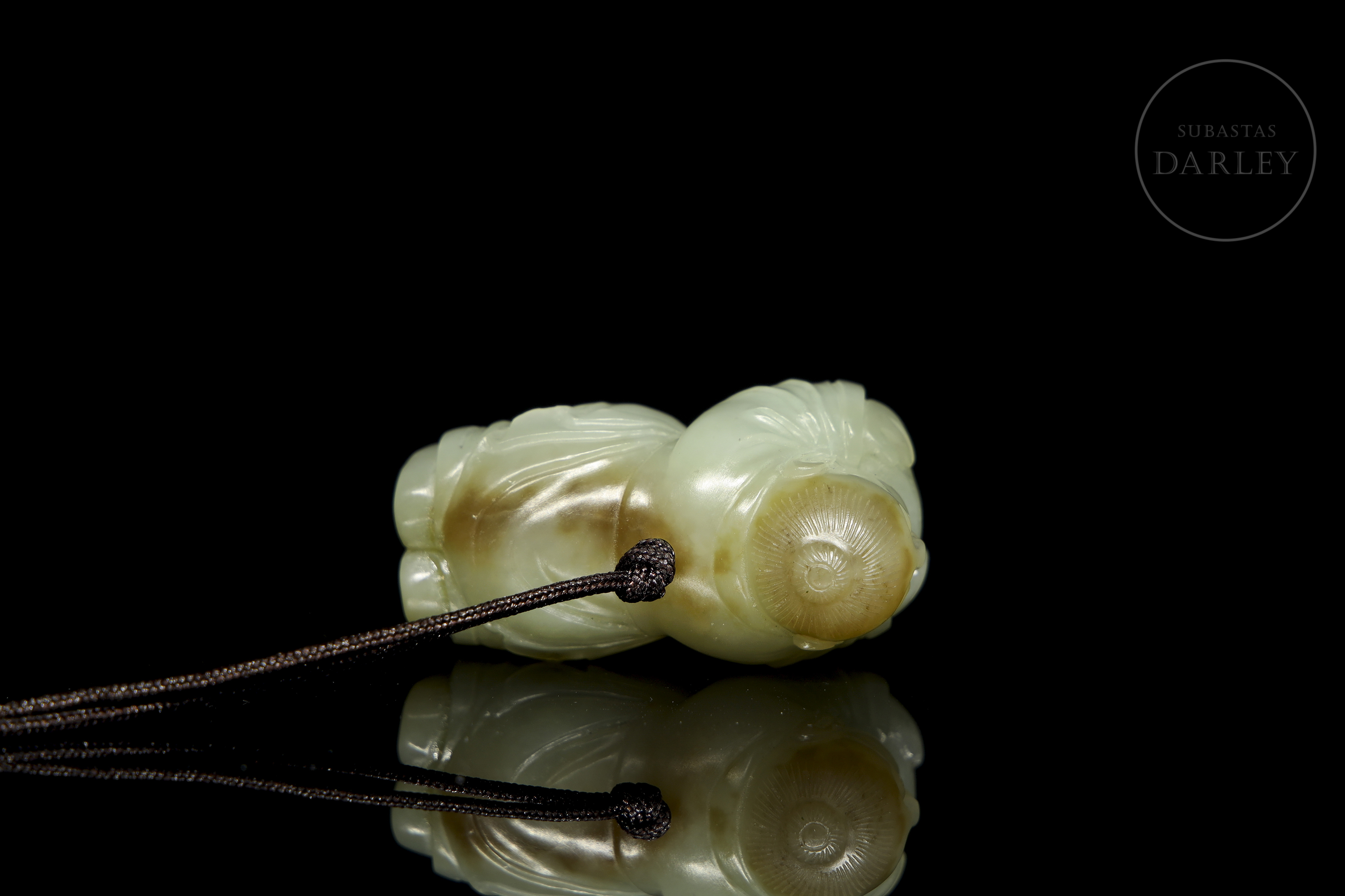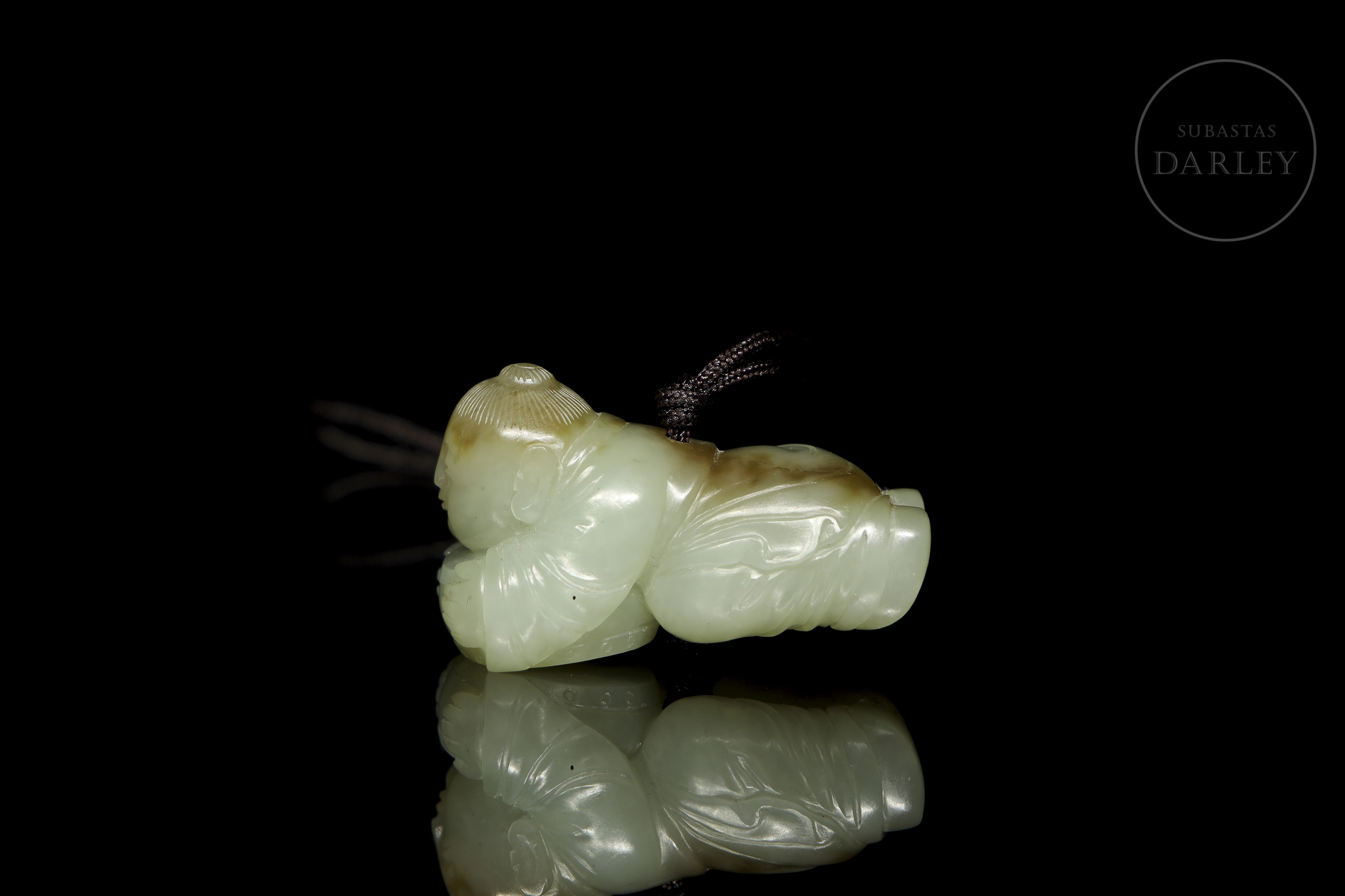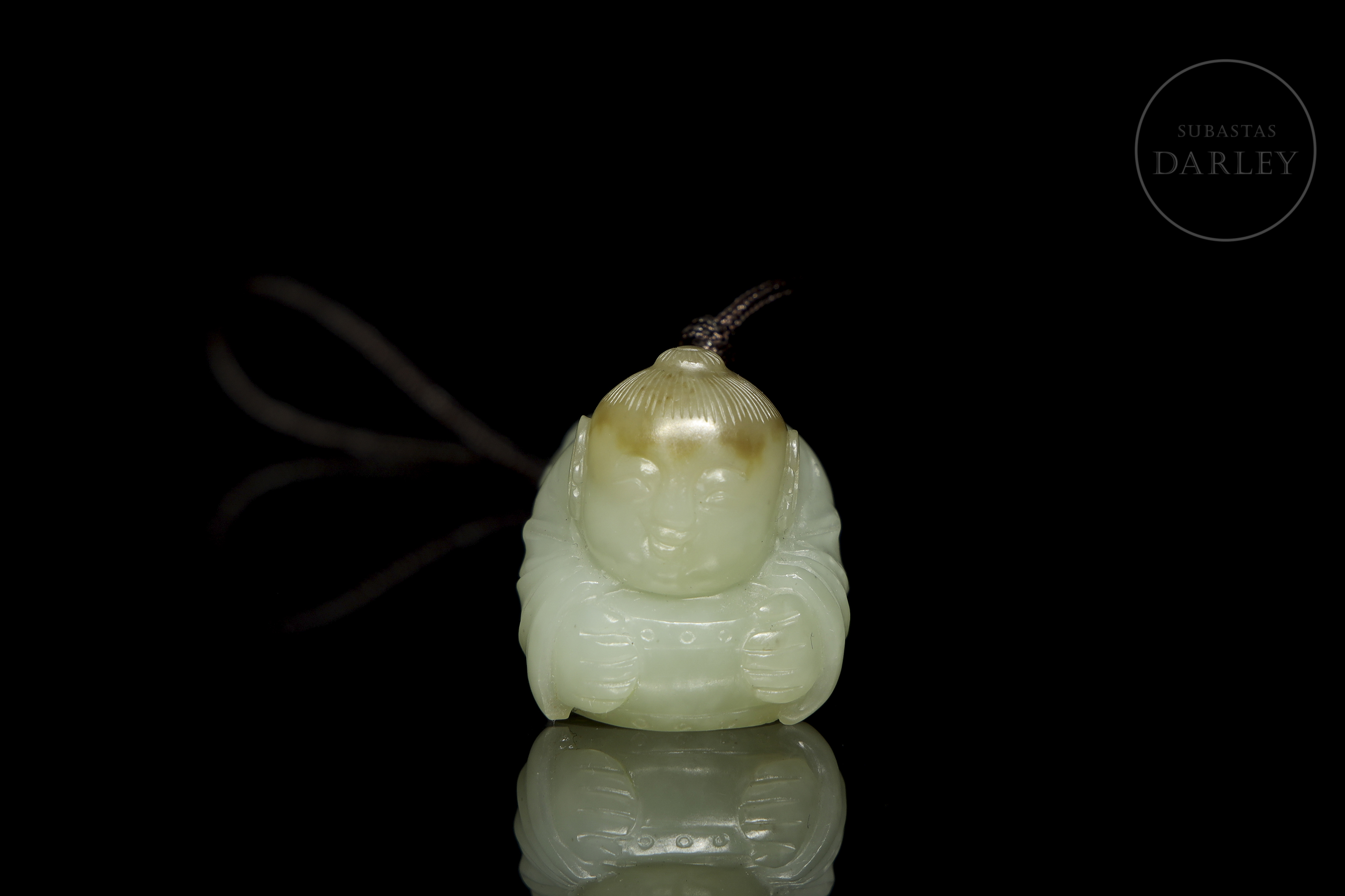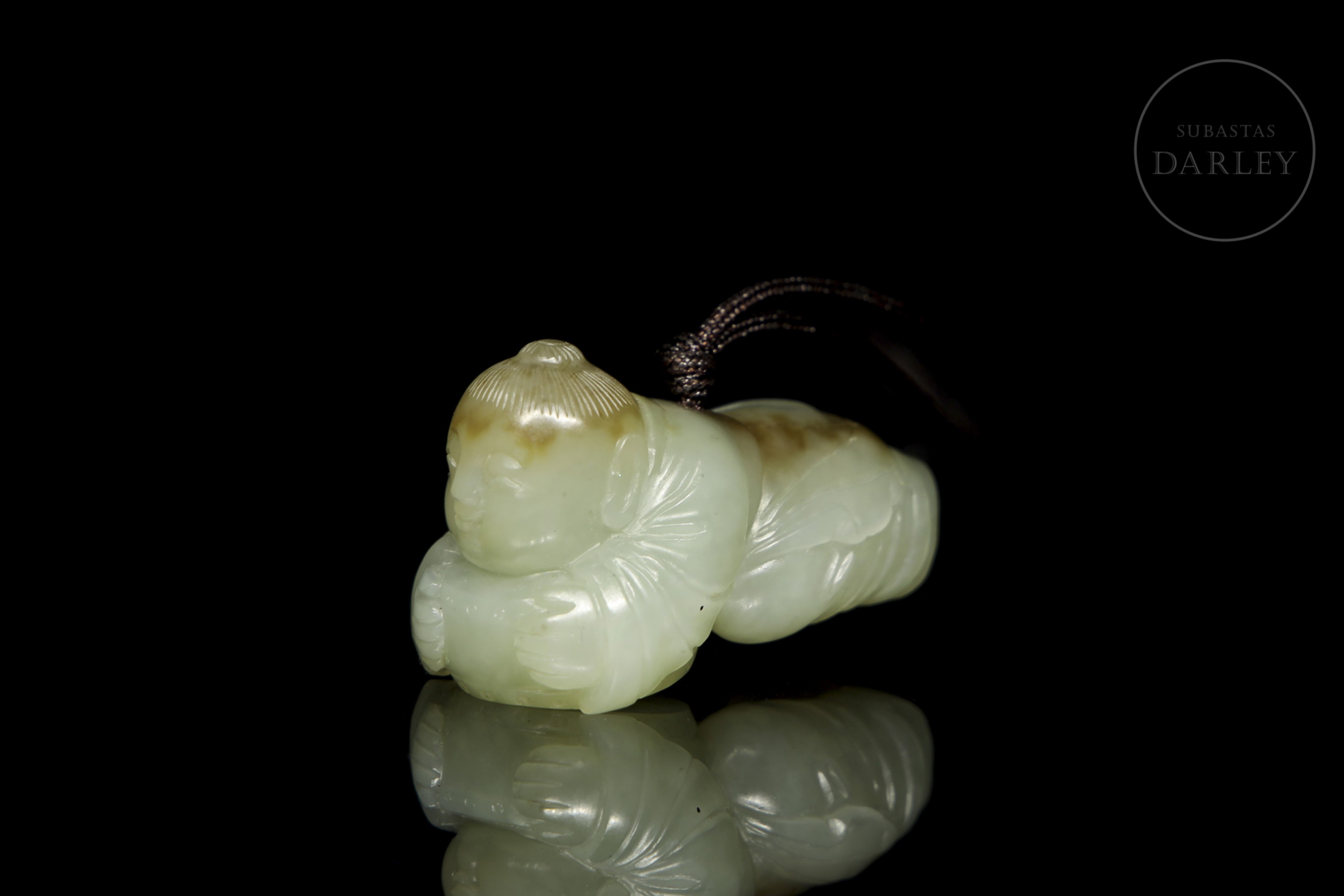 Pendant carved from greenish-white jade with amber hues on the head and back. It depicts a reclining child with a serene expression, modeled with rounded volume and incised details on the hair and clothing. Upper perforation for suspension.