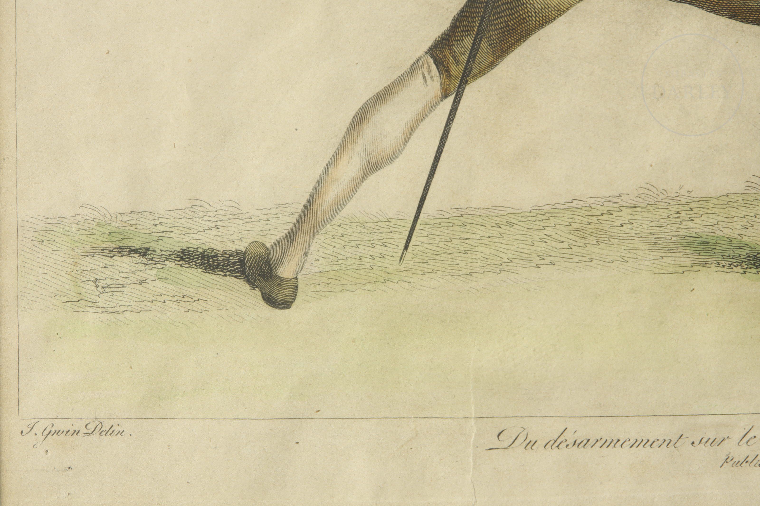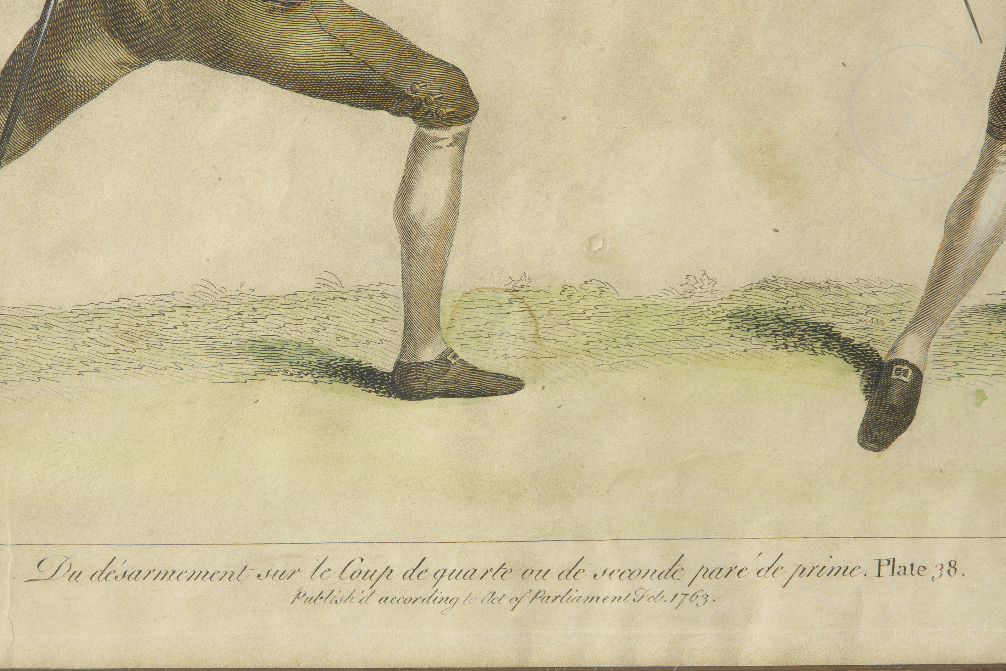 两幅纸本雕版画。均附法文题记。第38版。依据《议会法令De4-1763》出版,并标注“半转体配合强力击打动作,手臂外展”。第32版。依据议会法令出版,1709年2月。两幅作品左下角均署名“J.Gwin Delin”。右下角则分别由不同人物签名。