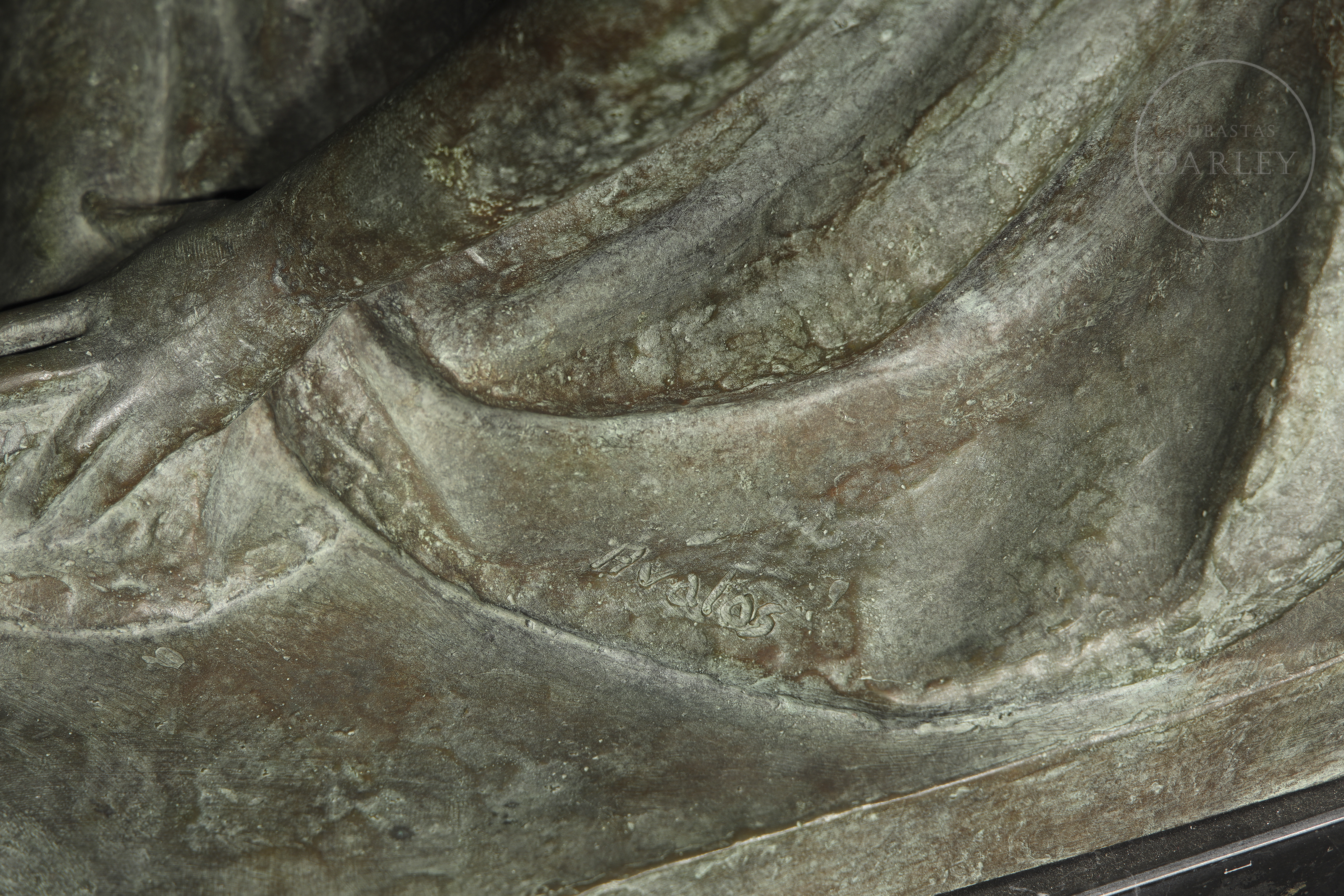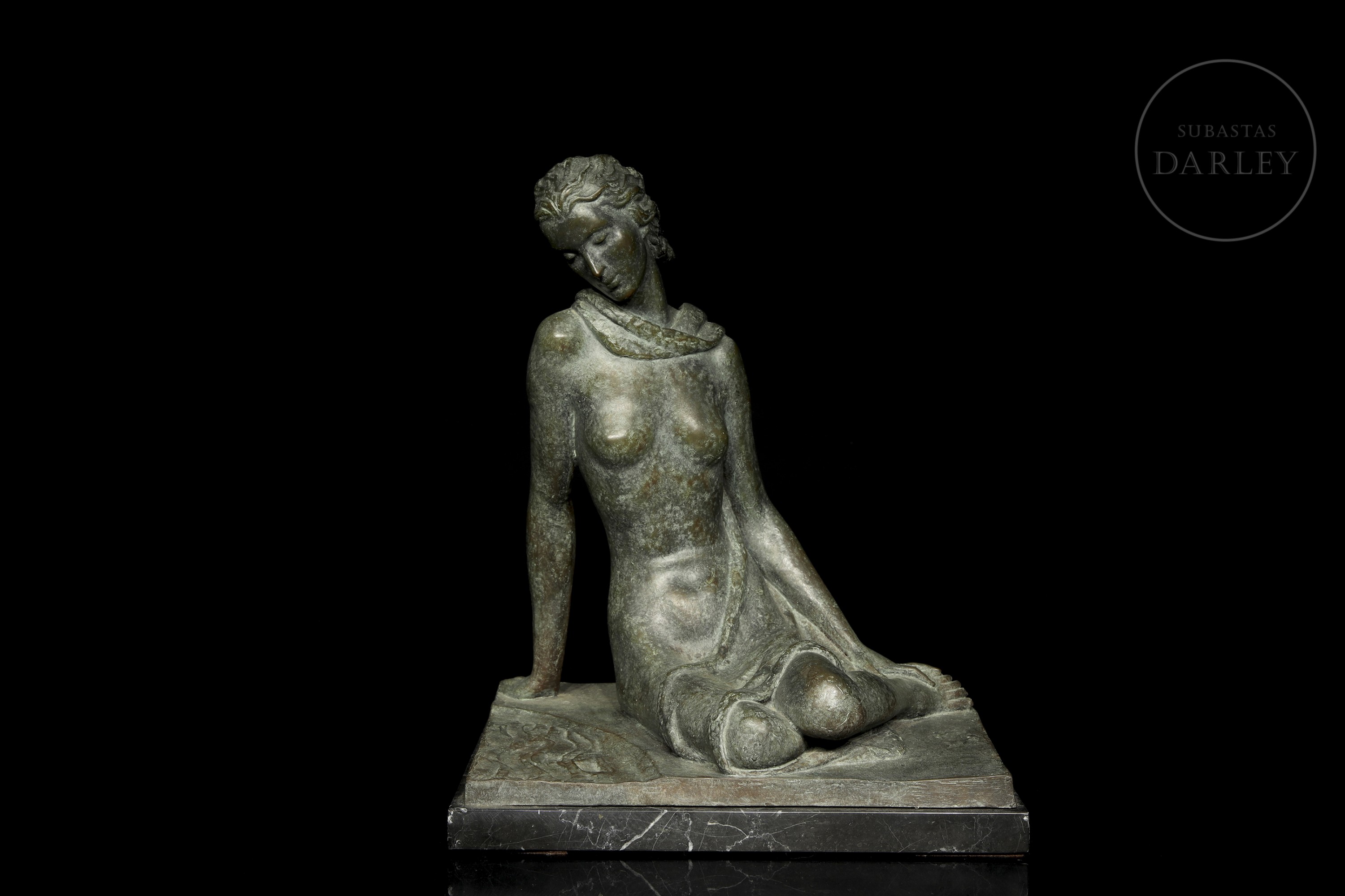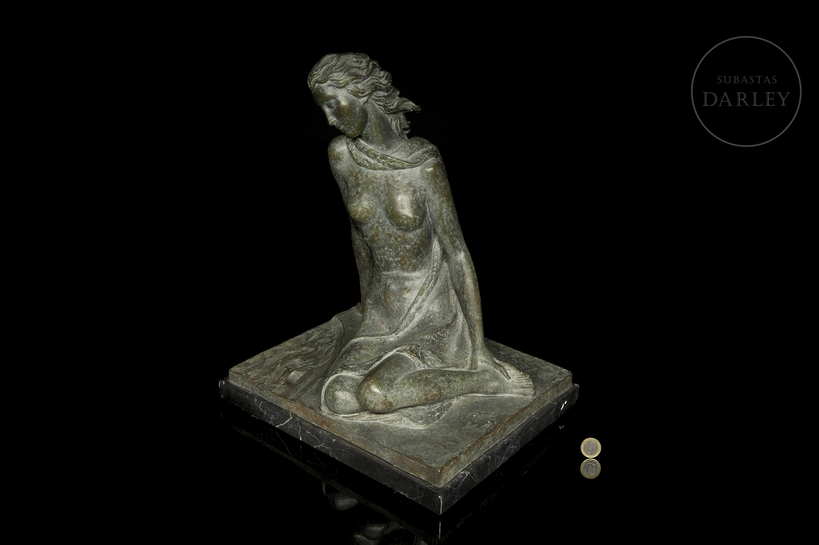 Patinated bronze sculpture on a marble pedestal. Nude female figure, depicted in a serene and melancholic seated pose. Signed ‘Avalos’ and foundry initials ‘ARTE’ on the base.