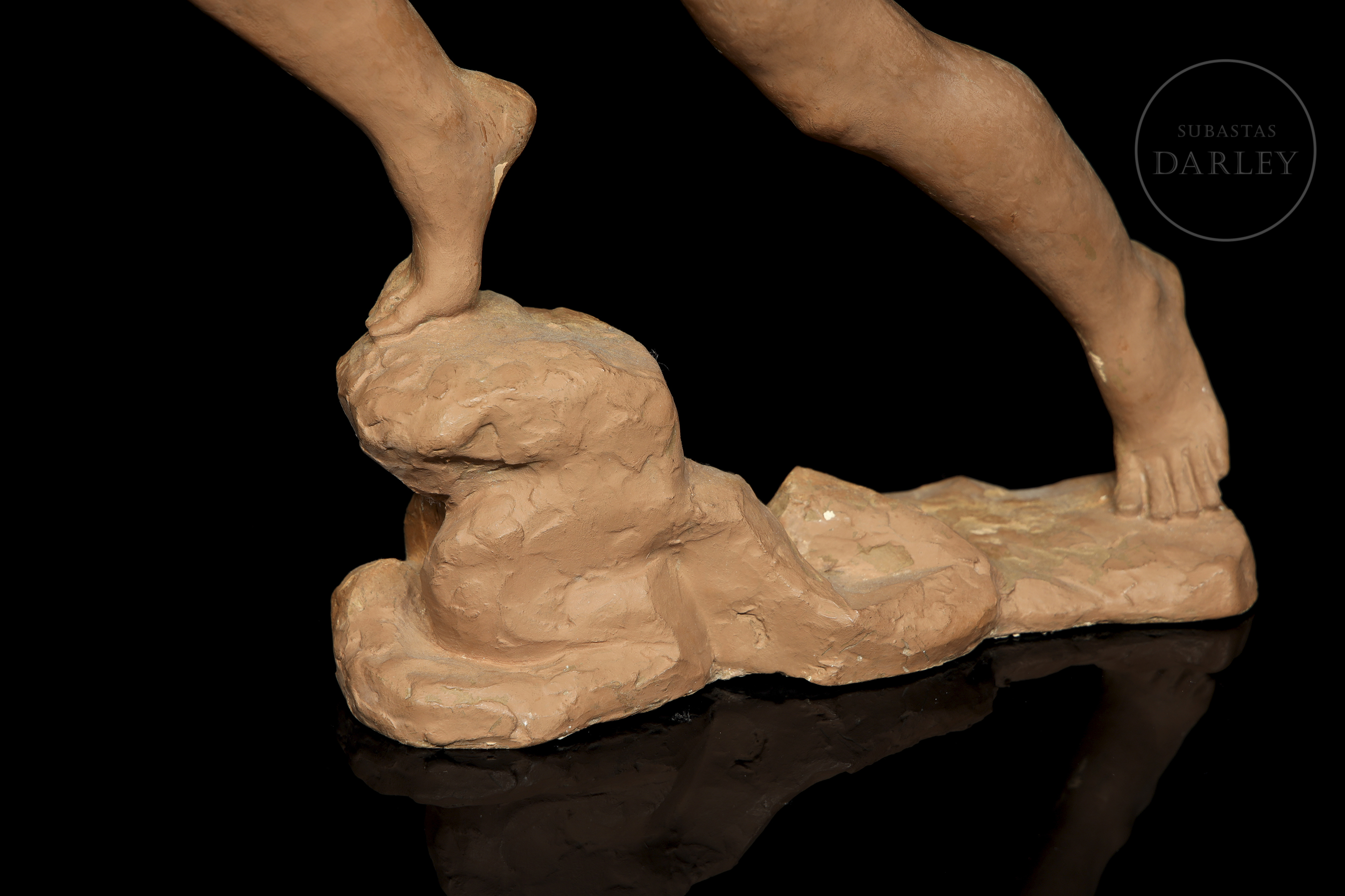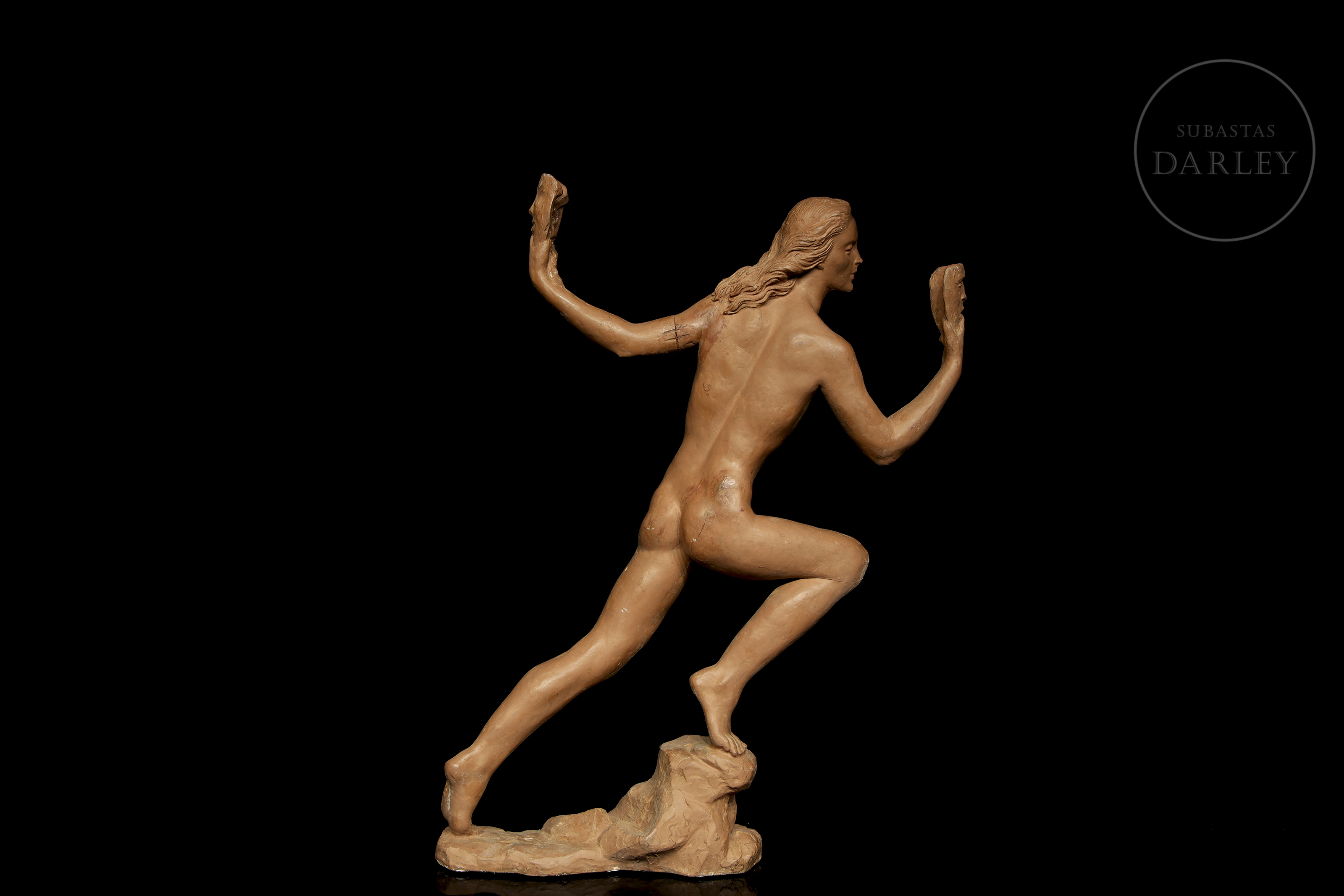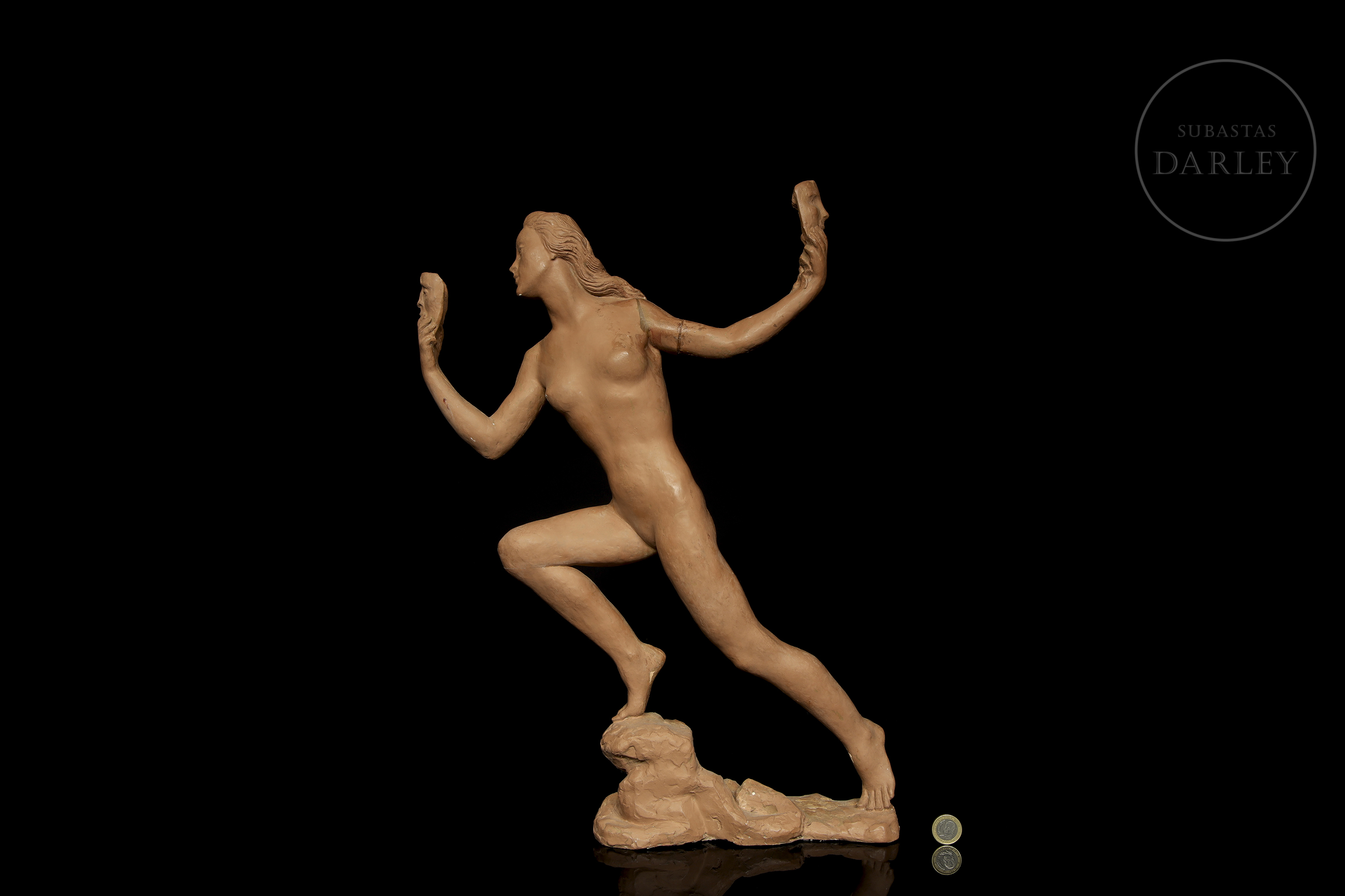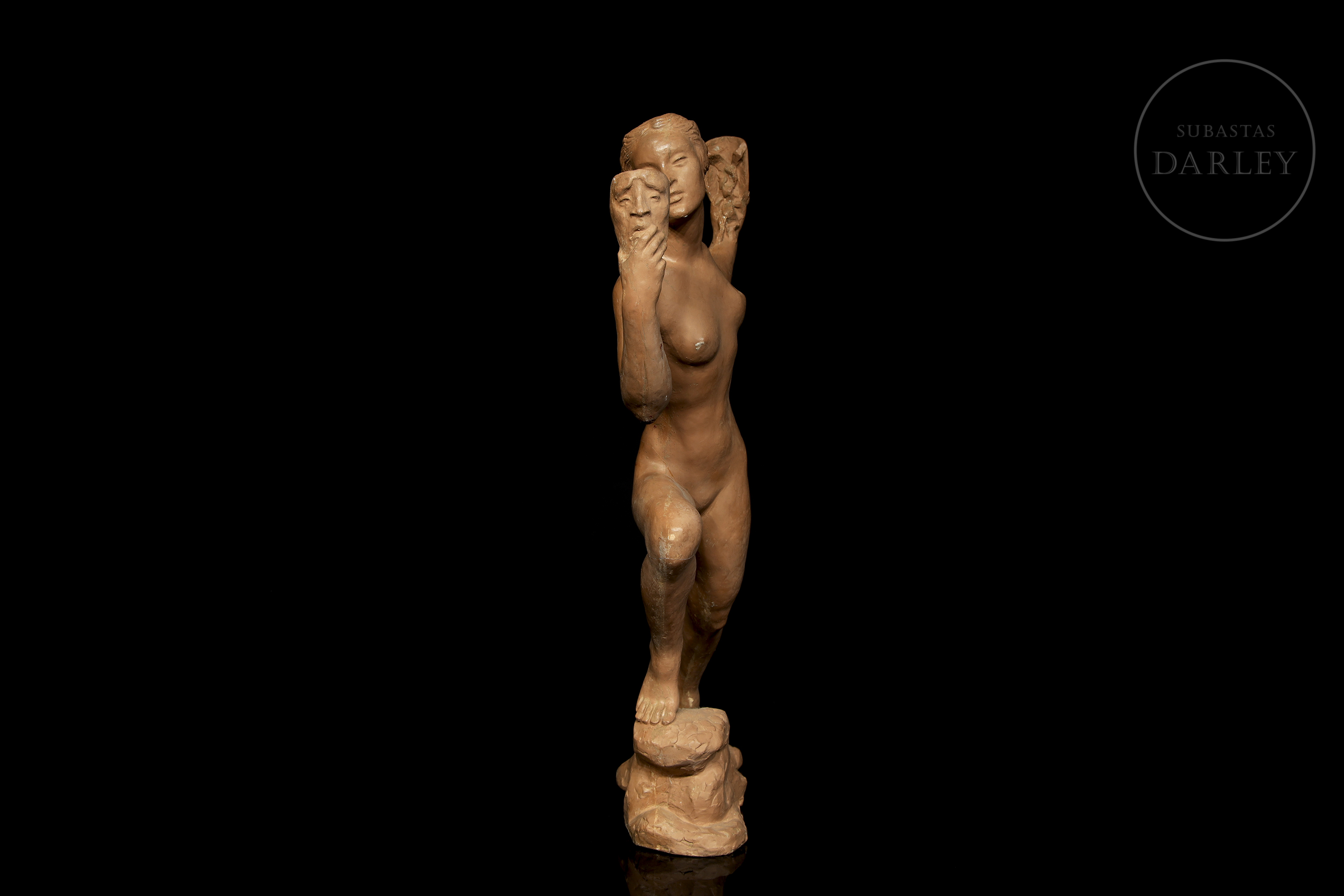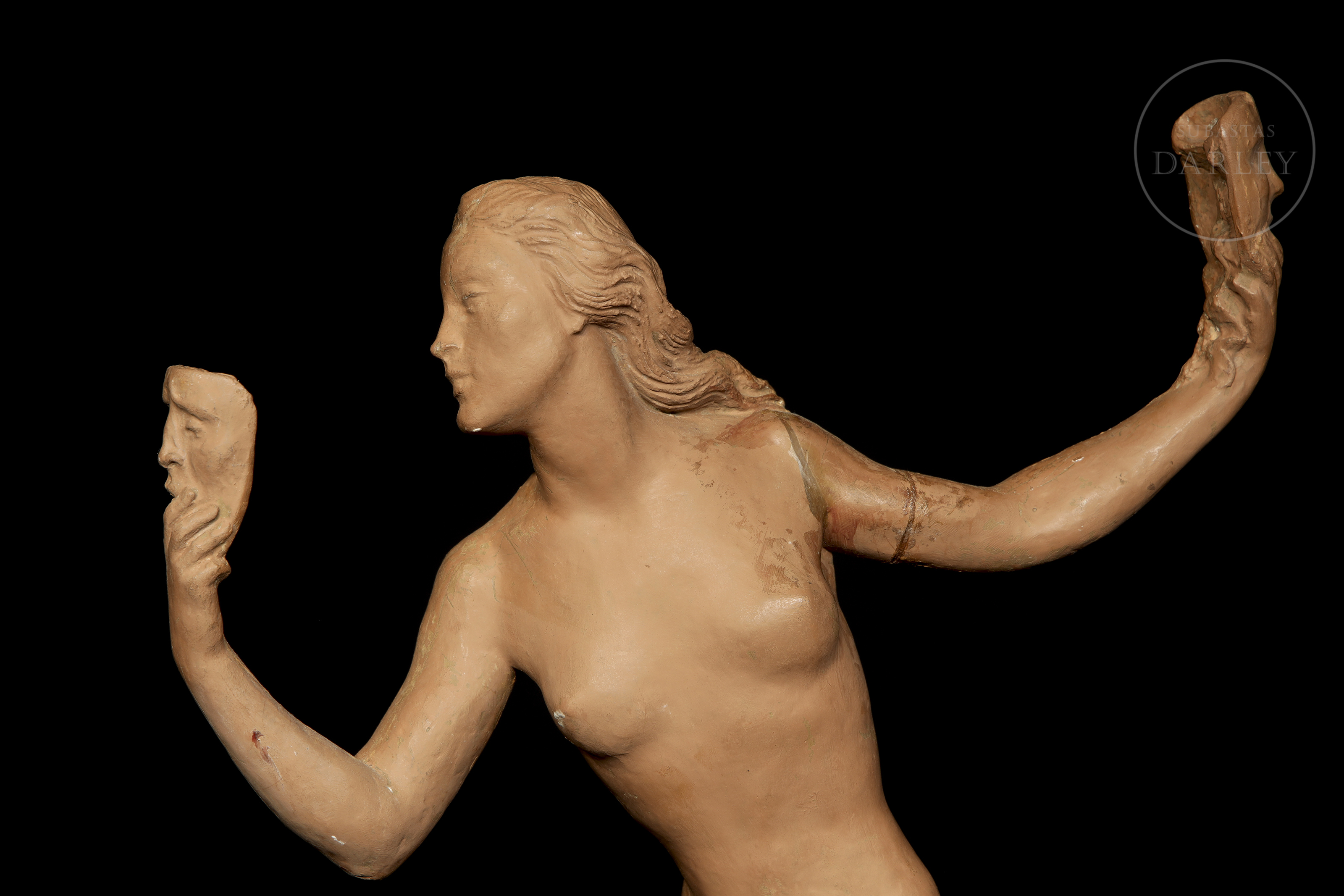 Plaster sculpture covered in terracotta. Nude female figure, depicted in a dynamic and theatrical pose, holding two masks, one in each hand. No visible signature.