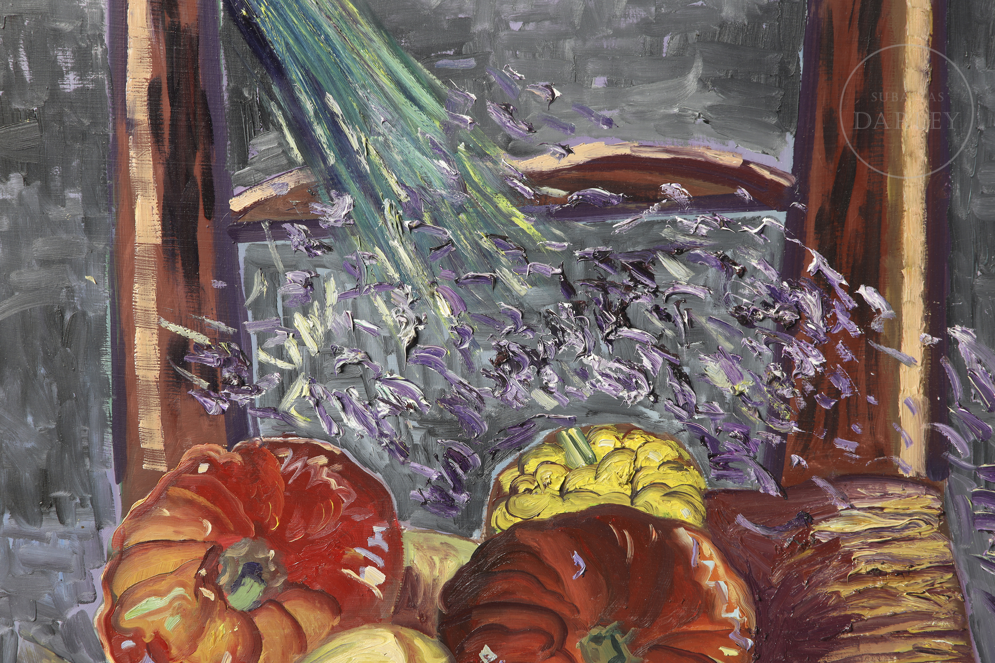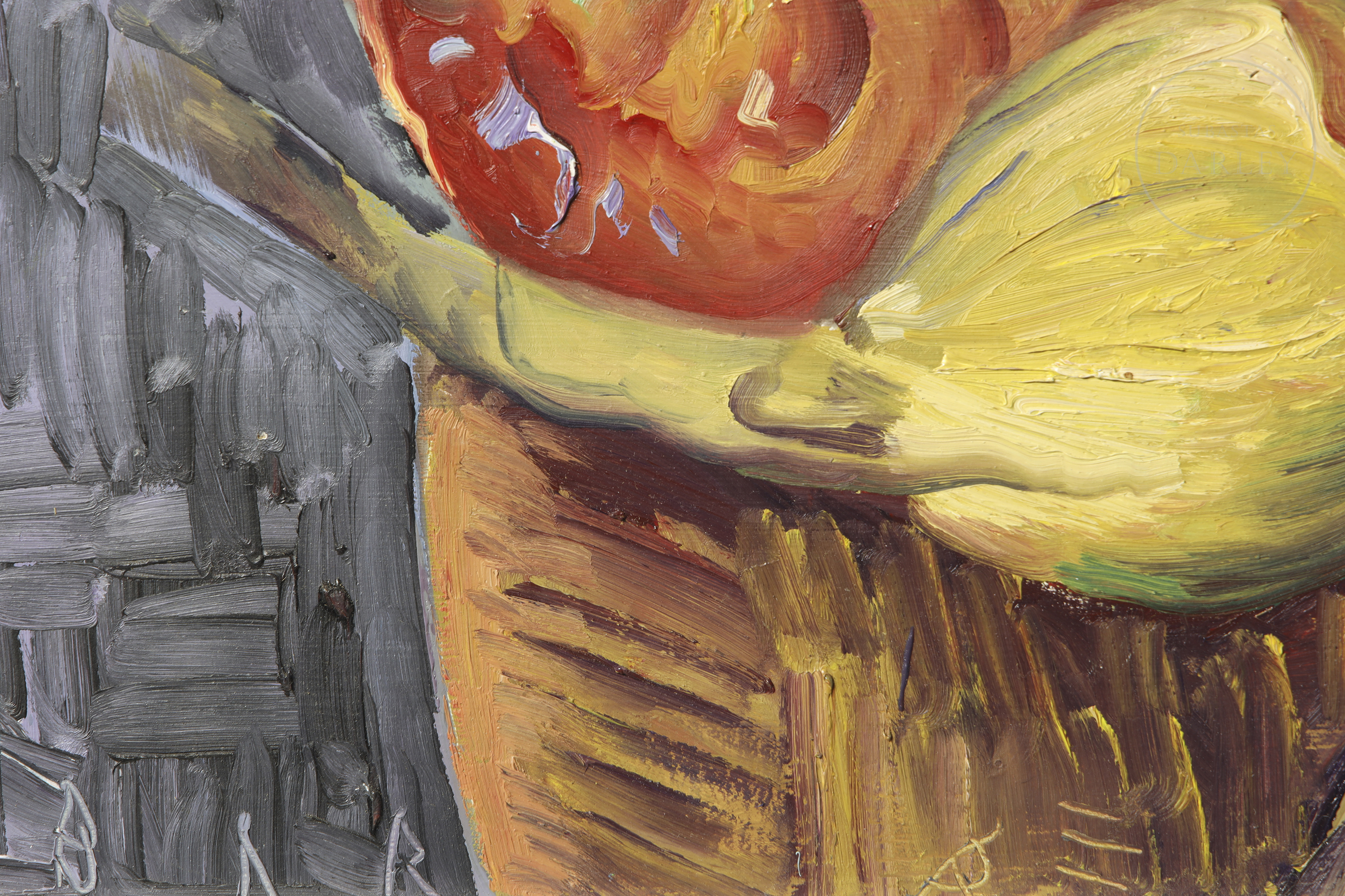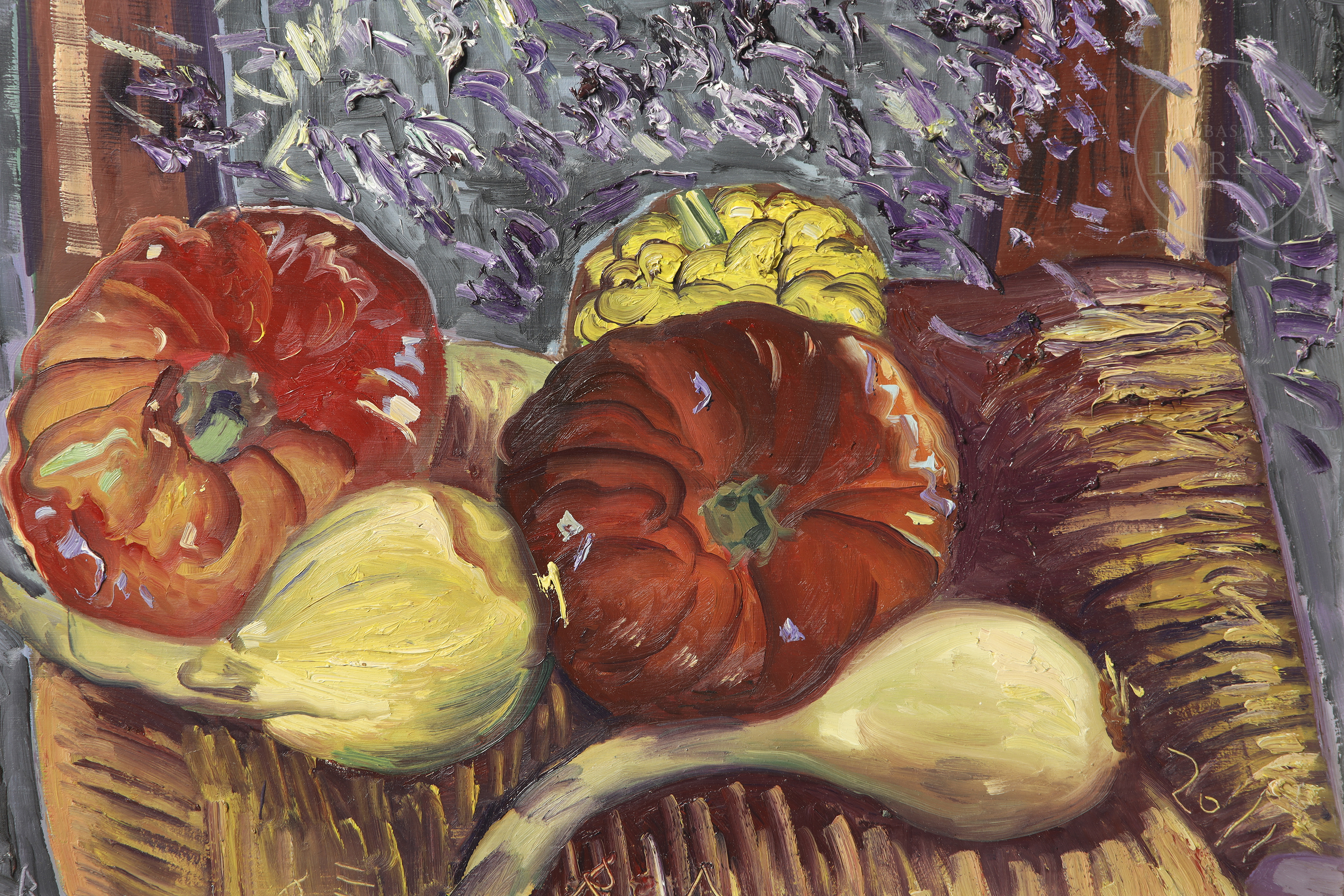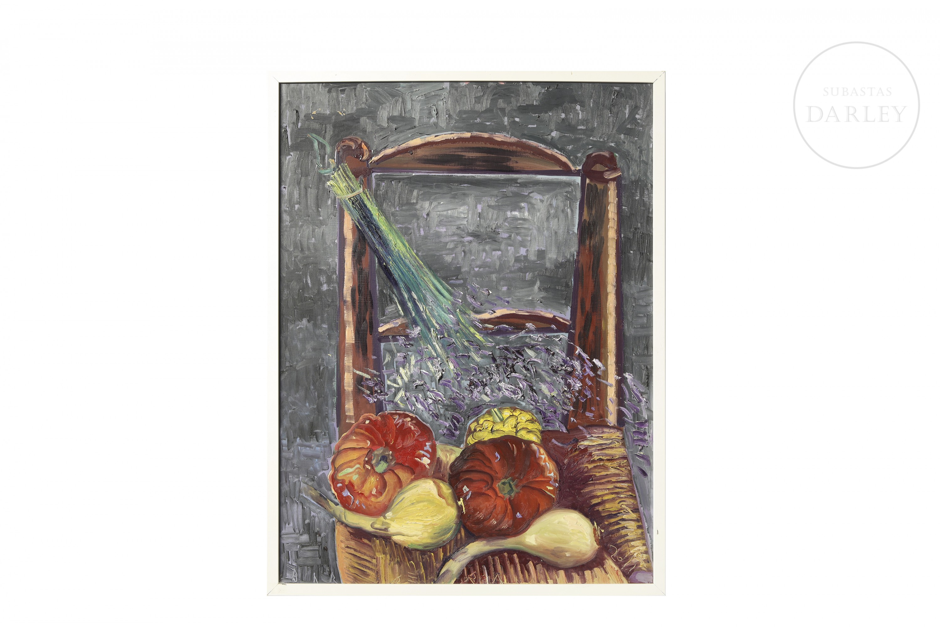 Oil on panel. Expressionist-style still life depicting various vegetables and herbs on the seat of a rush chair. Signed and dated ‘BARBERÁ/2011’ in incised form on the lower margin.