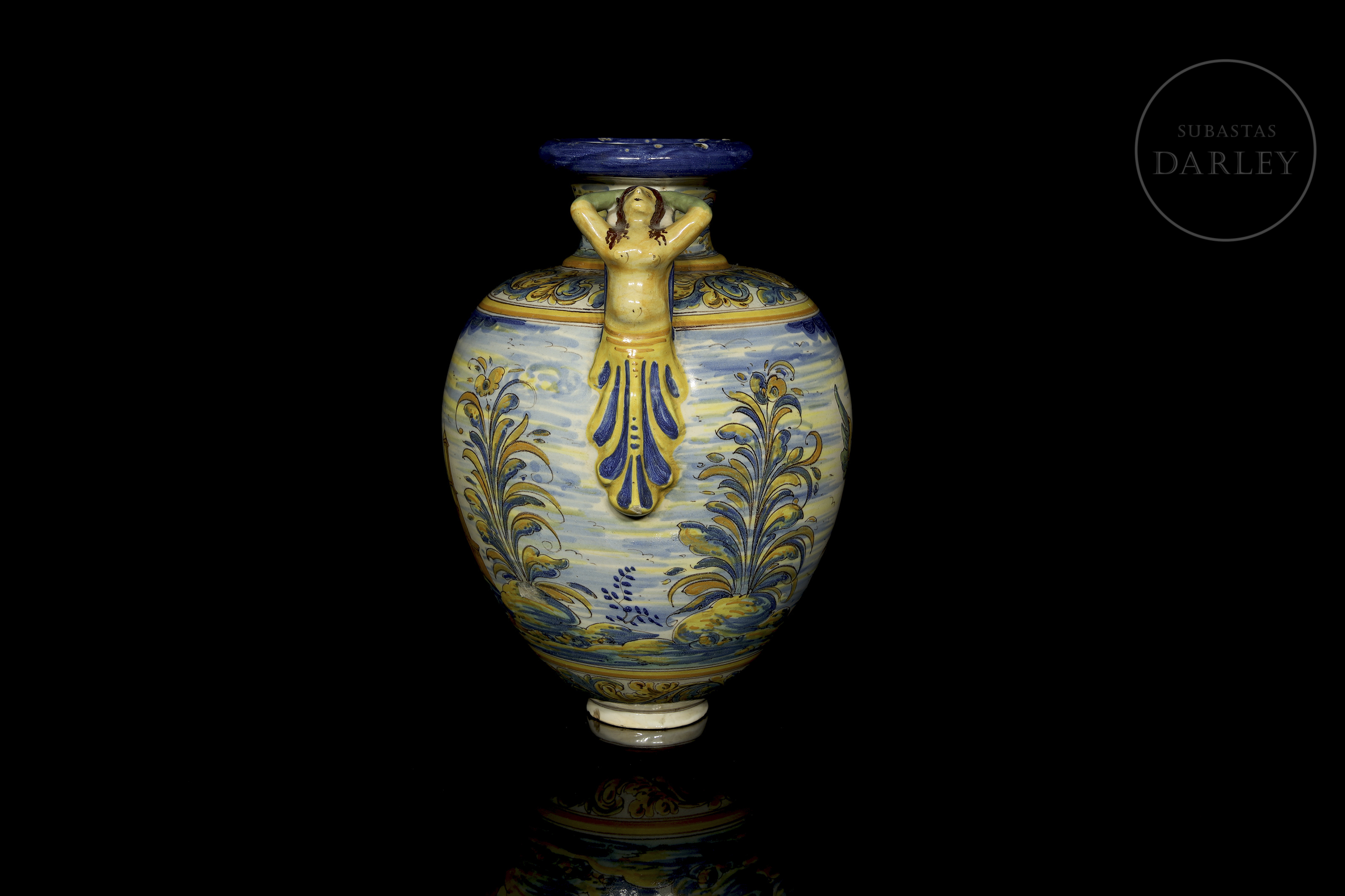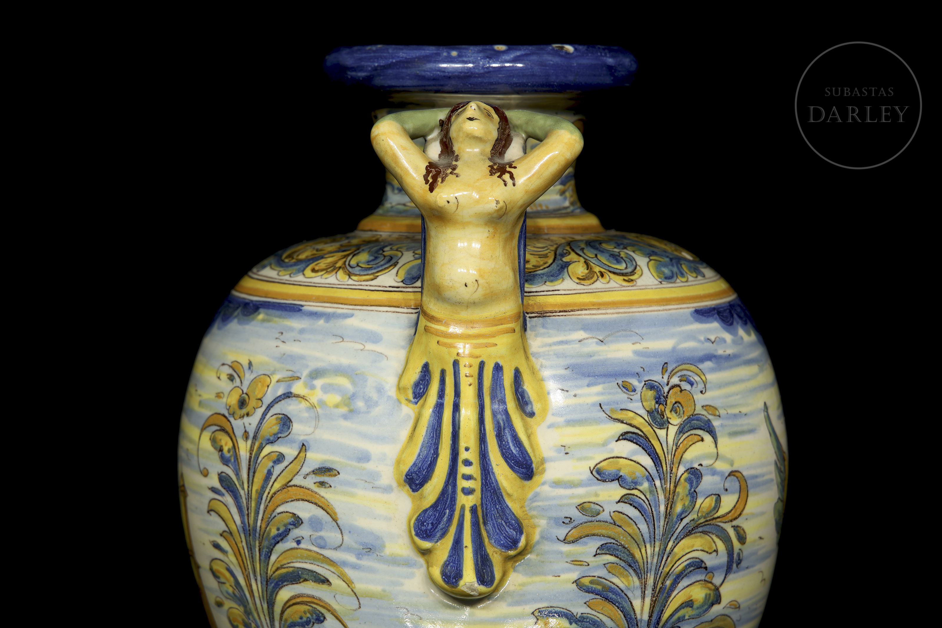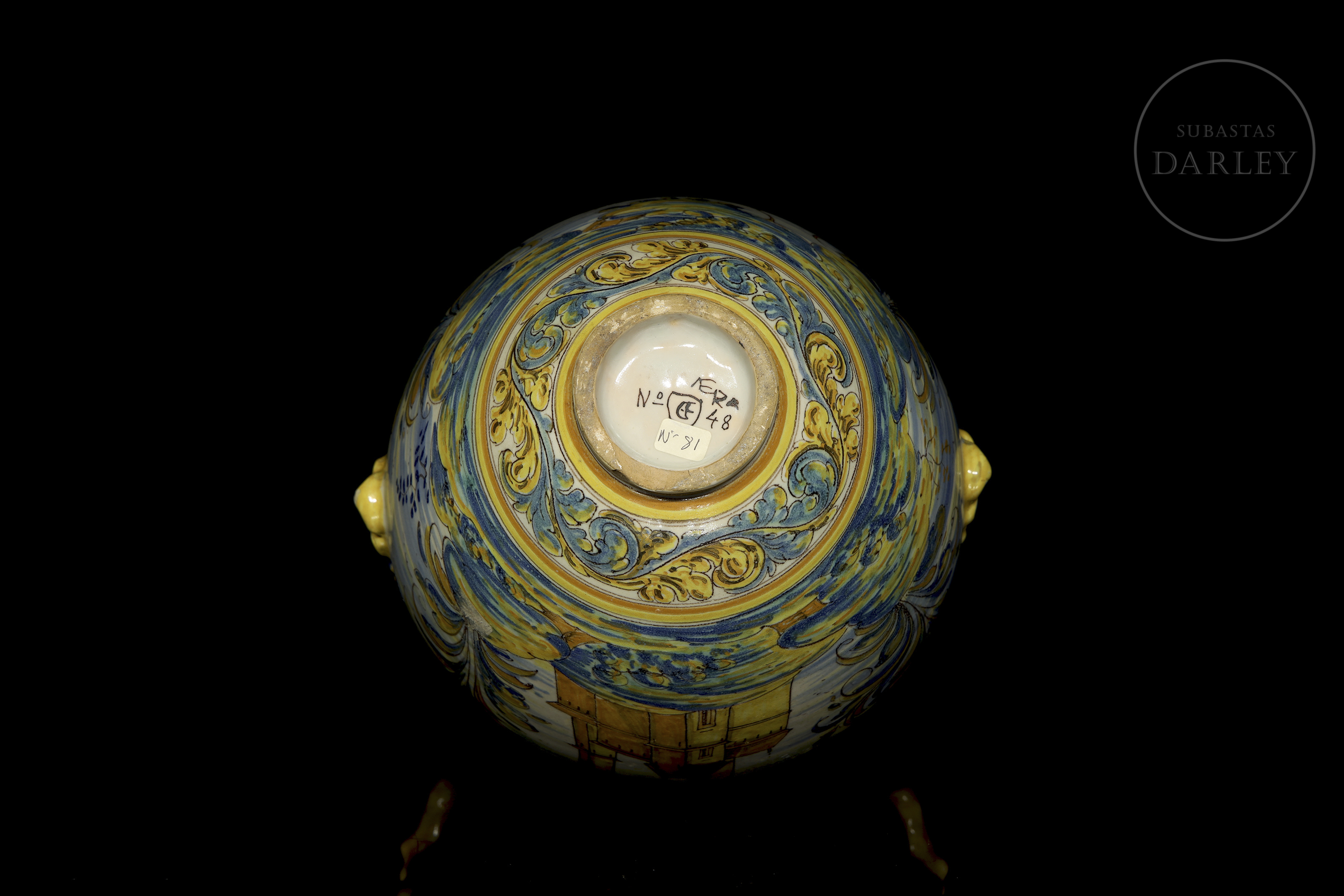 蓝黄双色球形双耳罐,灵感源自17世纪塔拉韦拉陶器。罐身饰有城堡与带翅膀的神话人物场景,罐颈与罐肩处以女性人物造型把手相连。底部刻有艺术家签名缩写。