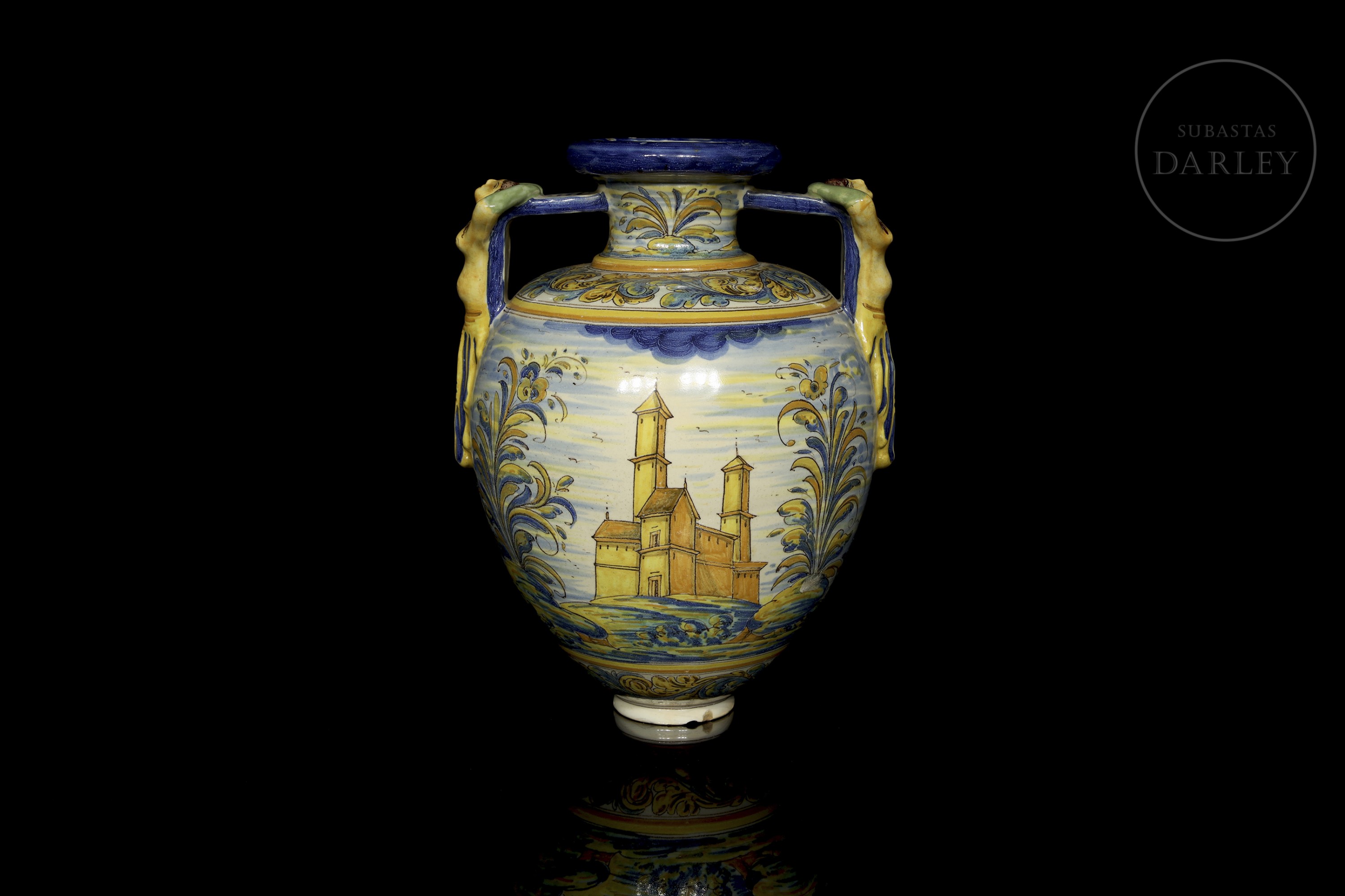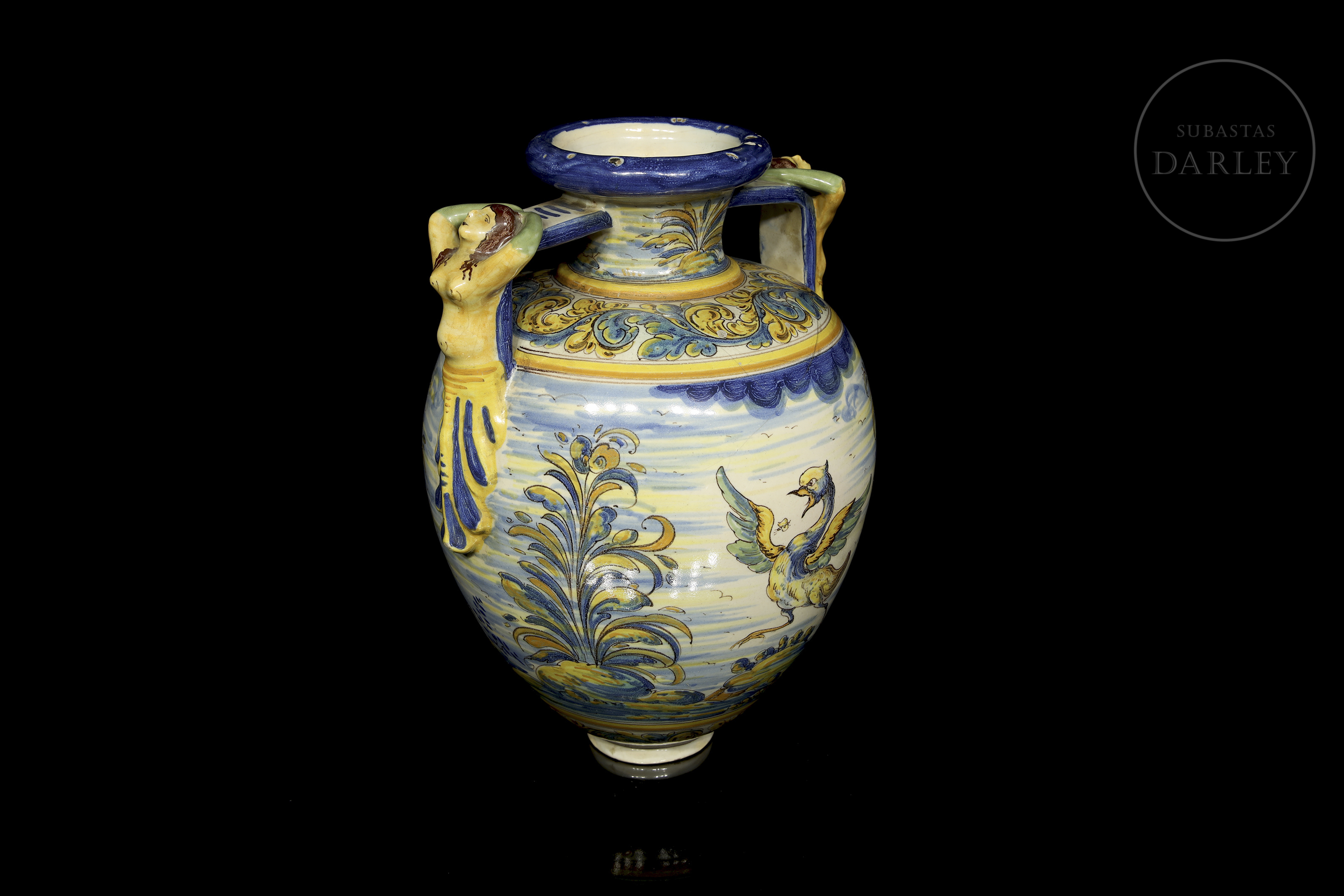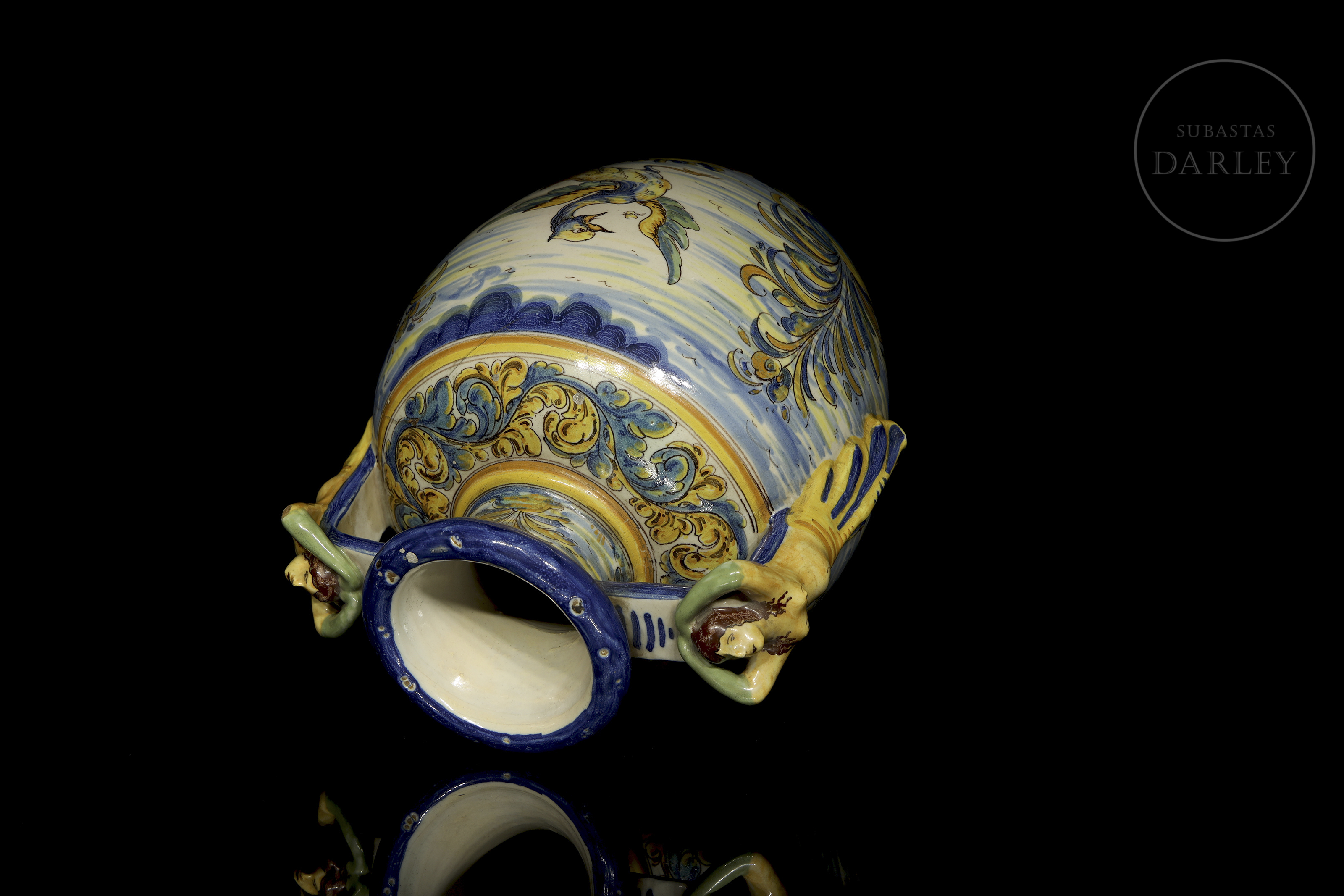 蓝黄双色球形双耳罐,灵感源自17世纪塔拉韦拉陶器。罐身饰有城堡与带翅膀的神话人物场景,罐颈与罐肩处以女性人物造型把手相连。底部刻有艺术家签名缩写。
