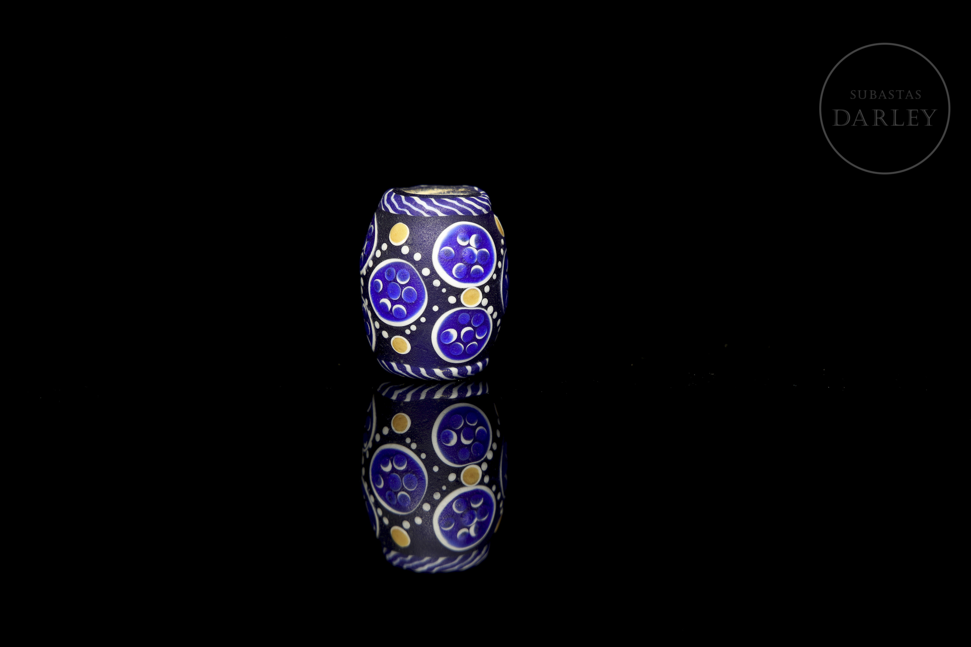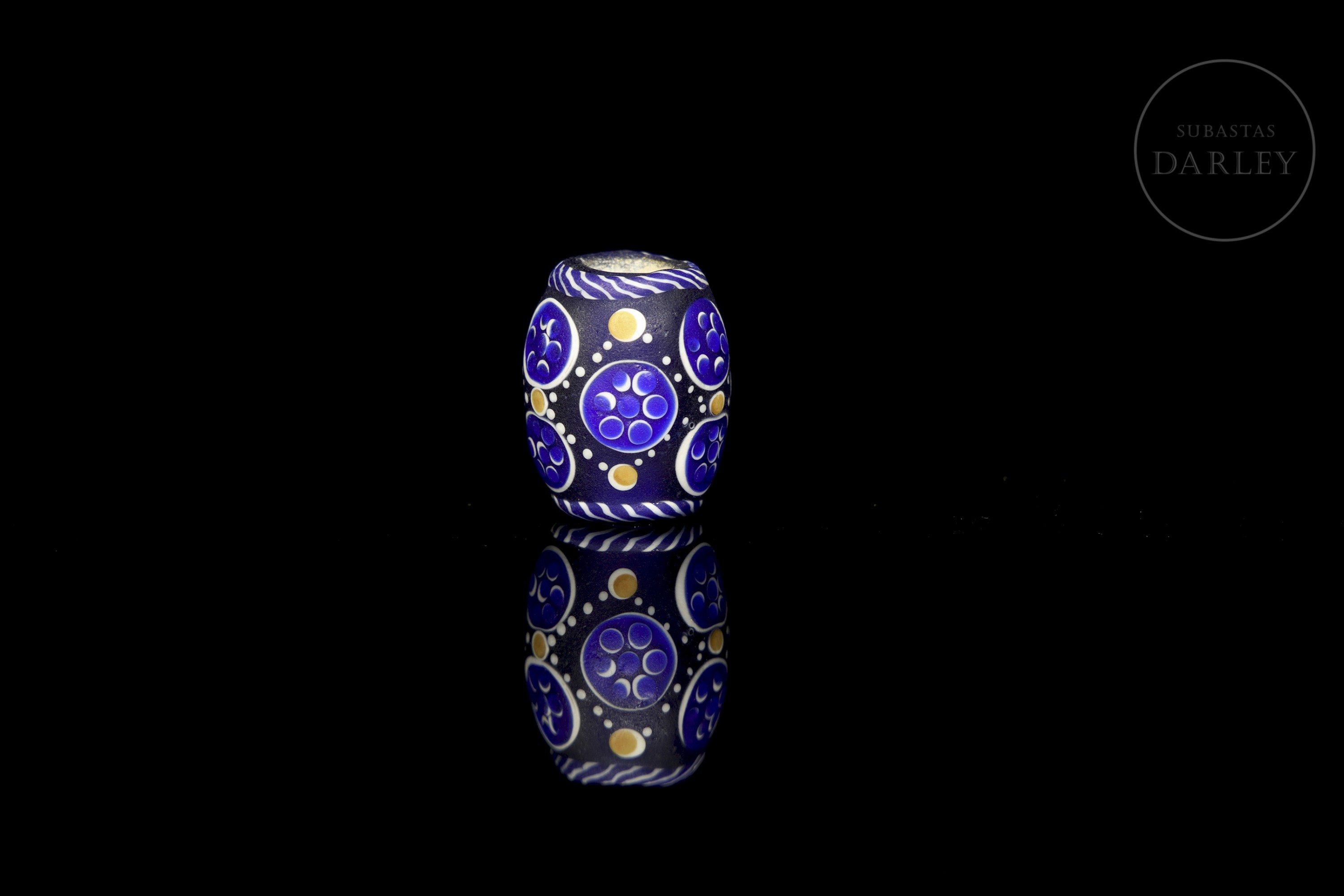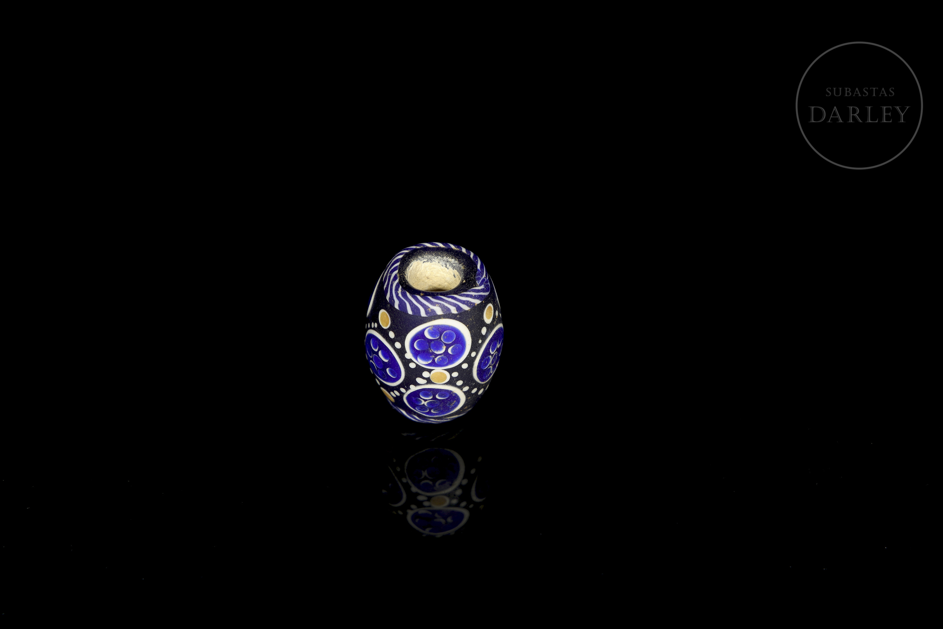 精美绝伦的椭圆形琉璃珠。其底色为浓郁的钴蓝色,饰以花卉纹样,引人注目。每朵花都以优雅的扇形线条和黄色水滴点缀。珠端以蓝白相间的编织带收尾。唐代。因年代久远而呈现包浆。唐代(公元618-906年)。