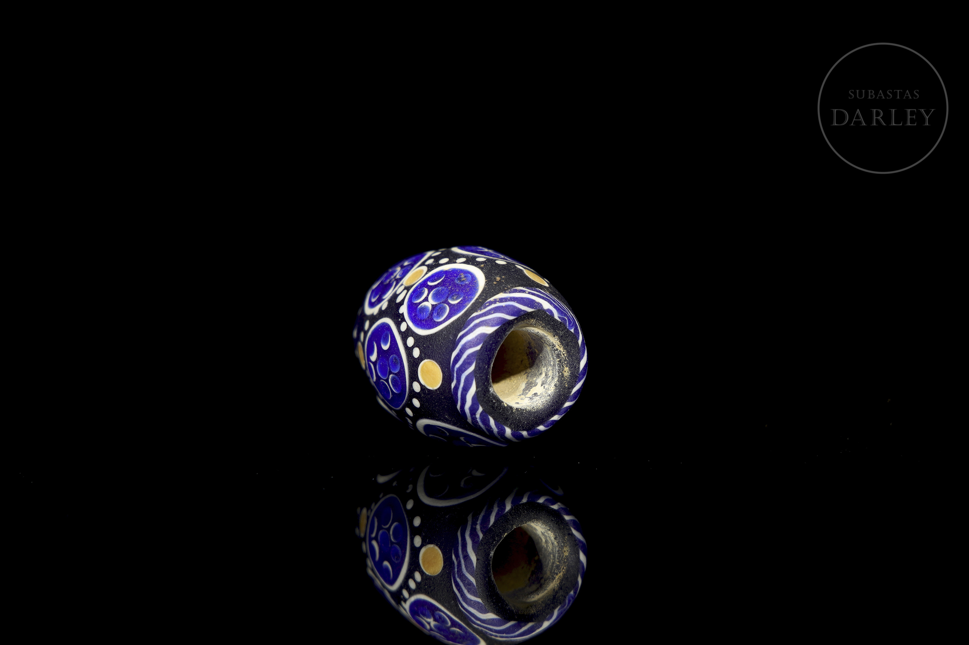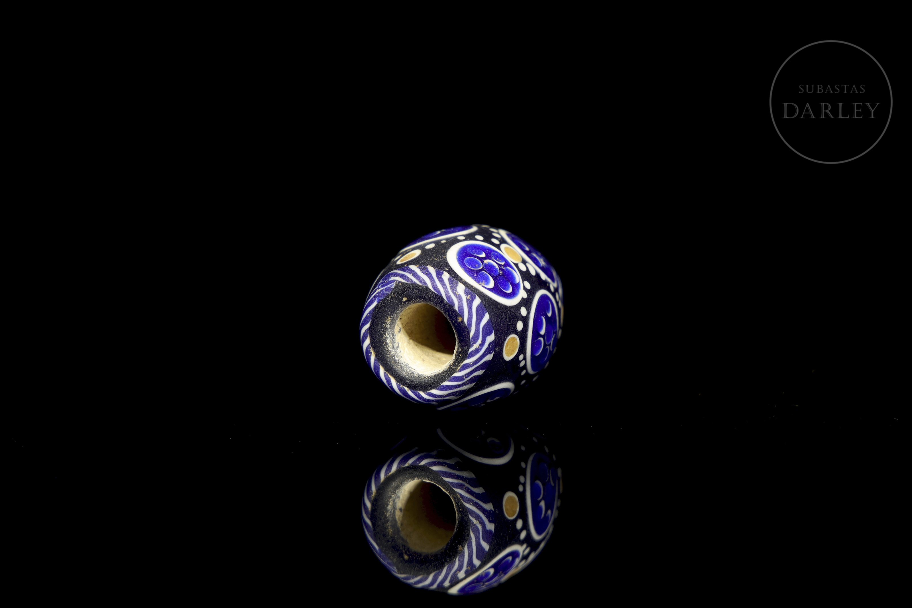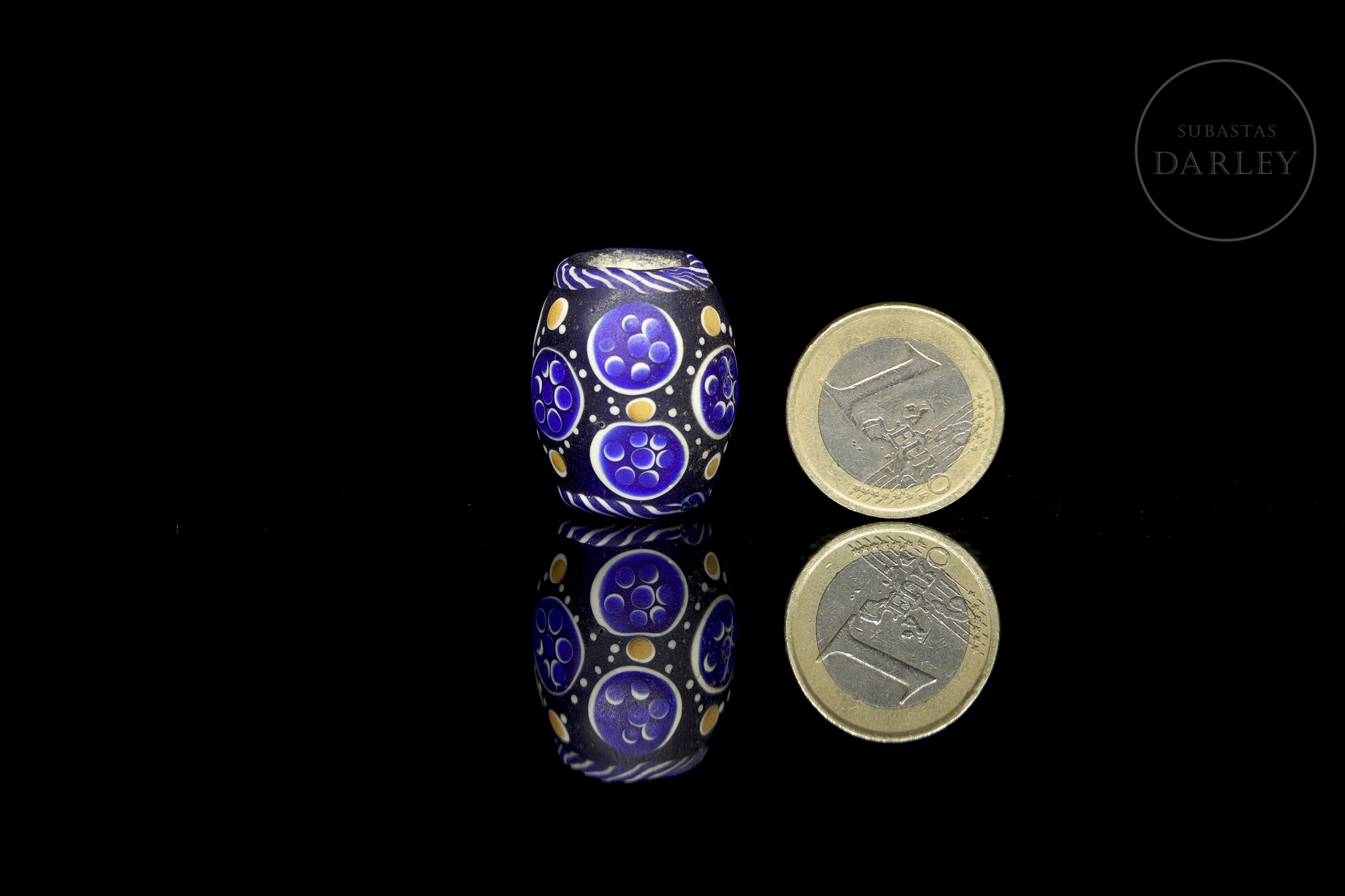 精美绝伦的椭圆形琉璃珠。其底色为浓郁的钴蓝色,饰以花卉纹样,引人注目。每朵花都以优雅的扇形线条和黄色水滴点缀。珠端以蓝白相间的编织带收尾。唐代。因年代久远而呈现包浆。唐代(公元618-906年)。