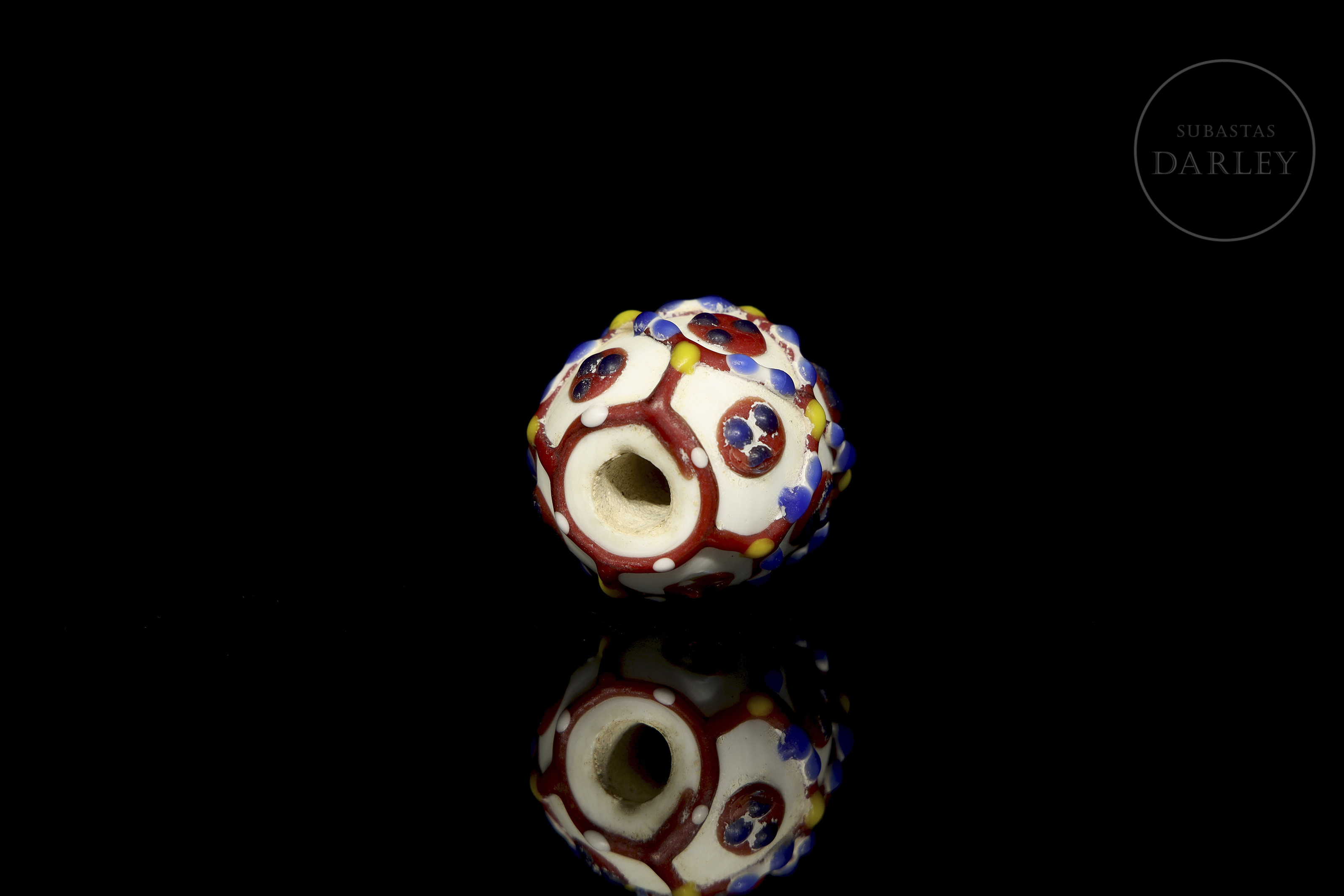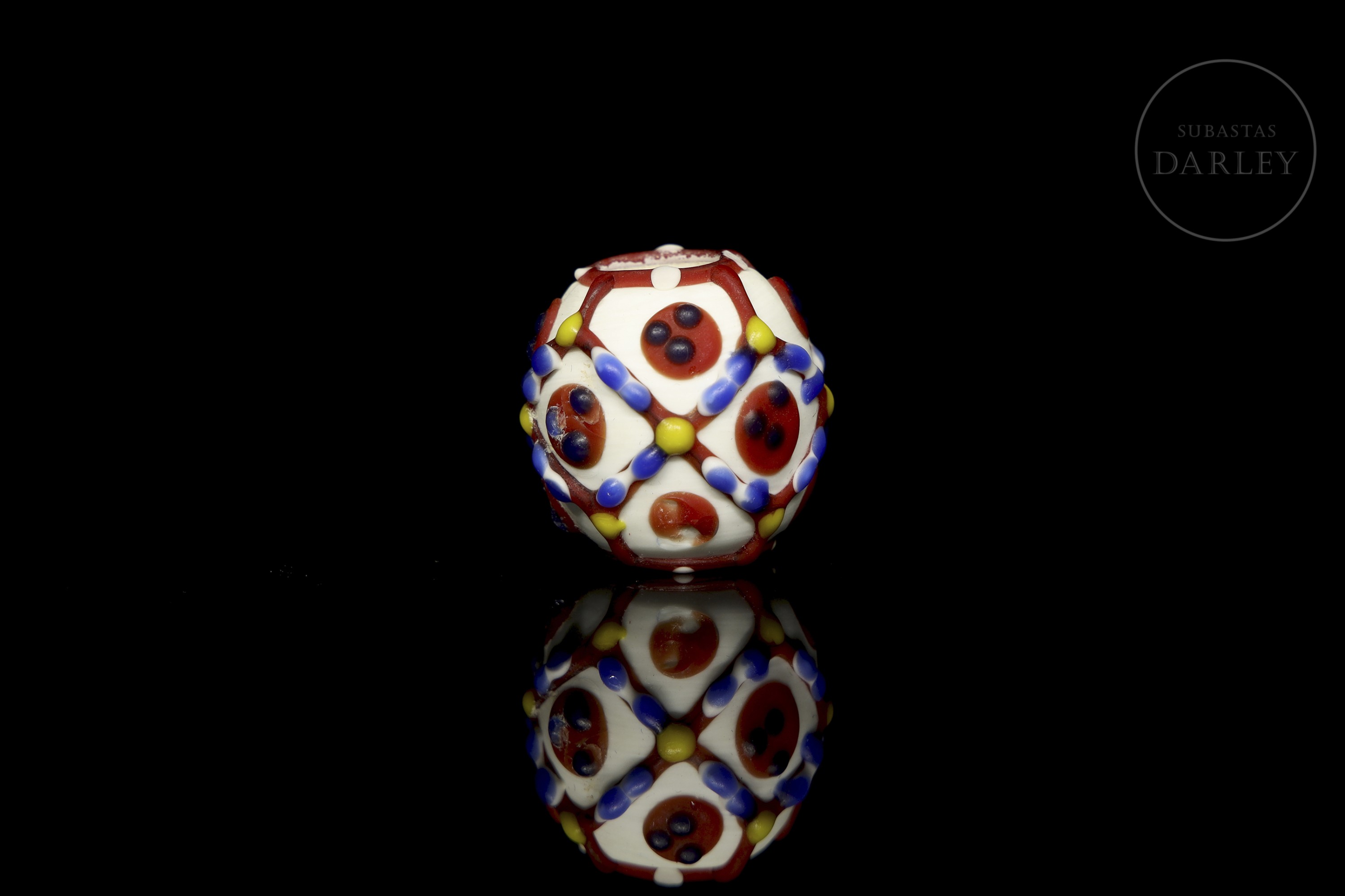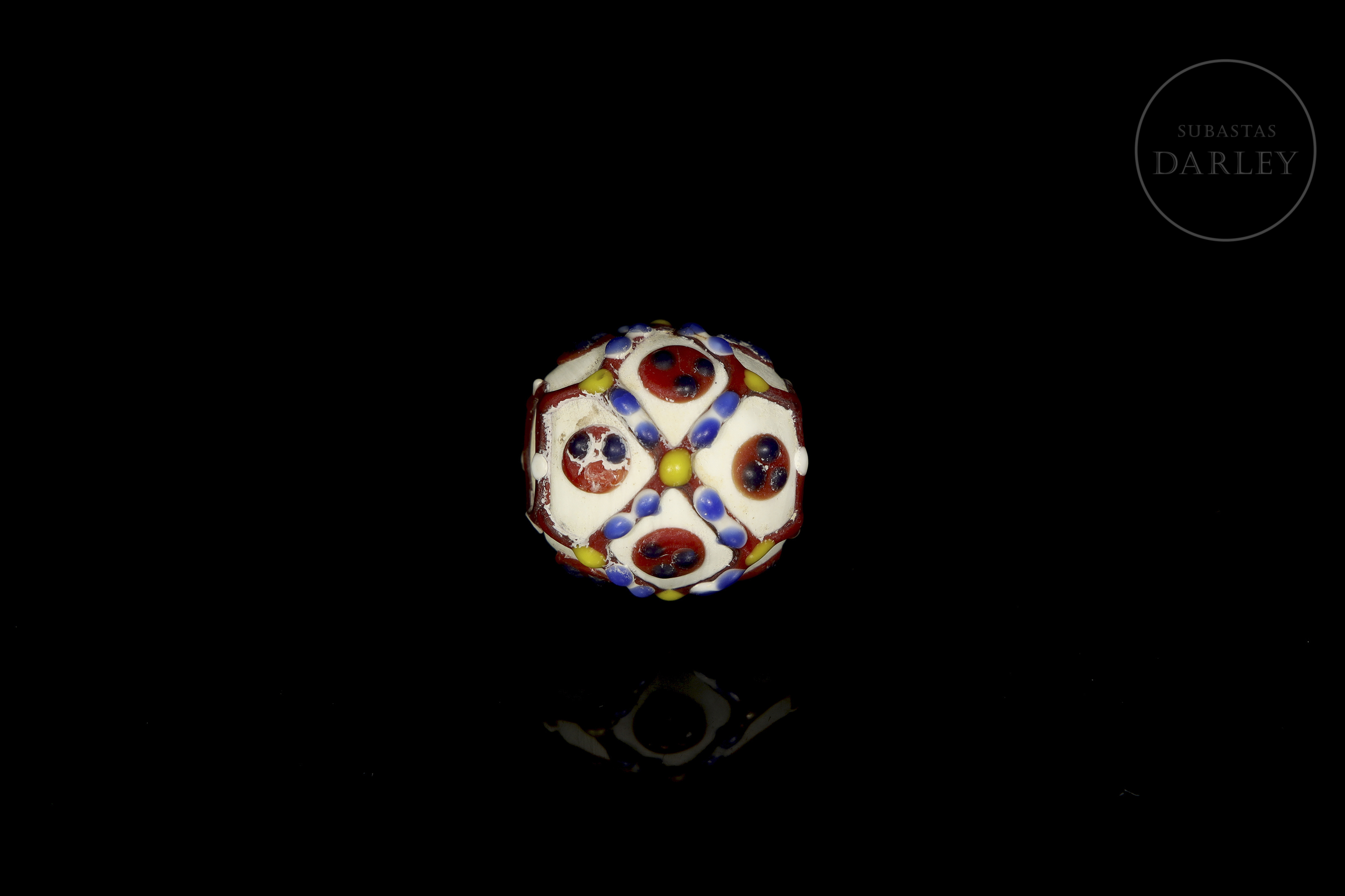 一颗底色为白色、不透明的球形珠子,饰有色彩鲜艳的“眼睛”图案,图案由红色网格环绕着带有红色瞳孔的蓝色圆圈组成。网格上点缀着黄色和蓝色圆点,更添精致。珠子因年代久远而呈现出包浆和磨损痕迹。唐代(公元618-906年)