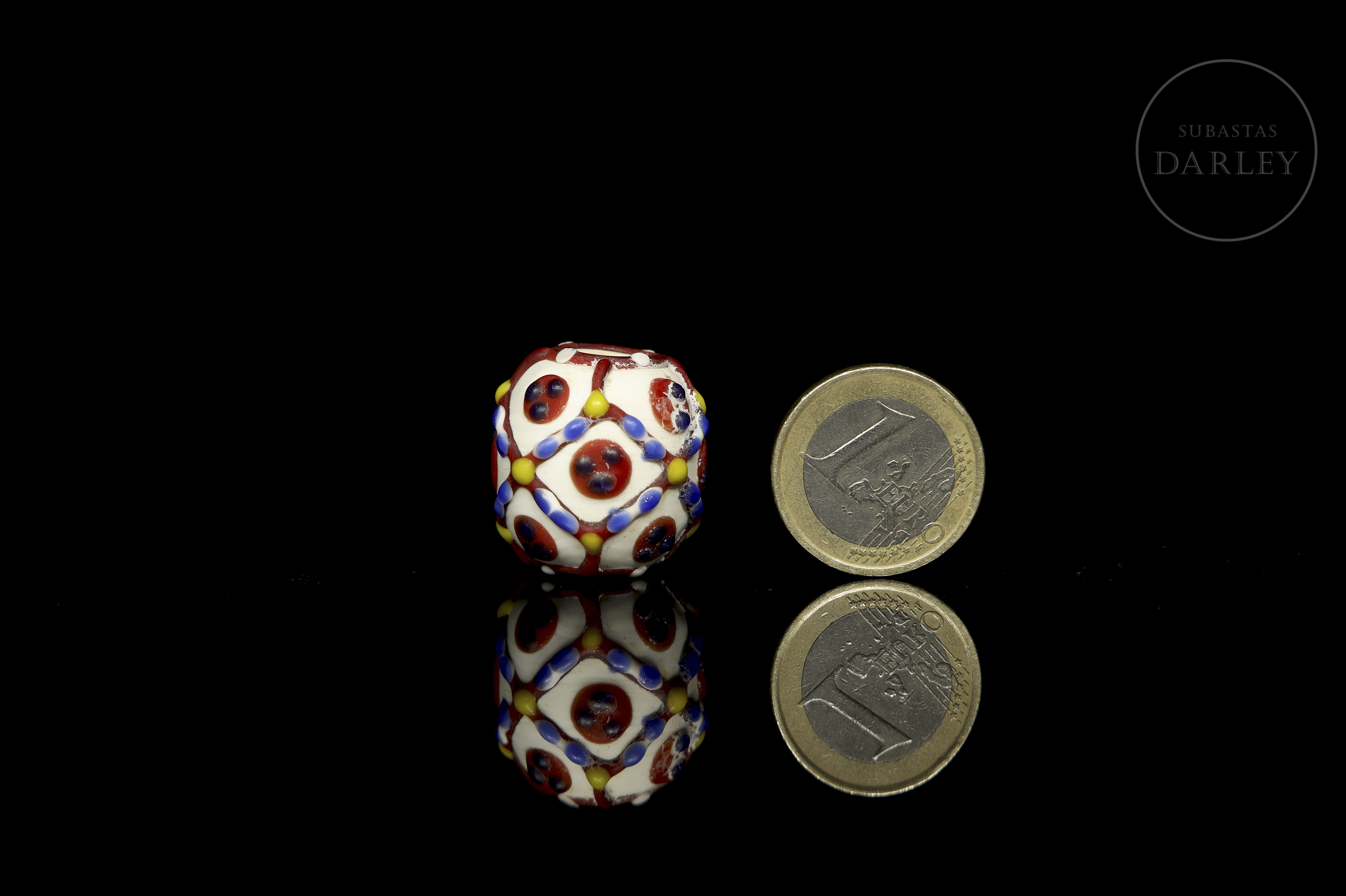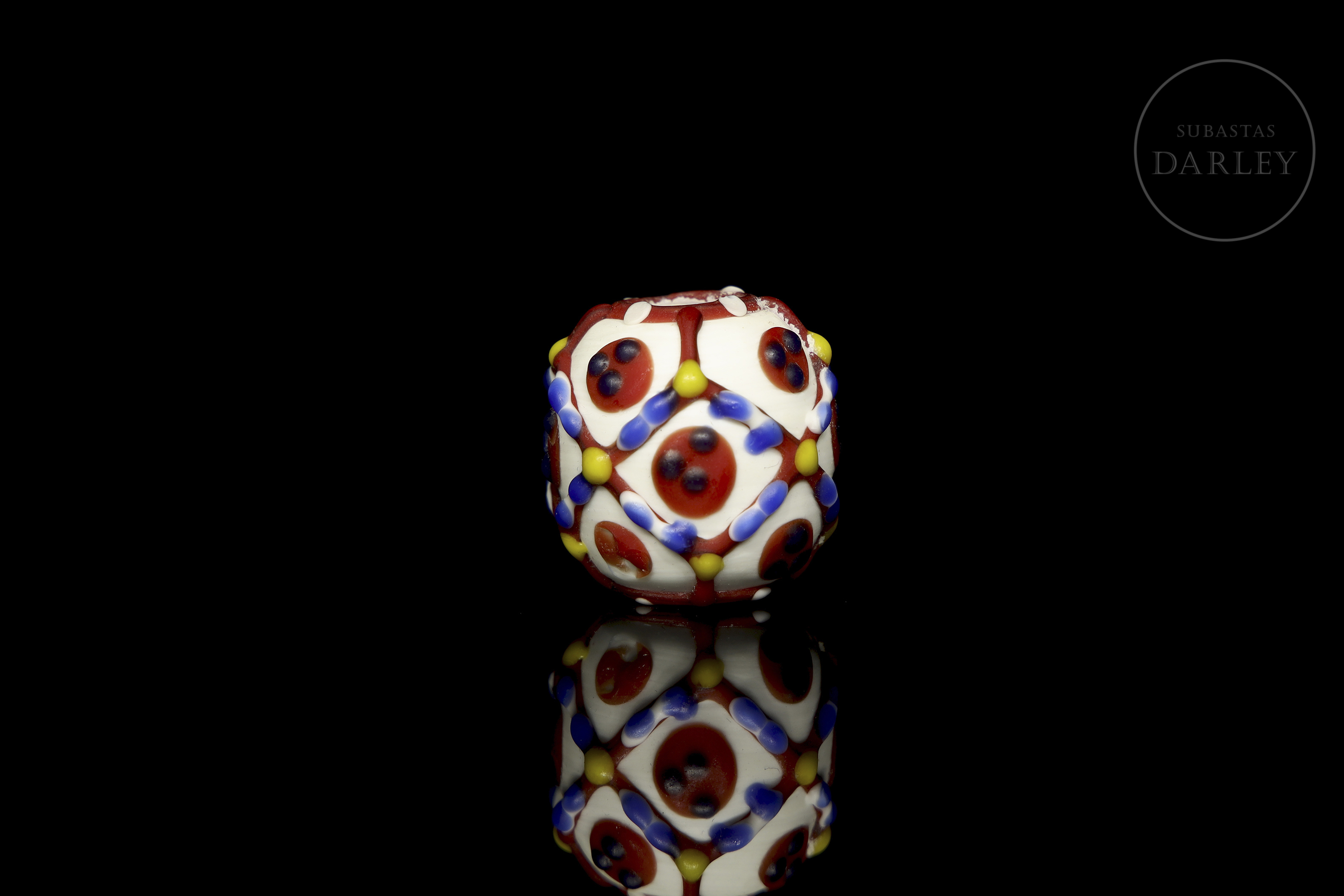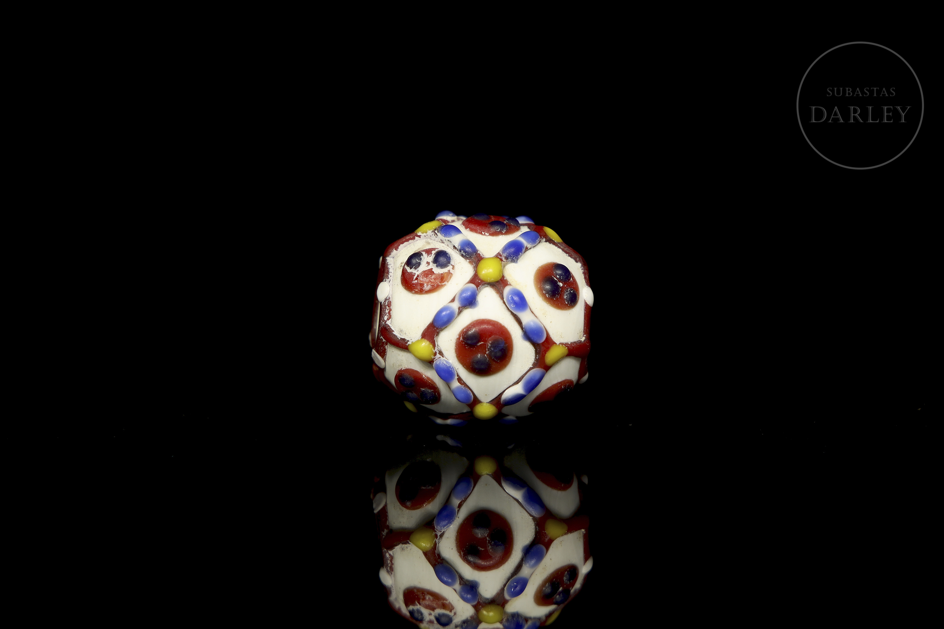 一颗底色为白色、不透明的球形珠子,饰有色彩鲜艳的“眼睛”图案,图案由红色网格环绕着带有红色瞳孔的蓝色圆圈组成。网格上点缀着黄色和蓝色圆点,更添精致。珠子因年代久远而呈现出包浆和磨损痕迹。唐代(公元618-906年)