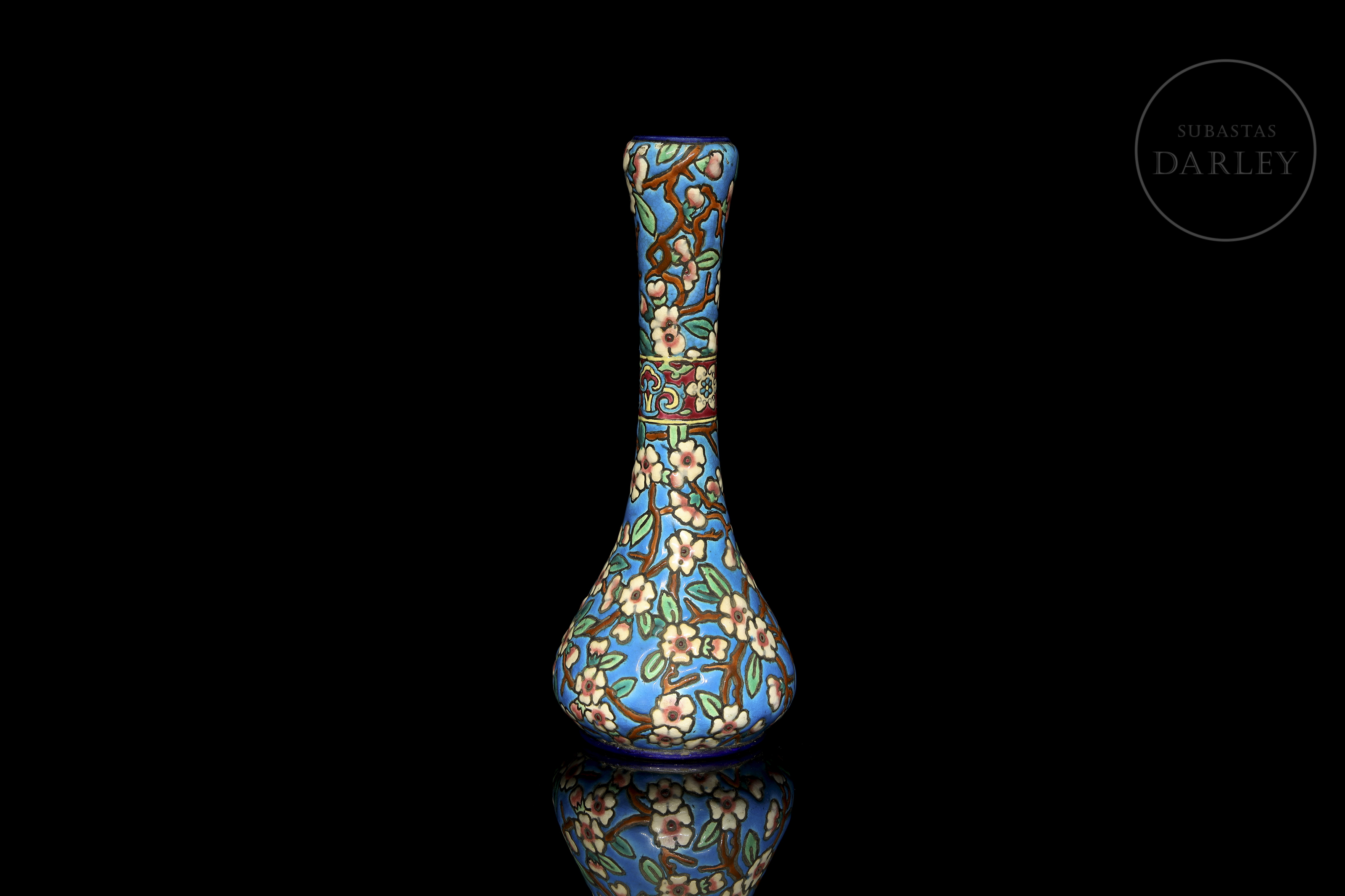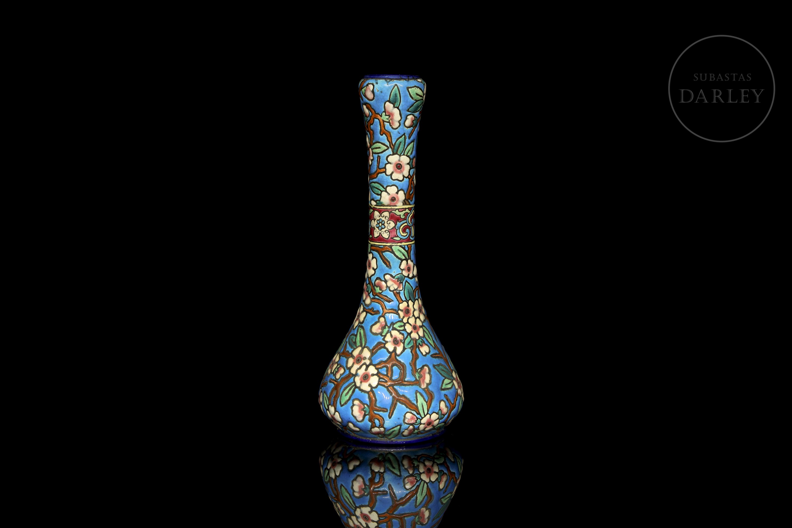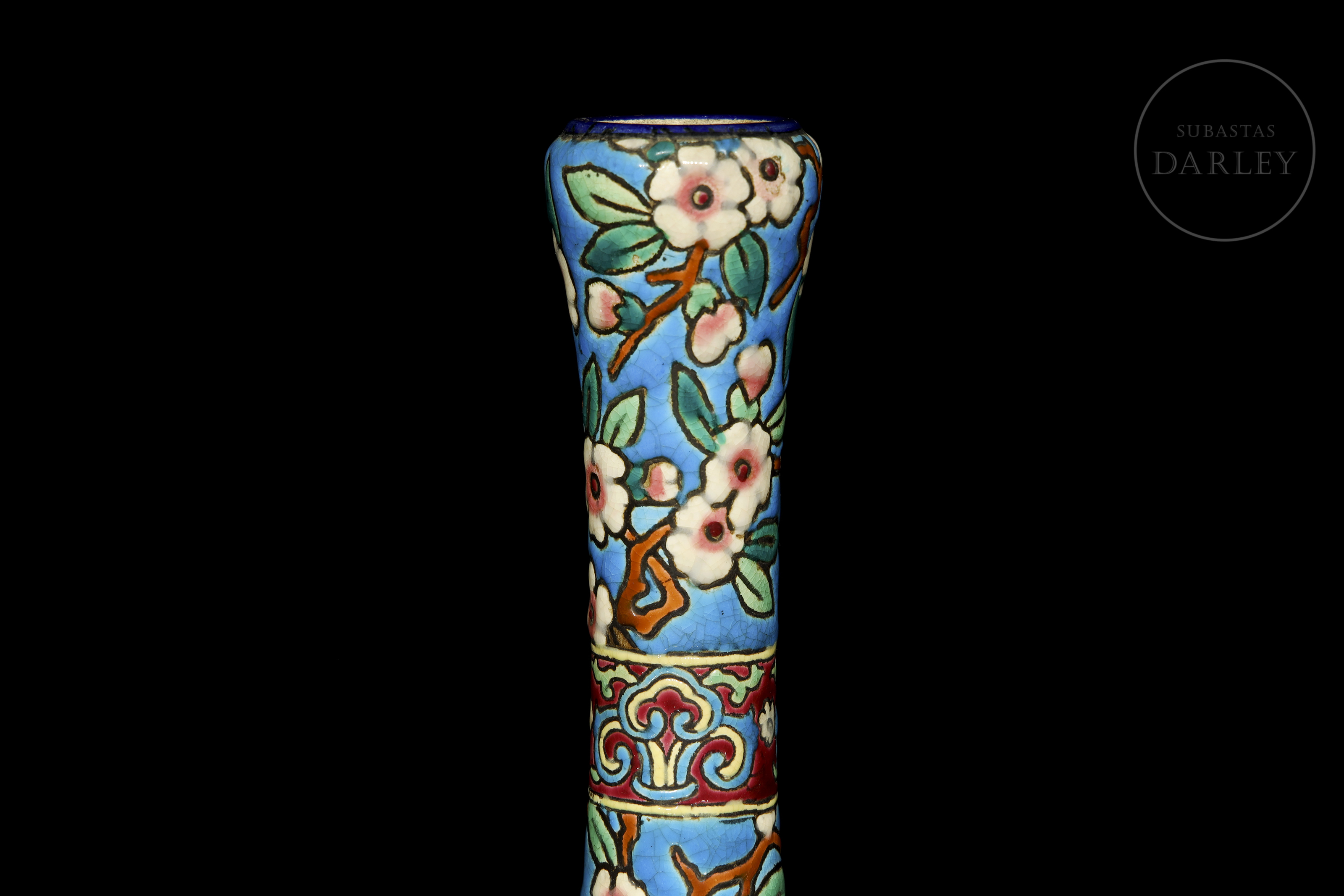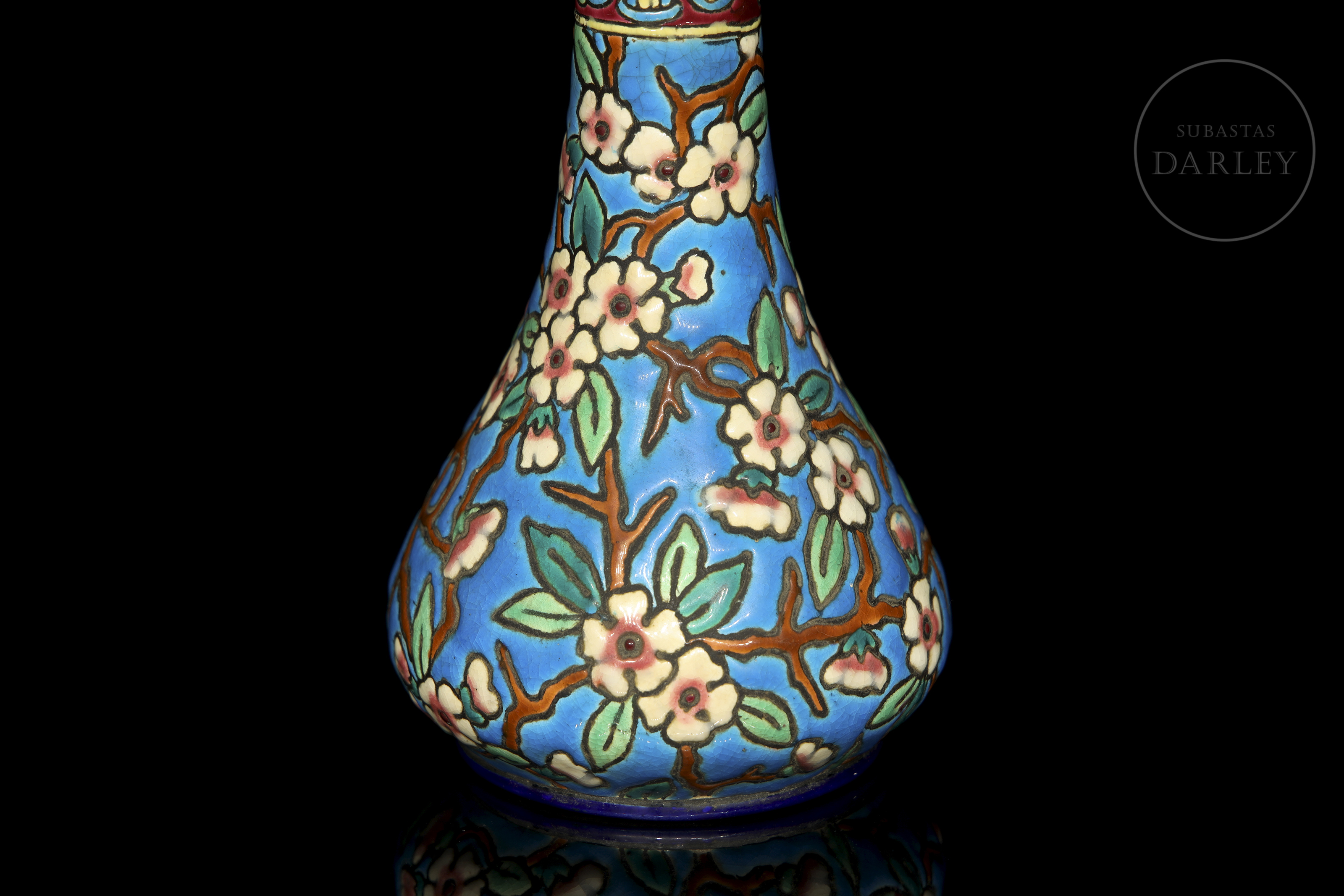 Pear-shaped vase with a tall neck, decorated in cloisonné-style enamel with flowering branches on a turquoise background. It features a central band with floral and geometric motifs in polychrome enamels. Manufacturer's mark on the base. Longwy - crown and coat of arms, 1934.