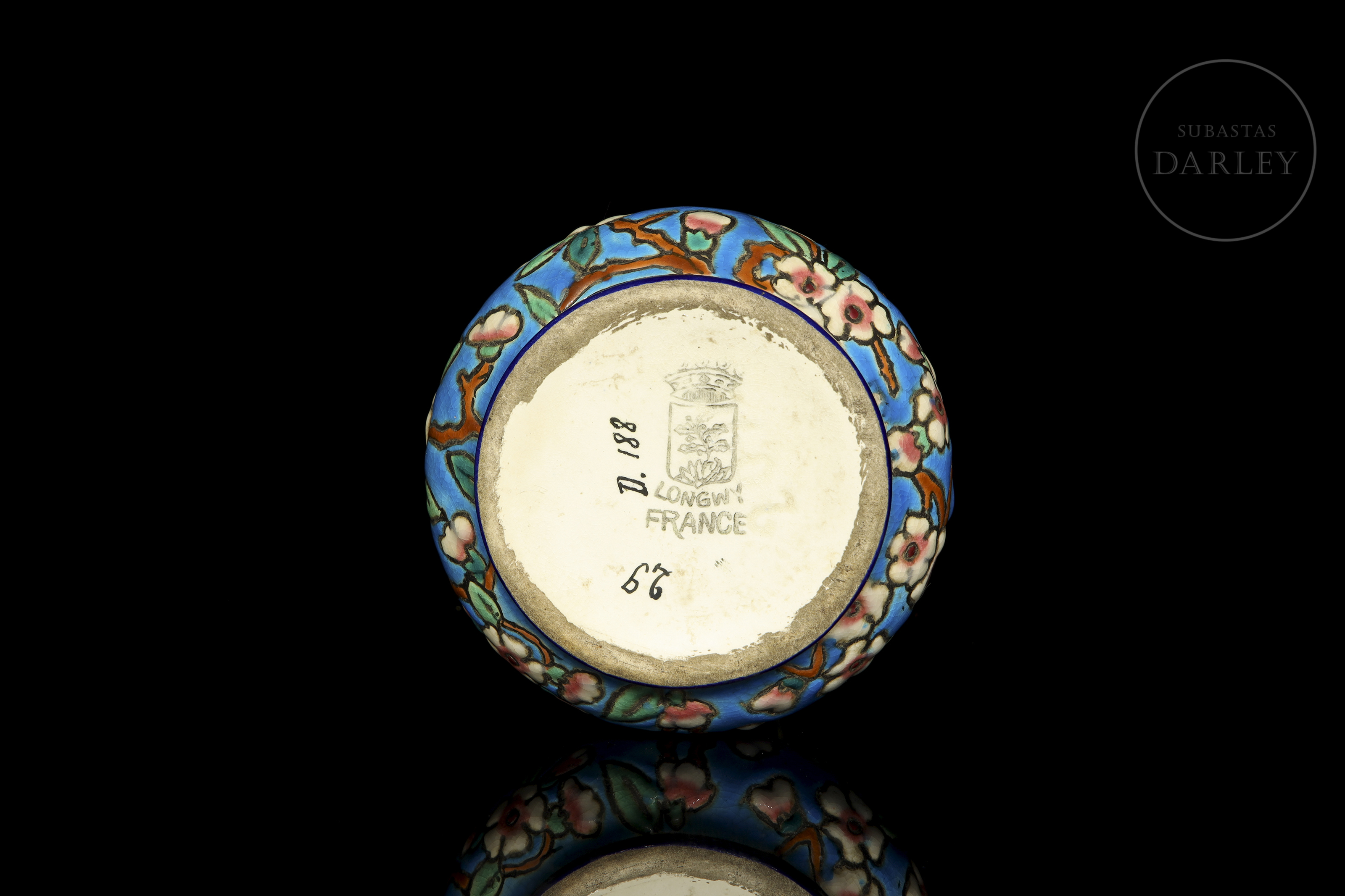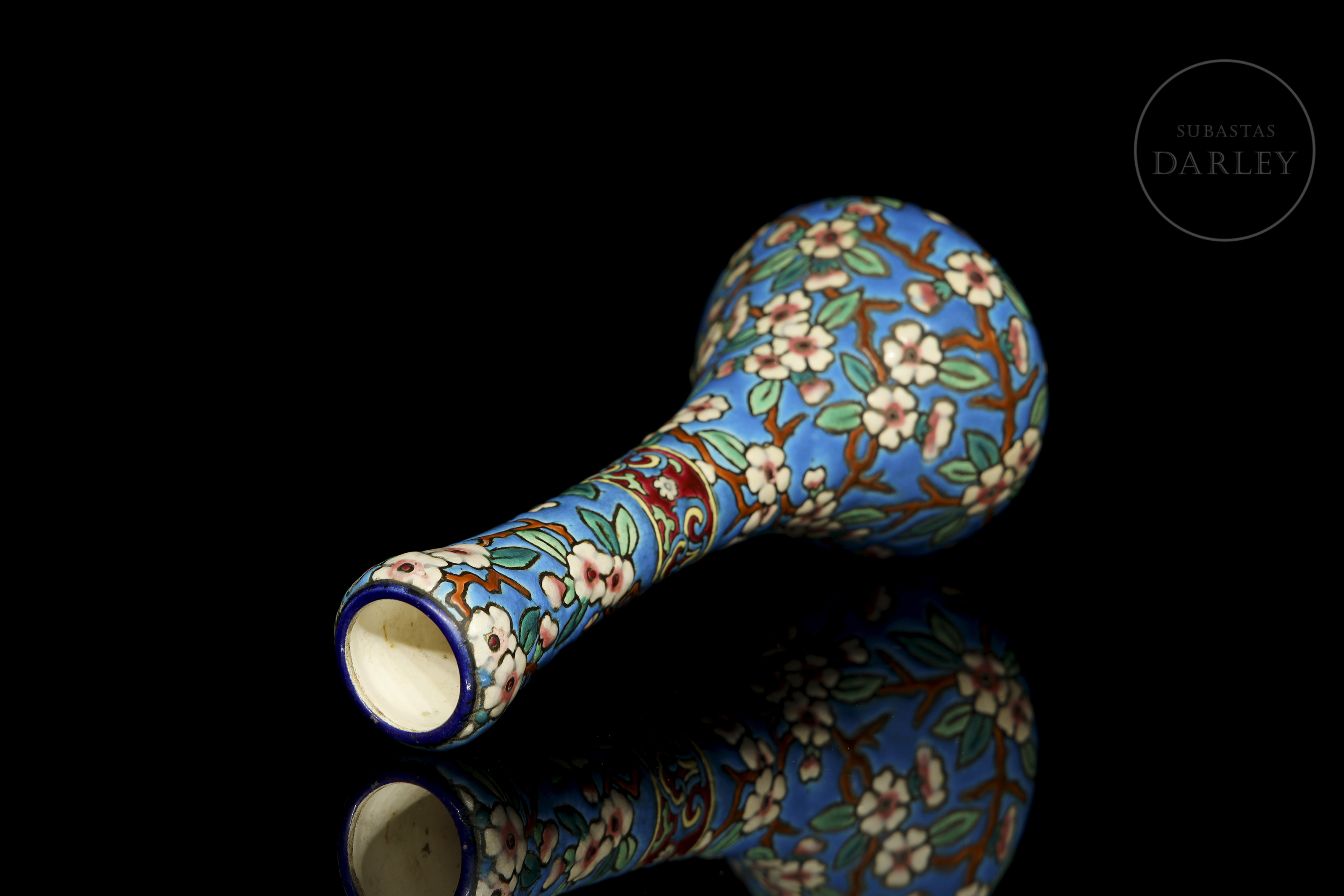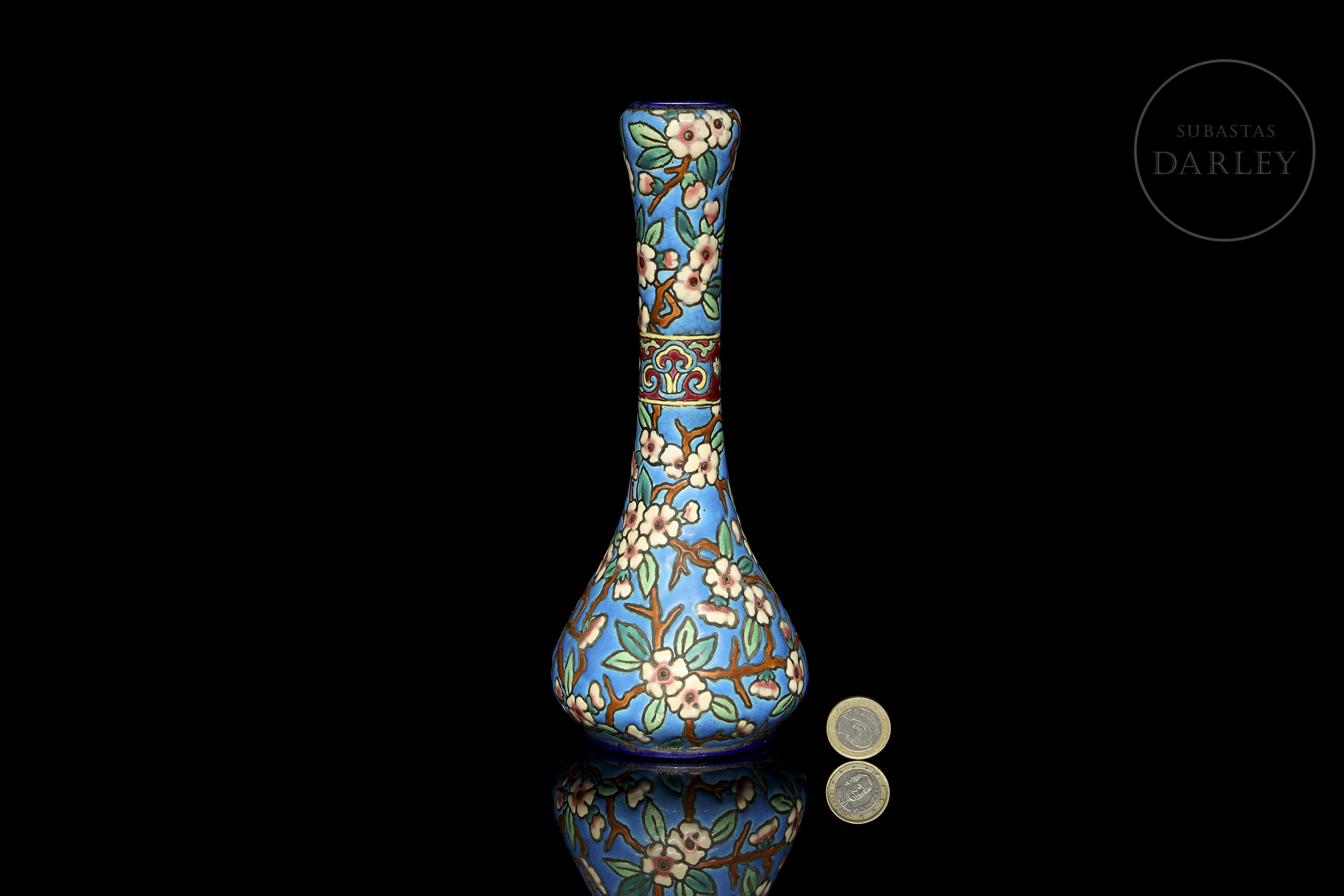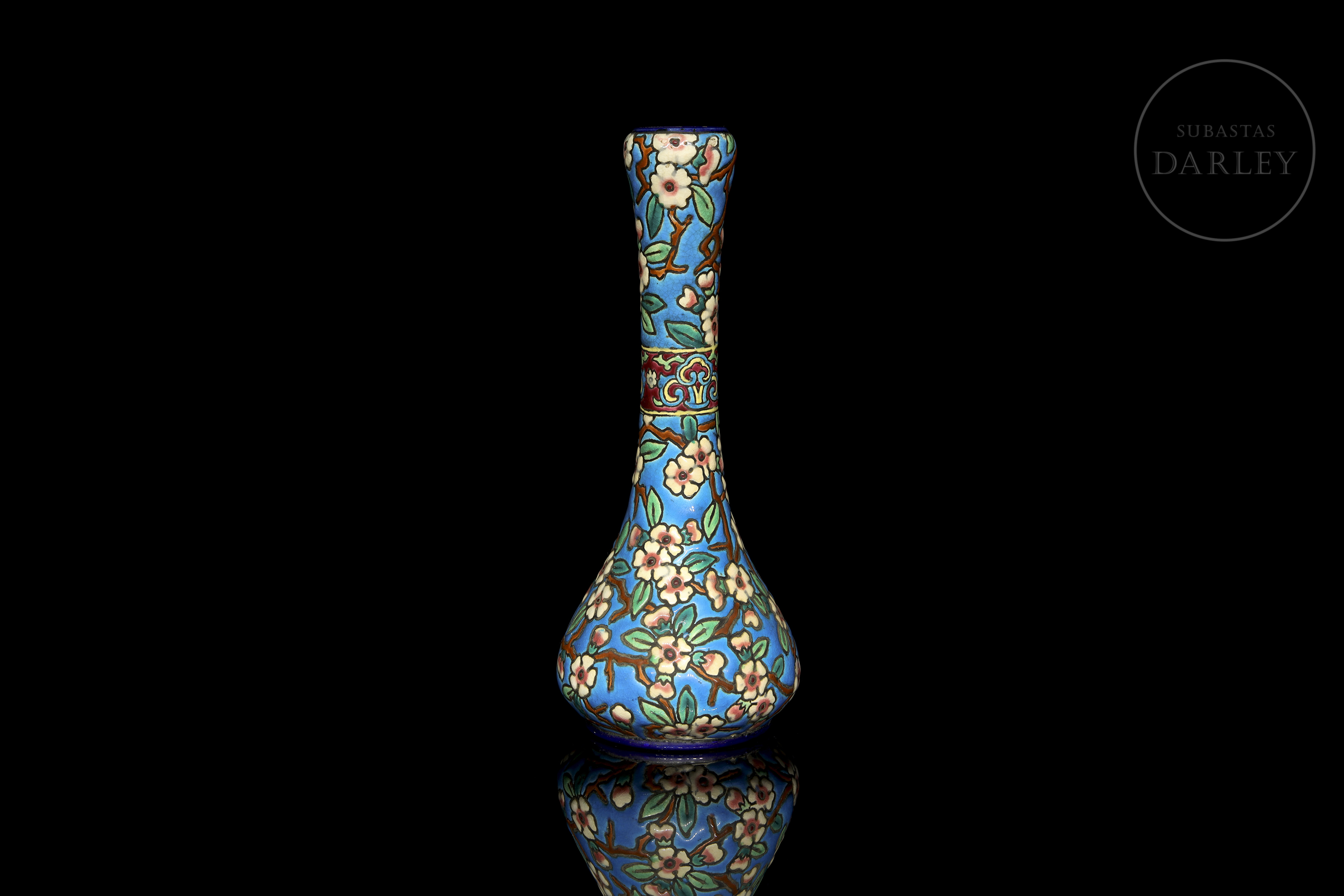 Pear-shaped vase with a tall neck, decorated in cloisonné-style enamel with flowering branches on a turquoise background. It features a central band with floral and geometric motifs in polychrome enamels. Manufacturer's mark on the base. Longwy - crown and coat of arms, 1934.