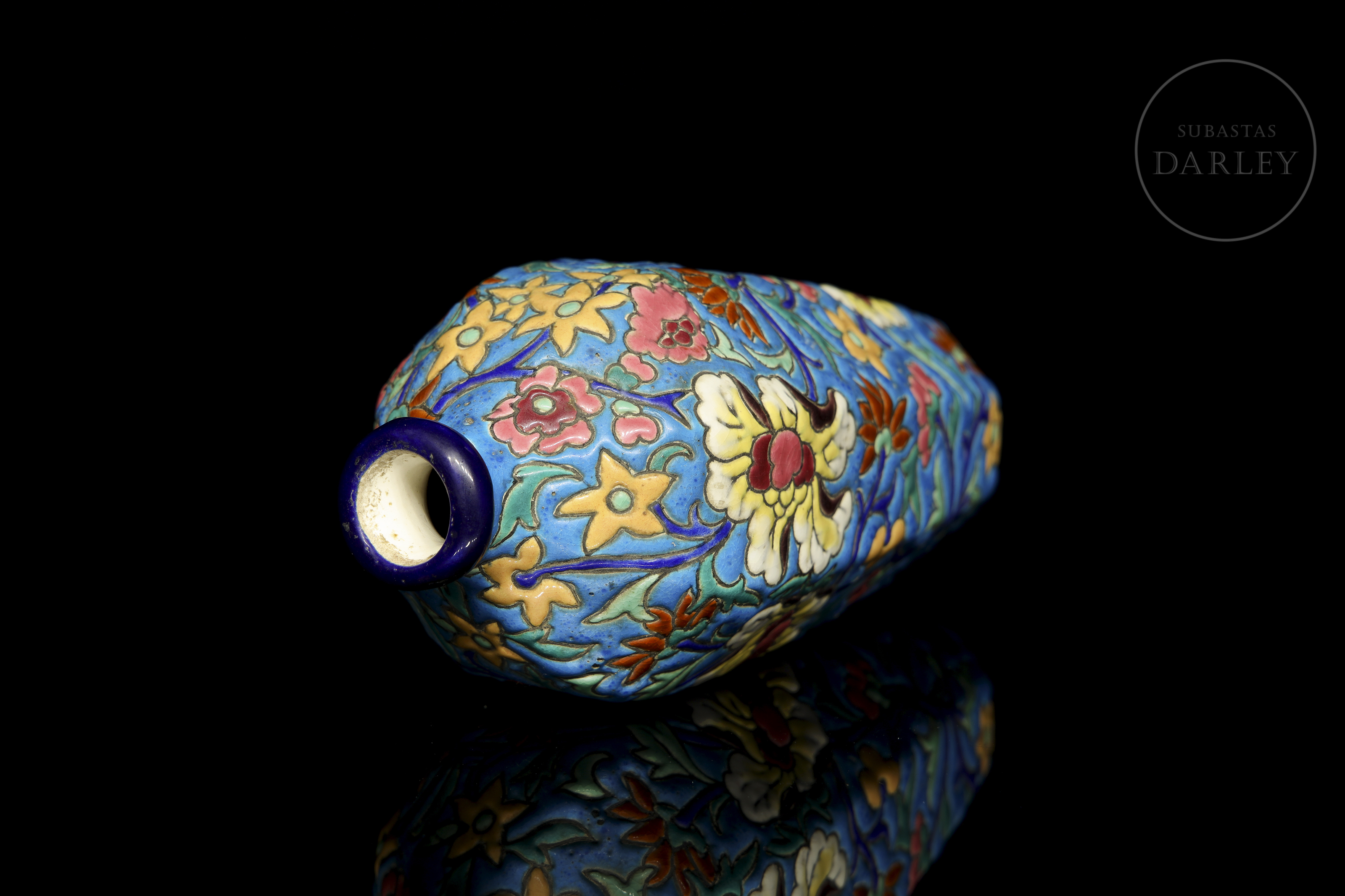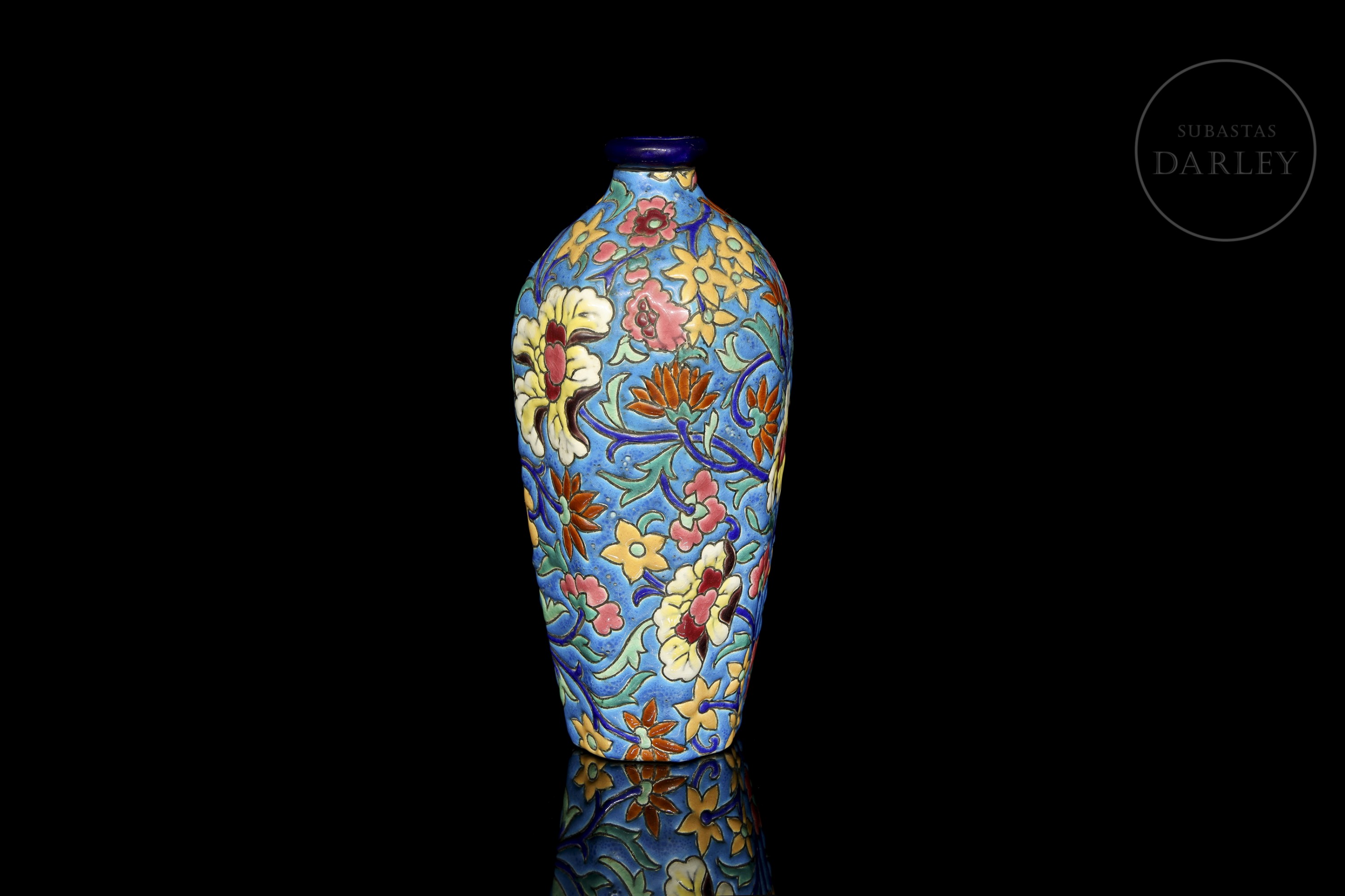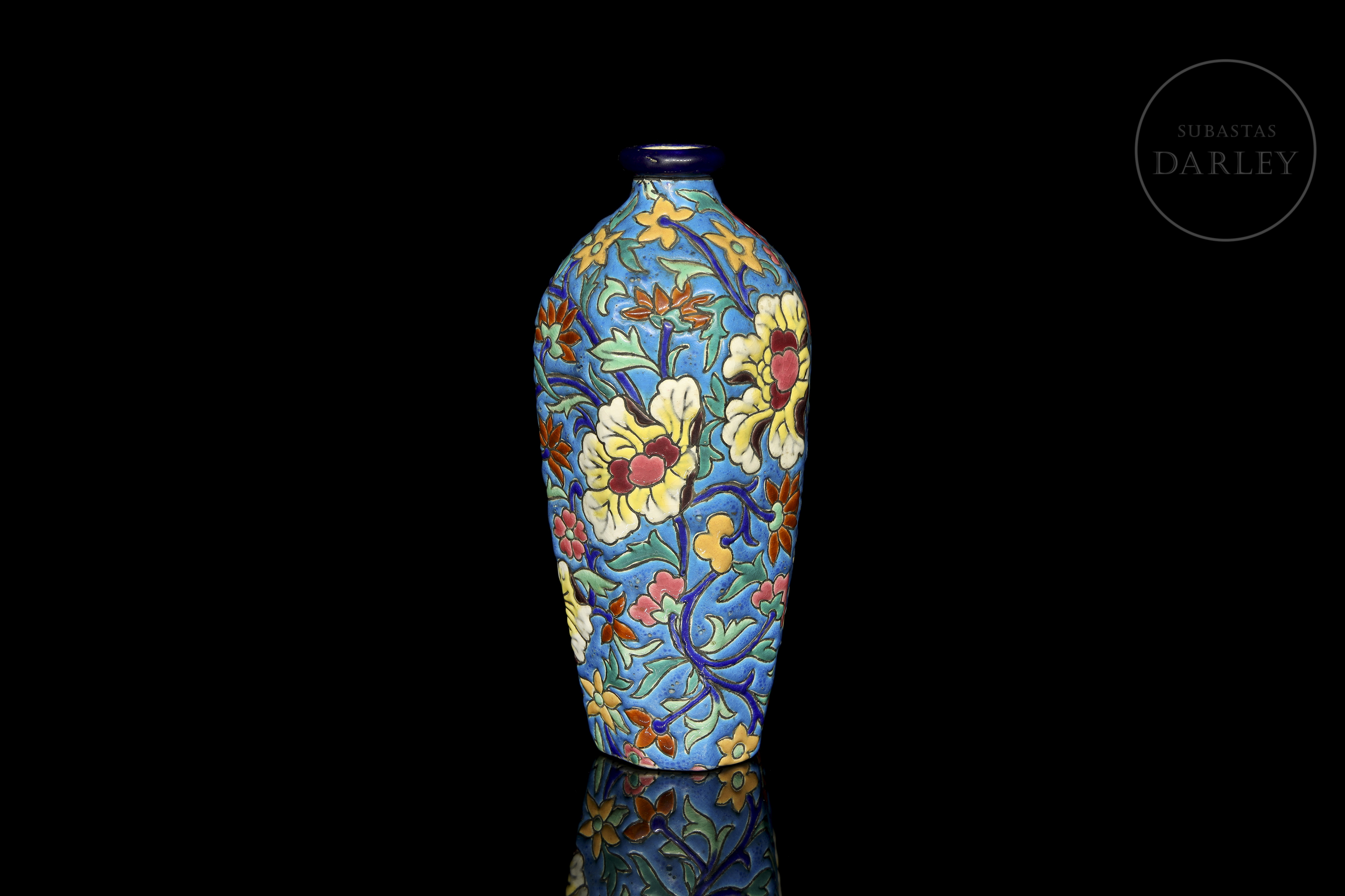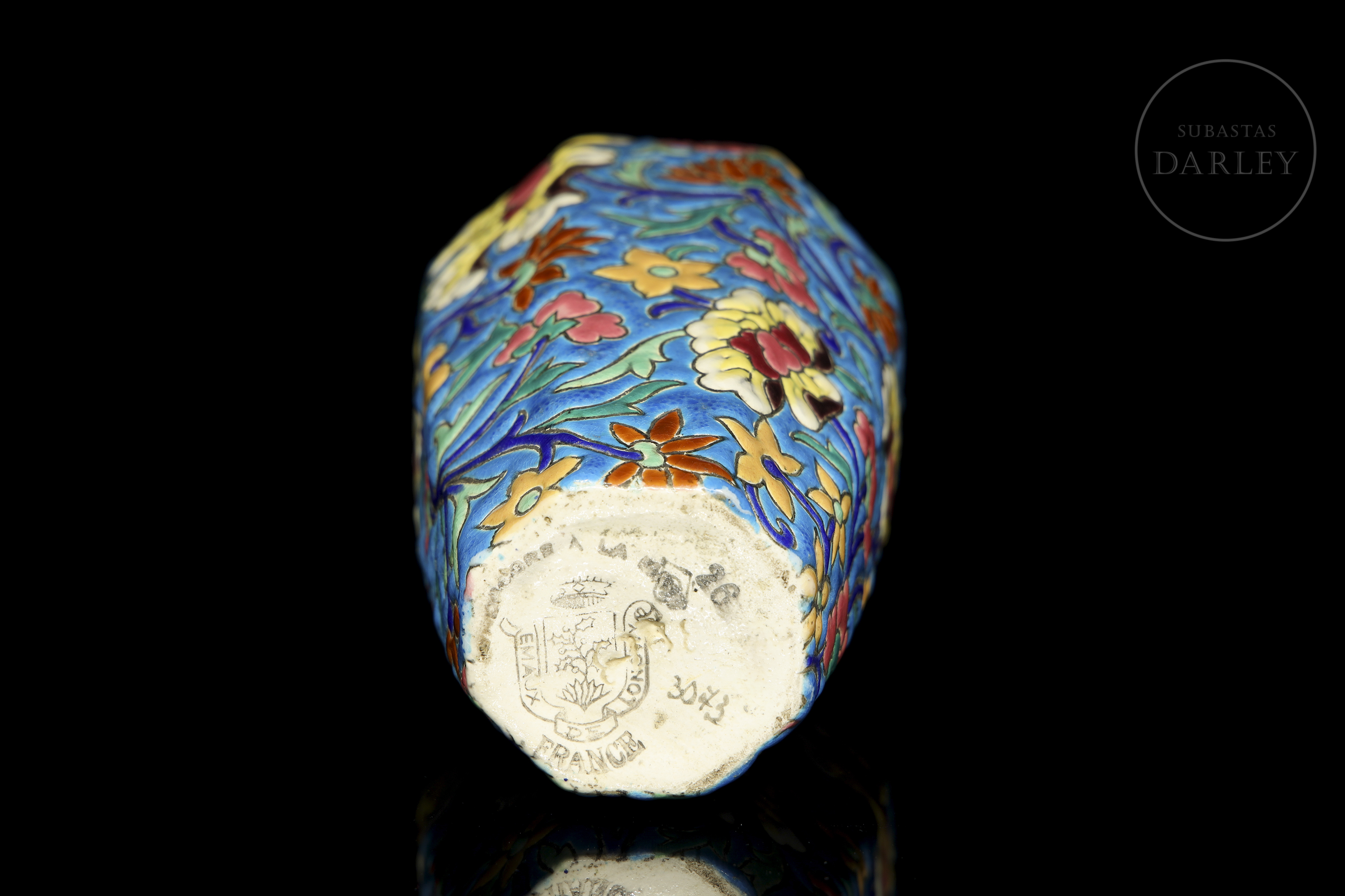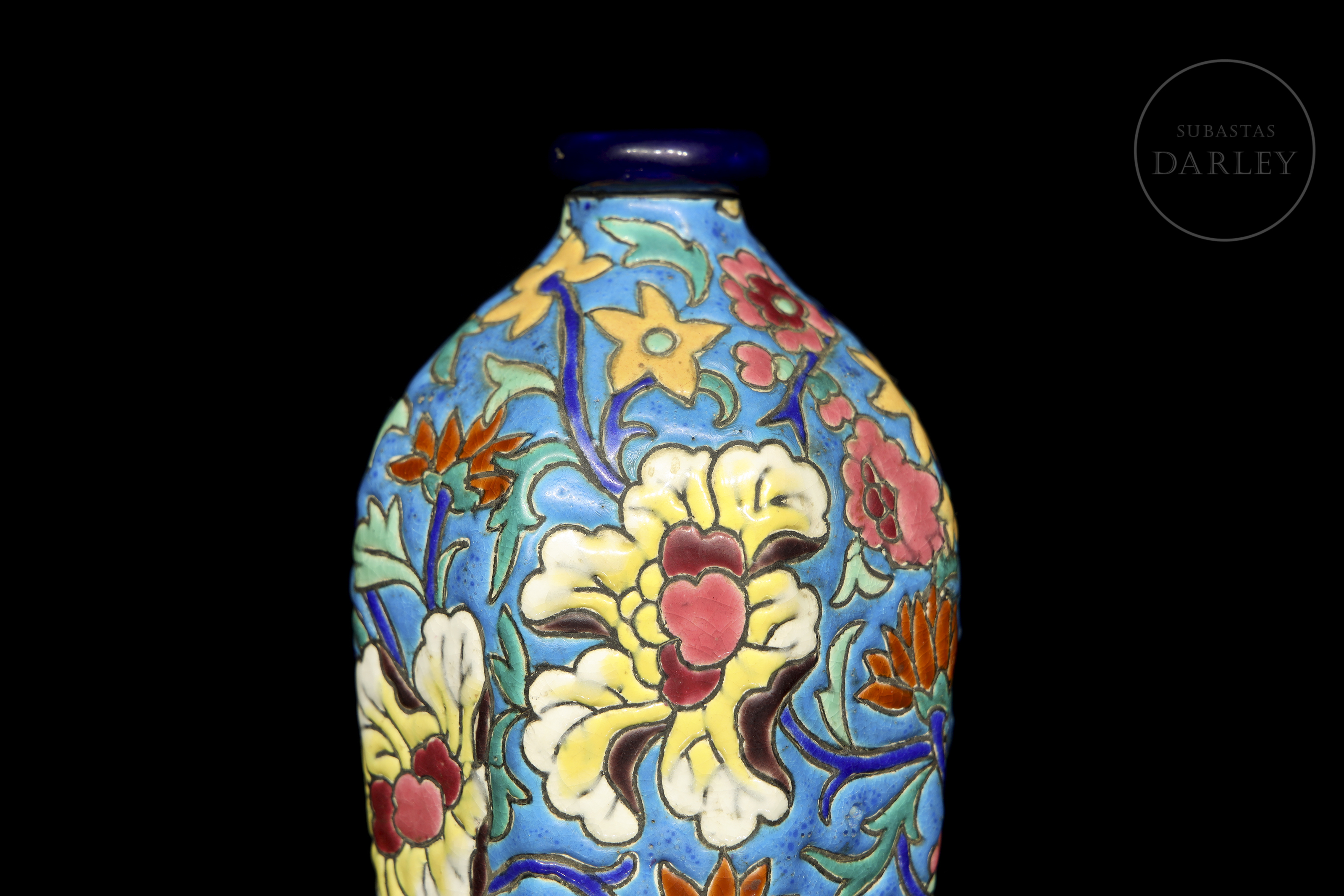 Ovoid vase with a short neck, decorated in polychrome cloisonné enamel with floral motifs on a turquoise blue background. Manufacturer's mark on the base: ‘Émaux de Longwy – France’ next to the number 3073.