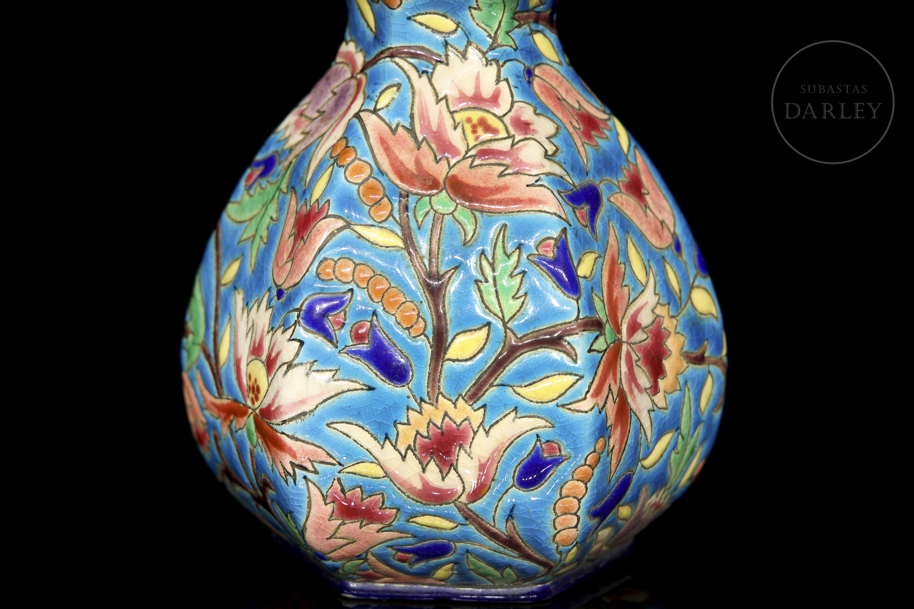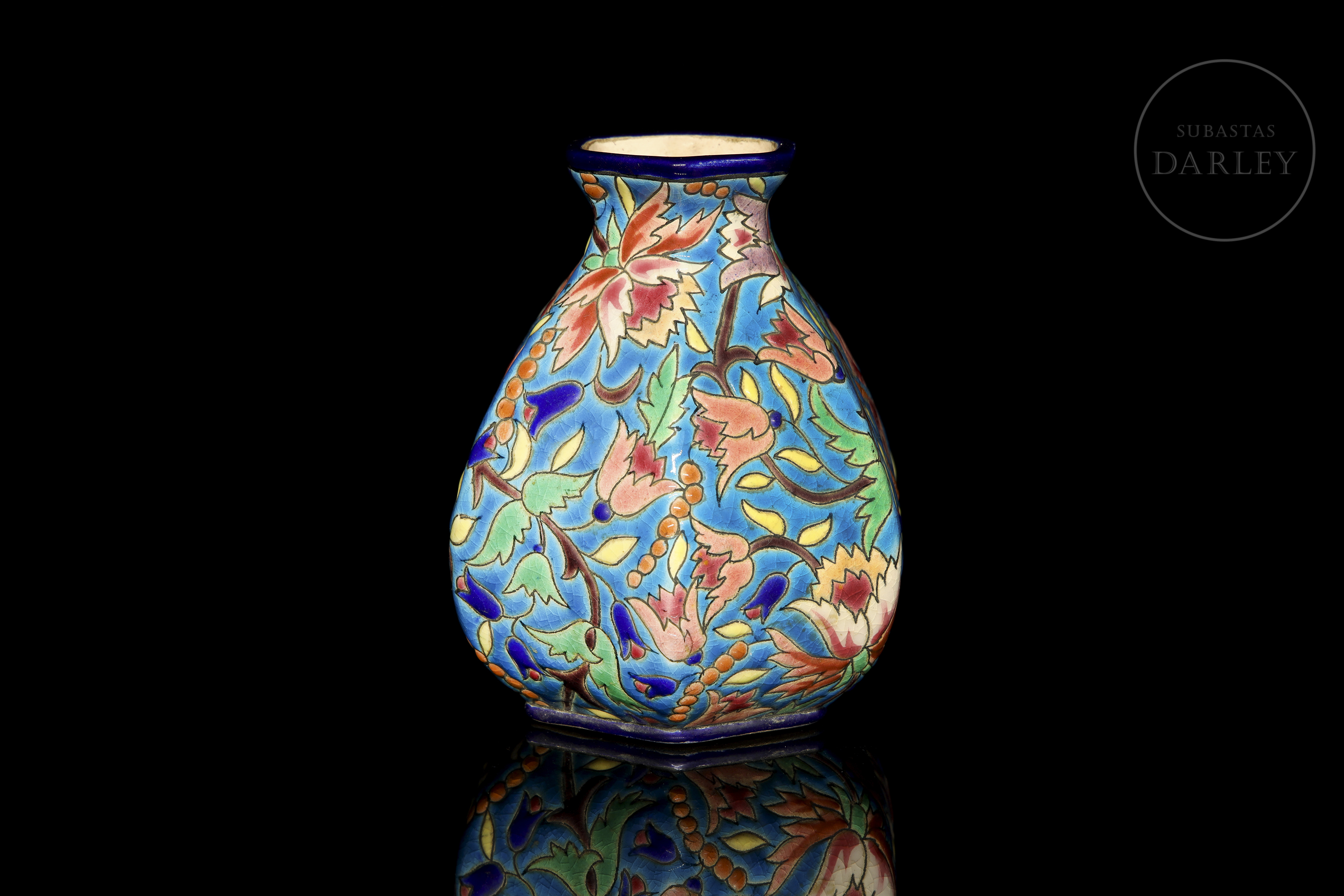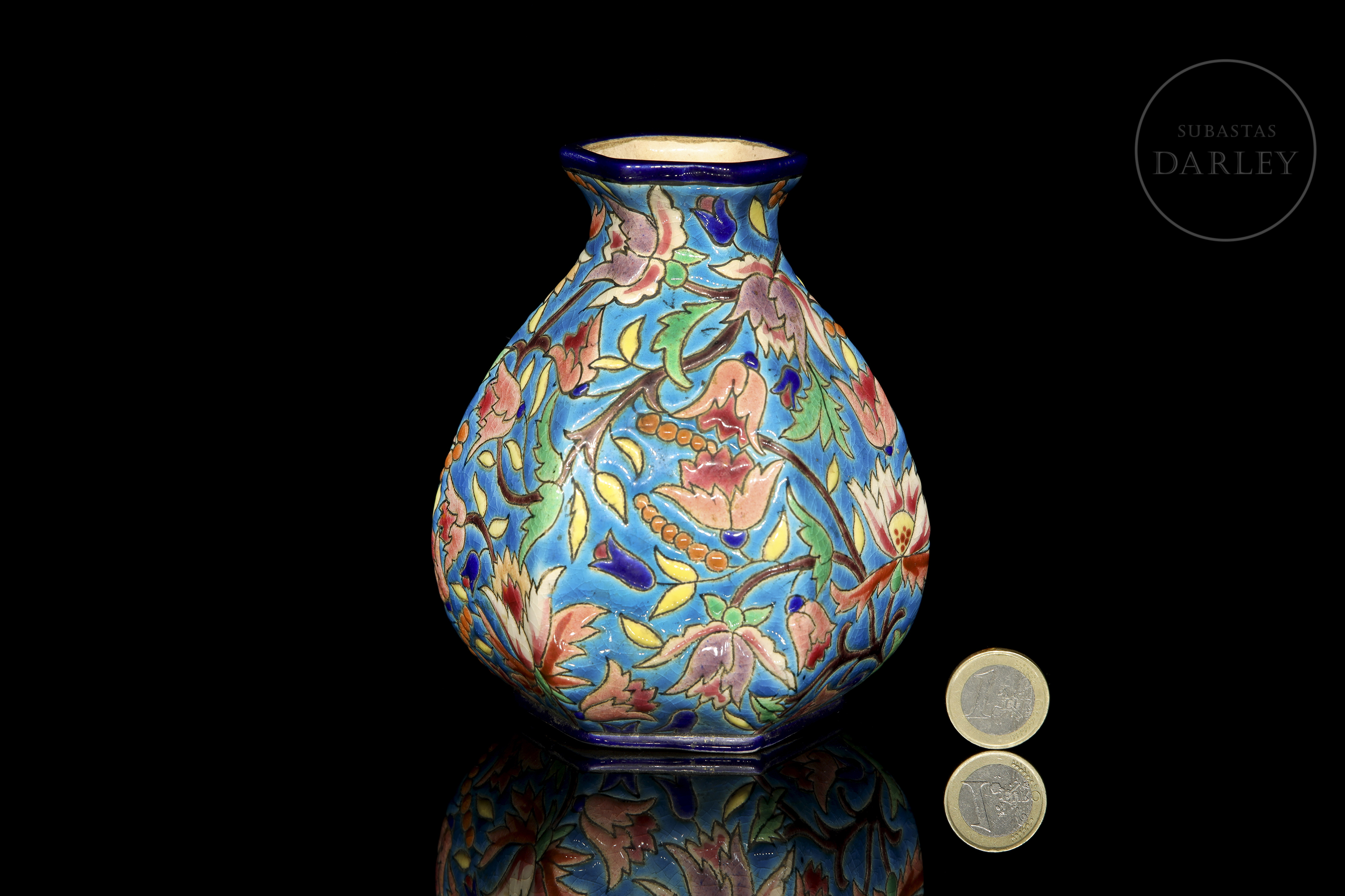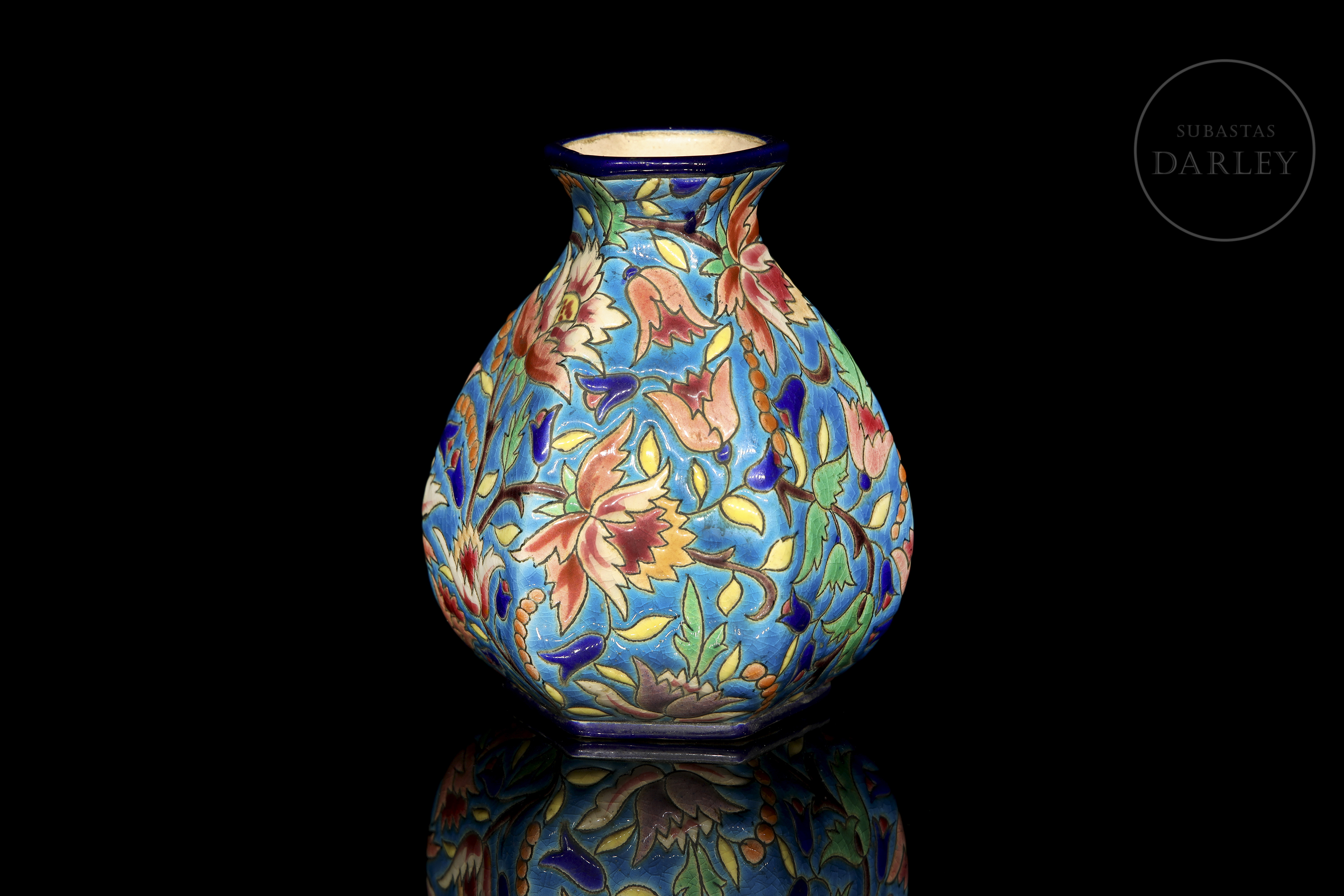 Hexagonal vase with lobed mouth, decorated with polychrome cloisonné enamels depicting flowers and branches on a turquoise blue background. Manufacturer's mark on the base: ‘Émaux de Longwy – France – Peint à la main’. France, first half of the 20th century. Reference number 5685.