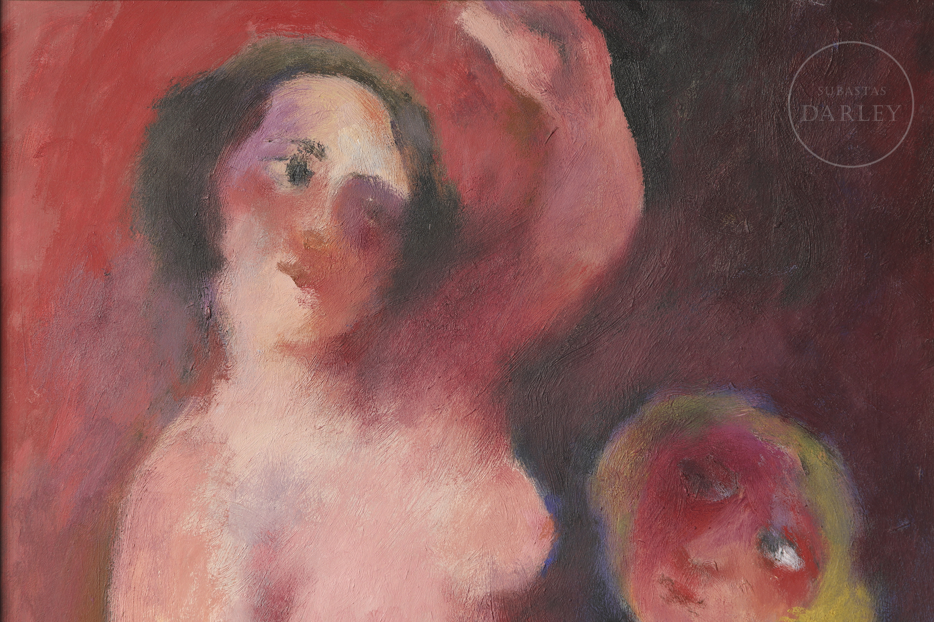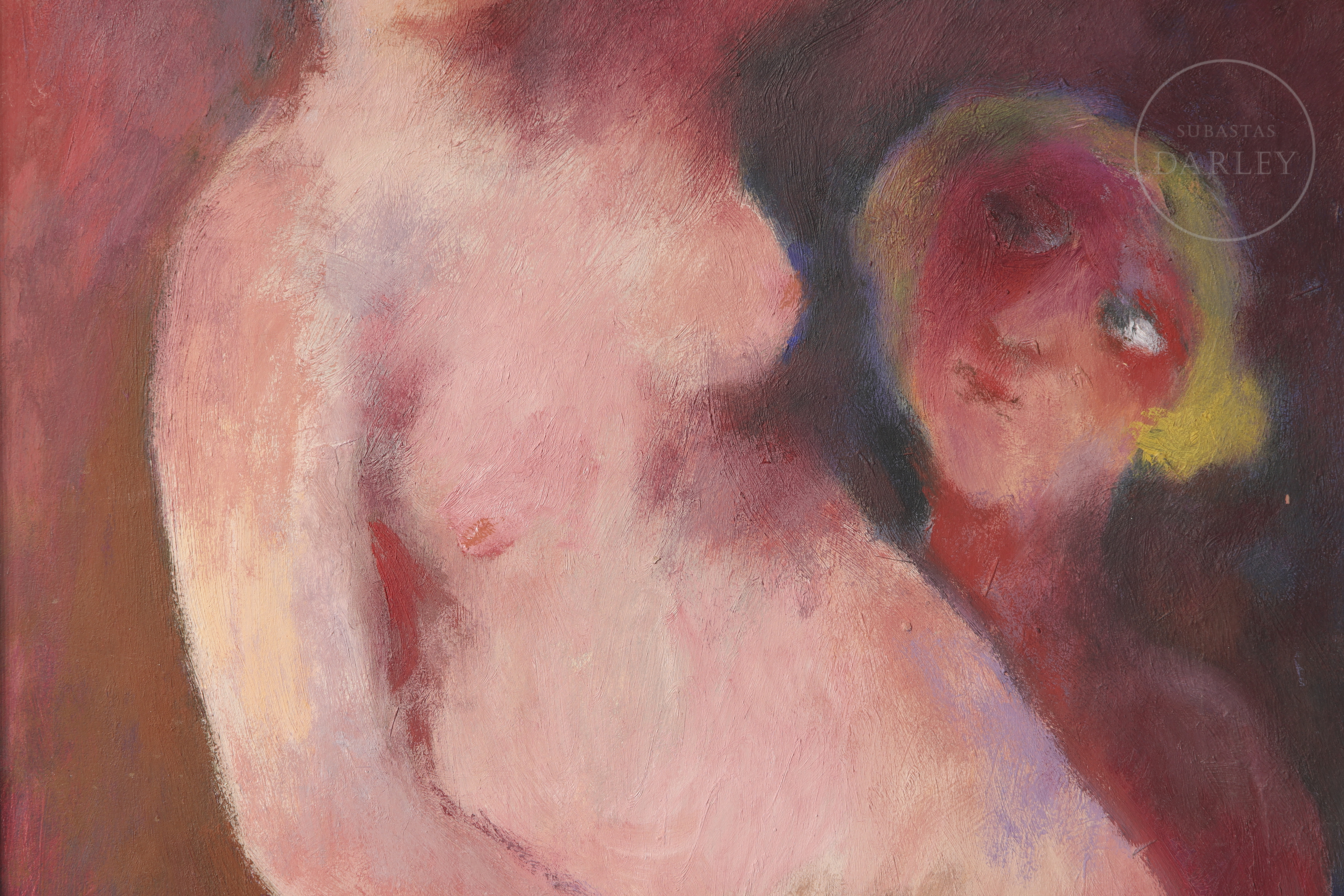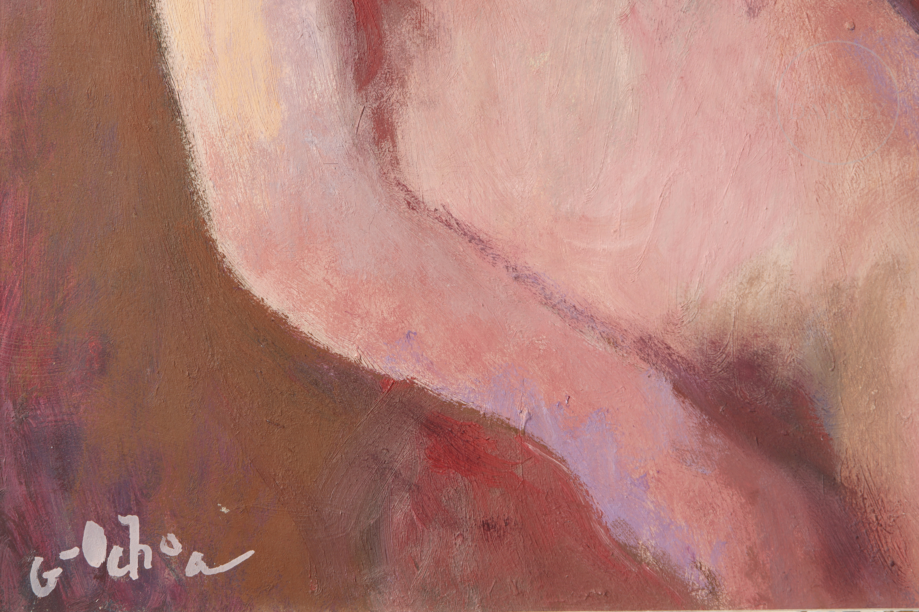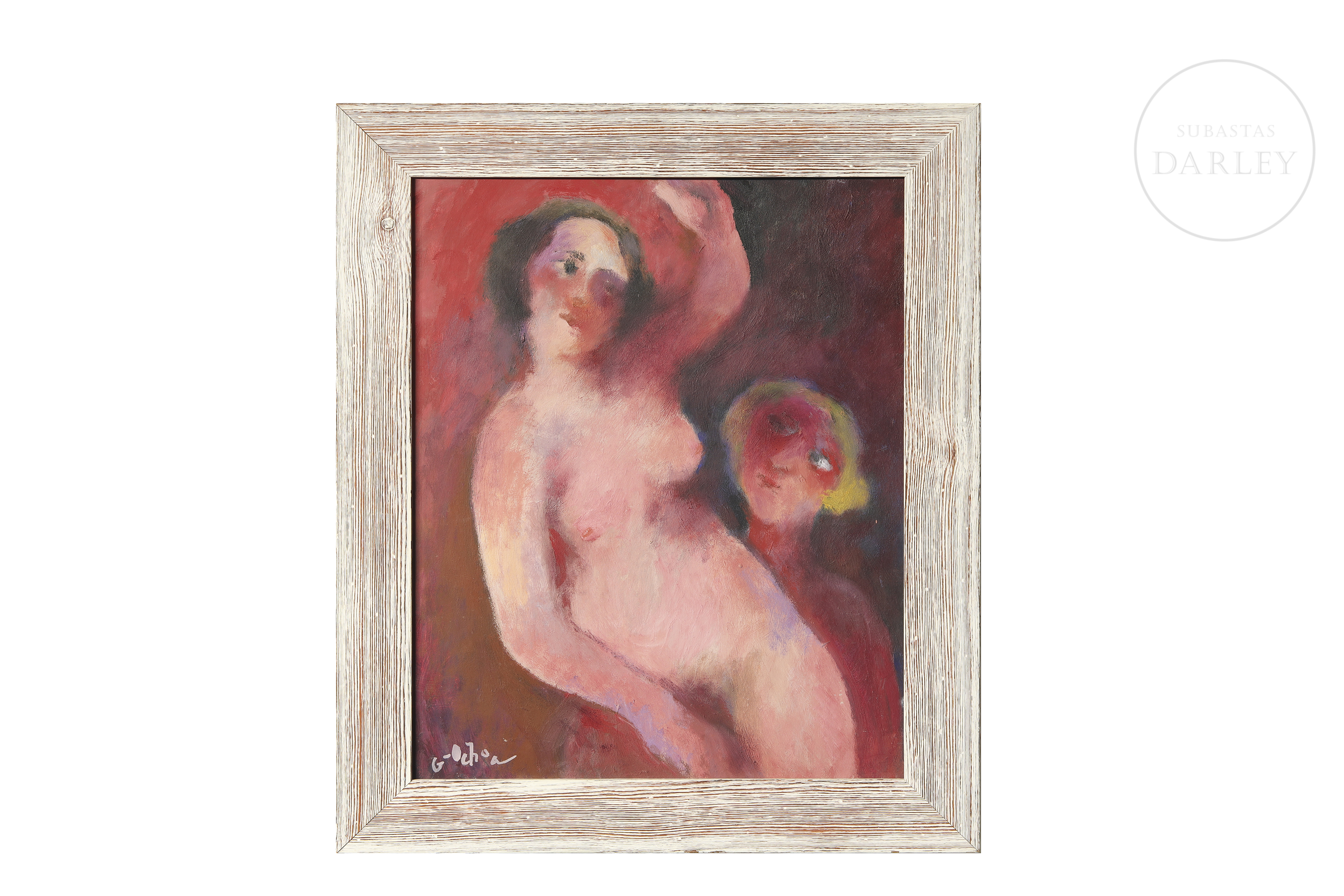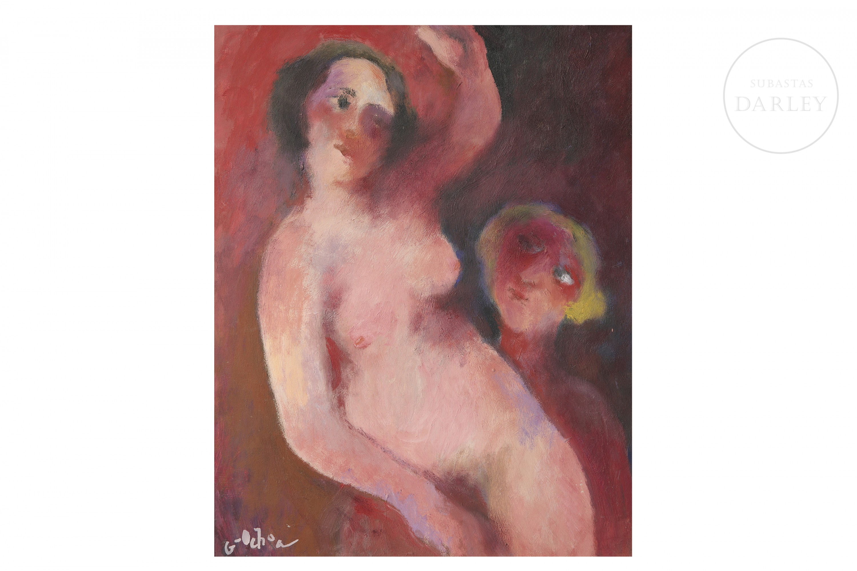 Oil on canvas. Composition depicting two women. The work is rendered in a warm colour palette, predominantly reddish, ochre and pink tones. Signed ‘G-Ochoa’ in the lower left corner.