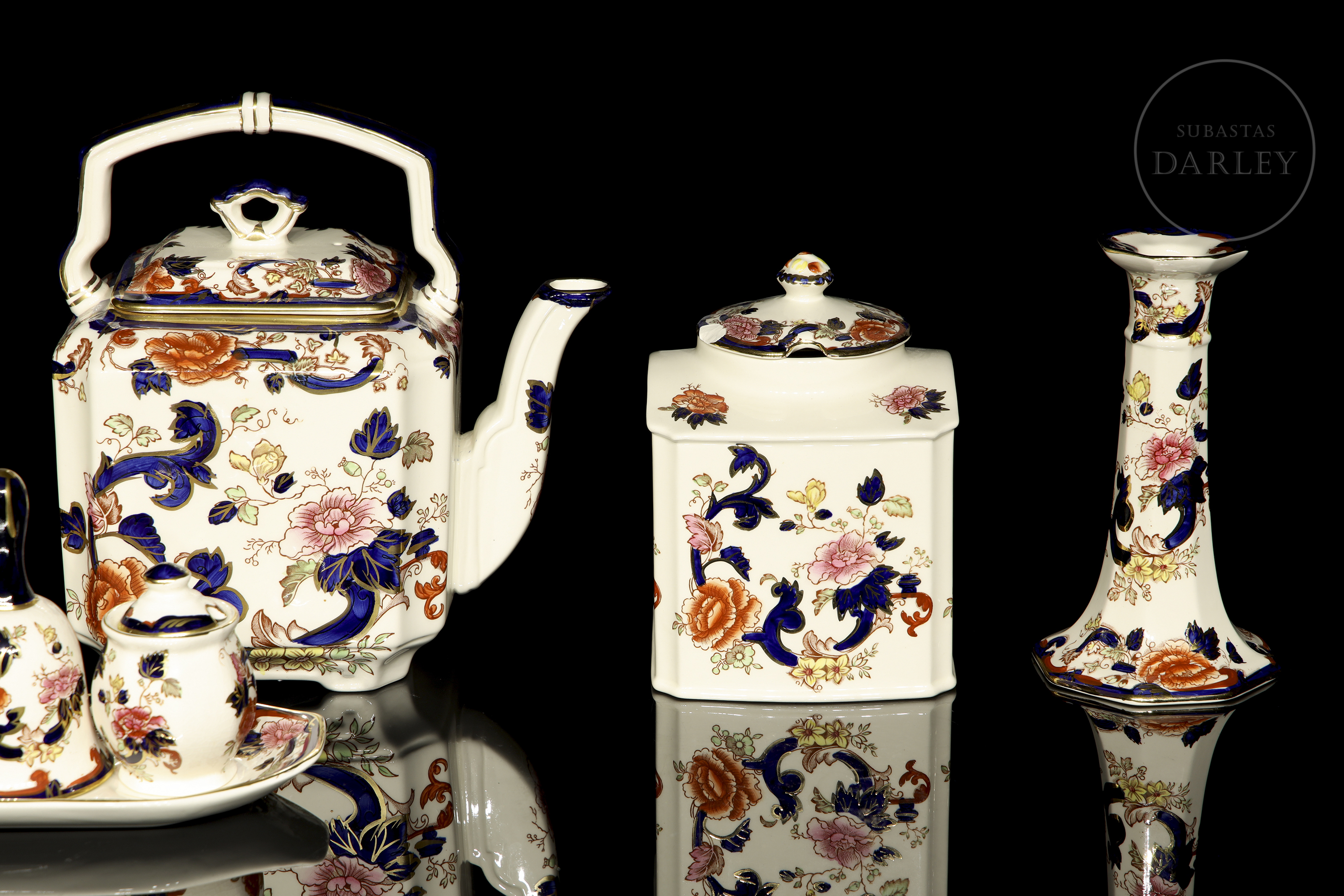 Set of 13 ceramic pieces with polychrome floral decoration. Comprising a lidded jar, dish, tall jug, sugar bowl with saucer, bell and two containers with plate, vase, teapot, hexagonal lidded container, and candelabrum. Some pieces show minor damage. All pieces bear the mark “Mason’s Mandalay – Patented England” on the base.