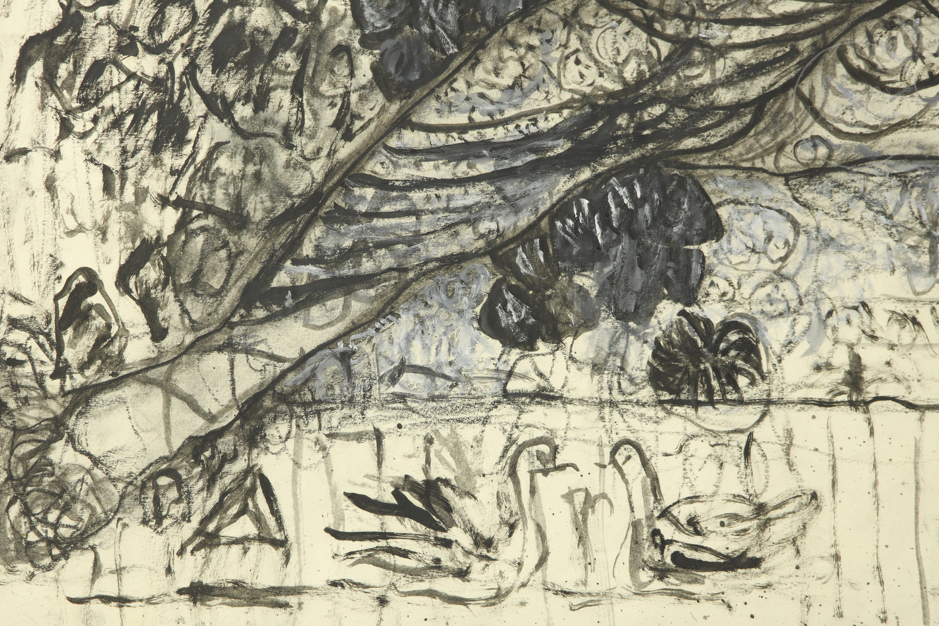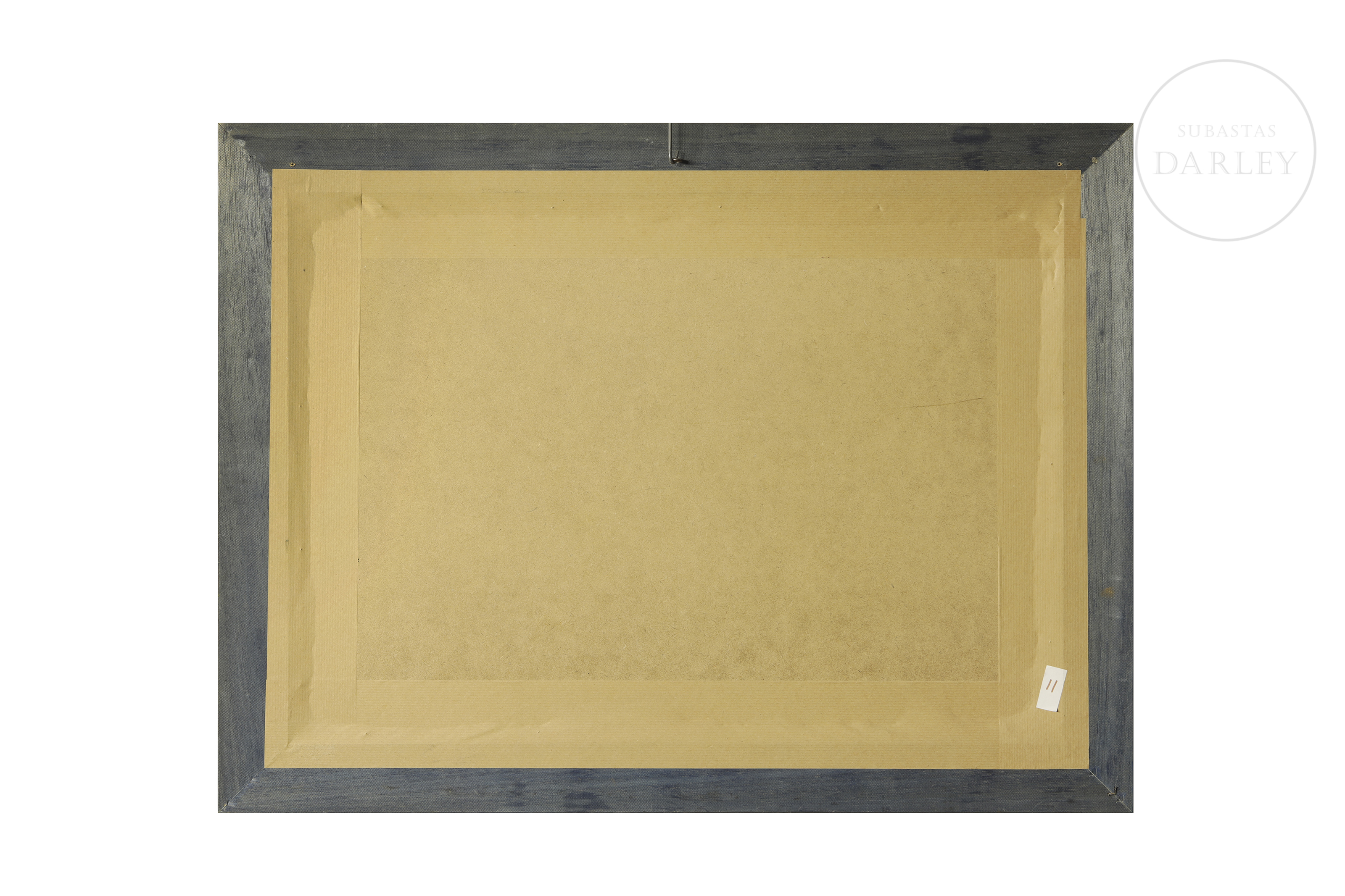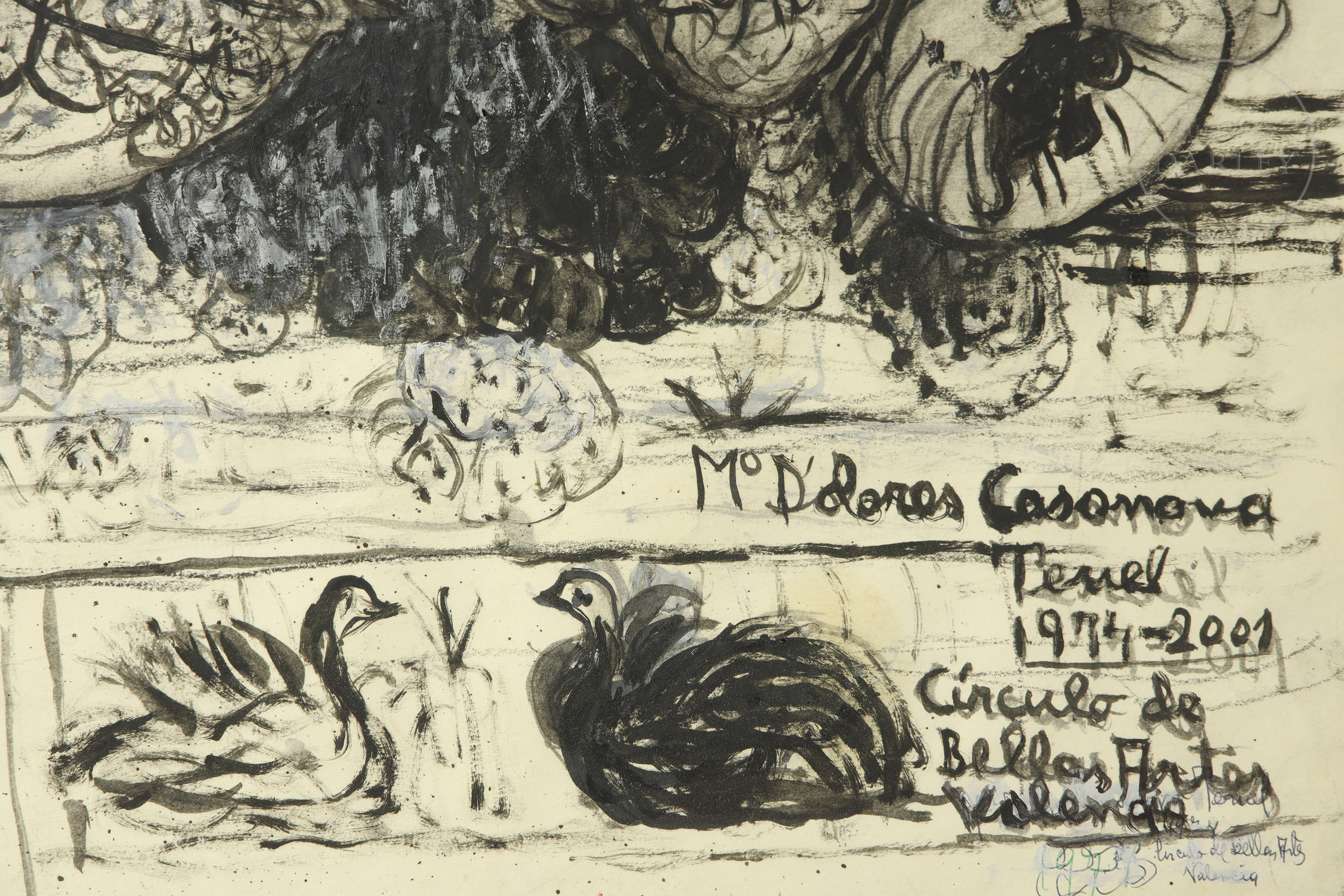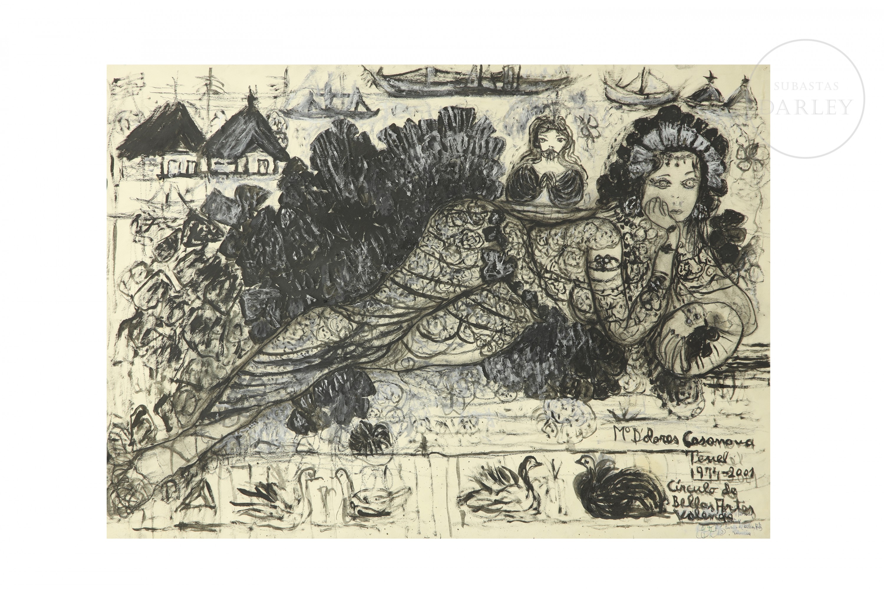 Mixed media on paper. A dreamlike, detailed composition depicting a muse reclining in a fantastical landscape. The scene is populated with swans and references to Valencian orchards. Signed “Mª Dolores Casanova Teruel”, dated and located in the lower margin.