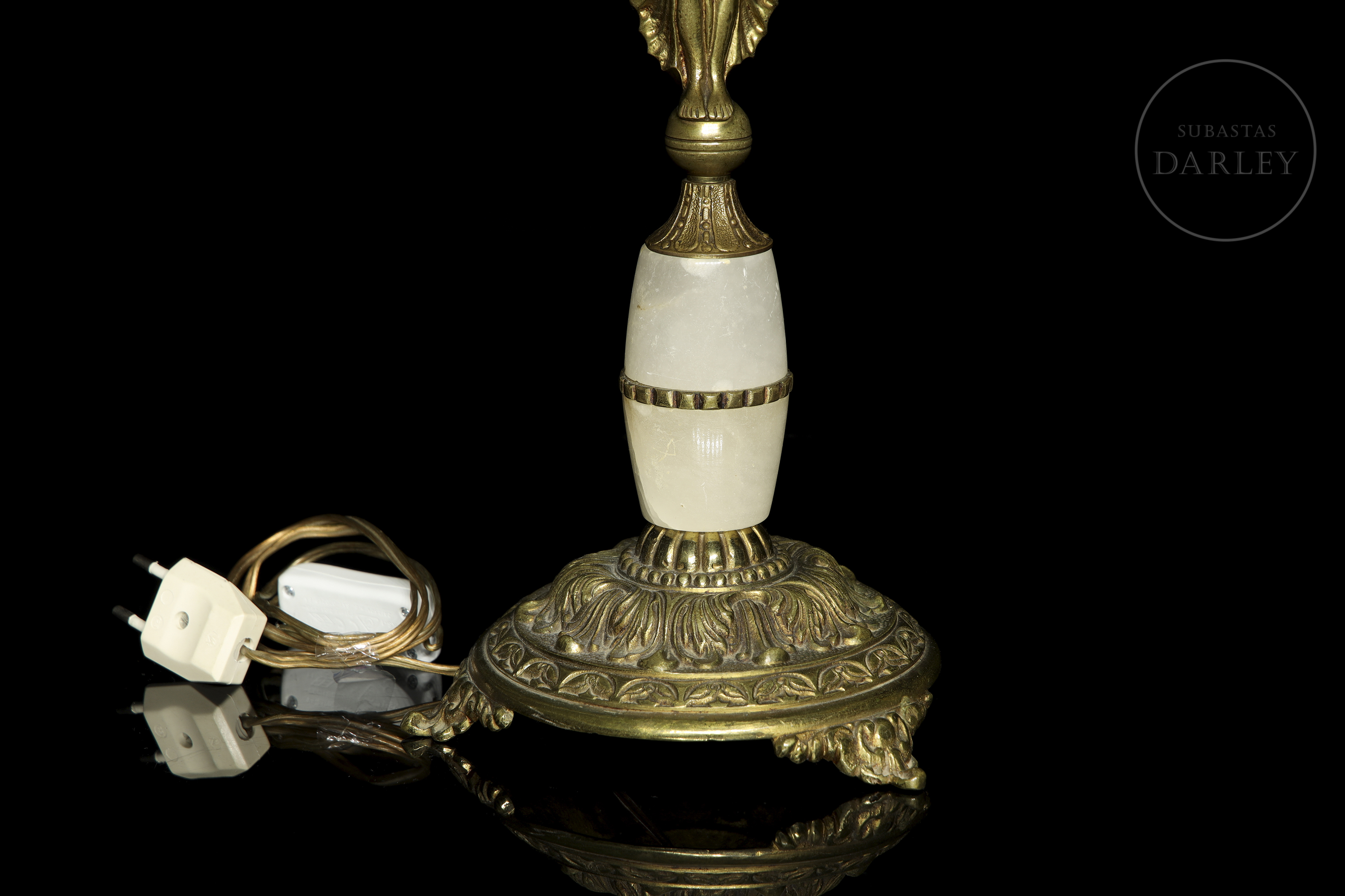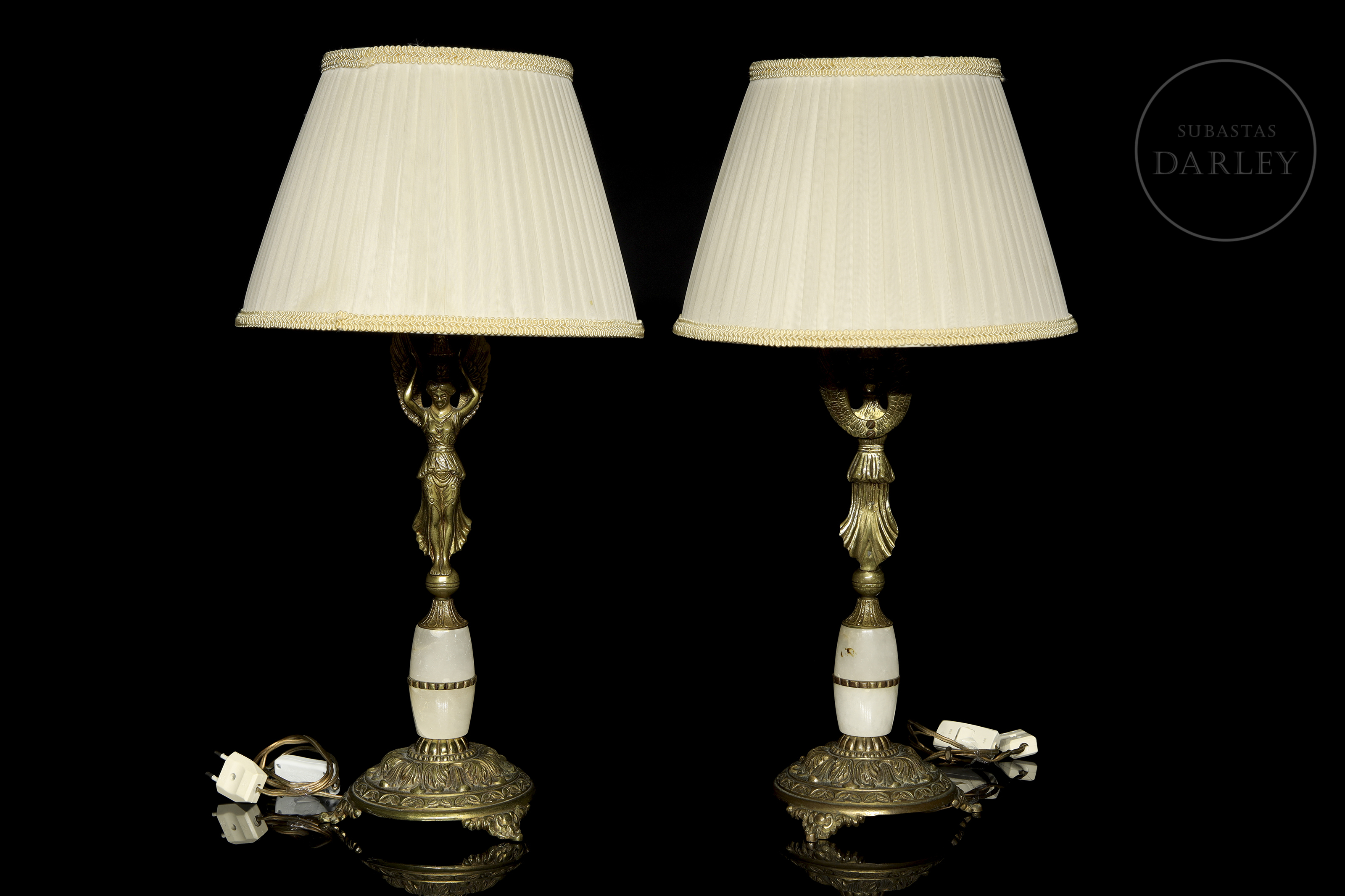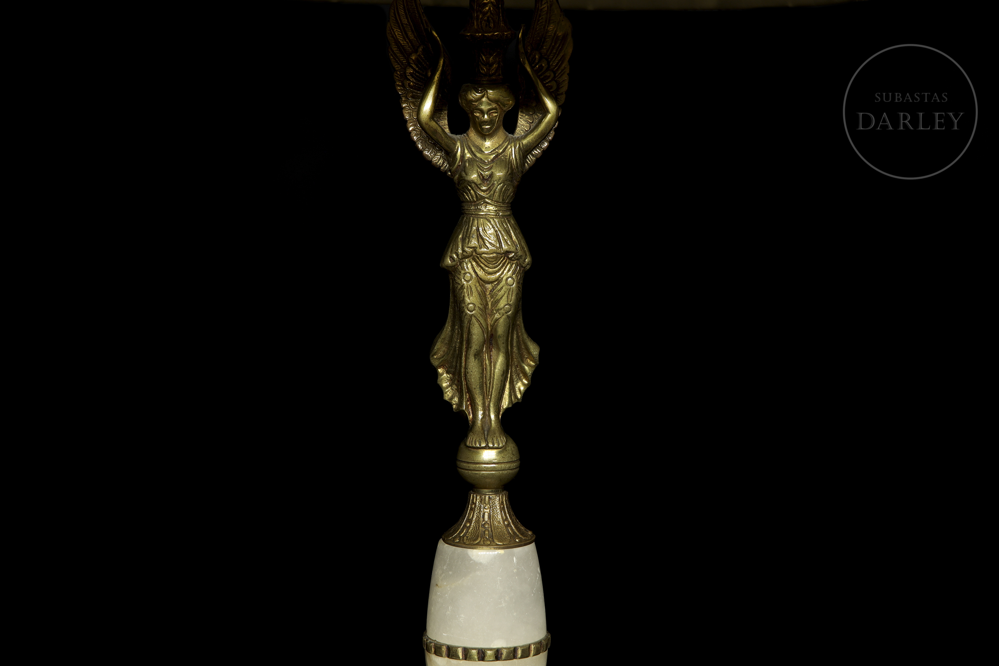 Metal or gilt-bronze lamps, with alabaster appliqués and relief detailing. They have an elongated foot, with the image in relief of a mythological being, with the body and face of a woman with wings and a bird's tail.