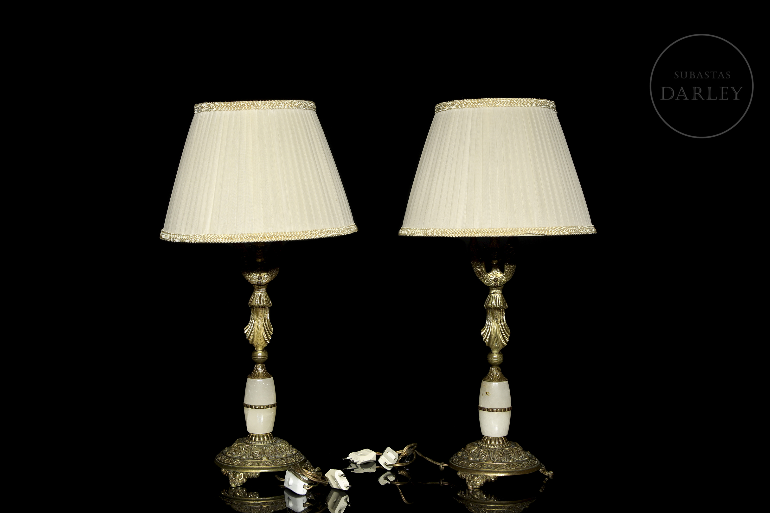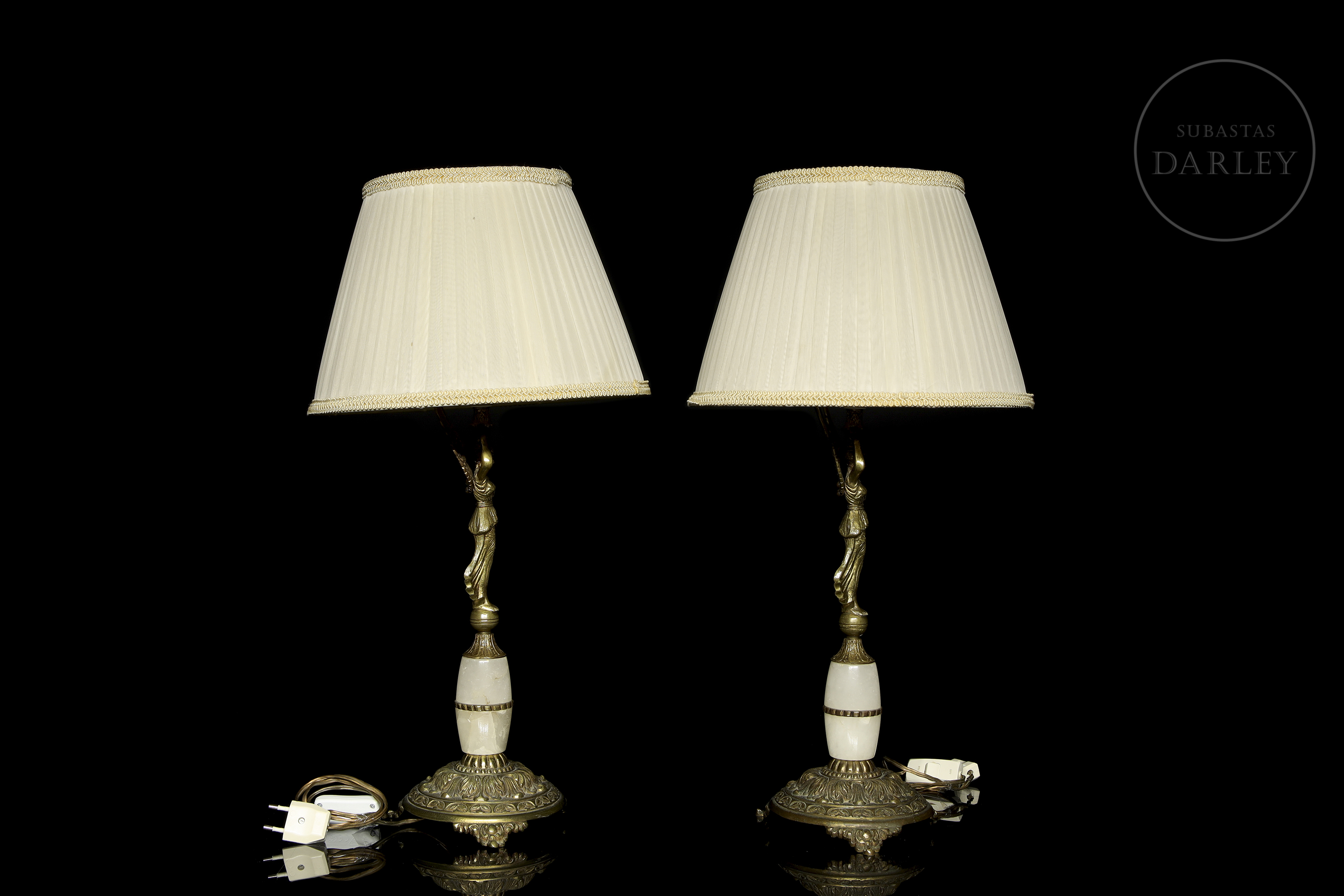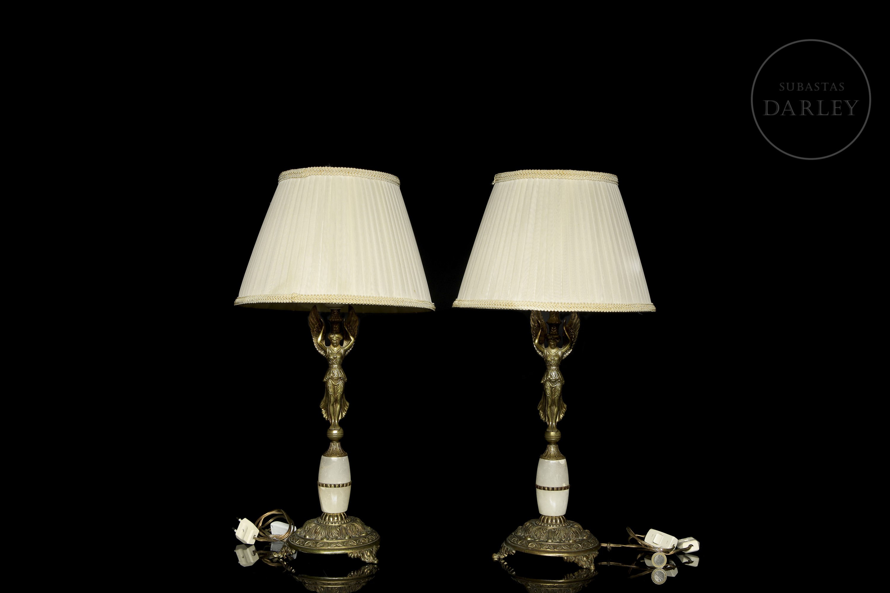 Metal or gilt-bronze lamps, with alabaster appliqués and relief detailing. They have an elongated foot, with the image in relief of a mythological being, with the body and face of a woman with wings and a bird's tail.