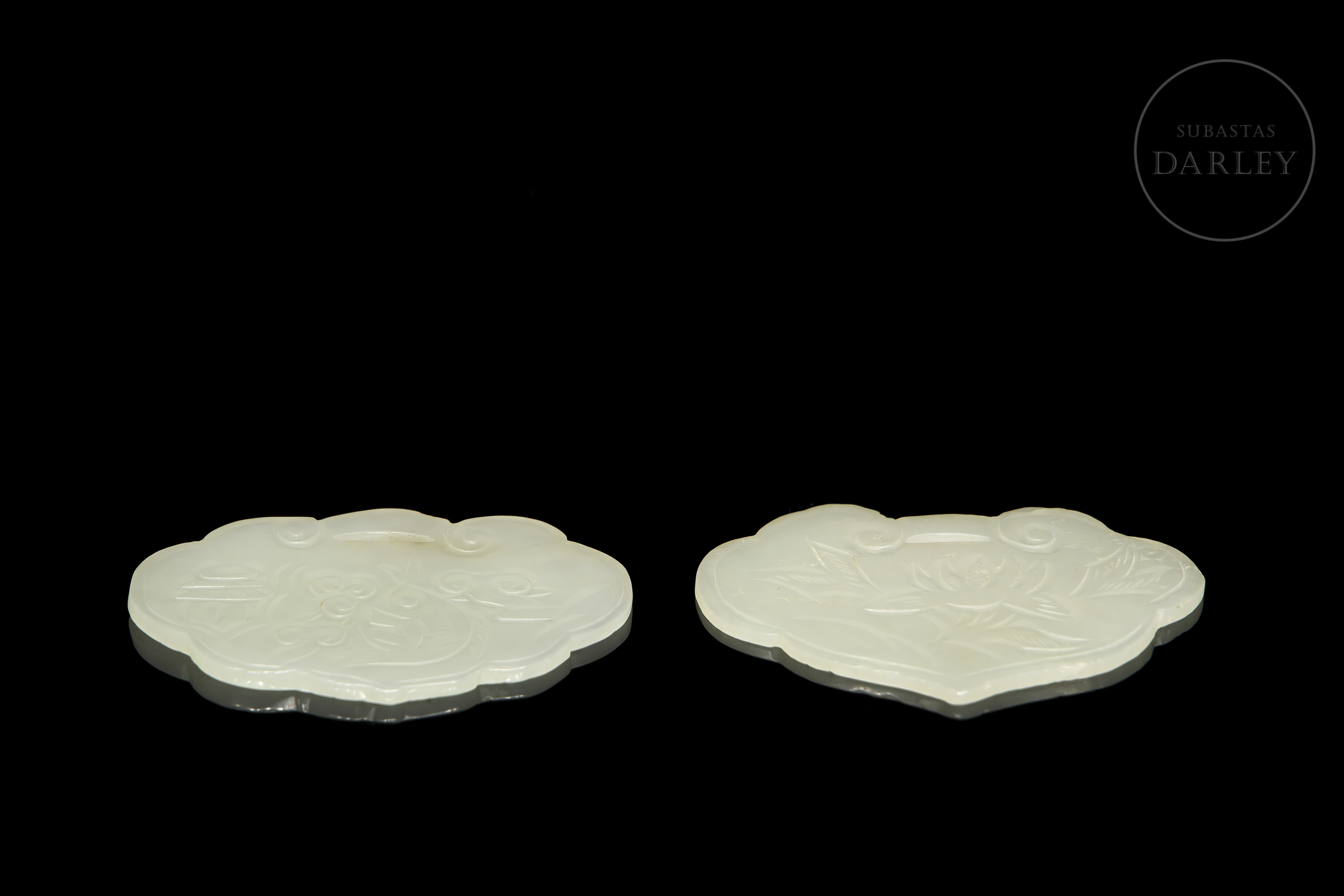 Both pieces, lobed in shape and carved from whitish jade with slight transparency, feature engraved motifs of a lotus flower and a bird on the front. The back of each pendant displays calligraphic inscriptions engraved on a vertical cartouche. Qing Dynasty (1644–1912).